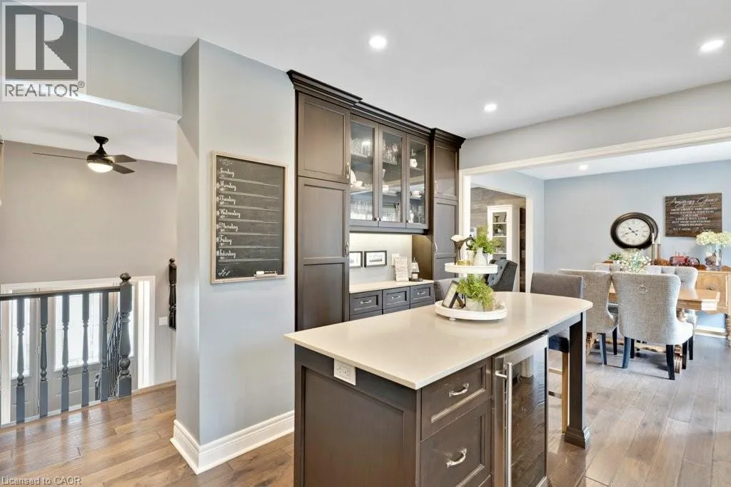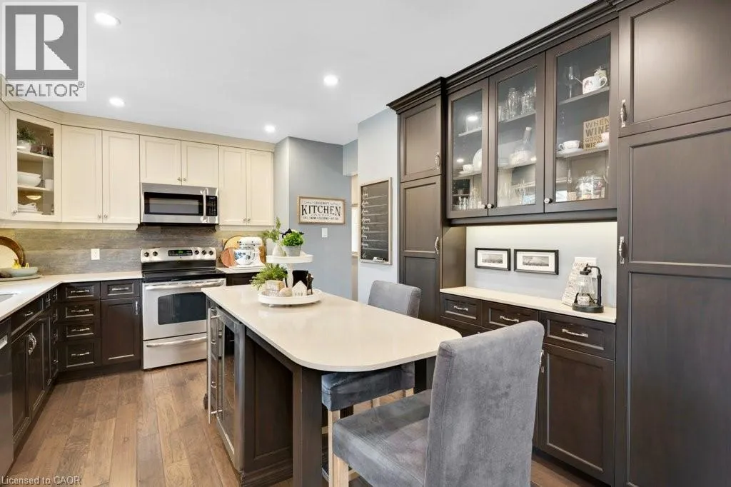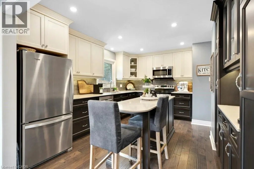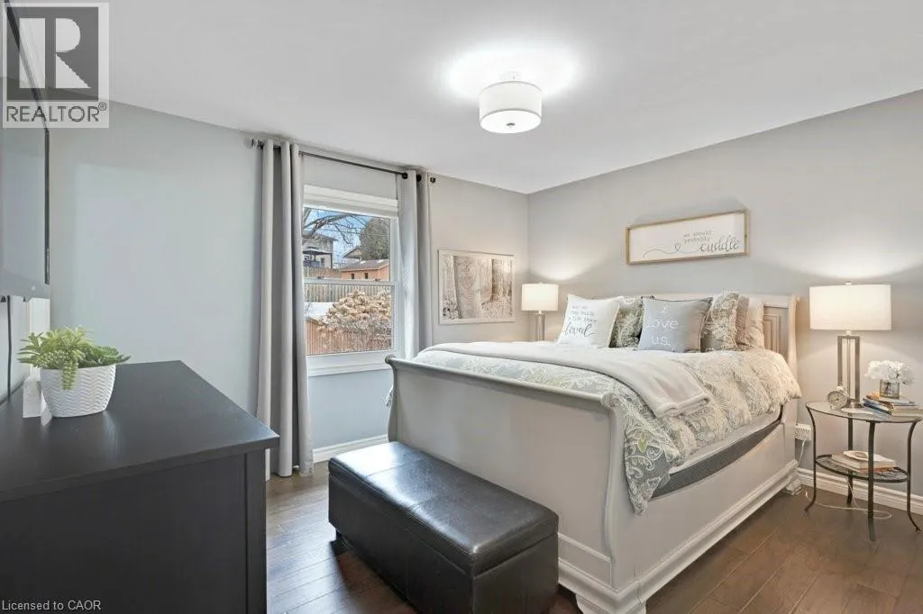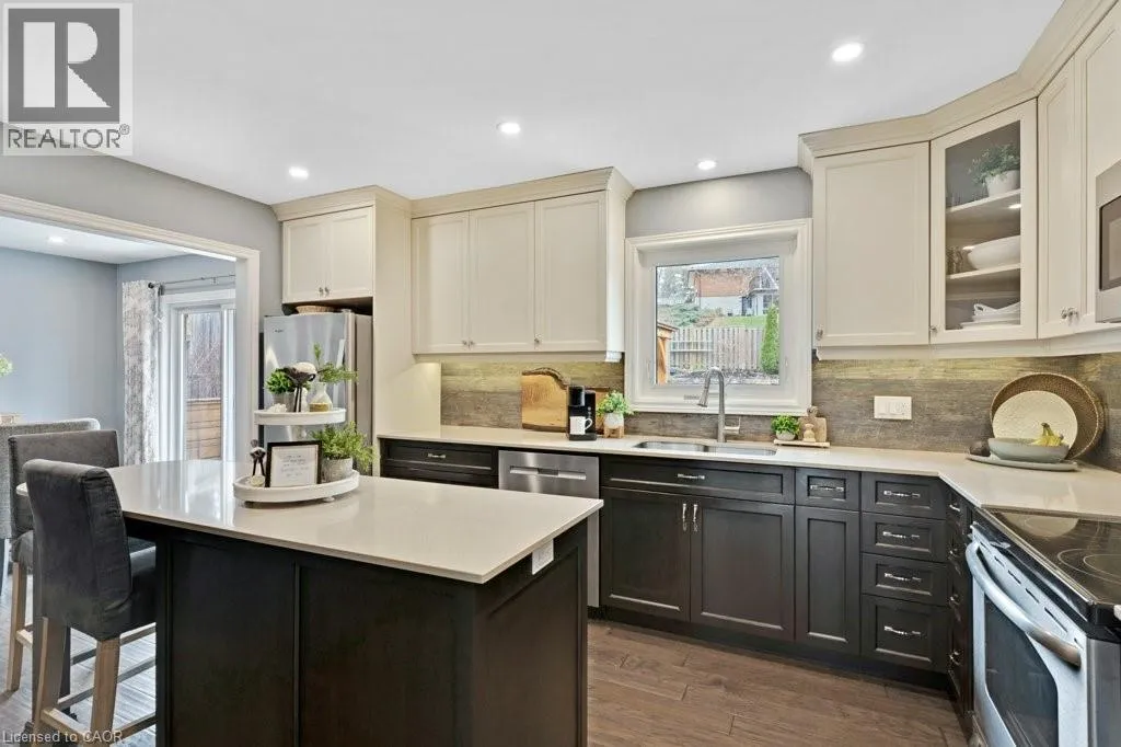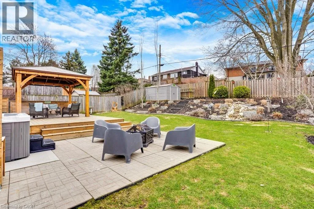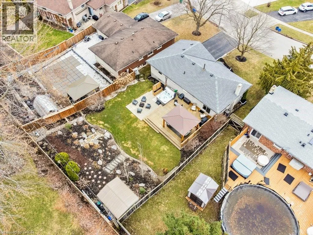 This exquisite West Galt raised bungalow is available right in time for back yard summer enjoyment! This large fenced yard has been lovingly cared for and designed. An amazing perennial garden is displayed on the slope with a babbling waterfall installed in '24. The sprawling deck, wooden gazebo, landscaping and hot tub was all completed in '21. In the front yard, all landscaping, arbour stone, the paved double-wide driveway, and the front entrance addition were completed in '21. Inside is a spacious front entrance leading to the living room, dining room and kitchen area. The living room includes an electric f/p and two sunny windows. The dining room offers a new patio door '17 leading to the deck. The kitchen was renovated in '17 and includes a centre island, quartz counter tops, two display cabinets with glass doors, under cabinet lighting and stainless steel appliances. Three bedrooms and a 4pc bath complete this level. The primary bedroom features an ensuite privilege and a step-in closet with organizers. All pot lighting and engineered flooring throughout the main level were completed in '17. The lower level includes an L-shaped family room renovated in '18 with luxury vinyl flooring and two large sunny windows, ready for all your family movie nights, and includes plumbing behind one wall for a future kitchen area if interested. A sunny bedroom with a large egress window and closet is perfect for teens or overnight guests. Adjacent is a 3pc bath with walk-in glass shower. The laundry room is bright and functional and renovated in '18. Other recent updates include the roof shingles '18. C/vac and accessories and the murphy bed are included. Hot tub is excluded. Don't miss out! This home has been impeccably kept and is only steps to St. Augustine School. Five minutes of countryside driving to the 401. (id:27476)