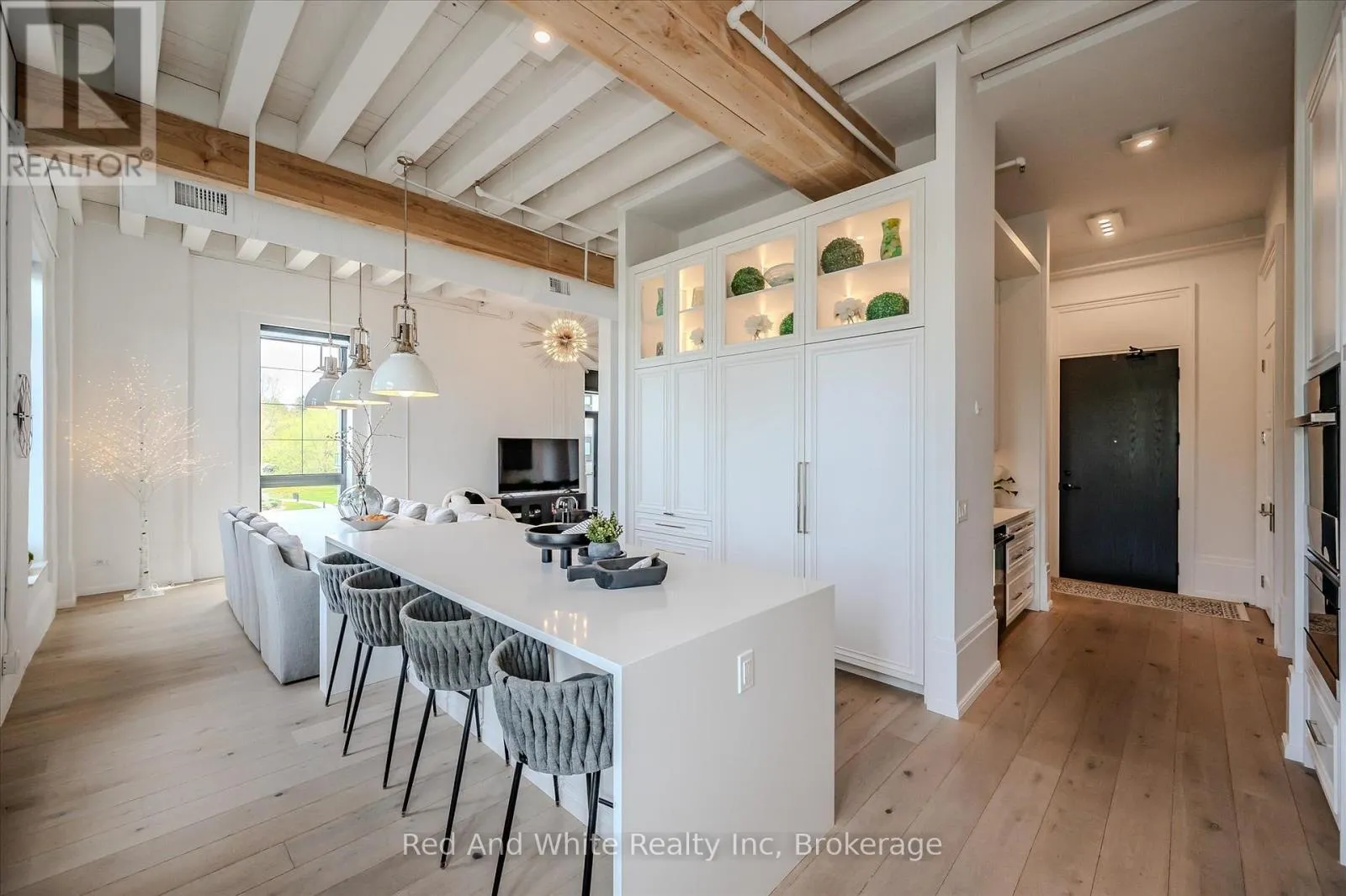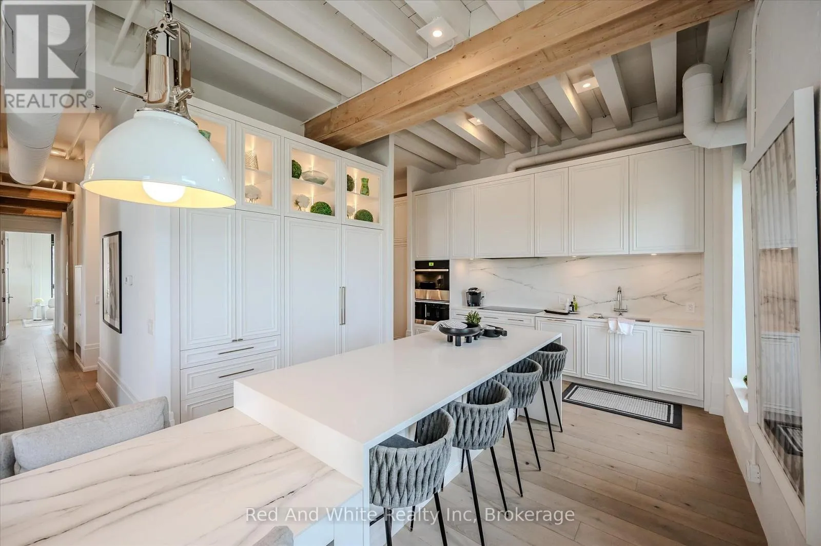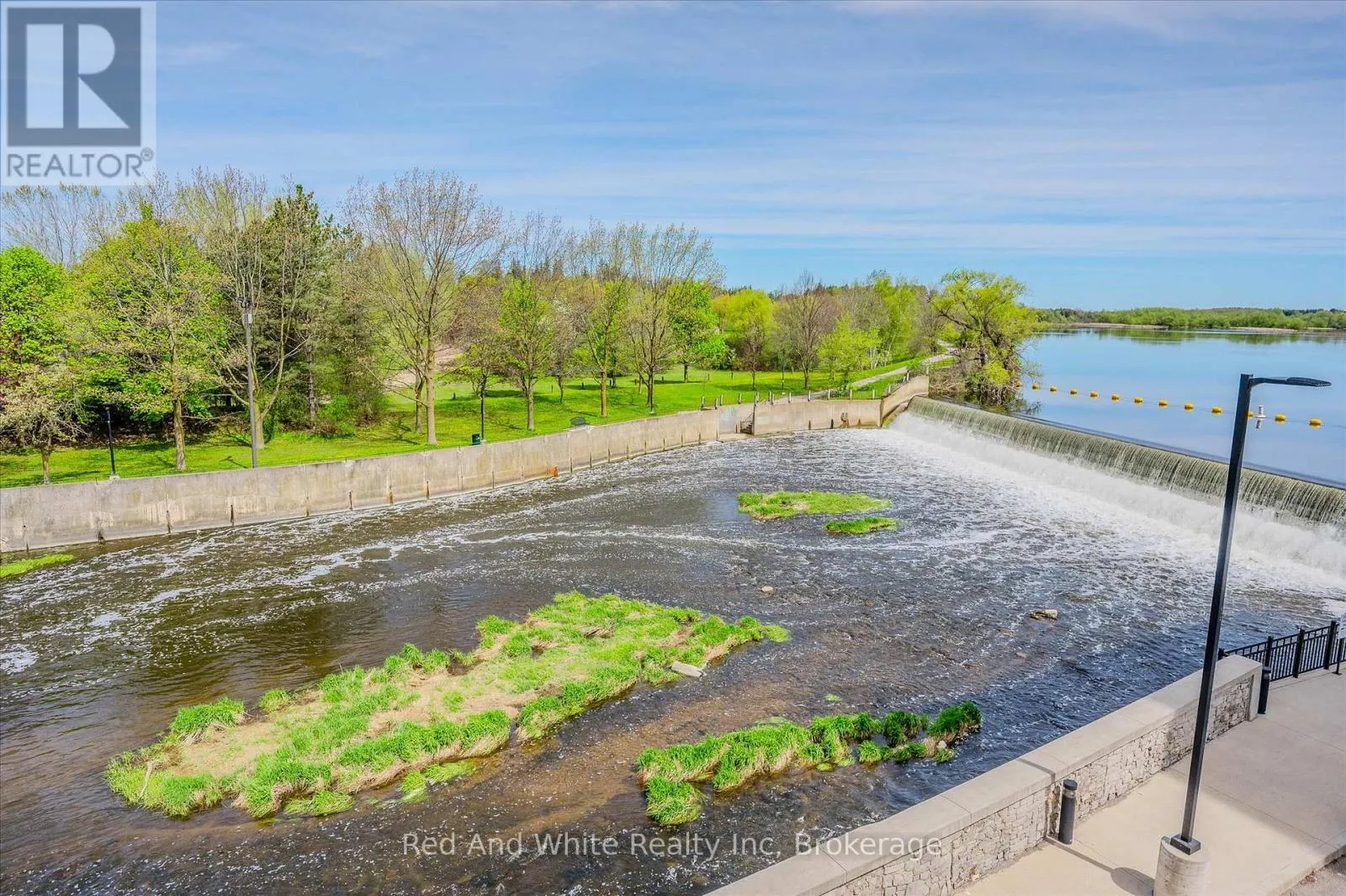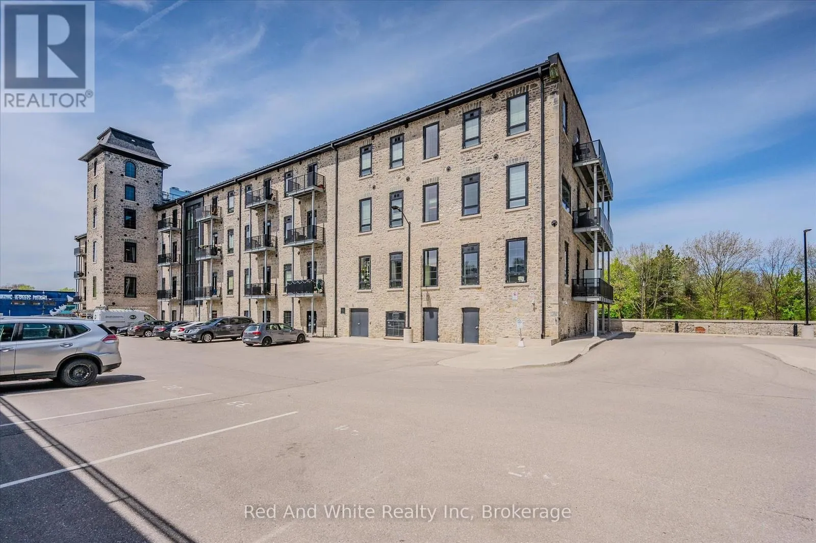 Cross Streets: Guelph Ave. South, on left before Queen Street Intersection. ** Directions: Queen Street to Guelph Ave. Welcome to Riverbank Lofts, a boutique historic stone conversion on the Speed River in the heart of Hespeler Village. This rare corner unit offers luxury with 12' ceilings, exposed beams, and oversized windows showcasing river and waterfall views. Featuring 2 bedrooms with private ensuites, a powder room, and a show-stopping 18' island kitchen with built-in appliances, servery, and pantry.High-end finishes include European white oak flooring, heated floors in baths and laundry, custom built-ins, automatic blinds, and designer lighting. One of only three units with a private river-view balcony and a 2-car garage. Enjoy amenities like a fitness centre, common lounges, bike storage, and direct access to trails and the river.Steps to shops, restaurants, and cafes, with easy access to Hwy 401-this is elevated loft living in one of Cambridge's most desirable locations. (id:27476)