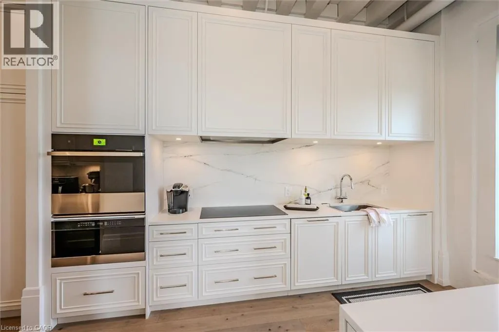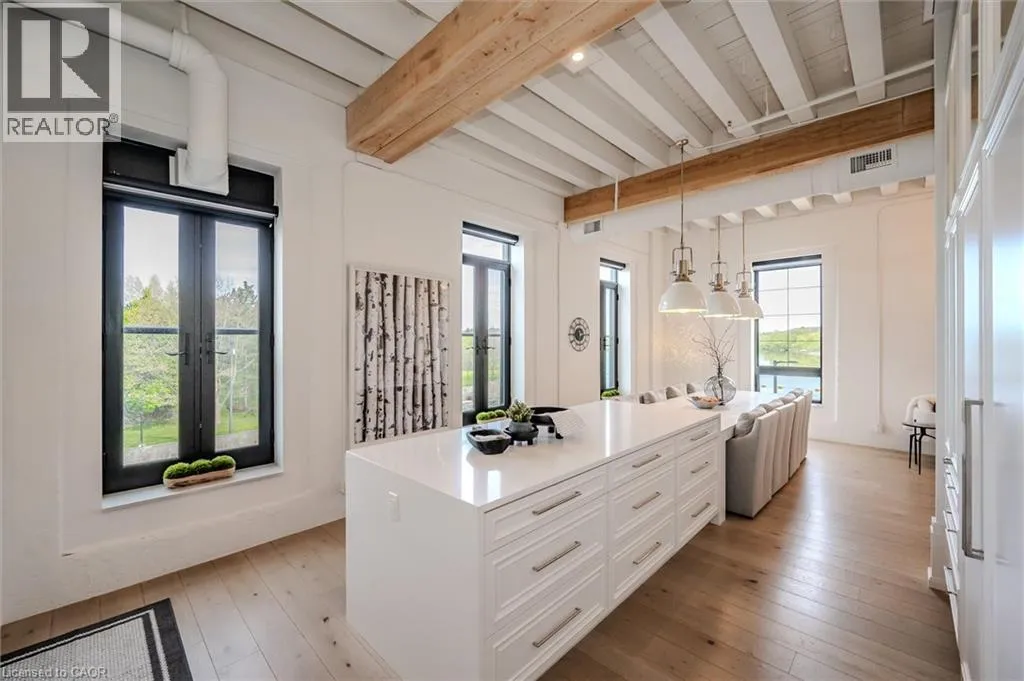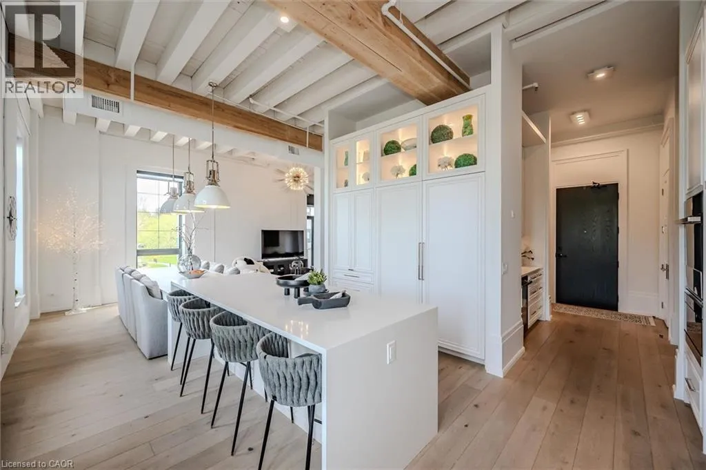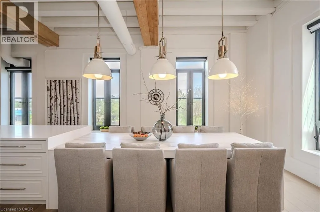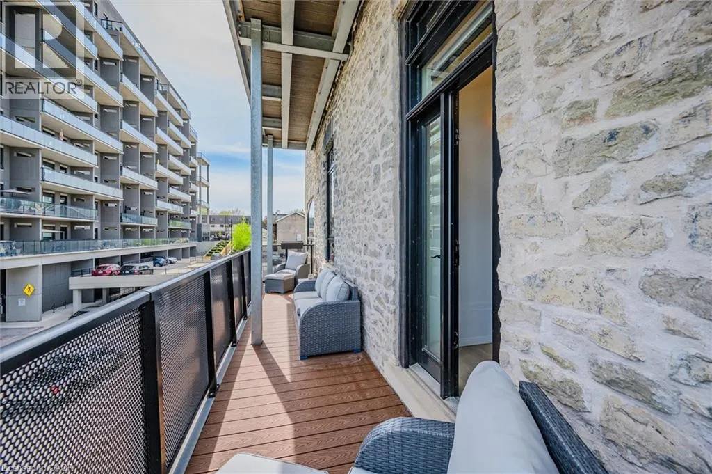 401 to Townline Road, left on River road which turns into Queen Street, Turn right on Guelph Ave and then into Riverbank Lofts. Welcome to Riverbank Lofts, a boutique historic stone conversion on the Speed River in the heart of Hespeler Village. This rare corner unit offers luxury with 12â ceilings, exposed beams, and oversized windows showcasing river and waterfall views. Featuring 2 bedrooms with private ensuites, a powder room, and a show-stopping 18â island kitchen with built-in appliances, servery, and pantry. High-end finishes include European white oak flooring, heated floors in baths and laundry, custom built-ins, automatic blinds, and designer lighting. One of only three units with a private river-view balcony and a 2-car garage. Enjoy amenities like a fitness centre, common lounges, bike storage, and direct access to trails and the river. Steps to shops, restaurants, and cafes, with easy access to Hwy 401âthis is elevated loft living in one of Cambridgeâs most desirable locations. (id:27476)