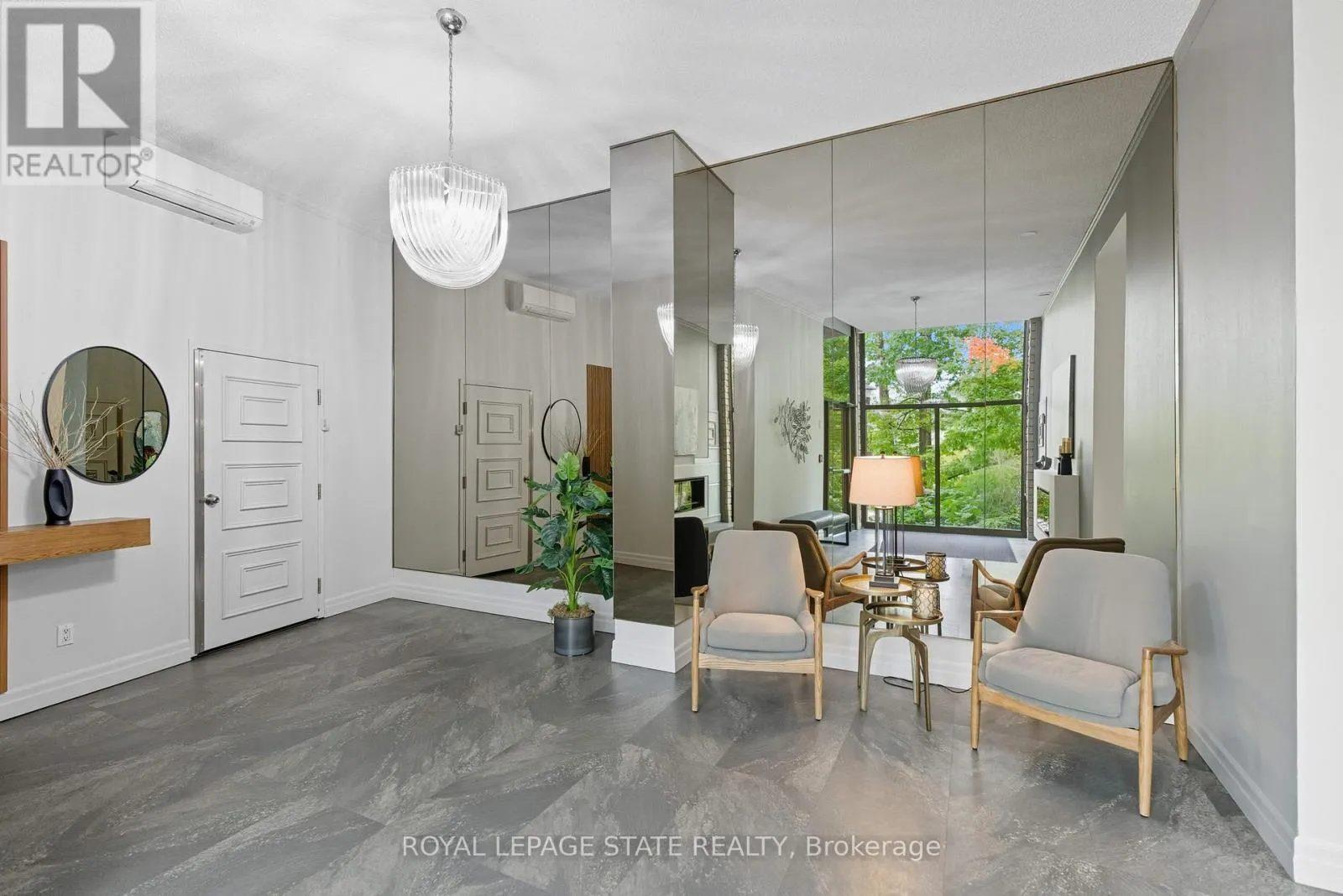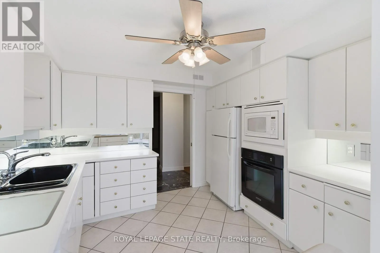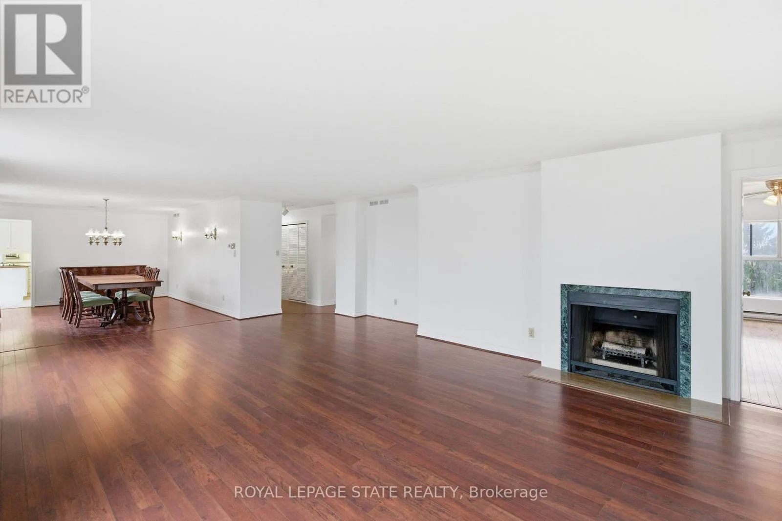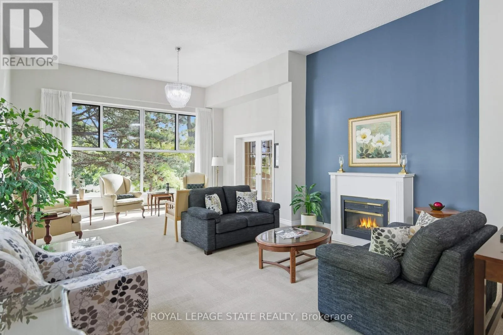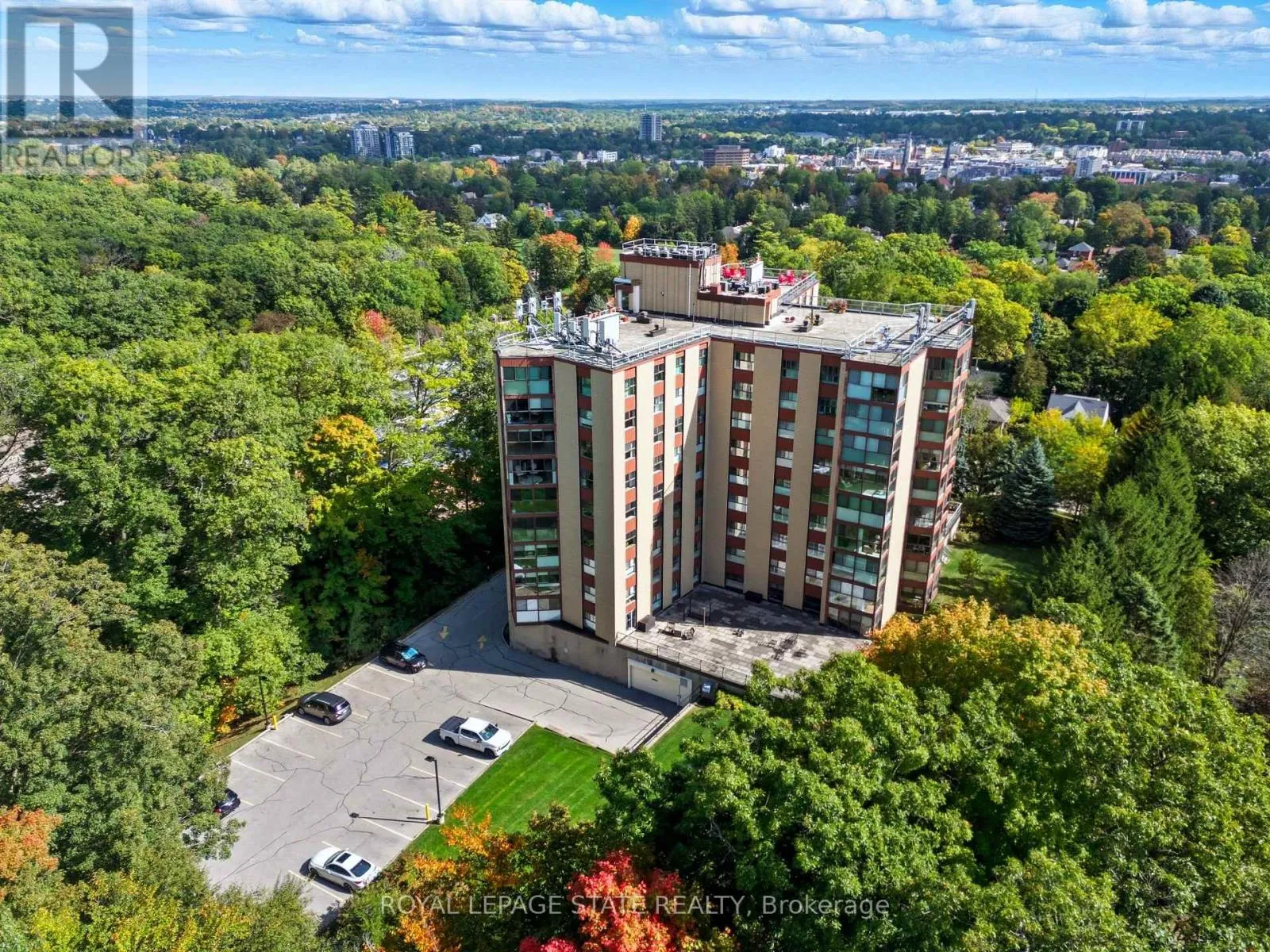 Cross Streets: Gladstone Avenue. ** Directions: From St. Andrews/Cedar, W on Cedar St, N on Berkley St, located at the end of Berkley St on the left hand side. Welcome to The Highlands by the Park; 20 Berkley Road. Nestled atop a hill at the end of a quiet cul-de-sac in historic West Galt, this prestigious condominium offers tranquility, privacy, and sweeping views of nature and the city skyline. Overlooking a majestic woodlot, Victoria Park and beyond, this building is one of Cambridge's hidden gems. This spacious 2,418 sq ft, carpet-free unit offers a rare combination of size, layout, and natural light. With 3 generously sized bedrooms, 2 full bathrooms, and a thoughtfully designed floor plan, it's ideal for those seeking comfort and functionality. Step into an impressive foyer with mirrored walls and a large closet before entering the bright eat-in kitchen, complete with ceramic tile, crisp white cabinetry, built-in range top, track lighting and a cozy breakfast nook overlooking lush greenery. The kitchen opens into a formal dining room with laminate flooring and elegant wall sconces; perfect for entertaining. The adjacent oversized living room features a wood-burning fireplace (sold as-is) and leads to a bright all-season solarium with floor-to-ceiling windows, ideal as a den, office, or creative space. Down the hallway are three spacious bedrooms, including a large primary suite with two windows, an expansive walk-in closet, and a 5-piece ensuite. A second 4-piece guest bath serves the remaining bedrooms. The in-suite laundry is tucked off the main hallway. Recent updates include new toilet in guest bath (2026) & fresh paint throughout (2026). Building amenities include a rooftop terrace with panoramic views, seating and barbecue, a party room with full kitchen and lounge, meeting room, exercise room, and well-maintained common spaces. Includes one underground parking spot with tandem storage locker. Don't miss this rare opportunity to live in a peaceful, elevated community surrounded by nature, minutes from West Galt. (id:27476)