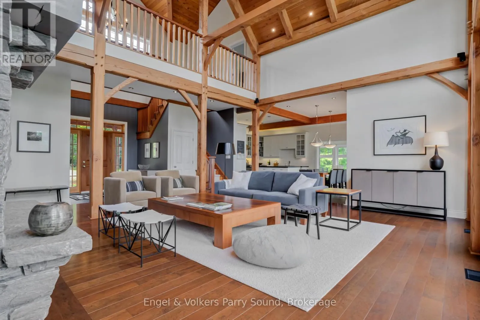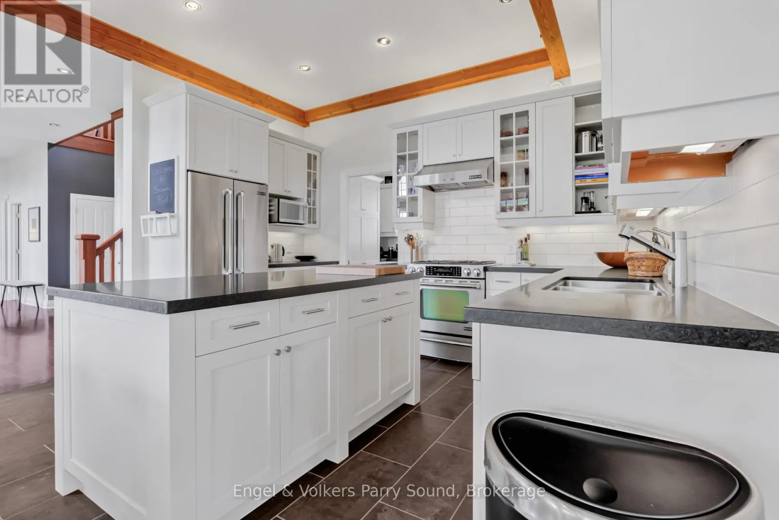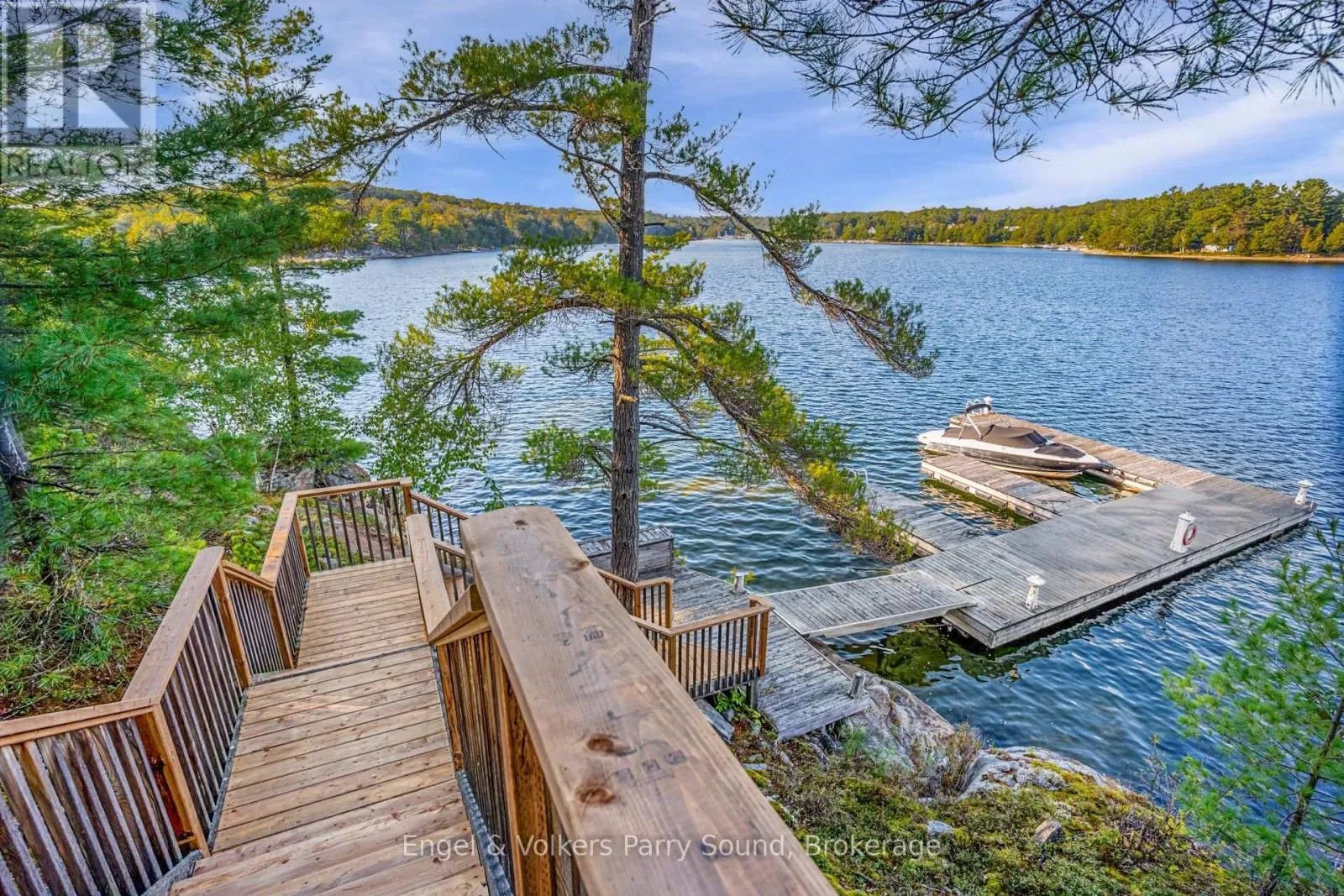 Cross Streets: Bayview Dr & Beacon Point Road. ** Directions: 400 N to 559. 559 to East Carling Bay Road, continue onto Bayview, turn left at Beacon Point Drive. Property on left. Prestigious Year-Round Georgian Bay Estate | Perched atop a sheltered granite outcropping, this custom Georgian Bay masterpiece offers over 3,600 SF of refined living space where timeless craftsmanship meets modern luxury. Designed with a timber frame & accented by soaring post-and-beam construction, the home commands sweeping views of tranquil Carling Bay; an address synonymous with prestige and privacy. Set on nearly 4 acres of natural beauty with 331 feet of deep, clean shoreline, this Cape Cod inspired residence has been celebrated in Canadian Homes & Cottages magazine for its architectural brilliance and flawless execution. Granite walkways, handcrafted stone staircases and artfully designed landscaping seamlessly blend the property with its rugged, picturesque surroundings. The grand great room impresses with its 32-foot cedar ceilings, striking timber trusses & arched windows framing the bay beyond. A magnificent stone fireplace anchors the space, while heated cherry wood and tile floors extend warmth throughout. The gourmet kitchen is outfitted with granite countertops, stainless steel appliances, and a propane stove perfect for both culinary creations and effortless entertaining. With five bedrooms, including luxurious guest suites on the upper level, and a dedicated games wing, the home is designed for both intimate family living and large-scale hosting. Expansive patios, tiered outdoor spaces and breathtaking vistas ensure every moment is embraced in luxury. Car collectors and boating enthusiasts will appreciate the attached and detached garages, providing space for cars, boats, and prized possessions. The private dock offers deep-water mooring and full electrical connections to accommodate large vessels. Enjoy the convenience of year-round municipal road access. Opportunities to own along Beacon Point are exceptionally rare, making this estate not only a home, but a true legacy property on Georgian Bay. (id:27476)
