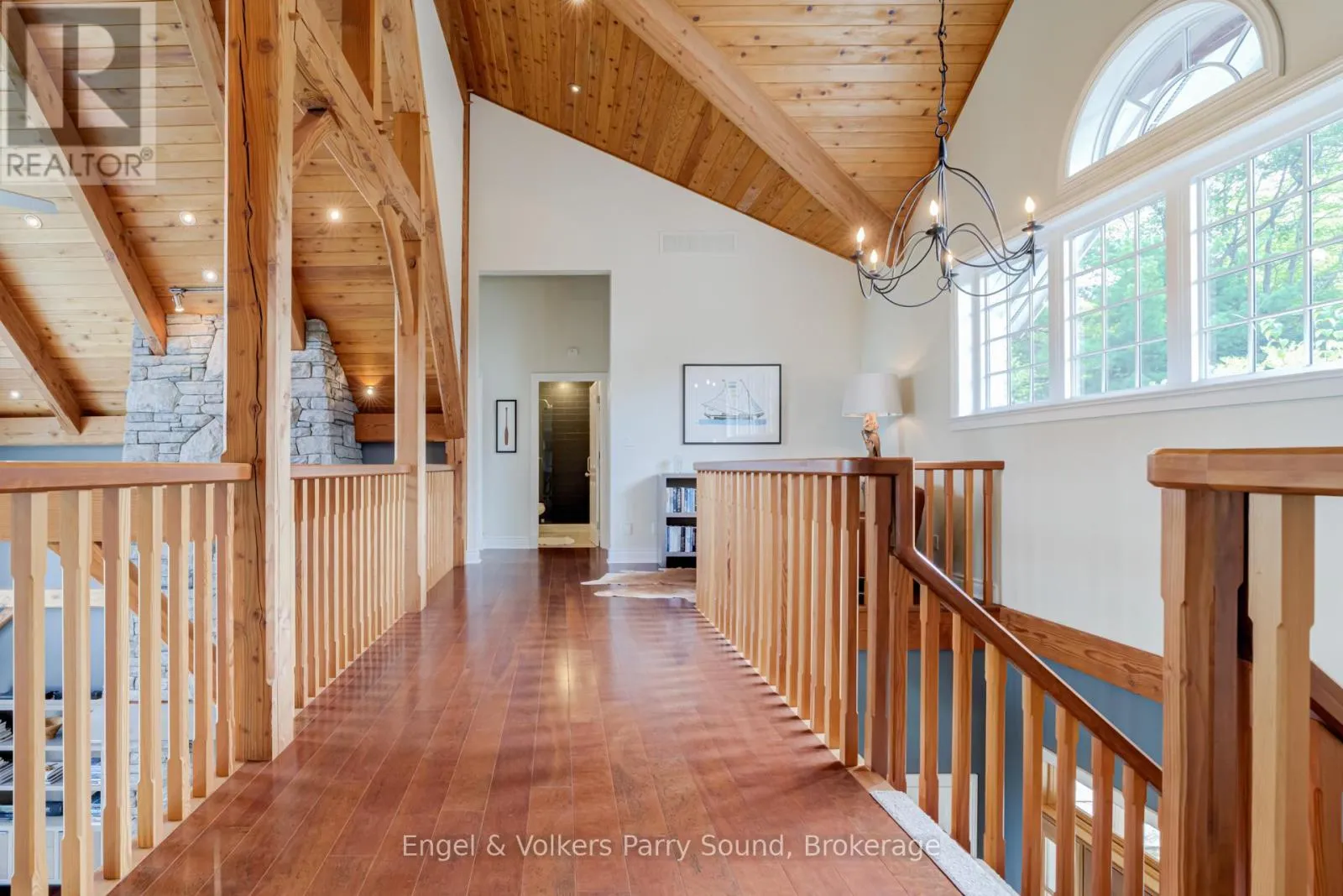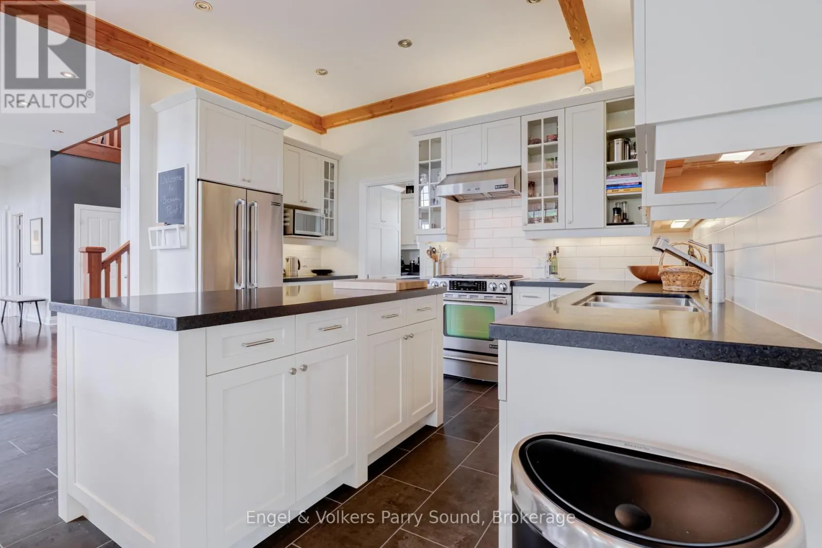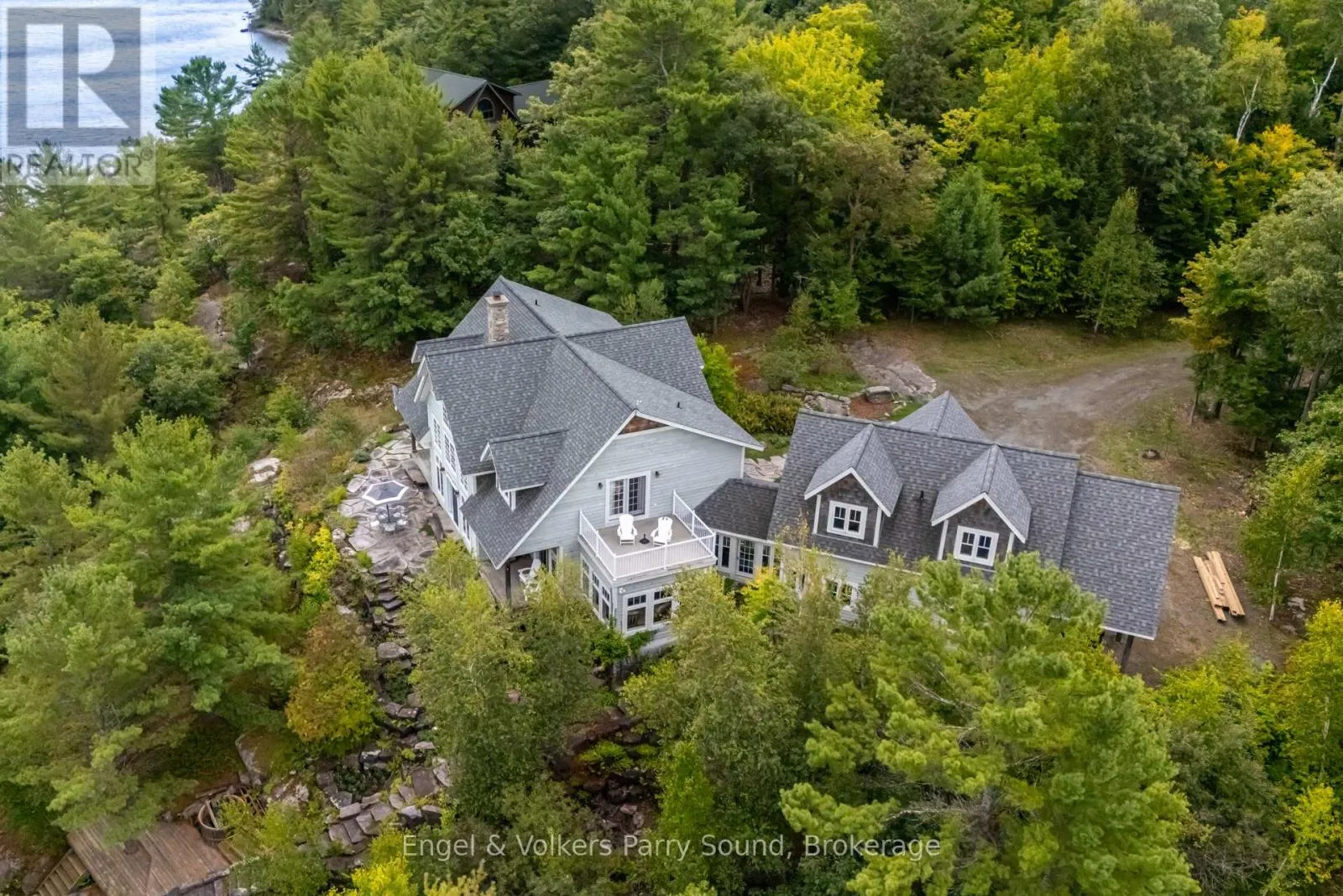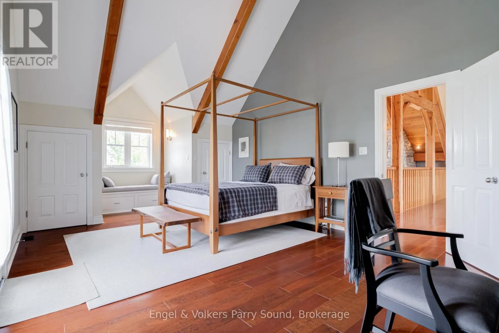 Cross Streets: Bayview Dr & Beacon Point Road. ** Directions: 400 N to 559. 559 to East Carling Bay Road, continue onto Bayview, turn left at Beacon Point Drive. Property on left. Prestigious Year-Round Georgian Bay Estate | Perched atop a sheltered granite outcropping, this custom Georgian Bay masterpiece offers over 3,600 SF of refined living space where timeless craftsmanship meets modern luxury. Designed with a timber frame & accented by soaring post-and-beam construction, the home commands sweeping views of tranquil Carling Bay; an address synonymous with prestige and privacy. Set on nearly 4 acres of natural beauty with 331 feet of deep, clean shoreline, this Cape Cod inspired residence has been celebrated in Canadian Homes & Cottages magazine for its architectural brilliance and flawless execution. Granite walkways, handcrafted stone staircases and artfully designed landscaping seamlessly blend the property with its rugged, picturesque surroundings. The grand great room impresses with its 32-foot cedar ceilings, striking timber trusses & arched windows framing the bay beyond. A magnificent stone fireplace anchors the space, while heated cherry wood and tile floors extend warmth throughout. The gourmet kitchen is outfitted with granite countertops, stainless steel appliances, and a propane stove perfect for both culinary creations and effortless entertaining. With five bedrooms, including luxurious guest suites on the upper level, and a dedicated games wing, the home is designed for both intimate family living and large-scale hosting. Expansive patios, tiered outdoor spaces and breathtaking vistas ensure every moment is embraced in luxury. Car collectors and boating enthusiasts will appreciate the attached and detached garages, providing space for cars, boats, and prized possessions. The private dock offers deep-water mooring and full electrical connections to accommodate large vessels. Enjoy the convenience of year-round municipal road access. Opportunities to own along Beacon Point are exceptionally rare, making this estate not only a home, but a true legacy property on Georgian Bay. (id:27476)