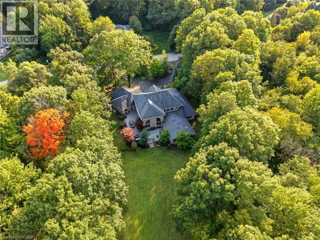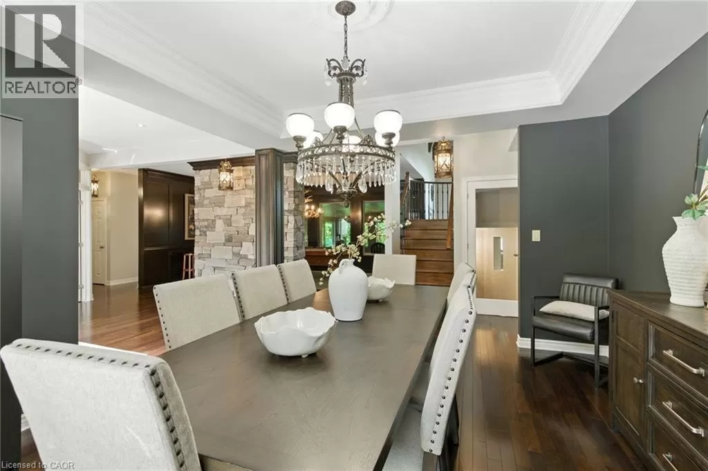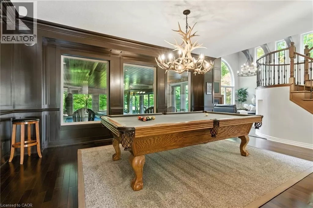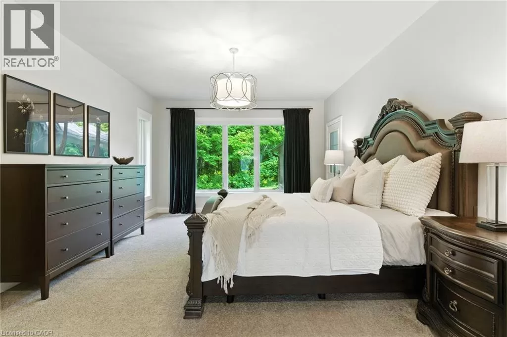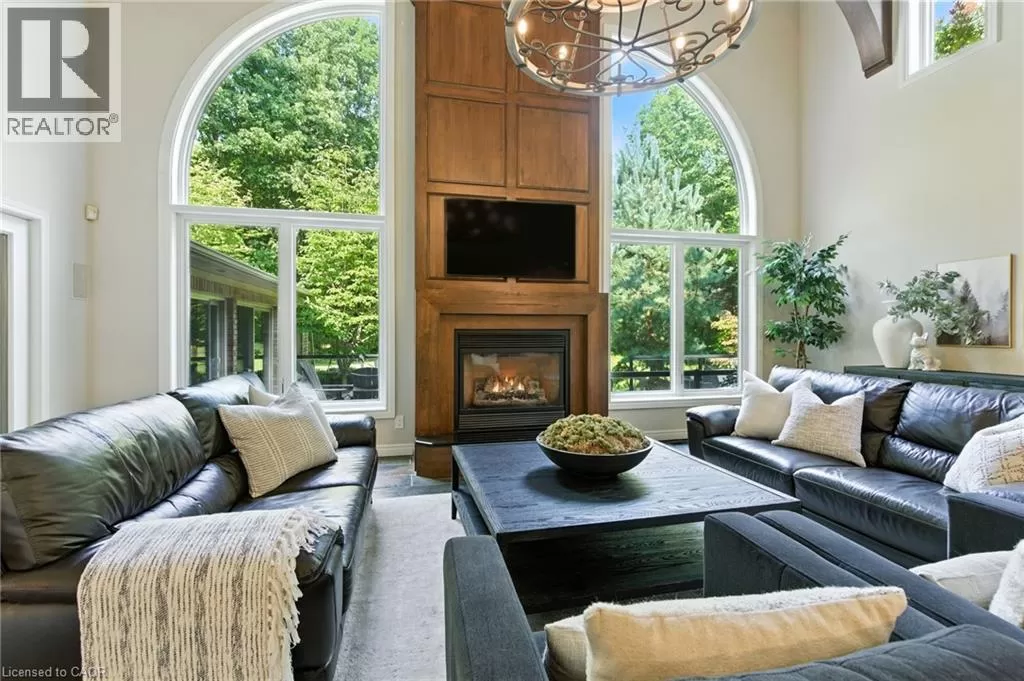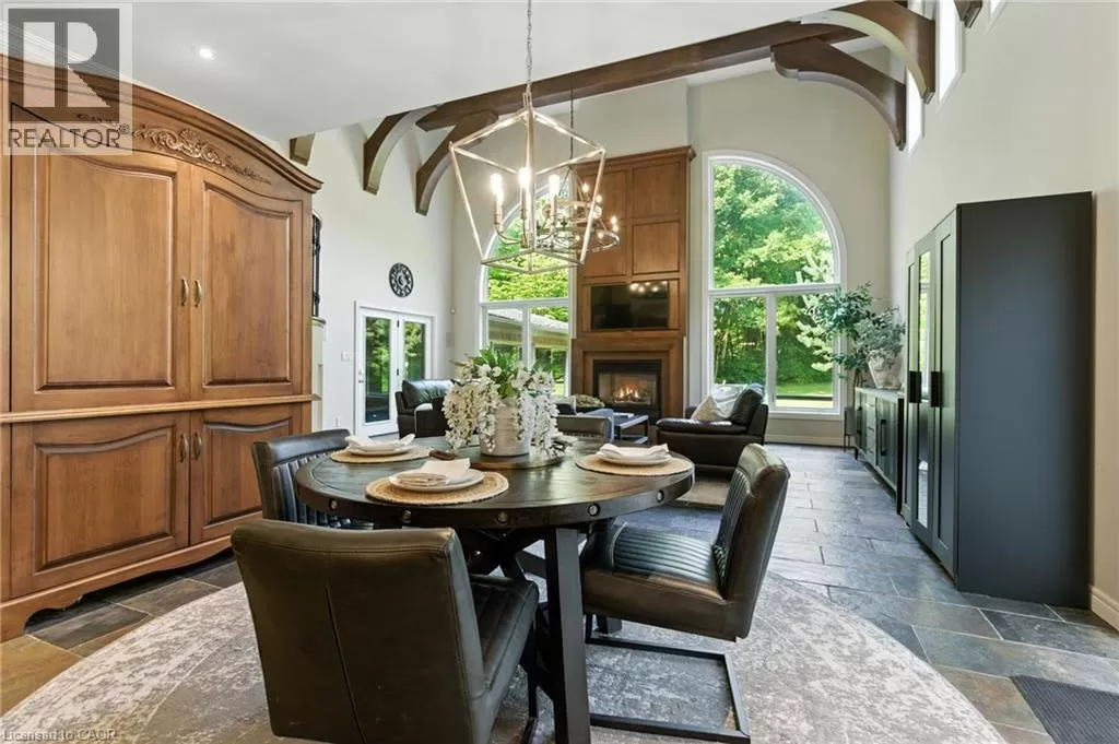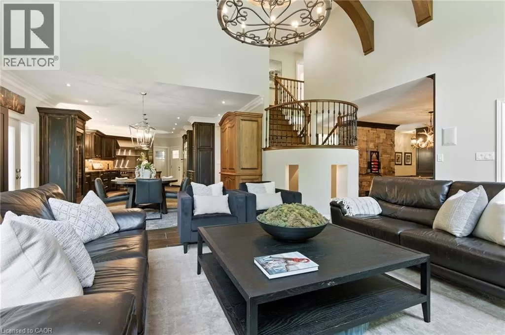 Carlisle Rd and Centre Rd Timeless elegance awaits in the heart of Carlisle. This extraordinary estate blends refined sophistication with European charm, offering a lifestyle defined by comfort, craftsmanship, and distinction. From the moment you enter, you're greeted by soaring ceilings, rich stone accents, and a stunning great room with intricate beamed detailing. The chefâs kitchen exudes traditional warmth, featuring top-of-the-line built-in appliances and thoughtful design for both everyday living and entertaining.At the heart of the home lies a vast Betz indoor pool and spa, framed by expansive windows that invite natural light and showcase serene views. The main floor also includes a tranquil primary suite oasis, designed for ultimate relaxation. Upstairs, four generously sized bedrooms are complemented by three full ensuites and a convenient laundry room, offering space and privacy for family and guests alike. The grand custom staircase leads to a fully finished lower level, complete with a kitchenette, wine tasting room, spacious recreation area, a fabulous gym, a three-piece bath, and an additional bedroom or flexible living space. Set on a breathtaking two-acre property surrounded by mature trees, this home offers a private composite deck perfect for enjoying morning coffee or evening cocktails in peaceful seclusion. A heated four-car garage adds practicality and luxury to the package. This is more than a homeâitâs a true cottage alternative, combining rural tranquillity with refined living. Letâs get you home! (id:27476)