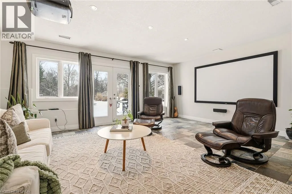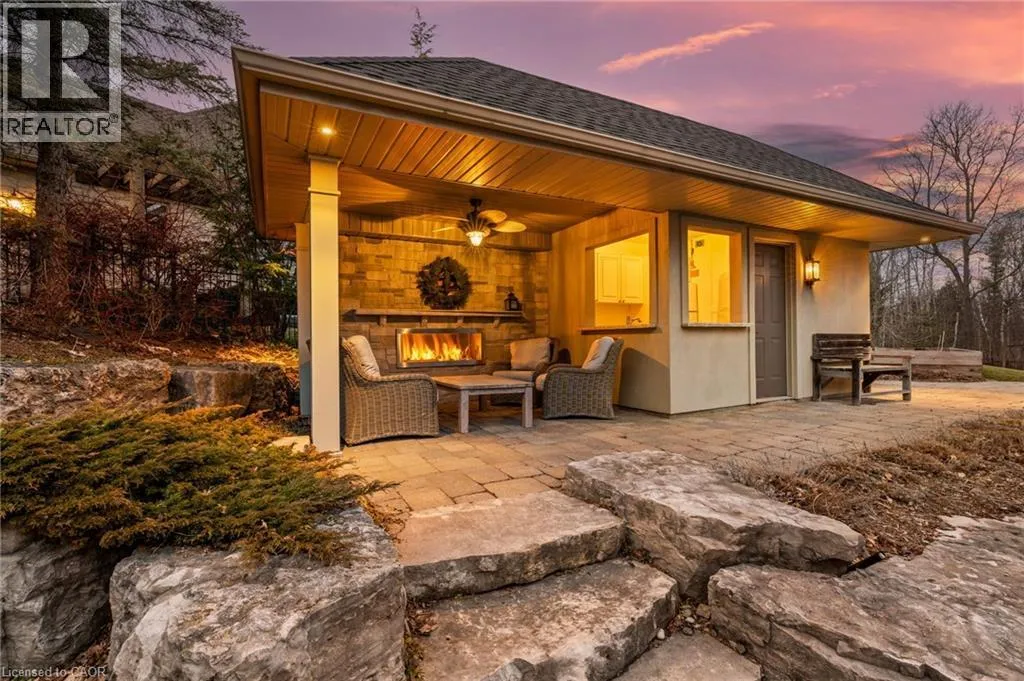 Carlisle Road & Palomino Drive Stately bungaloft located at the end of a quiet cul-de-sac in sought-after Palomino Estates. This well-designed home offers a main-floor primary suite, a bright family room with a fireplace, and a kitchen and dining area overlooking the wrap-around porch and private natural surroundings. Large windows throughout provide excellent light and views of the property. The full walkout lower level adds valuable living space with a self-contained nanny/in-law suite, an additional bedroom, a full bathroom, and a dedicated theatre room. Ideal for multi-generational living or extended stays. The backyard is a standout feature, designed for both relaxation and entertaining. Enjoy a saltwater pool, hot tub, covered pavilion with a gas fireplace and TV, outdoor kitchen, fire pit area, and generous green space. Backing onto conservation land, the setting offers exceptional privacy and a peaceful connection to nature. Located minutes from Waterdown, Burlington, schools, golf courses, hiking trails, Glen Eden, and major highways. A rare opportunity to enjoy country living with convenient access to nearby amenities and recreation. Let's get you home! (id:27476)