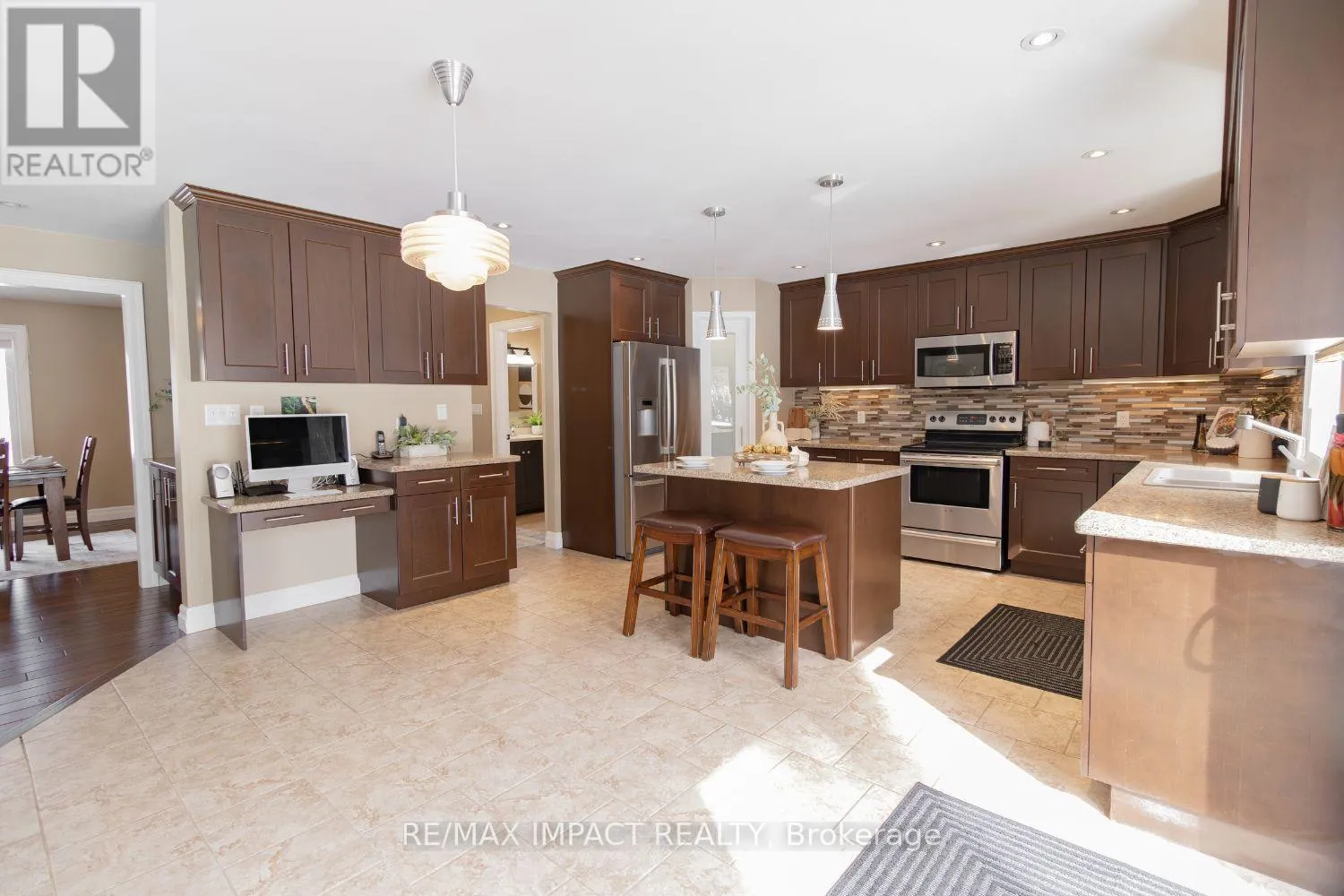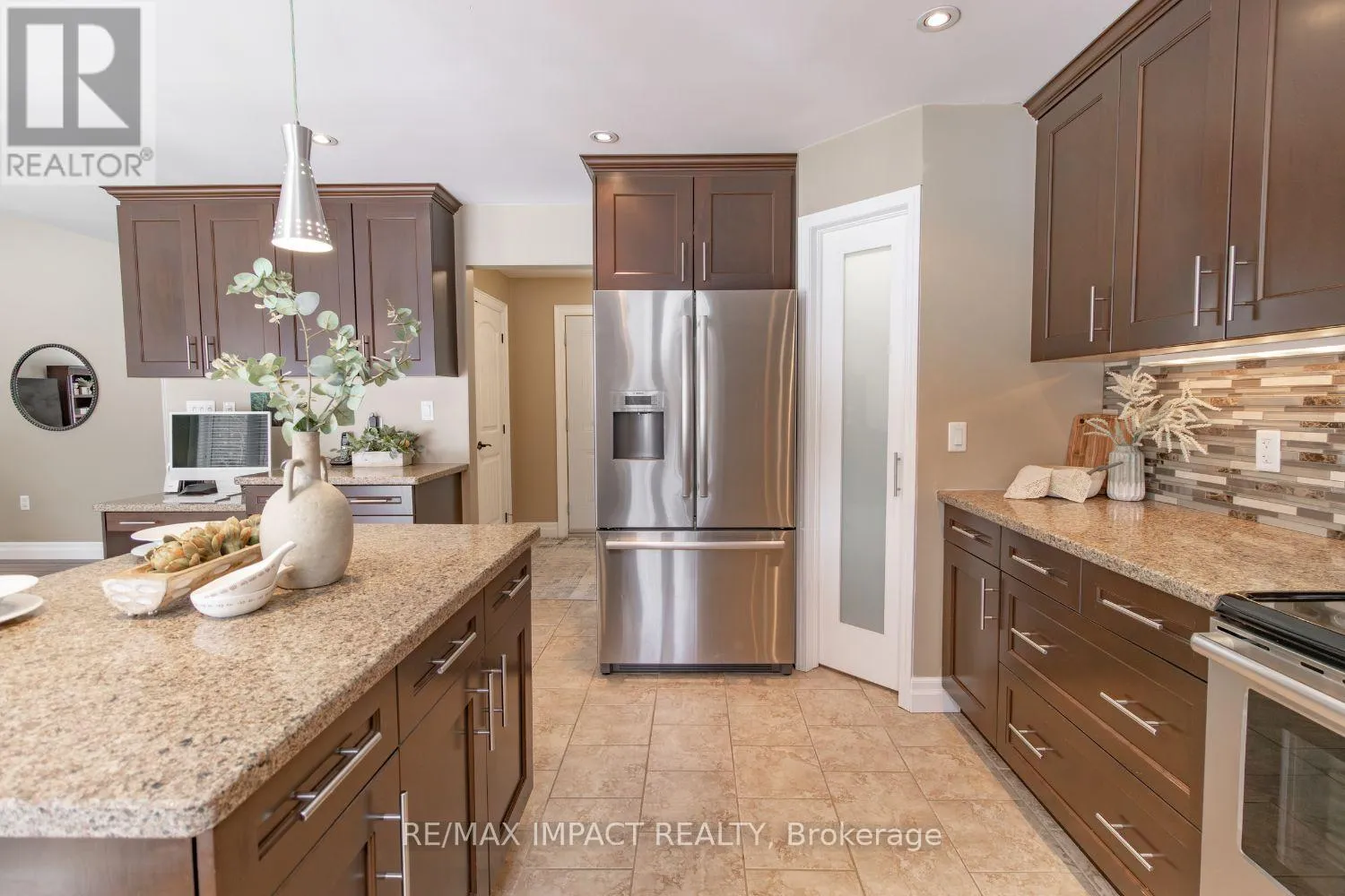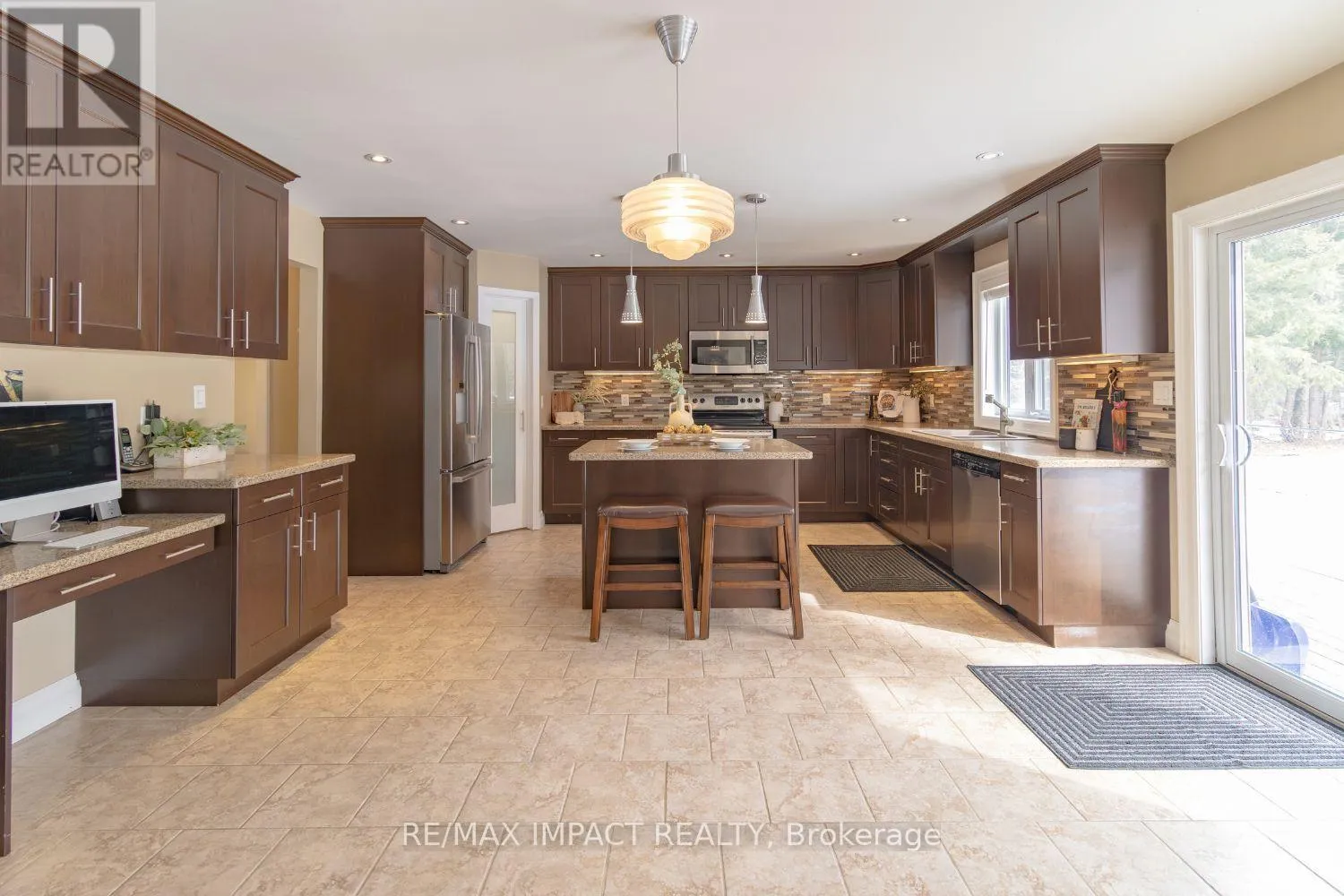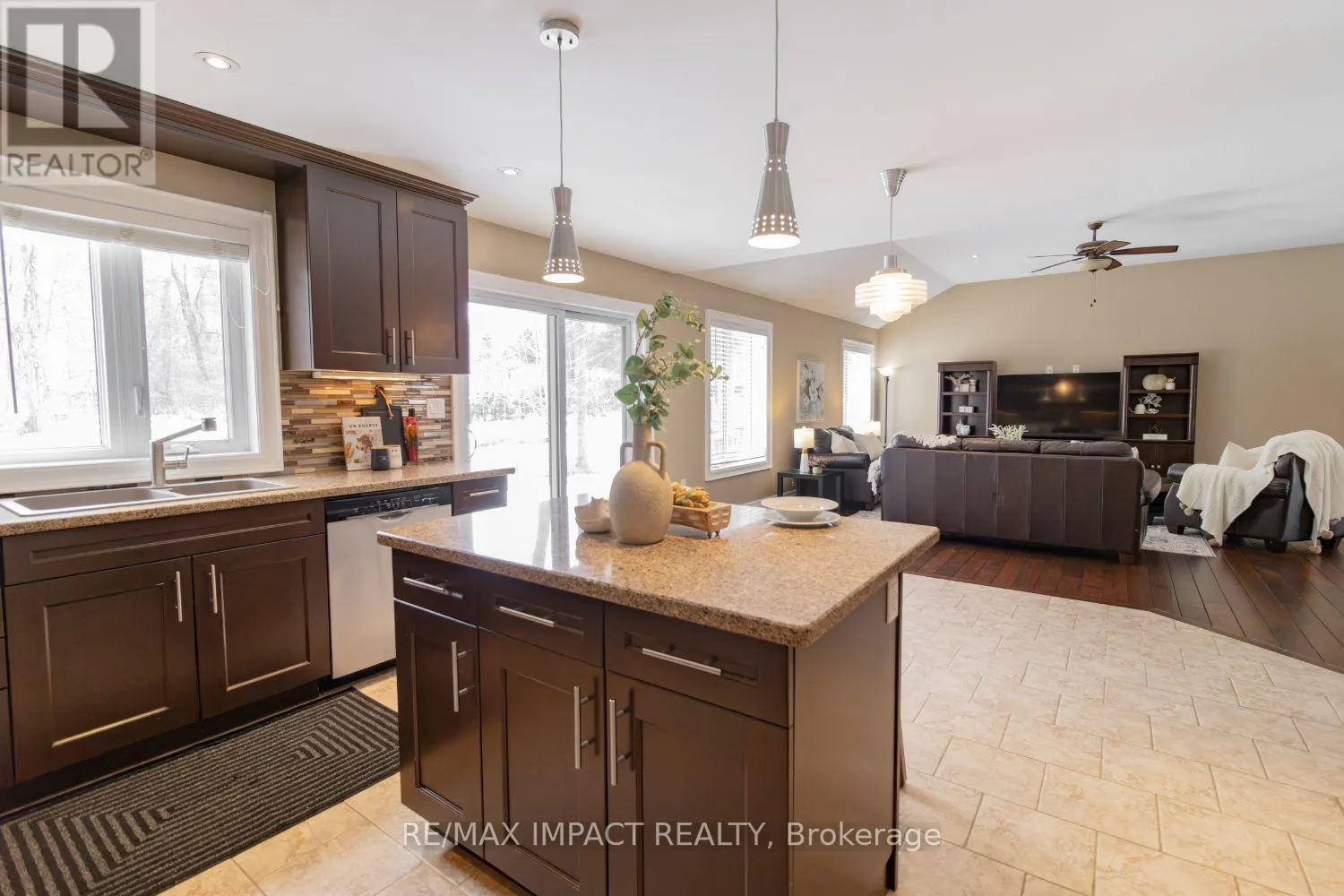 Cross Streets: Hwy 115 & Tapley Quarter Line. ** Directions: Hwy 115 to Tapley Quarter Line, go north on Tapley Quarter Line to Larmer Line and turn right to #489. Welcome to this stunning country property, a true gem built in 2011, nestled on a spacious 1.23 acre lot measuring 195' x 275'. This beautiful 2110 sf (per blueprint) bungalow boasts a charming stone and vinyl exterior, complemented by an attached heated four-car garage (1-double overhead door and 2 single overhead doors) and lots of parking for 10+ vehicles. Conveniently, the main floor offers direct access to the garage, while a secondary entrance leads to the basement from the garage, enhancing the home's functionality. At the heart of this property is a picturesque spring-fed pond located in the rear yard, approximately 10' deep, perfect for those seeking tranquility and natural beauty. The back yard features a wooden deck off the kitchen within a chain-link enclosure, providing a safe children's play area with playhouse and swing. Inside, the main level showcases an open-concept design that seamlessly connects the kitchen, great room, and separate dining area. The kitchen features rich dark cabinetry with granite countertops, stainless steel appliances, ceramic backsplash and separate desk area. The ceramic tile flooring adds durability, while a corner pantry with shelving and a convenient two-piece powder room enhance practicality. The kitchen also opens up to a deck that overlooks the pond and is surrounded by mature trees, creating a country outdoor retreat. The great room is highlighted by a large picture window, vaulted ceiling and pot lights with hardwood flooring. Double entry doors lead to the spacious primary bedroom, which includes a walk-in closet and a 5-piece ensuite complete with soaking tub, separate shower and 2 sink vanity. Two additional front bedrooms and a well-appointed 4-piece main bathroom complete the main floor. (id:27476)