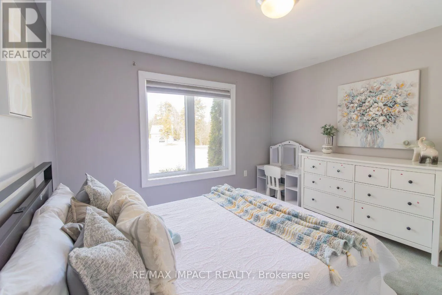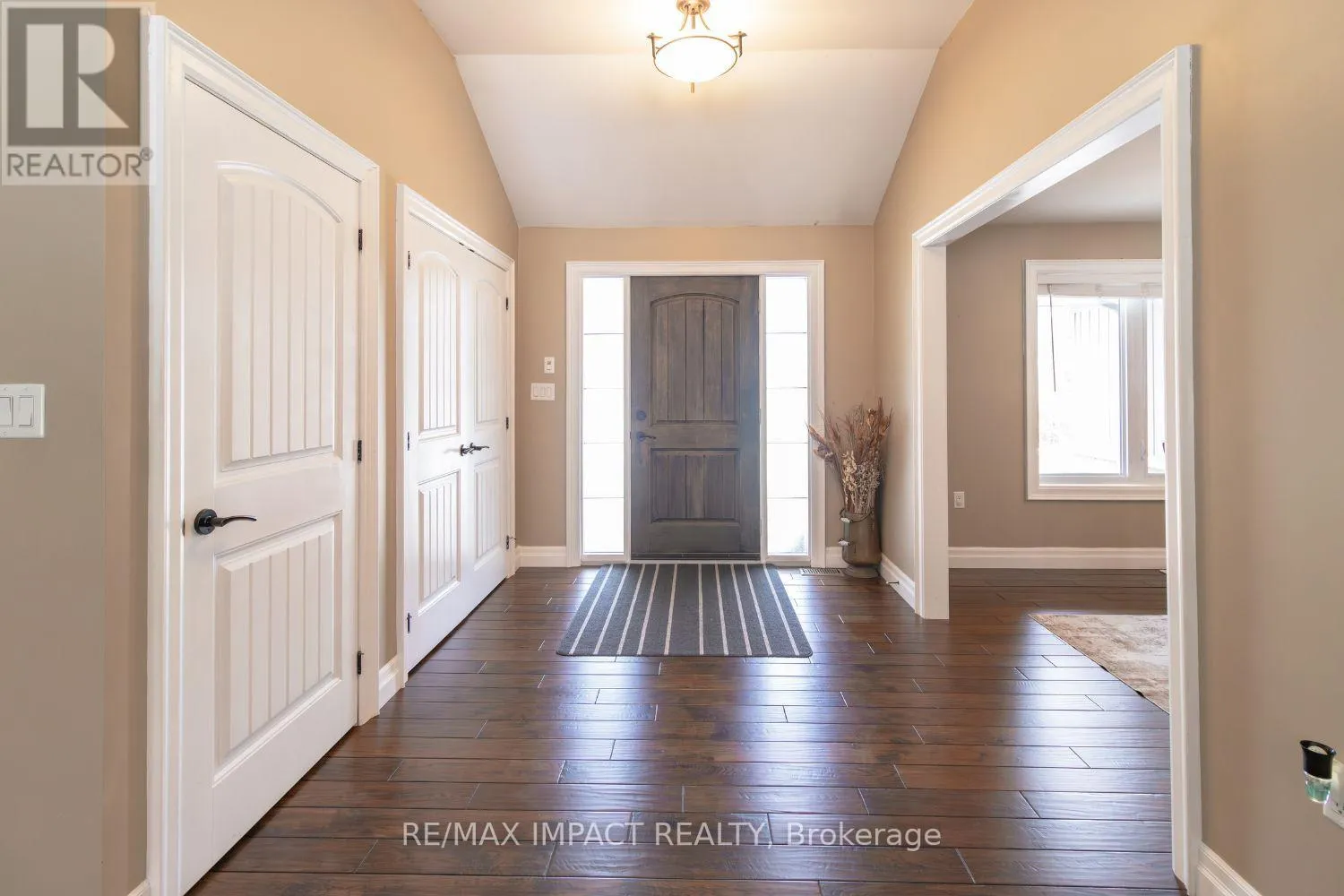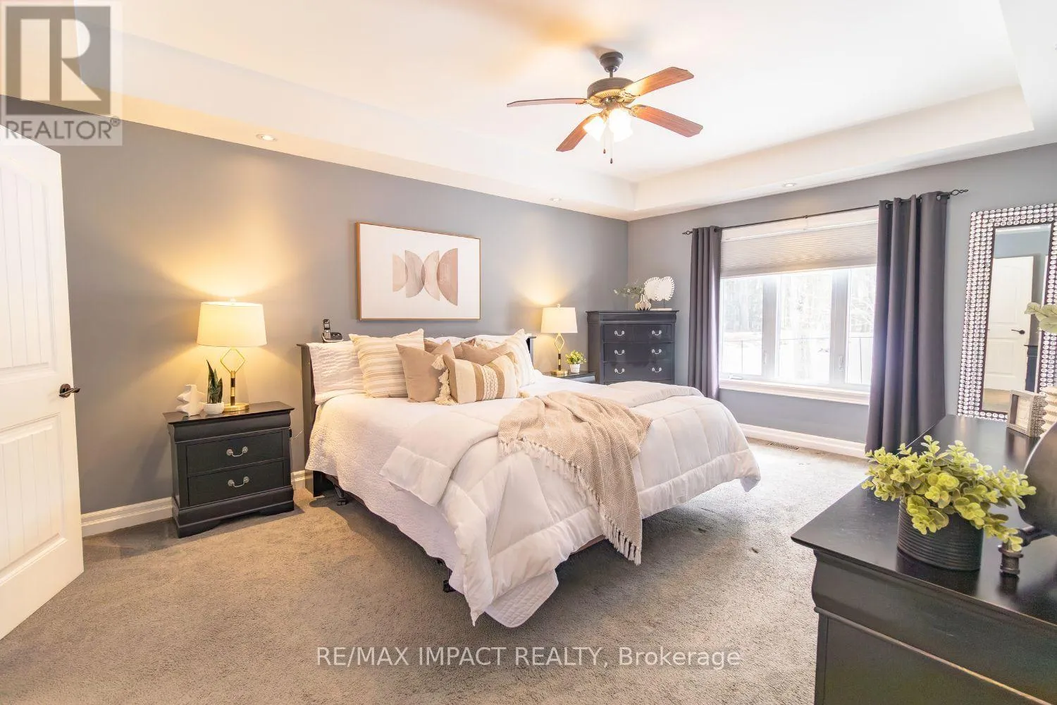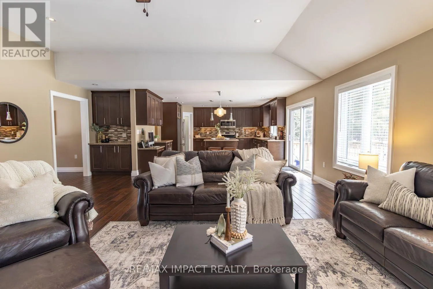 Cross Streets: Hwy 115 & Tapley Quarter Line. ** Directions: Hwy 115 to Tapley Quarter Line, go north on Tapley Quarter Line to Larmer Line and turn right to #489. Welcome to this stunning country property, a true gem built in 2011, nestled on a spacious 1.23 acre lot measuring 195' x 275'. This beautiful 2110 sf (per blueprint) bungalow boasts a charming stone and vinyl exterior, complemented by an attached heated four-car garage (1-double overhead door and 2 single overhead doors) and lots of parking for 10+ vehicles. Conveniently, the main floor offers direct access to the garage, while a secondary entrance leads to the basement from the garage, enhancing the home's functionality. At the heart of this property is a picturesque spring-fed pond located in the rear yard, approximately 10' deep, perfect for those seeking tranquility and natural beauty. The back yard features a wooden deck off the kitchen within a chain-link enclosure, providing a safe children's play area with playhouse and swing. Inside, the main level showcases an open-concept design that seamlessly connects the kitchen, great room, and separate dining area. The kitchen features rich dark cabinetry with granite countertops, stainless steel appliances, ceramic backsplash and separate desk area. The ceramic tile flooring adds durability, while a corner pantry with shelving and a convenient two-piece powder room enhance practicality. The kitchen also opens up to a deck that overlooks the pond and is surrounded by mature trees, creating a country outdoor retreat. The great room is highlighted by a large picture window, vaulted ceiling and pot lights with hardwood flooring. Double entry doors lead to the spacious primary bedroom, which includes a walk-in closet and a 5-piece ensuite complete with soaking tub, separate shower and 2 sink vanity. Two additional front bedrooms and a well-appointed 4-piece main bathroom complete the main floor. (id:27476)
