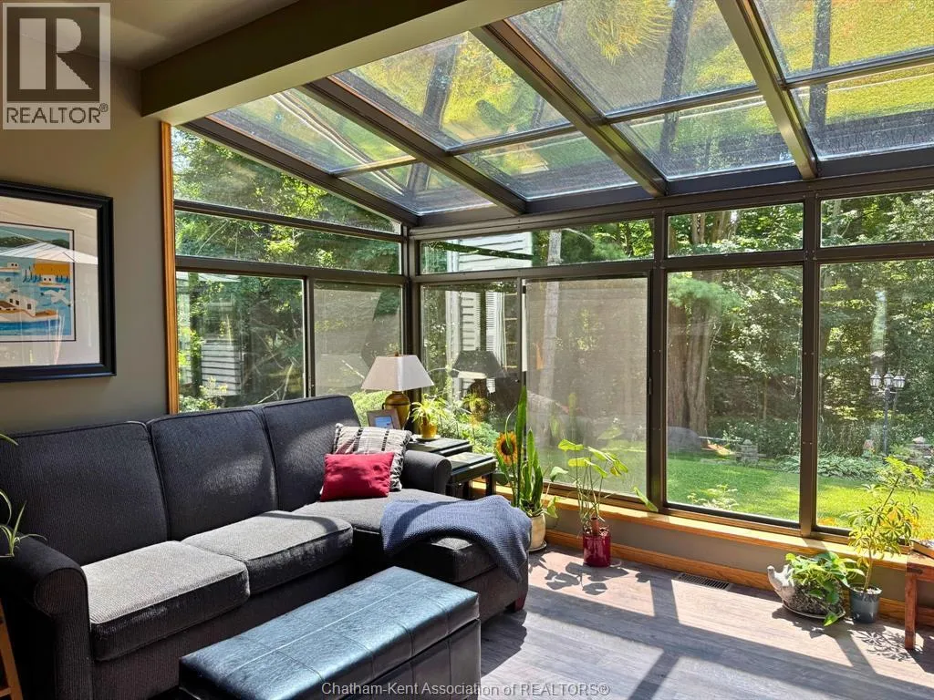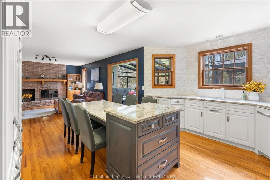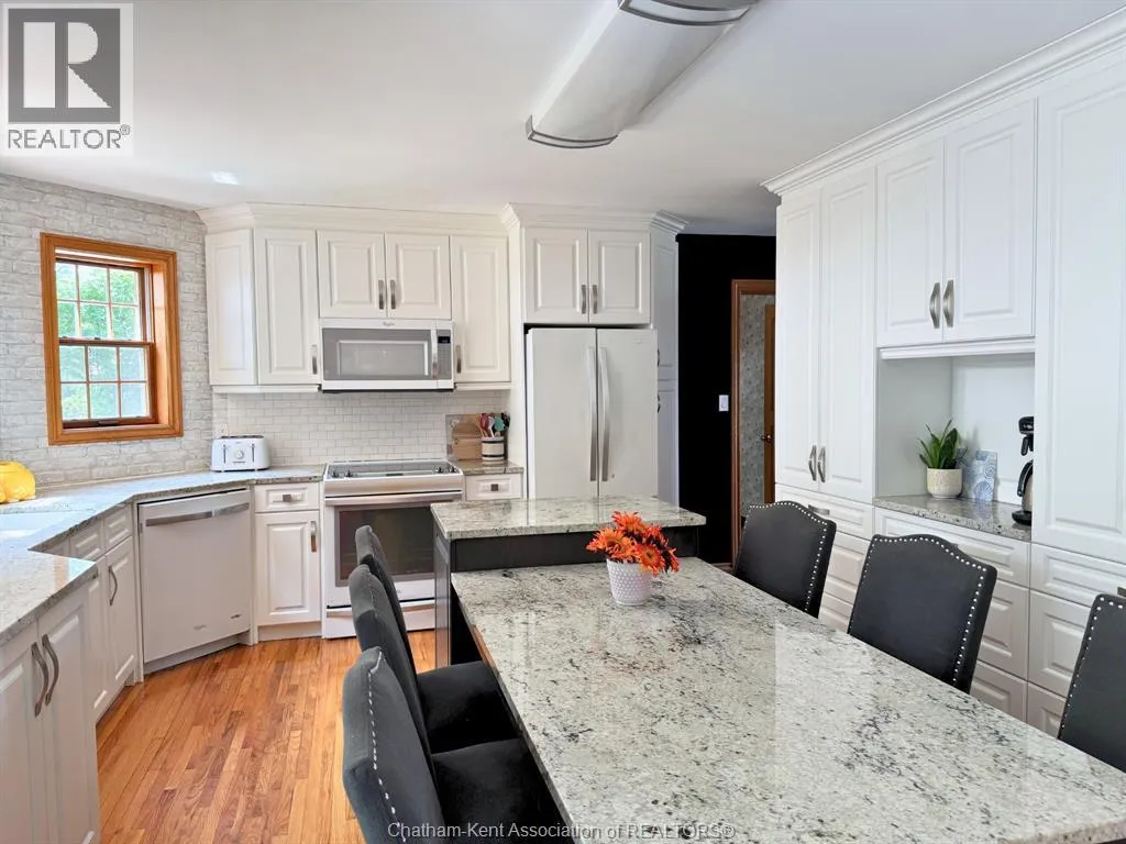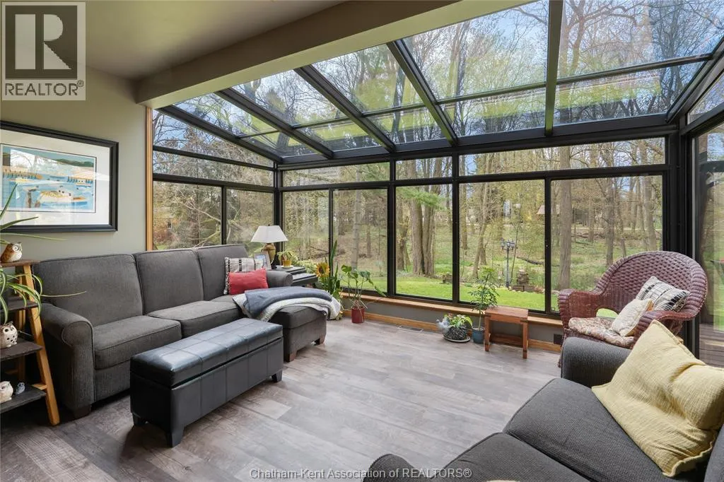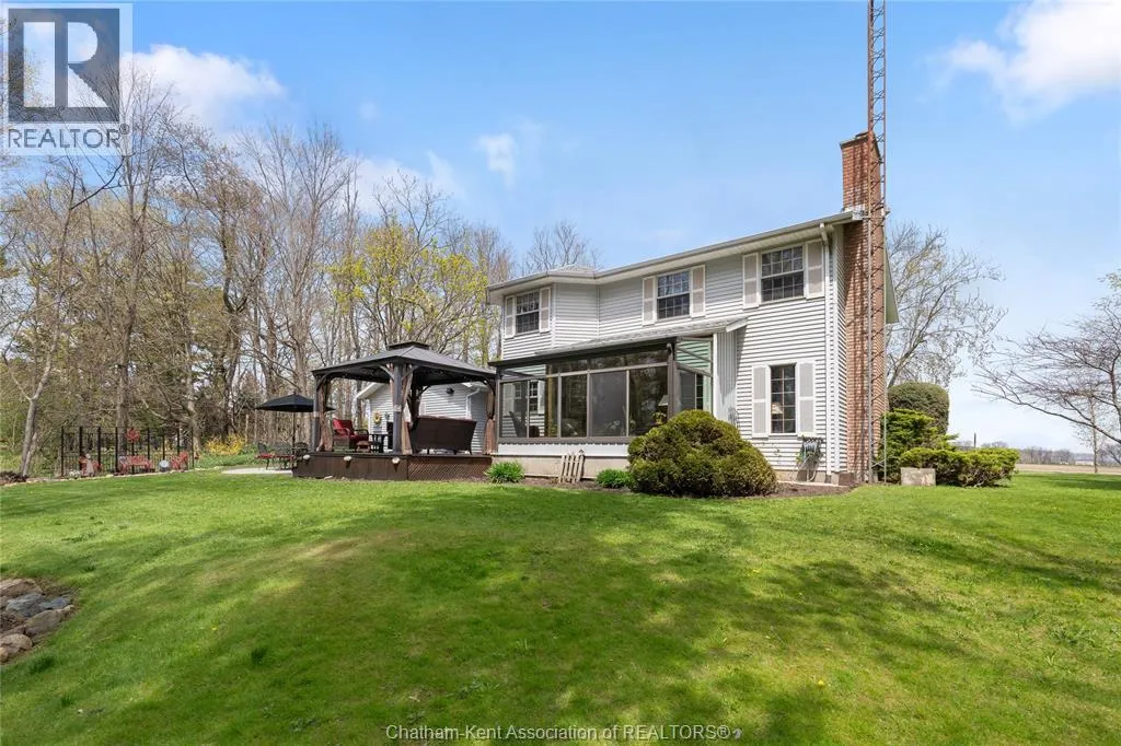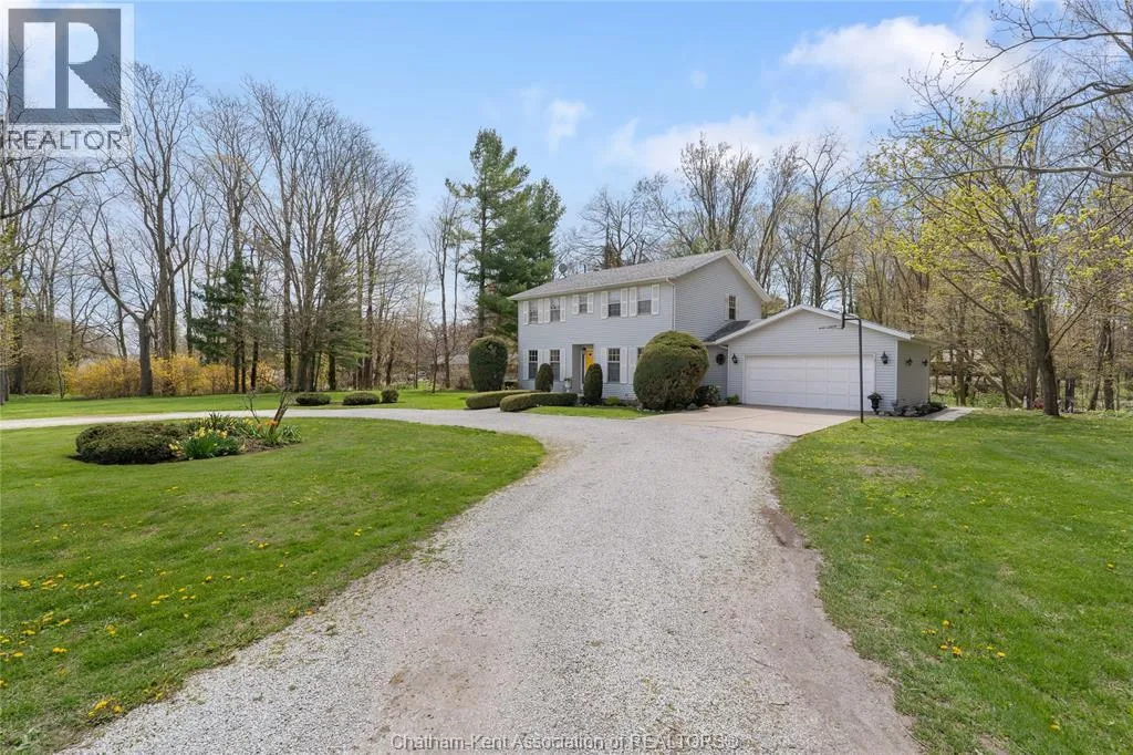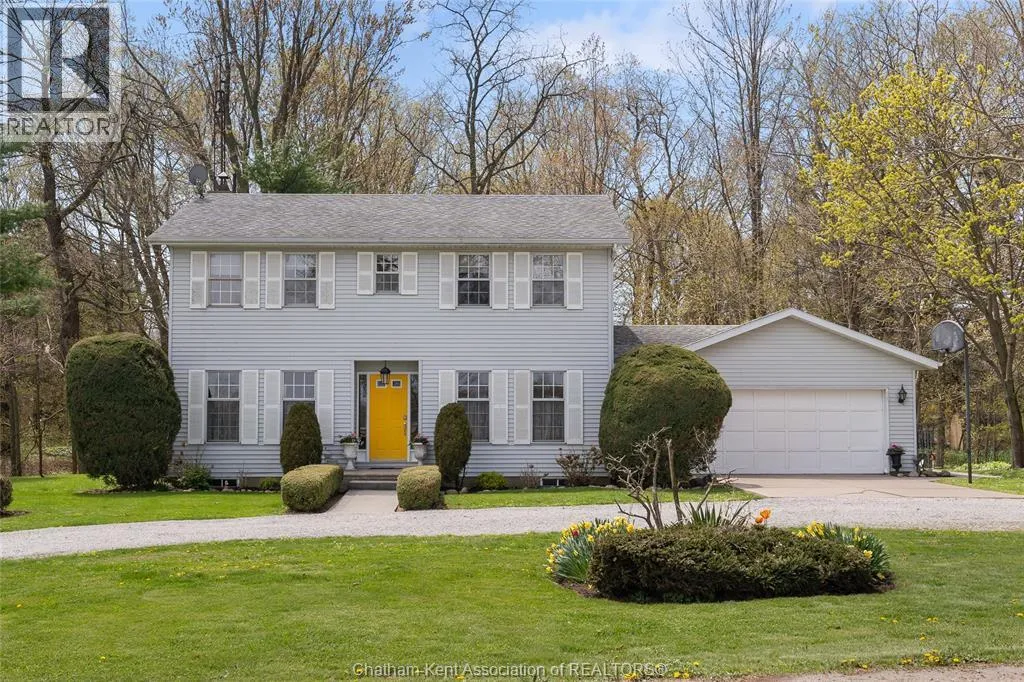 Heading west from Blenheim on Talbot Trail, turn left onto Douglas Road. Home is located on the right hand side. Welcome to 19196 Douglas Road â a beautiful 2-storey colonial-style home nestled in the peaceful and sought-after Sleepy Hollow community, just minutes from Lake Erie and downtown Blenheim. This lovingly maintained property sits on a lush, tree-lined 1-acre lot and offers 4 spacious bedrooms, 2.5 bathrooms including a private ensuite with laundry, and a bright 4-season sunroom overlooking a backyard filled with nature. The updated kitchen features granite countertops, a large island, and flows seamlessly into the cozy living room with a wood-burning fireplace. Enjoy a formal dining area, oversized front family room, and a convenient 2-piece bathroom just off the attached double garage. The partially finished basement offers flex space perfect for a rec room, home gym, or studio. With geothermal heating, mature landscaping, and charming curb appeal, this property blends rural tranquility with comfort and style. A rare gem in one of Blenheimâs best pockets! (id:27476)