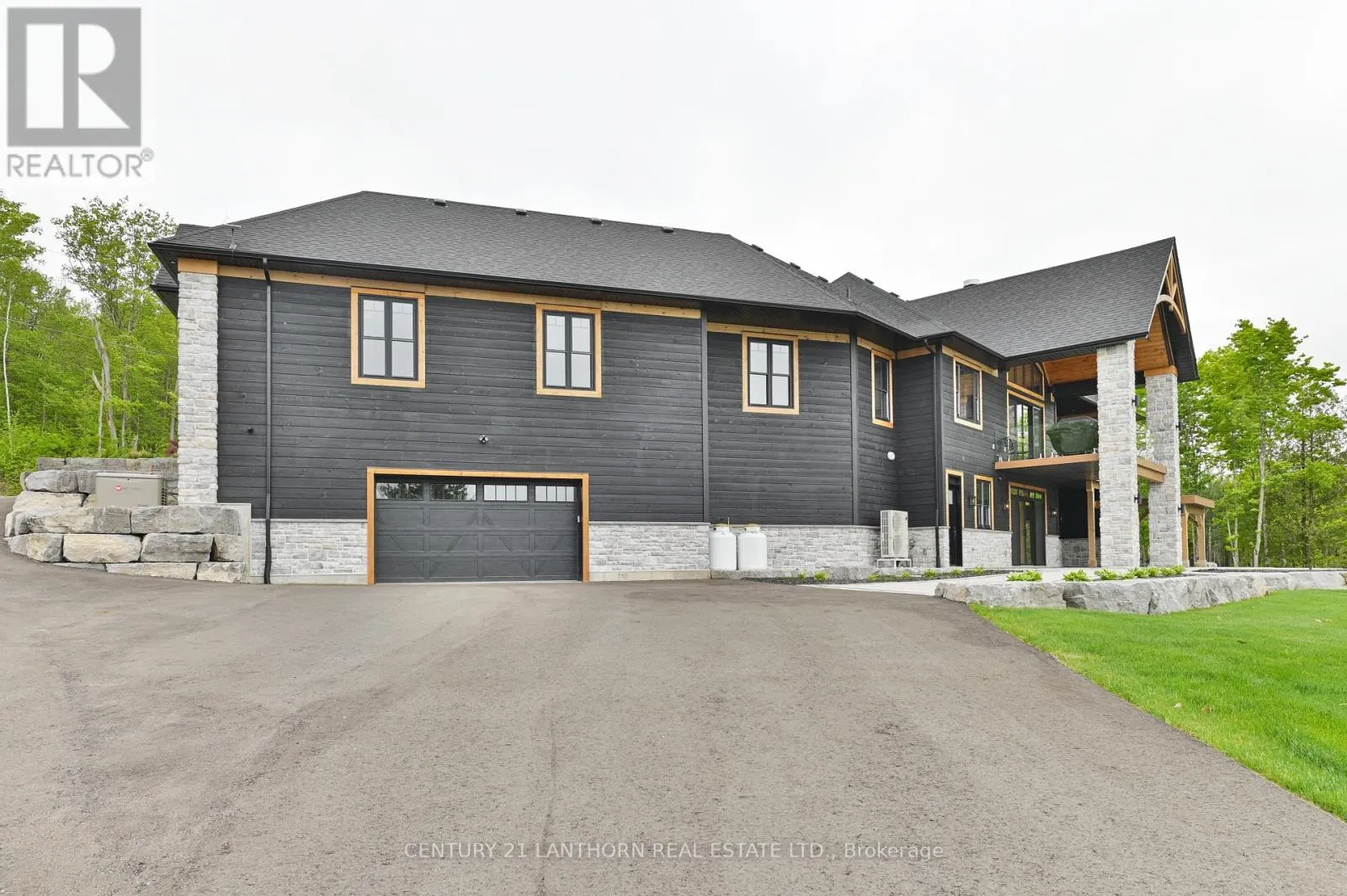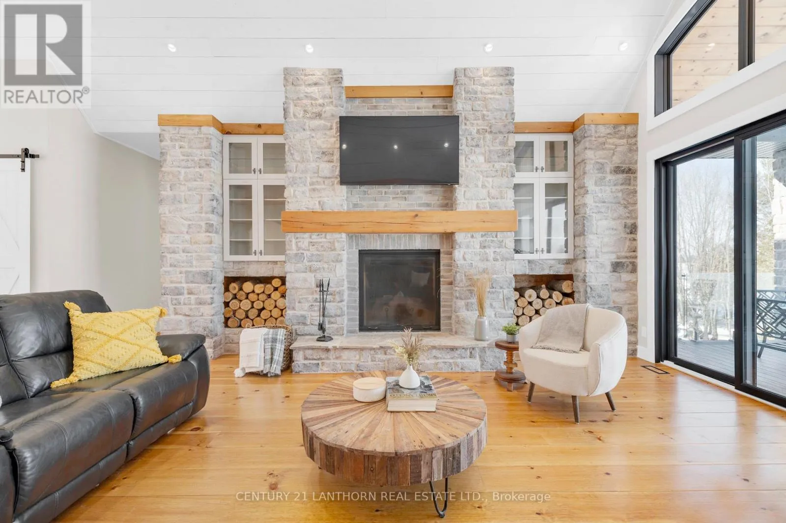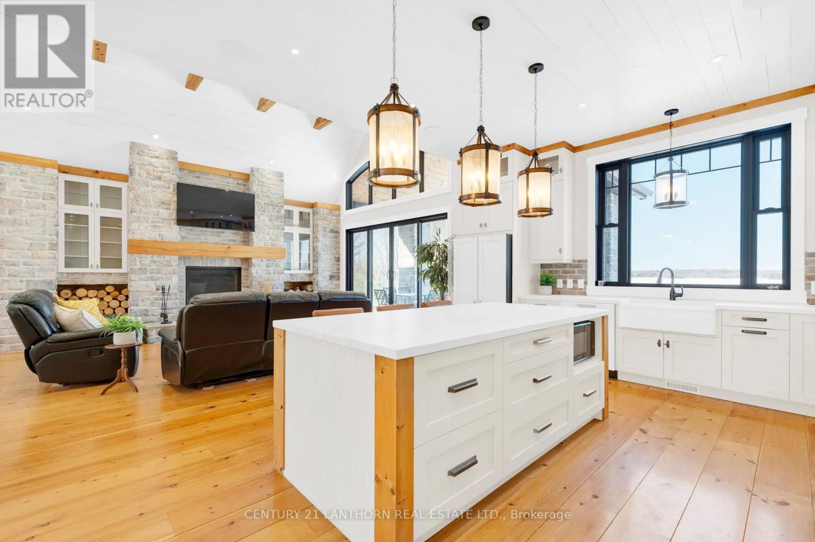 Cross Streets: Quin-Mo-Lac Rd/Mile Pt Lane. ** Directions: HWY 62 to Quin-Mo-Lac Rd to Mile Point Lane. Lake life at its finest! Check out this exceptional 4-bedroom, 5-bath waterfront home located on the highly sought-after south shore of Moira Lake, and offering over 4,800 sq. ft. of beautifully finished living space with unobstructed lake views. Located in an area of newer customs homes and offers immaculate landscaping, a private boat launch, and hard-bottom shoreline make this a rare and impressive offering. A paved circular driveway leads to a triple garage with epoxy floors, plus a bonus lower-level garage with access all the way down to the water. Smart home technology throughout both levels provides modern convenience. A stone-pillared entrance welcomes you into a vaulted foyer that opens to the great room, where breathtaking lake views take center stage. Wide-plank flooring throughout adds timeless sophistication, while a custom stone wood-burning fireplace anchors the open-concept kitchen and living area, featuring matching stonework and a large center island-ideal for entertaining. A spacious formal dining room with an office area completes the main living space. The main level includes two bedrooms, highlighted by a luxurious primary suite with private deck access and a spa-like 5-piece ensuite with soaker tub and walk-in shower. The fully finished walkout lower level offers a large rec room with propane fireplace, bar rough-in, games room suitable for a pool table or golf simulator, theatre room, 10'x16' cold room, two additional bedrooms, two baths, and access to a finished patio overlooking the waterfront. Professionally landscaped grounds include an irrigation system, stamped concrete firepit area at the water's edge with stone island and bar fridge, an aluminum docking system with depth to dive in for a dip to cool off, finished with armor stone break wall and erosion-proof river stone. Enjoy excellent boating and fishing, with close proximity to the Heritage Trail for ATV and snowmobile use. No expense spared. Approx. 2 hours to Toronto or Ottawa. (id:27476)