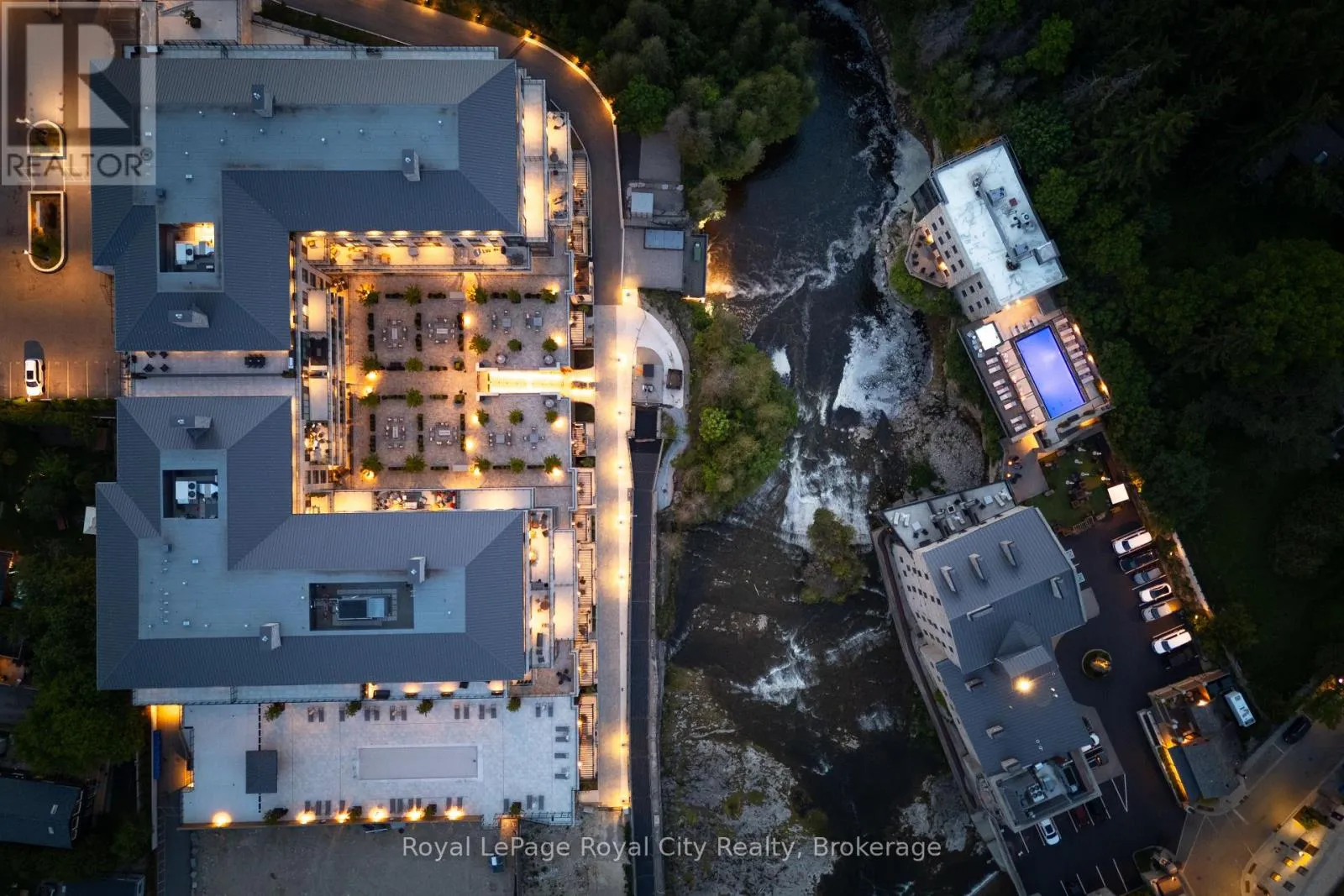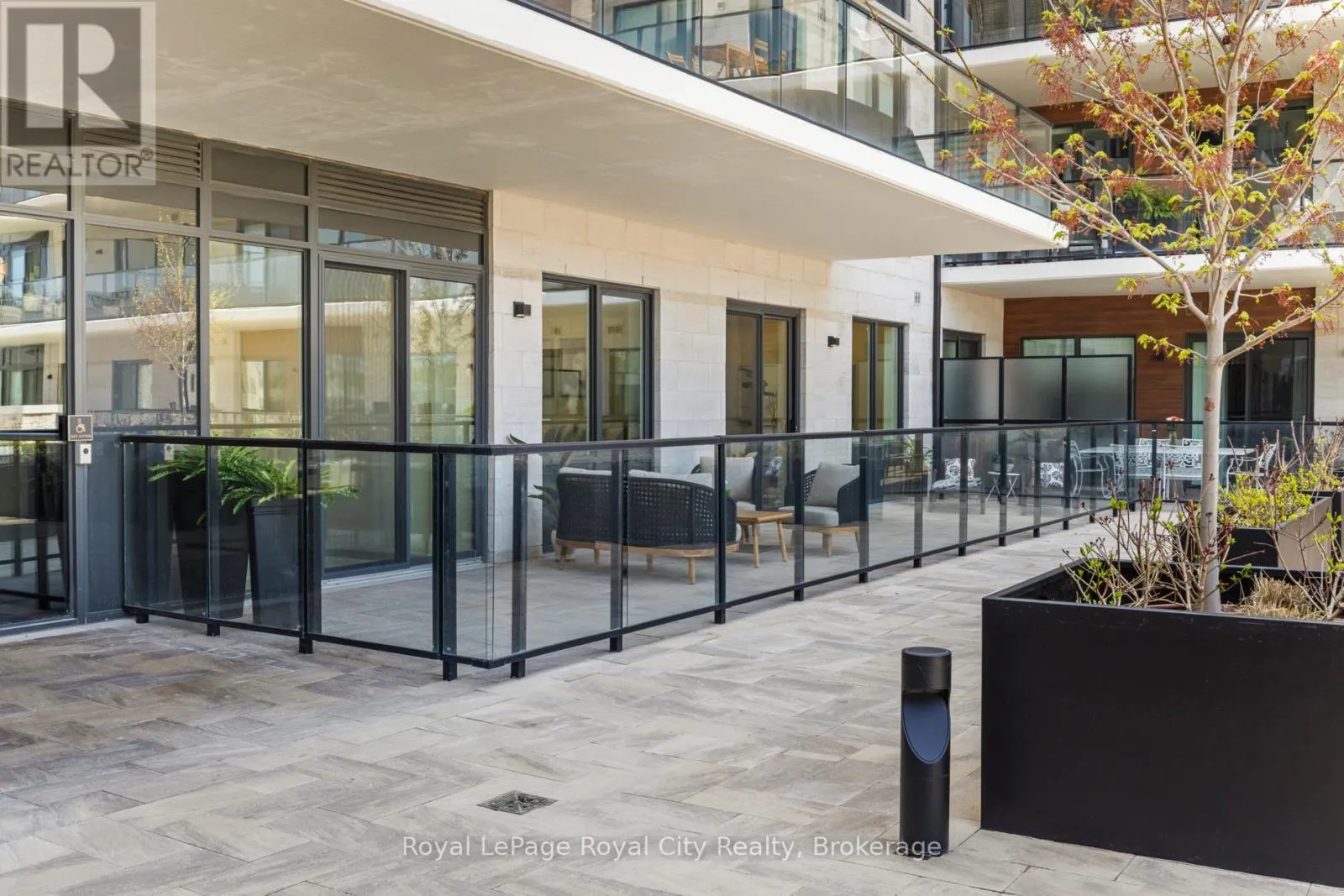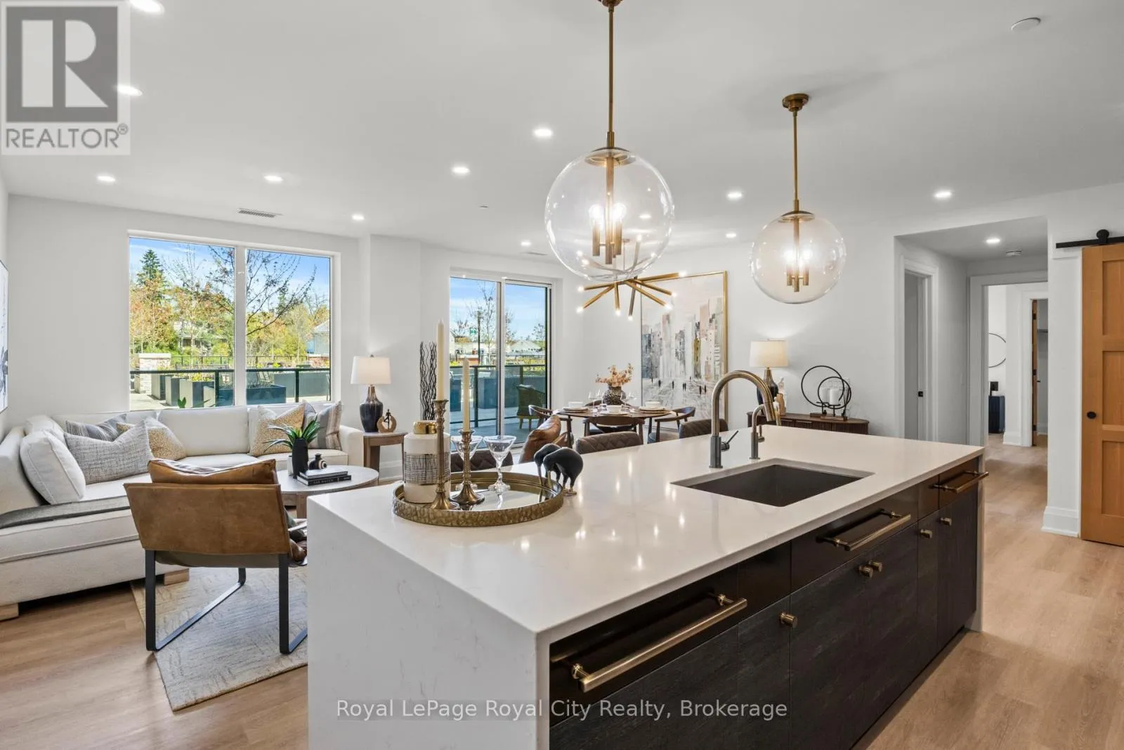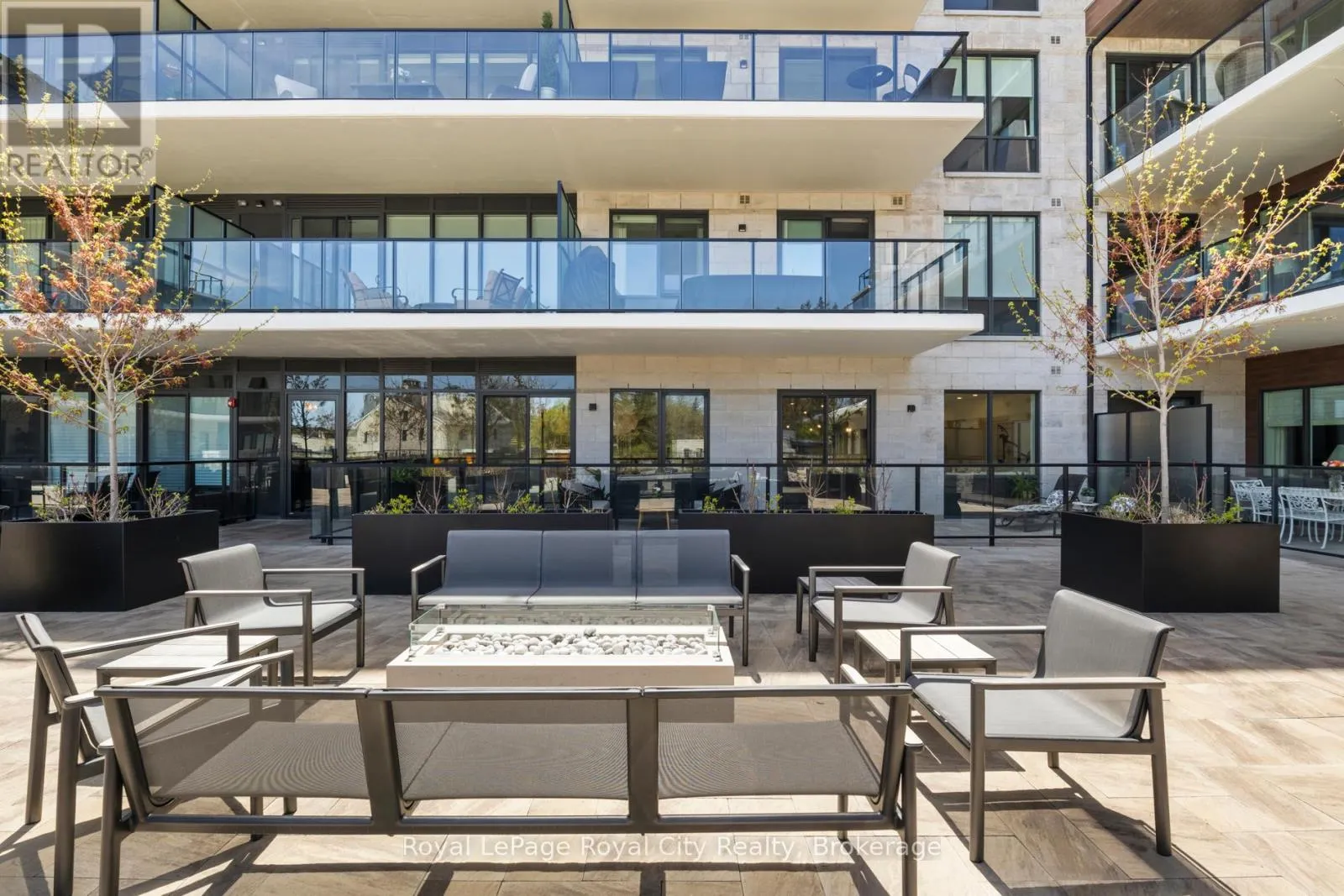 Cross Streets: McNab and Wellington Rd7. ** Directions: Wellington County Road 7, cross lights at Water Street, head north, property entrance is on the right before the Grand River Bridge. Riverside Condo with Expansive Patio, brimming with riverside sounds and entertaining space. This stunning 2-bedroom plus den condo offers a unique blend of luxury, comfort, and natural beauty. One of the standout features is the spacious 400+ sq ft patio, which serves as an exceptional outdoor living space. With a large covered area perfect for entertaining and a sunlit private corner, its the ideal spot to relax and enjoy the soothing sounds of the river. Inside, the condo is filled with natural light and designed with a functional, open-concept layout. The kitchen features a large island, seamlessly connecting the living and dining areas. Even with a full-sized dining table and sectional, the space remains airy and open.The primary bedroom offers direct access to the covered patio and includes an ample 4-piece ensuite, complete with a large walk-in shower, heated floors, and upgraded toilet with luxury features. The second bathroom is a 3-piece layout, walk-in shower, heated flooring, and similar high-end finishes. A private den/office is thoughtfully tucked away from the main living areas, making it perfect for remote work or quiet study. The walk-in laundry room provides ample space for storage and organization. (id:27476)