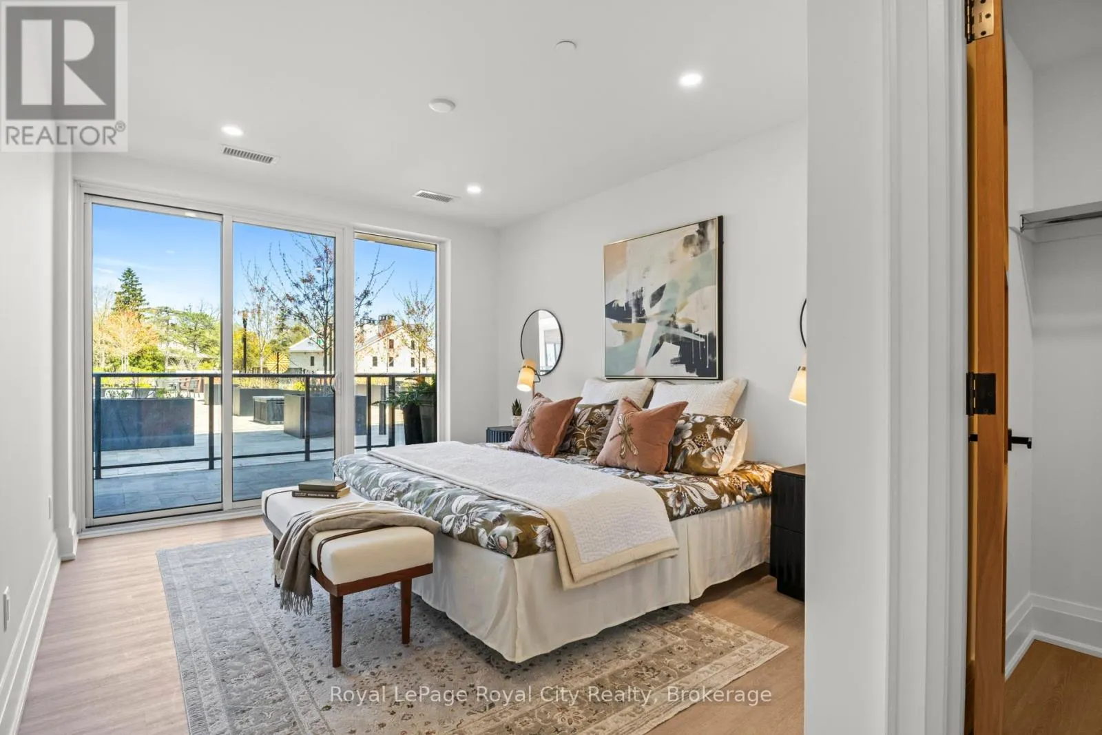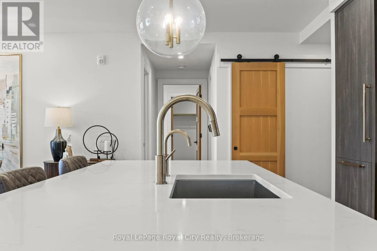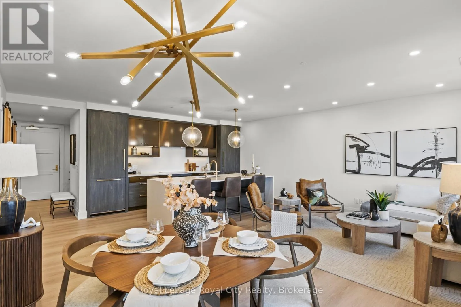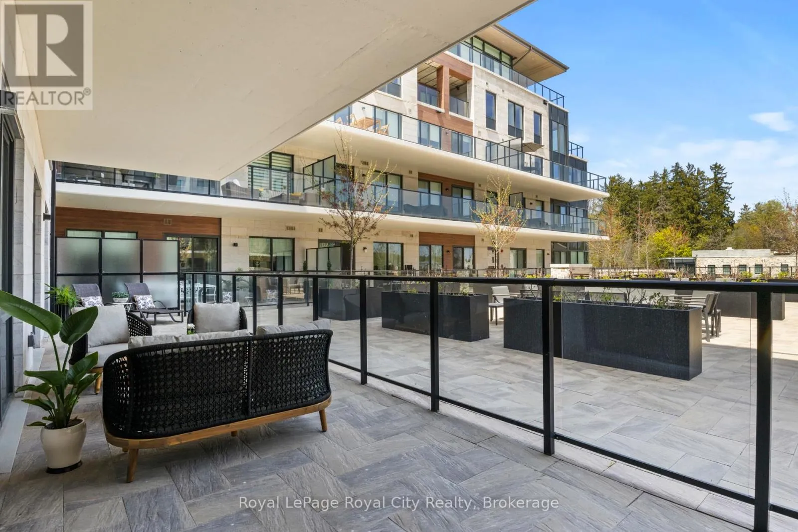 Cross Streets: McNab and Wellington Rd7. ** Directions: Wellington County Road 7, cross lights at Water Street, head north, property entrance is on the right before the Grand River Bridge. Riverside Condo with Expansive Patio, brimming with riverside sounds and entertaining space. This stunning 2-bedroom plus den condo offers a unique blend of luxury, comfort, and natural beauty. One of the standout features is the spacious 400+ sq ft patio, which serves as an exceptional outdoor living space. With a large covered area perfect for entertaining and a sunlit private corner, its the ideal spot to relax and enjoy the soothing sounds of the river. Inside, the condo is filled with natural light and designed with a functional, open-concept layout. The kitchen features a large island, seamlessly connecting the living and dining areas. Even with a full-sized dining table and sectional, the space remains airy and open.The primary bedroom offers direct access to the covered patio and includes an ample 4-piece ensuite, complete with a large walk-in shower, heated floors, and upgraded toilet with luxury features. The second bathroom is a 3-piece layout, walk-in shower, heated flooring, and similar high-end finishes. A private den/office is thoughtfully tucked away from the main living areas, making it perfect for remote work or quiet study. The walk-in laundry room provides ample space for storage and organization. (id:27476)