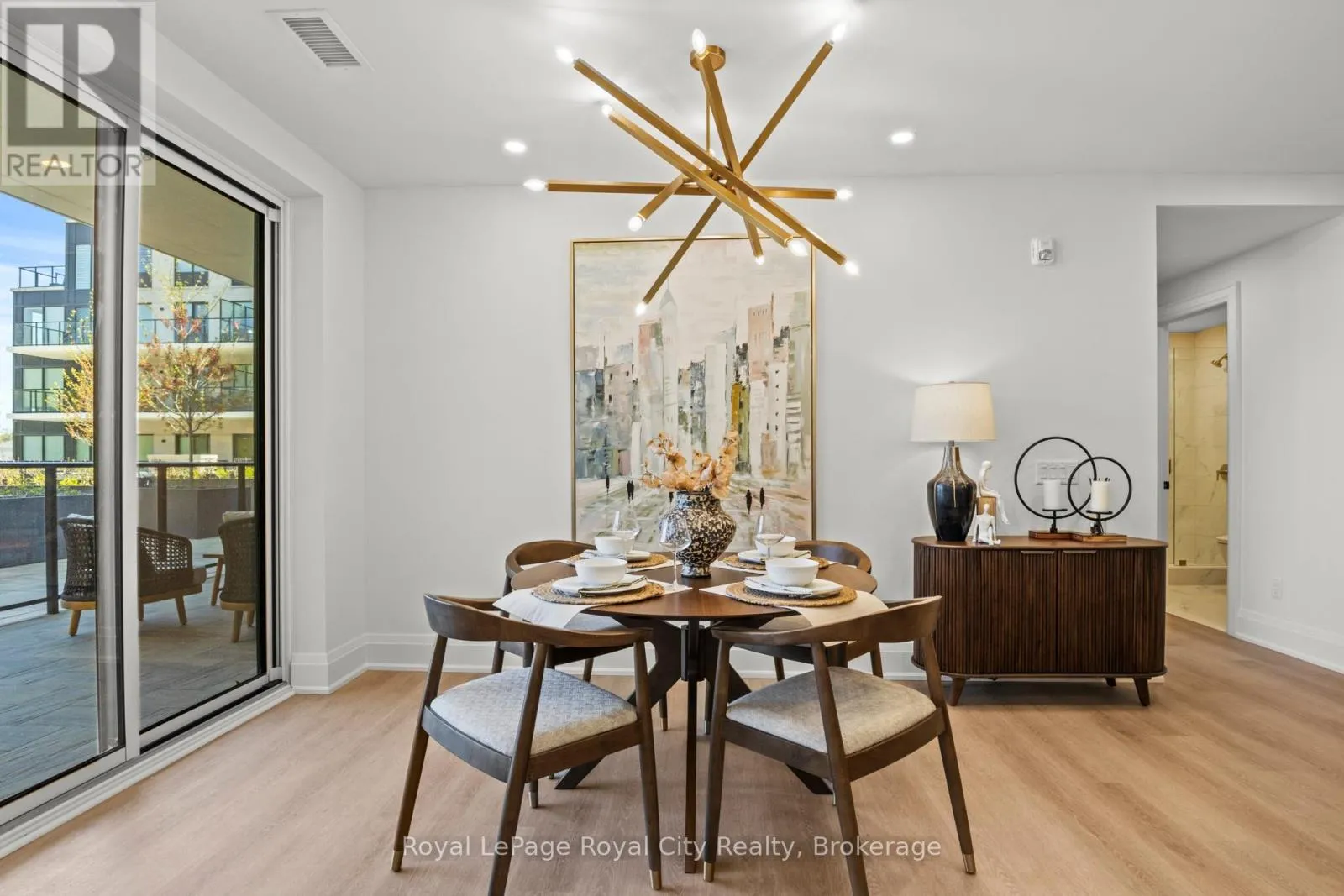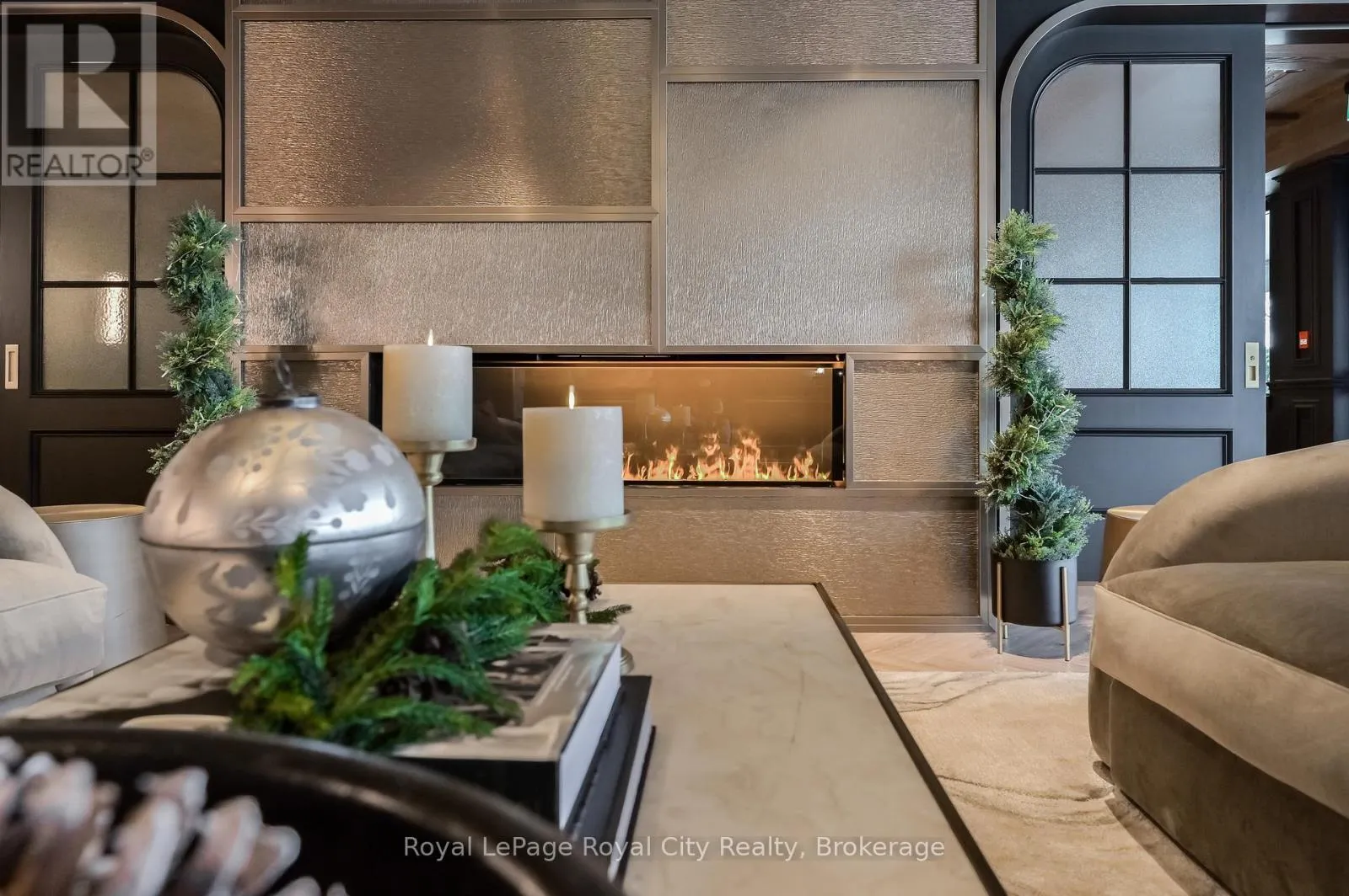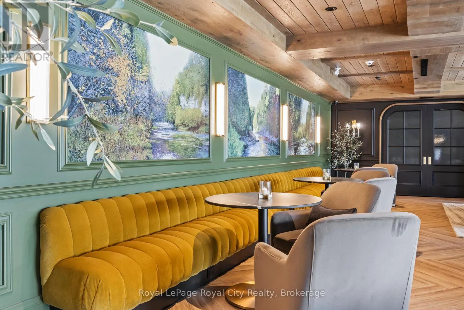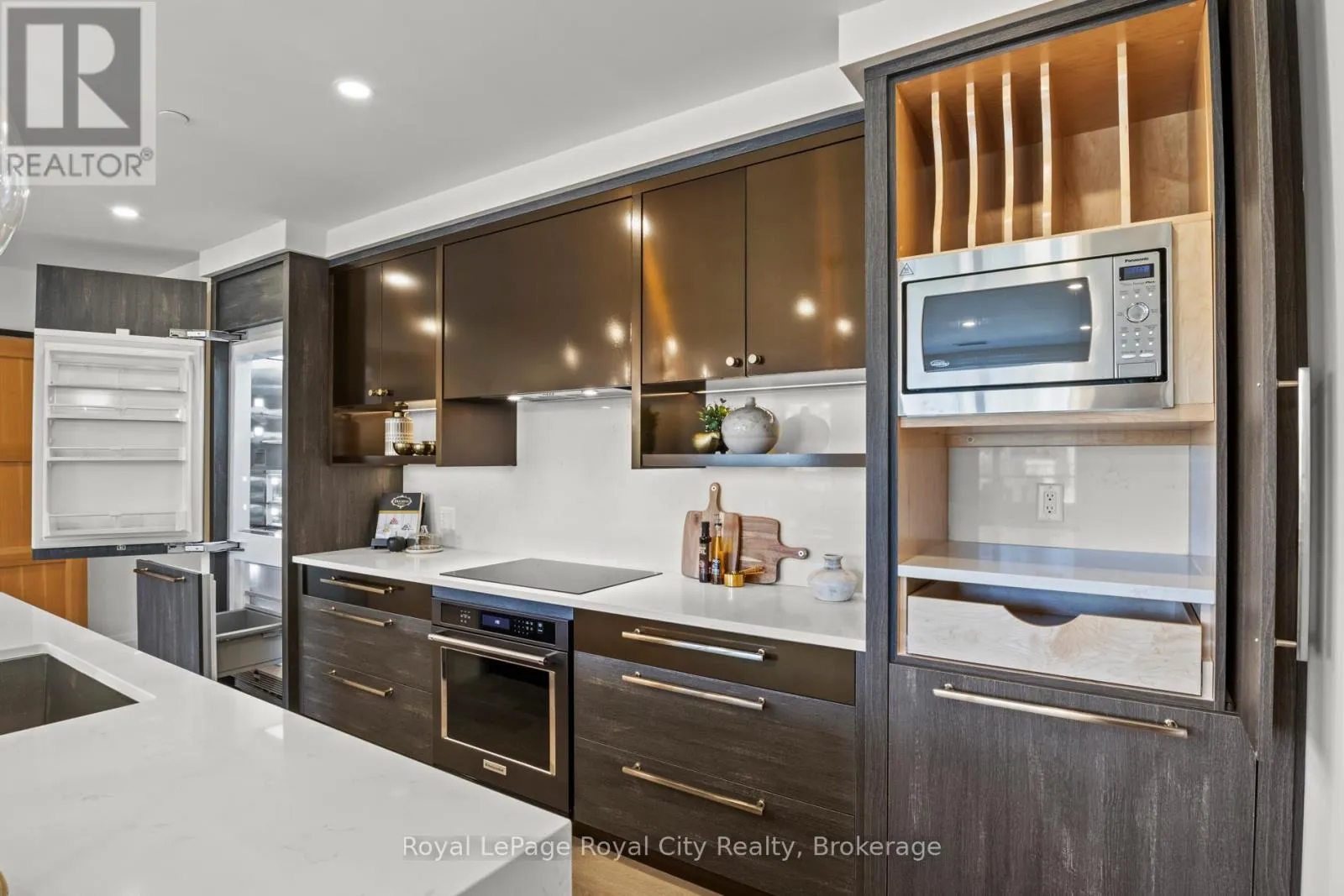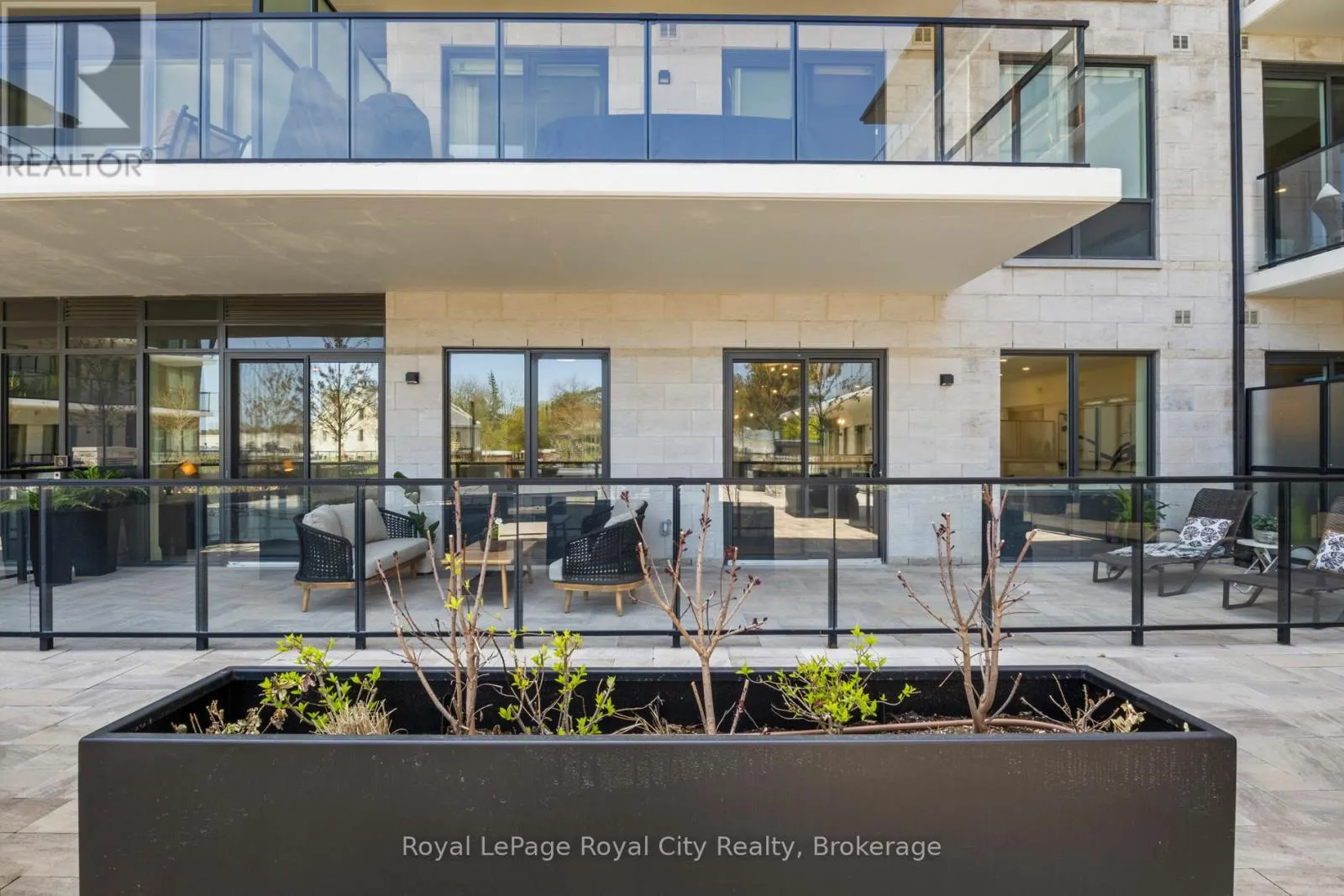 Cross Streets: McNab and Wellington Rd7. ** Directions: Wellington County Road 7, cross lights at Water Street, head north, property entrance is on the right before the Grand River Bridge. Riverside Condo with Expansive Patio, brimming with riverside sounds and entertaining space. This stunning 2-bedroom plus den condo offers a unique blend of luxury, comfort, and natural beauty. One of the standout features is the spacious 400+ sq ft patio, which serves as an exceptional outdoor living space. With a large covered area perfect for entertaining and a sunlit private corner, its the ideal spot to relax and enjoy the soothing sounds of the river. Inside, the condo is filled with natural light and designed with a functional, open-concept layout. The kitchen features a large island, seamlessly connecting the living and dining areas. Even with a full-sized dining table and sectional, the space remains airy and open.The primary bedroom offers direct access to the covered patio and includes an ample 4-piece ensuite, complete with a large walk-in shower, heated floors, and upgraded toilet with luxury features. The second bathroom is a 3-piece layout, walk-in shower, heated flooring, and similar high-end finishes. A private den/office is thoughtfully tucked away from the main living areas, making it perfect for remote work or quiet study. The walk-in laundry room provides ample space for storage and organization. (id:27476)