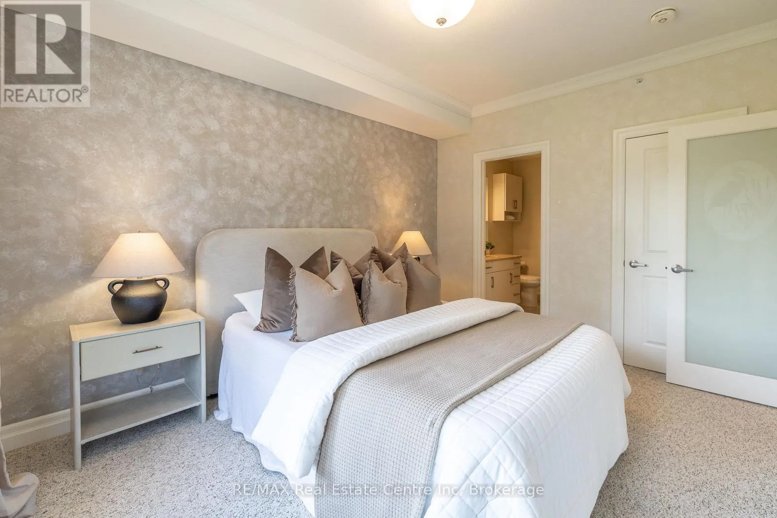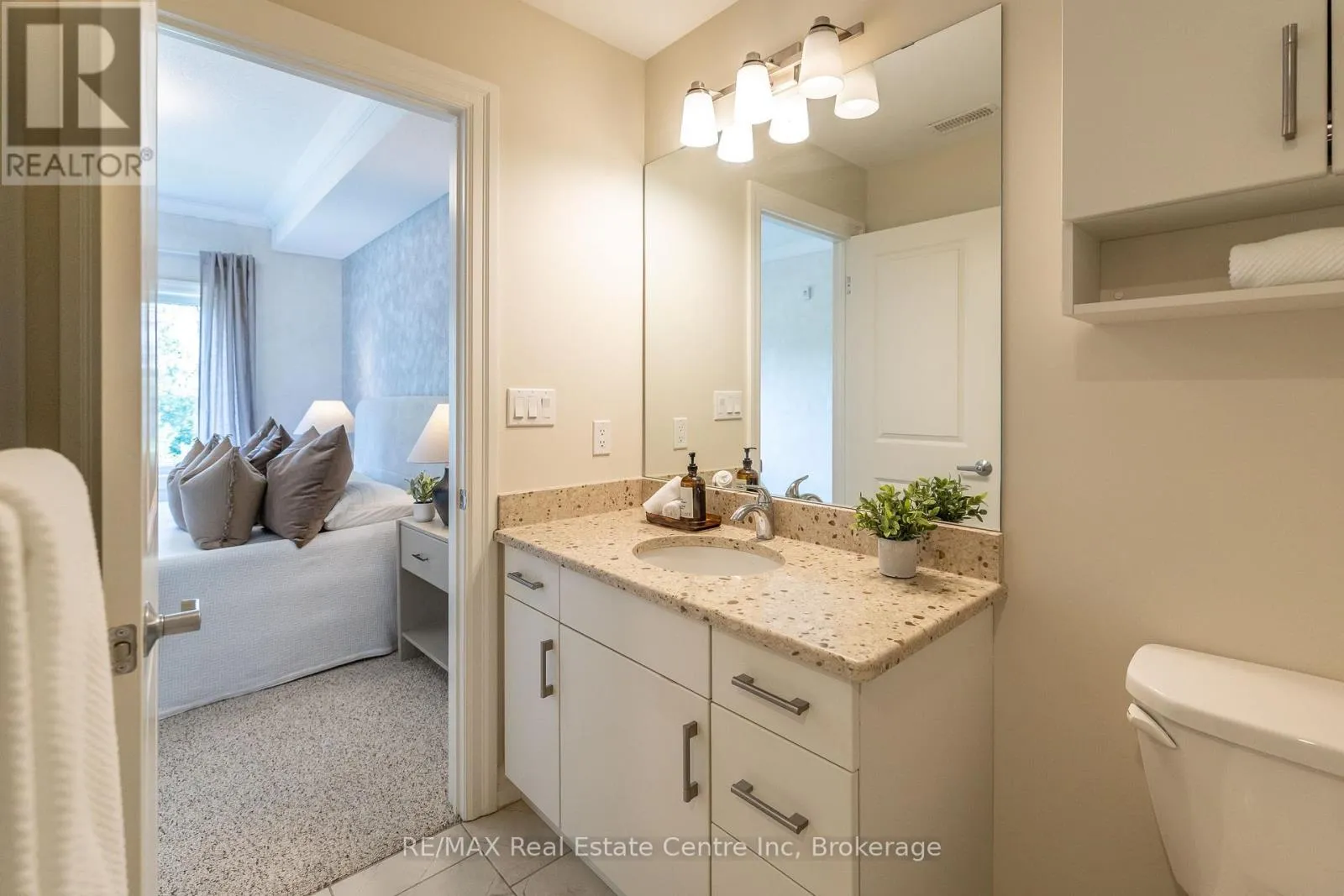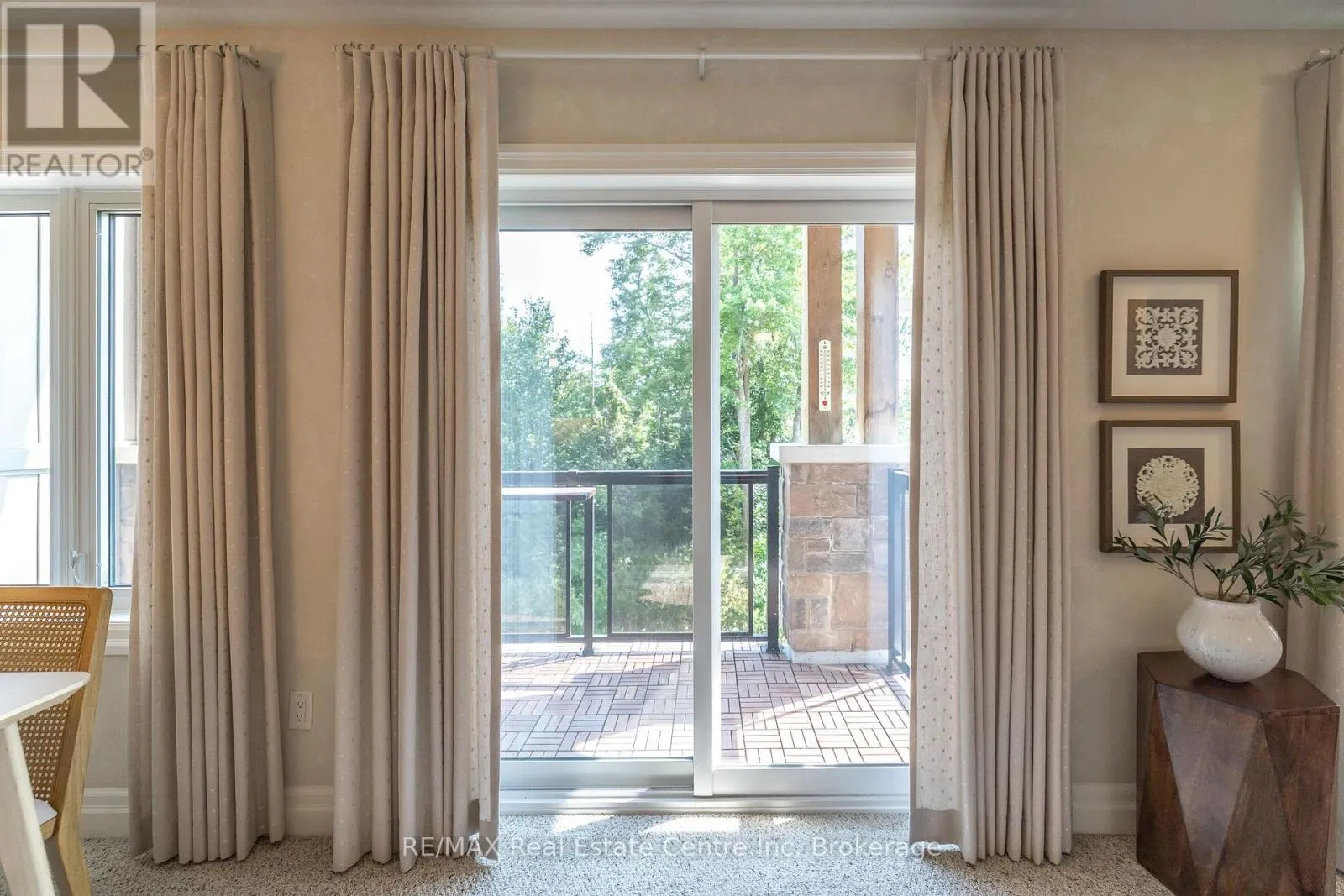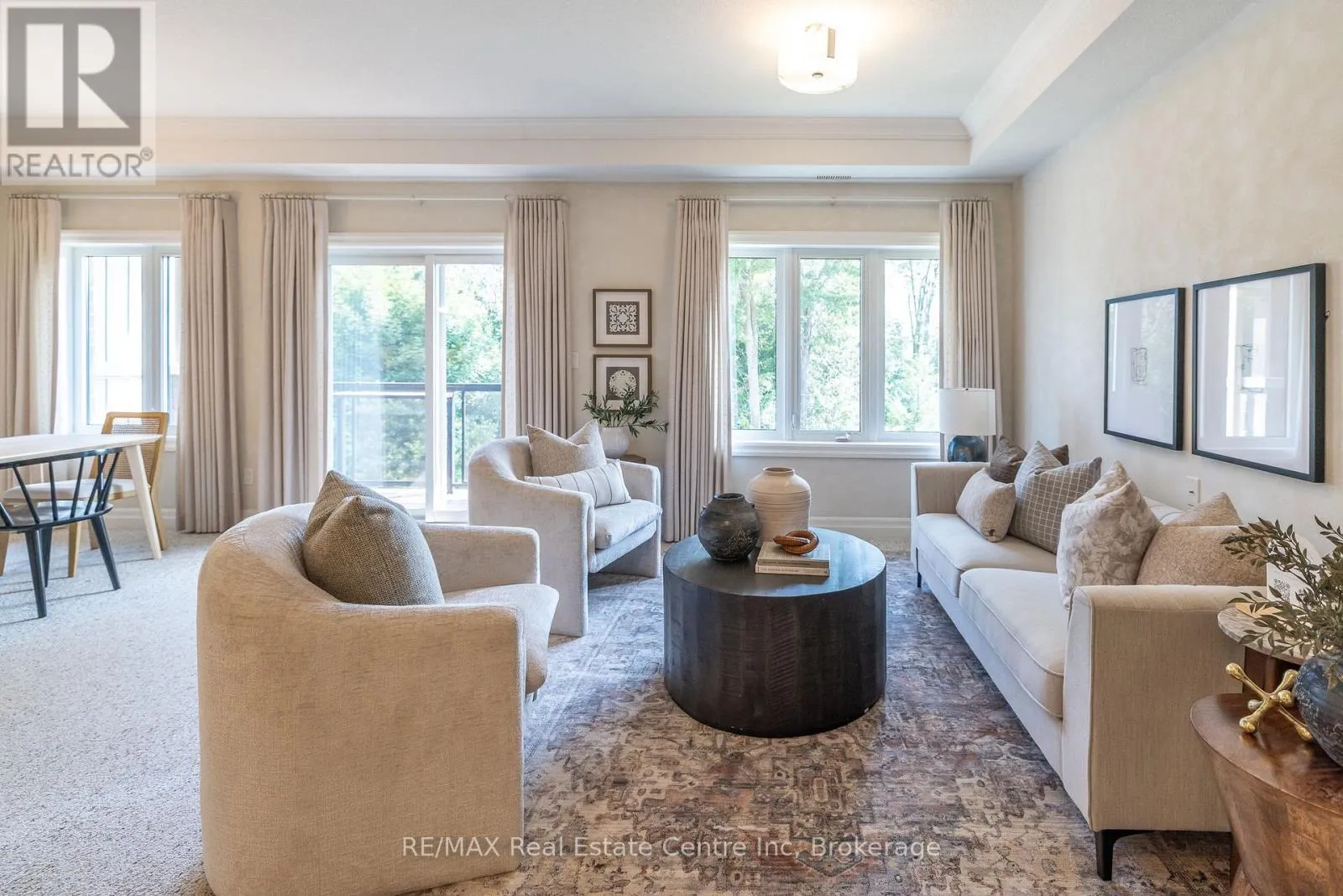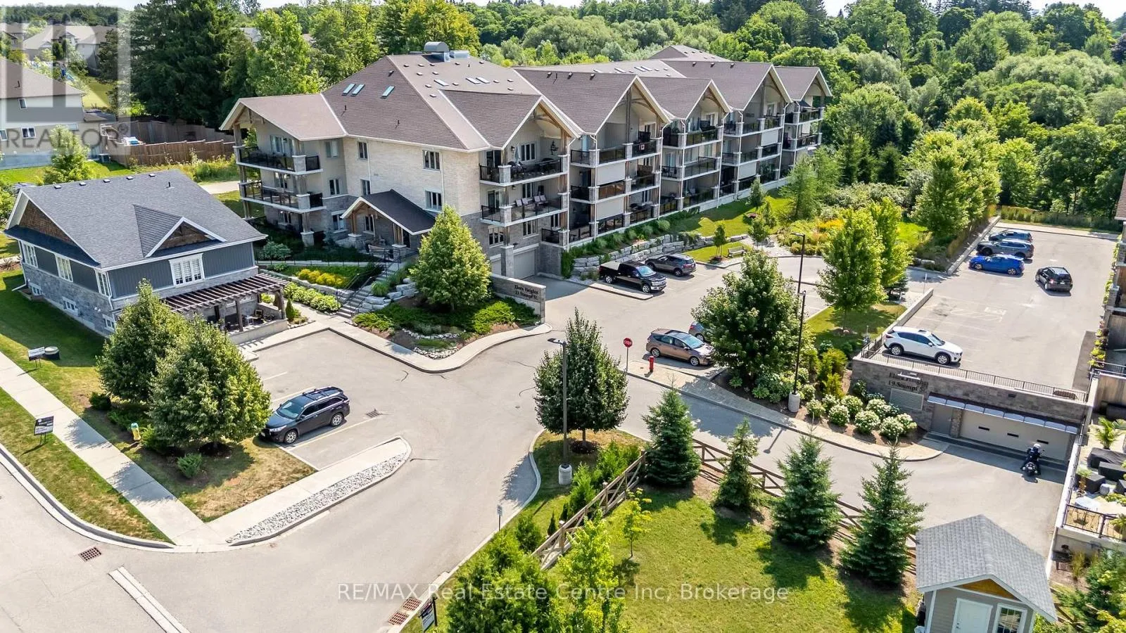 Cross Streets: Geddes Street. ** Directions: Geddes to Stumpf Street. Welcome to Unit 310 at 23 Stumpf Street in Elora-a beautifully maintained two-bedroom, two-bathroom condo set in a peaceful, private location with tranquil views of surrounding greenspace. Situated in one of Elora's most desirable buildings, this residence offers an ideal blend of comfort, lifestyle, and convenience. The thoughtfully designed open-concept layout is perfect for both daily living and hosting. The contemporary kitchen stands out with cork flooring, quartz countertops, stainless steel appliances, and a practical breakfast bar, flowing effortlessly into the dining space and bright living area. From here, sliding doors lead to your own patio, where you can unwind while overlooking the natural setting. The spacious primary bedroom features a private ensuite, while the second bedroom offers flexible use as a guest room, home office, or a combination of both. Additional highlights include in-suite laundry, ample storage, and the added value of an underground parking space and locker. Residents have access to excellent amenities, including a large party room and a fully equipped fitness centre-ideal for entertaining or maintaining an active lifestyle. Just steps from downtown Elora, with nearby trails, parks, and the Grand River across the street, this move-in-ready condo delivers the best of village living surrounded by nature. Whether you're downsizing, investing, or looking for a quiet place to settle into, this property offers exceptional value and lifestyle appeal. (id:27476)
