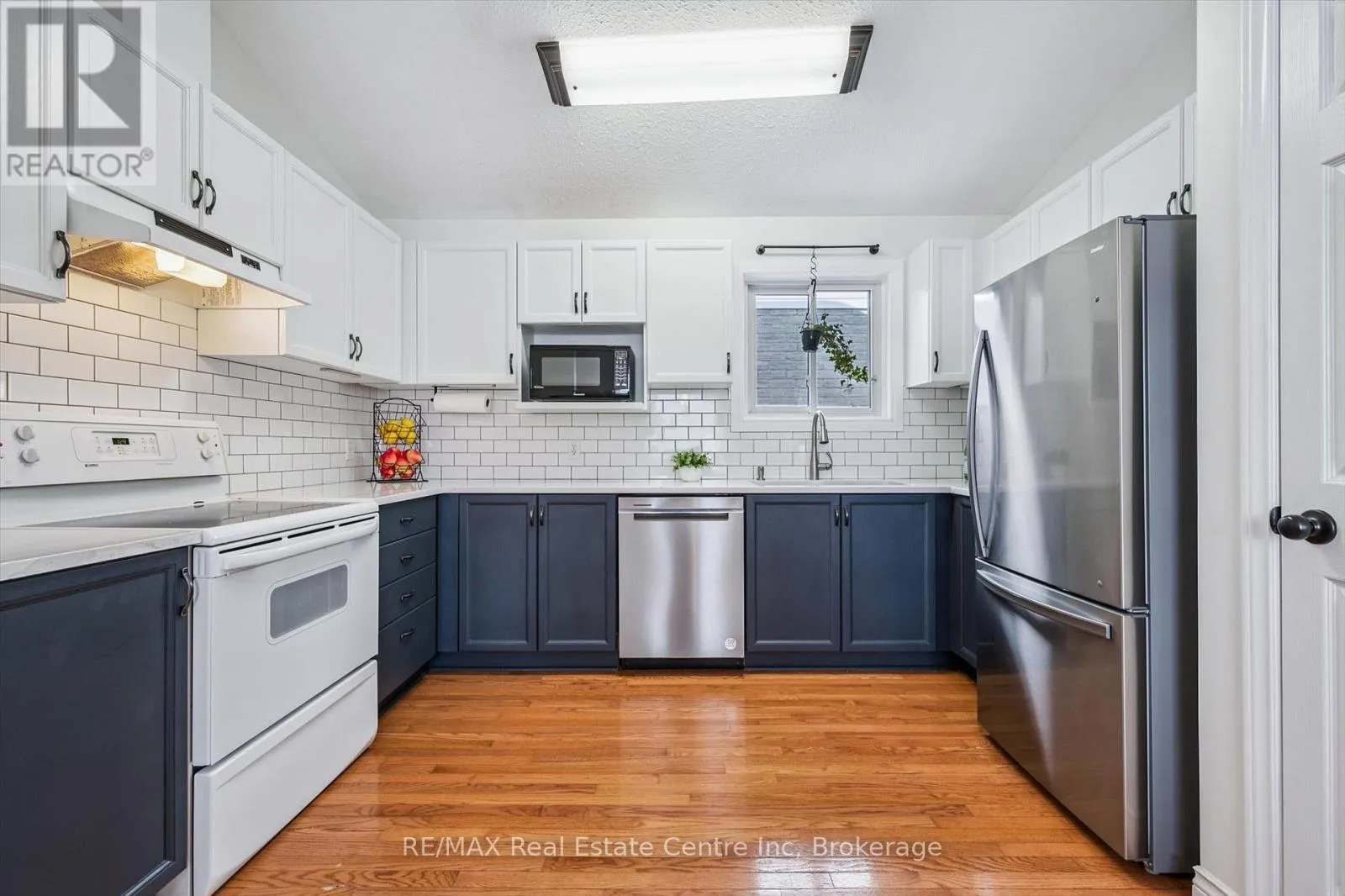 Cross Streets: Belsyde/Scotland. ** Directions: Belsyde to McTavish. Large Backsplit in Fantastic Neighbourhood! You'll be impressed with how big this well maintained home is inside. Over 1600 sqft of generous space complete with 3+1 bedrooms, 2 full renovated baths. The first level offers a large front room ideal for a cozy sitting spot and spacious entryway with lots of storage space. Hardwood floors flow through to the dining room and kitchen with vaulted ceilings. Kitchen updates (2022) include quartz counters, subway tile backsplash, undermount sink, fridge and dishwasher (2025) + features 2 pantry closets. Down a couple of steps to the lower main floor you'll find a huge family room with sliding doors out to your fenced (2021) backyard with concrete patio (2021) and hot tub (2023). An office or 4th bedroom completes this level. Upstairs are 3 right sized bedrooms; the Primary features a large walkin closet. The main full bath has undergone an incredible renovation (2022) with heated floors, extra deep soaker tub, lighted mirror, builtin shelving and stunning tile. Down in the recently finished basement (2021) is a den perfect for kids to play video games, another stunning bathroom (2021) with walkin shower and builtin shelving, plus TONS of storage space! Finishing off this great home is an attached 1 car garage, lovely front deck (2024), paved driveway (2024), integrated gemstone lighting (2023), tasteful landscaping, fresh paint throughout (2021) and new water softener (2023). Situated in South End Fergus close to main roads for commuters, schools and shopping. This is a must see, book your showing today! (id:27476)