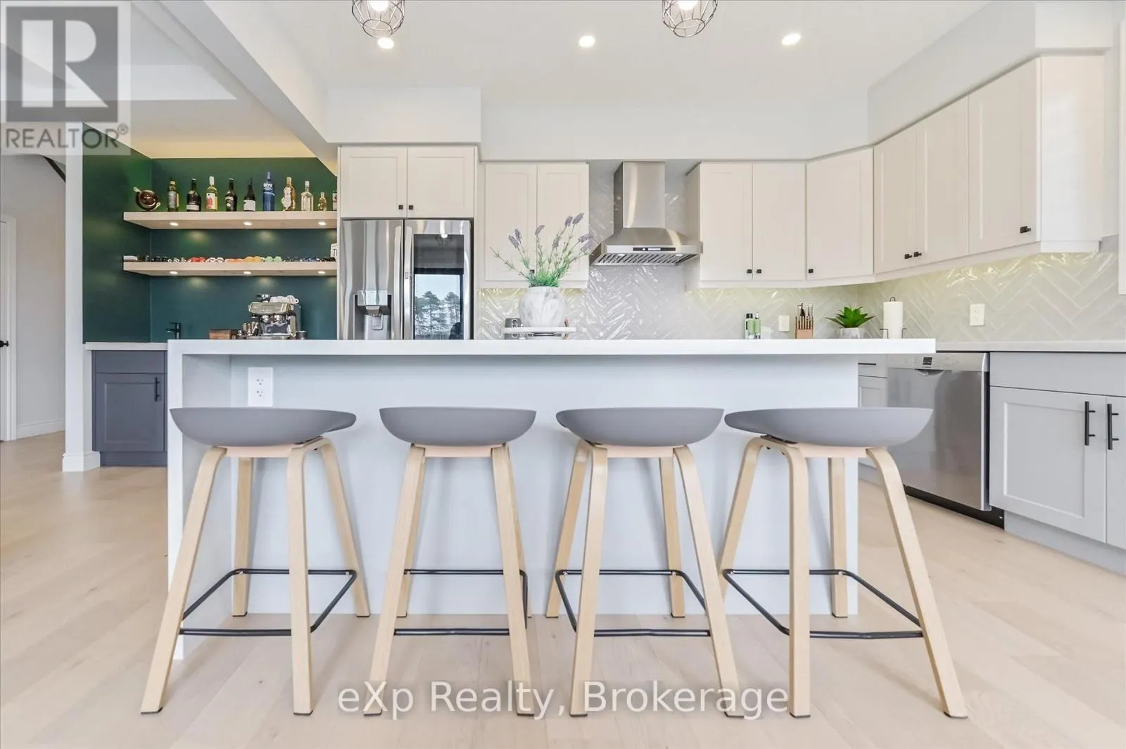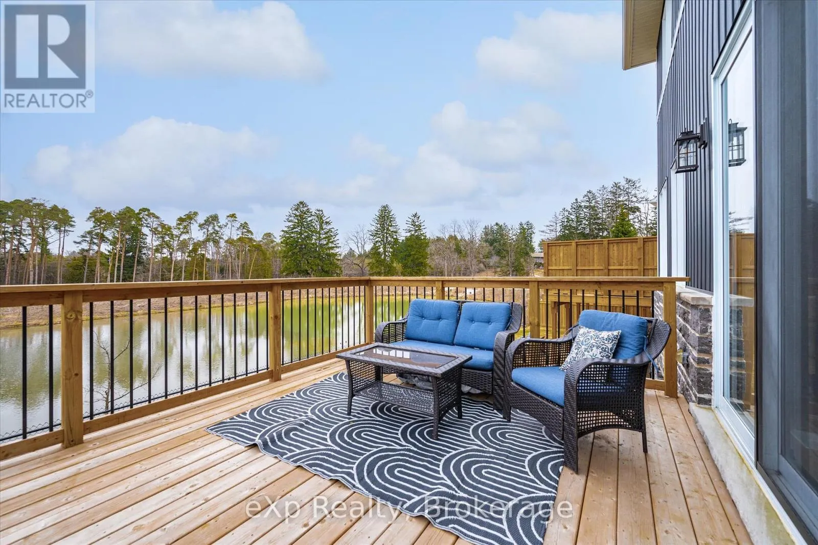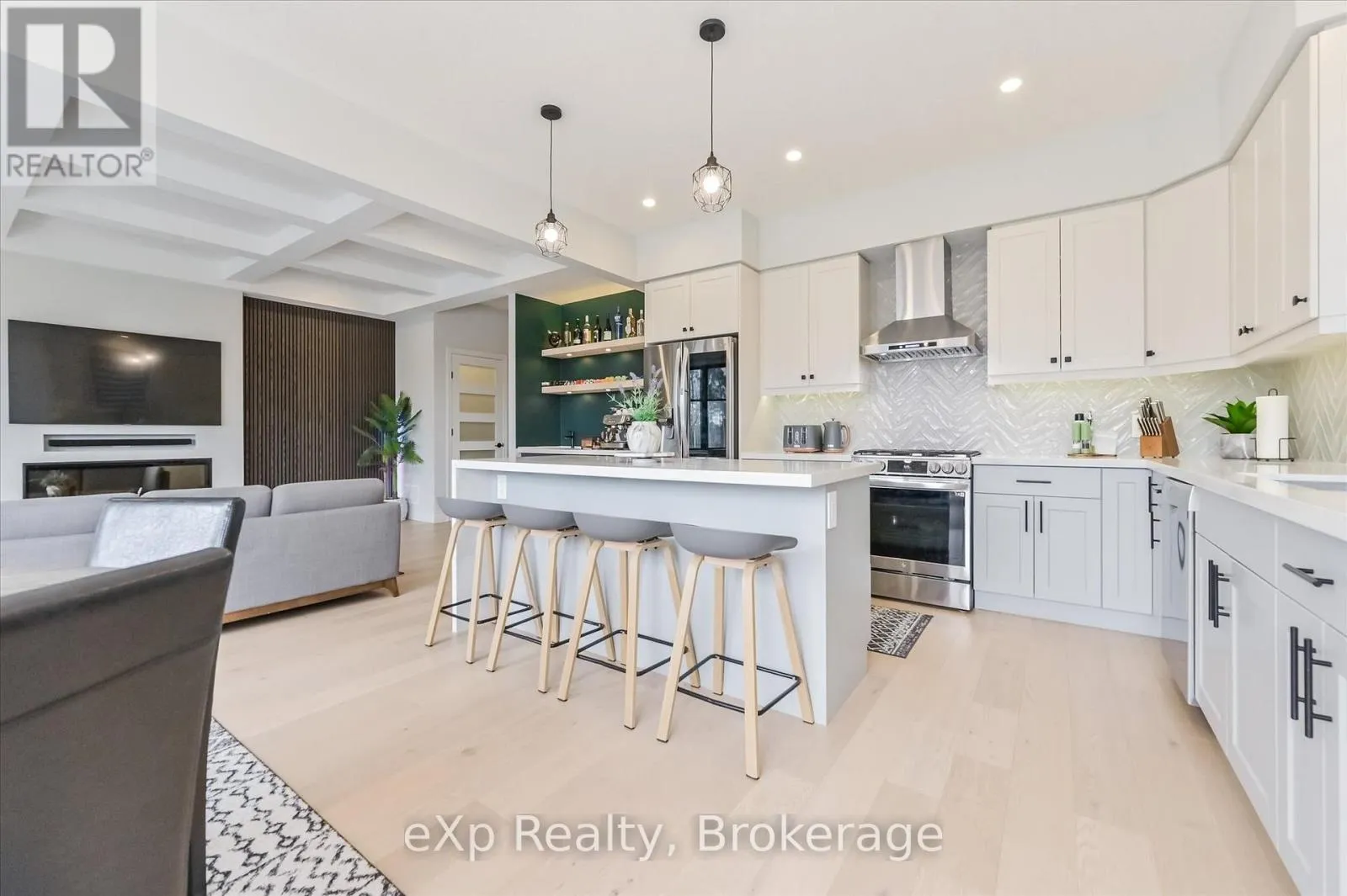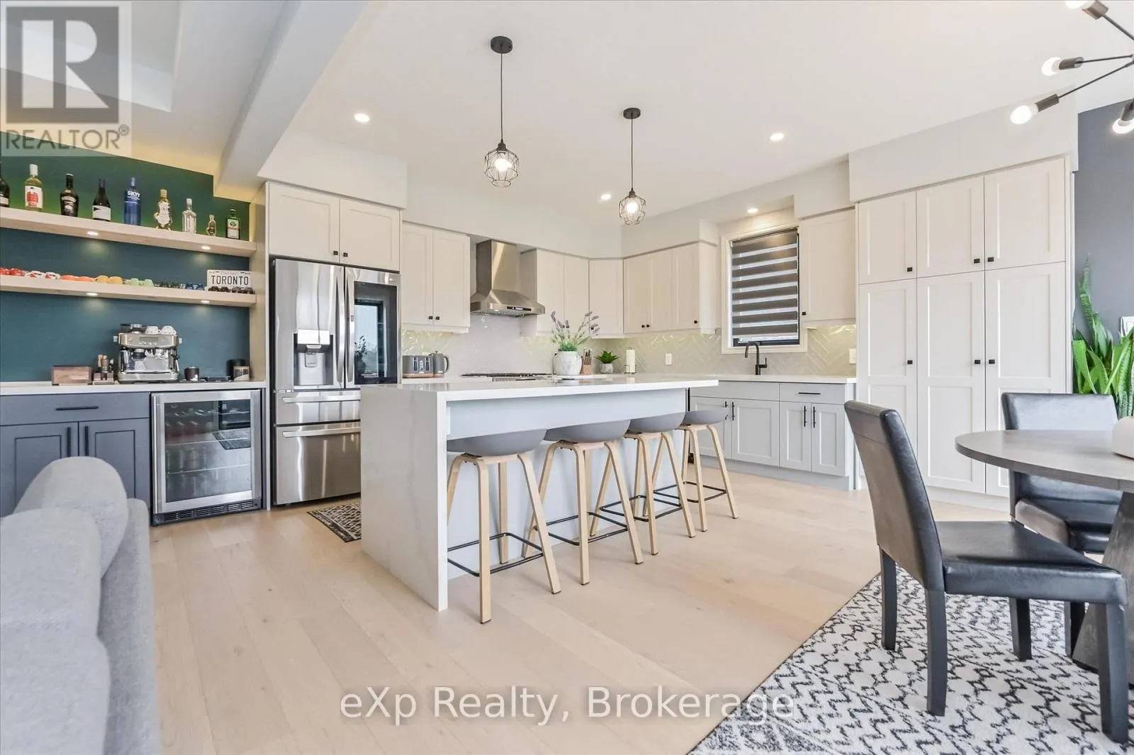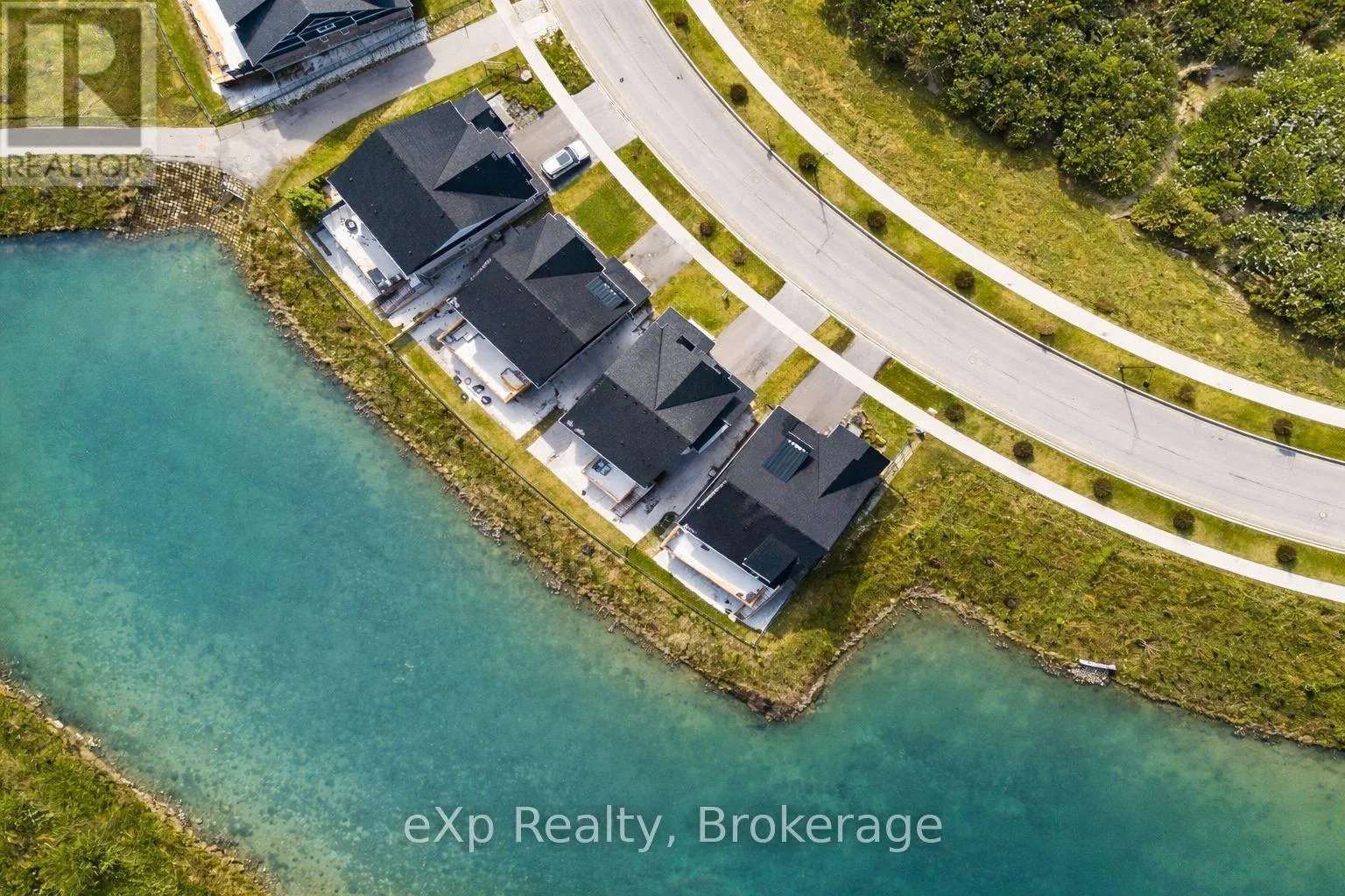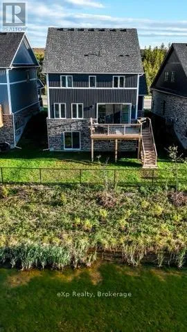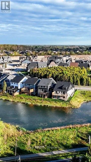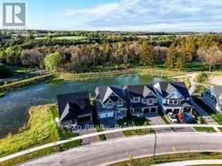 Cross Streets: Water Street. ** Directions: Water St-Haylock. Overlooking a tranquil pond in Elora's highly sought-after South River community, this 2023 Granite Home build offers a seamless blend of modern design and relaxed, nature-inspired living. With 4 bedrooms, 3 full bathrooms and a powder room, this home is thoughtfully laid out for both everyday comfort and stylish entertaining, just a short walk to downtown Elora and nearby trails including the Trestle Bridge Trail.Inside, every detail has been carefully considered. The kitchen stands out with a herringbone backsplash, two-tone cabinetry featuring cream uppers and light grey lowers and island, waterfall quartz countertops, sleek black hardware, a gas stove, and a custom coffee bar. The family room is warm and inviting, highlighted by a gas fireplace, walnut slat feature walls, and coffered ceilings that add depth and character. A striking glass staircase leads to the upper level, where a spa-like bathroom features a waterfall shower with niche and glass surround. White oak flooring and black window frames carry a clean, modern feel throughout.The finished walkout basement is bright and functional, offering additional living space with direct access to the backyard and peaceful water views. Complete with a double car garage and refined finishes throughout, this home presents a beautifully finished opportunity in one of Elora's most desirable neighbourhoods. Quick closing available. (id:27476)