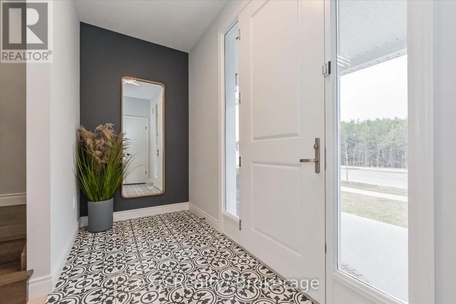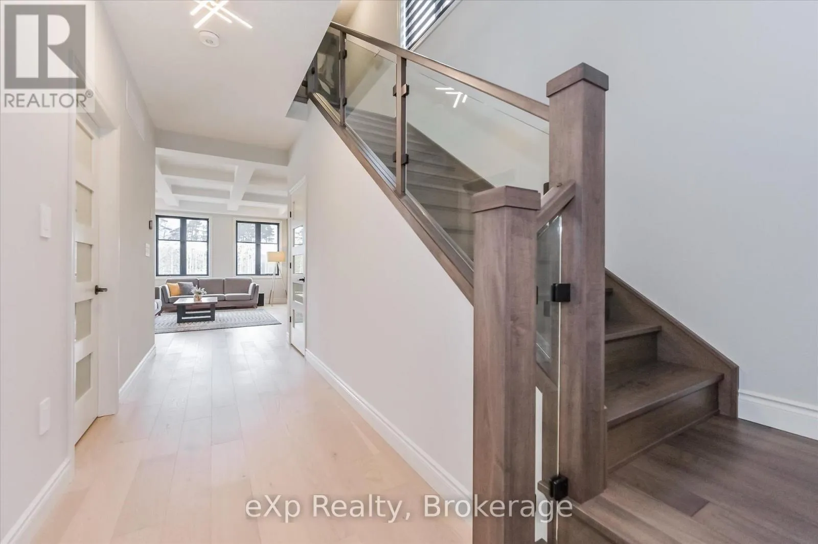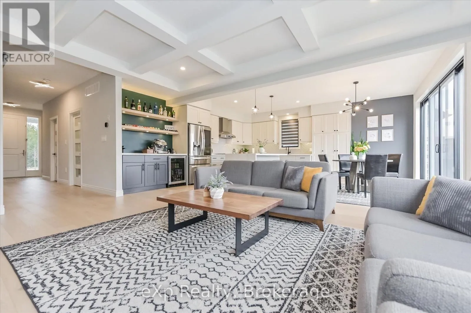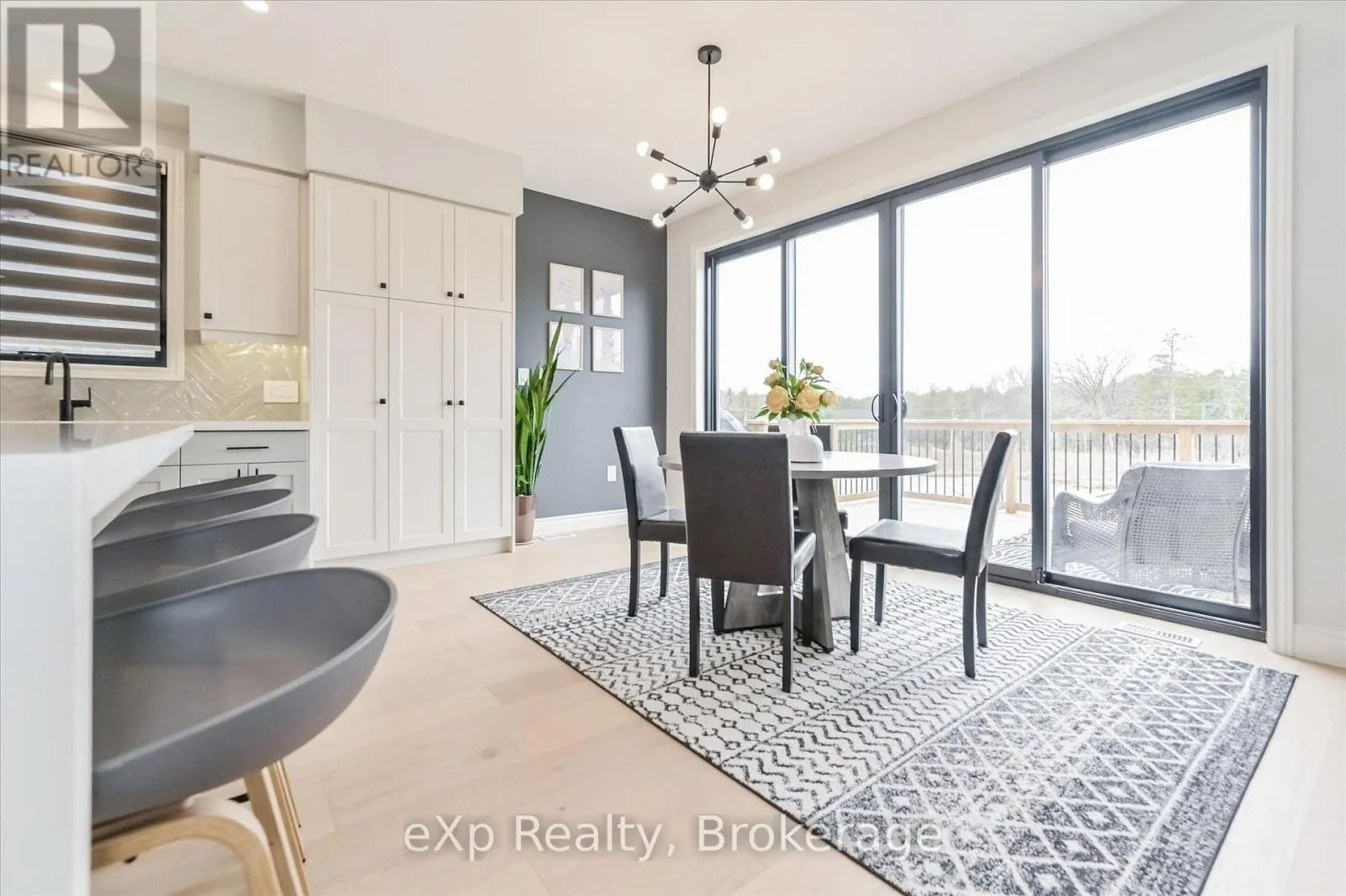 Cross Streets: Water Street. ** Directions: Water St-Haylock. Overlooking a tranquil pond in Elora's highly sought-after South River community, this 2023 Granite Home build offers a seamless blend of modern design and relaxed, nature-inspired living. With 4 bedrooms, 3 full bathrooms and a powder room, this home is thoughtfully laid out for both everyday comfort and stylish entertaining, just a short walk to downtown Elora and nearby trails including the Trestle Bridge Trail.Inside, every detail has been carefully considered. The kitchen stands out with a herringbone backsplash, two-tone cabinetry featuring cream uppers and light grey lowers and island, waterfall quartz countertops, sleek black hardware, a gas stove, and a custom coffee bar. The family room is warm and inviting, highlighted by a gas fireplace, walnut slat feature walls, and coffered ceilings that add depth and character. A striking glass staircase leads to the upper level, where a spa-like bathroom features a waterfall shower with niche and glass surround. White oak flooring and black window frames carry a clean, modern feel throughout.The finished walkout basement is bright and functional, offering additional living space with direct access to the backyard and peaceful water views. Complete with a double car garage and refined finishes throughout, this home presents a beautifully finished opportunity in one of Elora's most desirable neighbourhoods. Quick closing available. (id:27476)