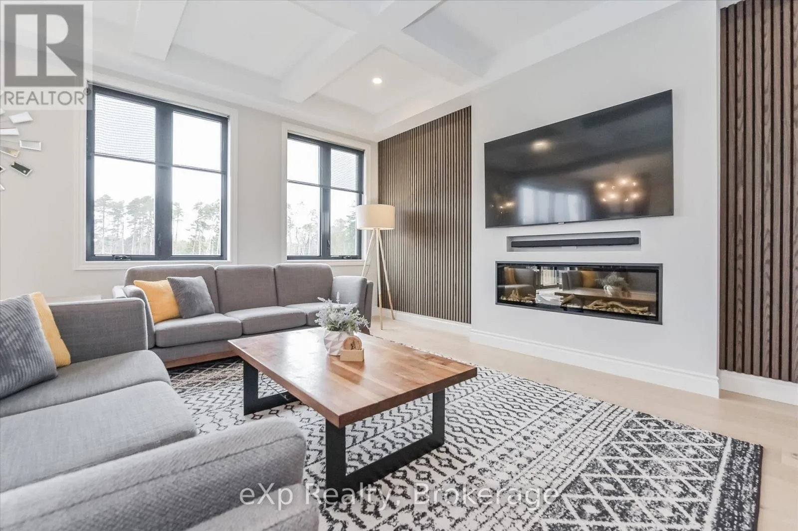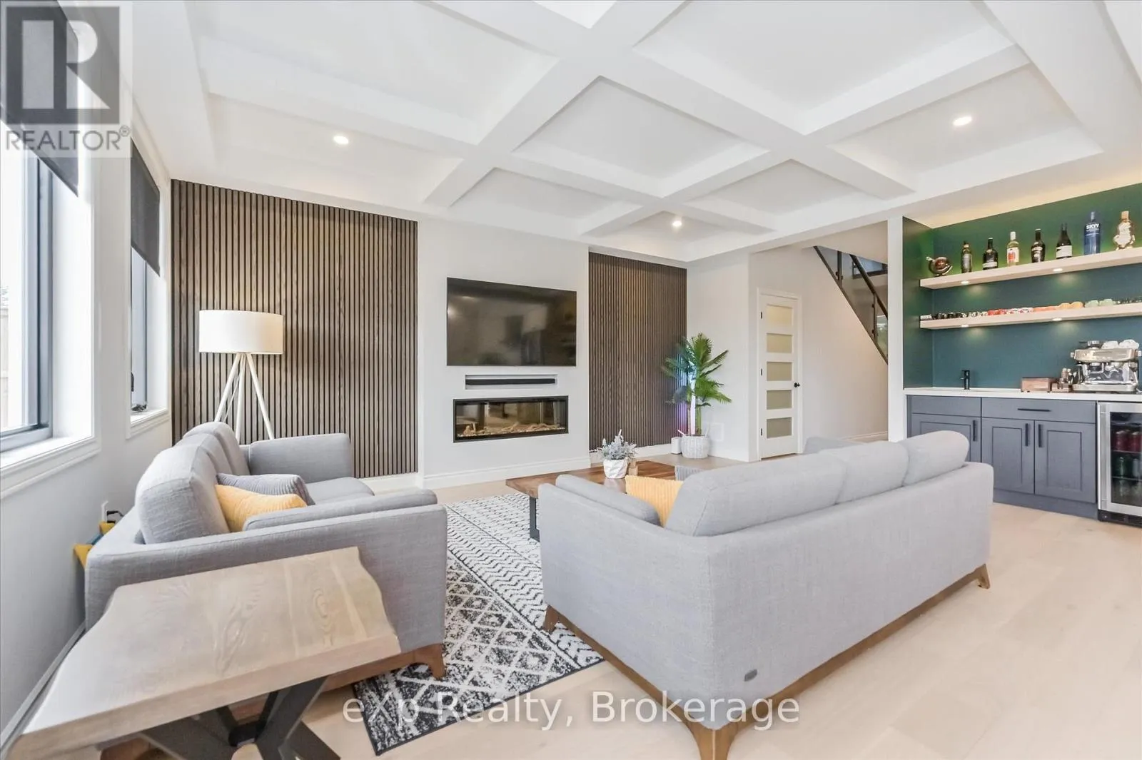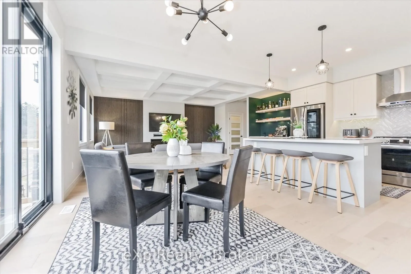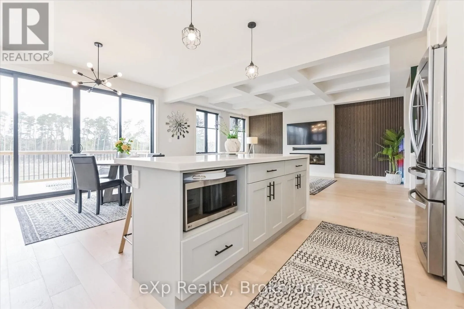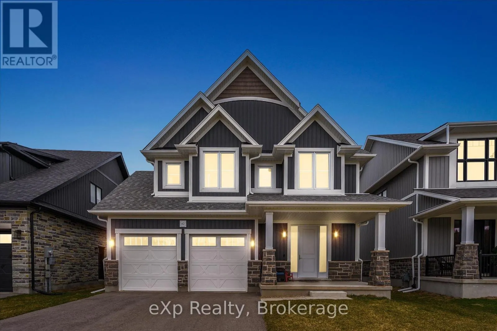 Cross Streets: Water Street. ** Directions: Water St-Haylock. Overlooking a tranquil pond in Elora's highly sought-after South River community, this 2023 Granite Home build offers a seamless blend of modern design and relaxed, nature-inspired living. With 4 bedrooms, 3 full bathrooms and a powder room, this home is thoughtfully laid out for both everyday comfort and stylish entertaining, just a short walk to downtown Elora and nearby trails including the Trestle Bridge Trail.Inside, every detail has been carefully considered. The kitchen stands out with a herringbone backsplash, two-tone cabinetry featuring cream uppers and light grey lowers and island, waterfall quartz countertops, sleek black hardware, a gas stove, and a custom coffee bar. The family room is warm and inviting, highlighted by a gas fireplace, walnut slat feature walls, and coffered ceilings that add depth and character. A striking glass staircase leads to the upper level, where a spa-like bathroom features a waterfall shower with niche and glass surround. White oak flooring and black window frames carry a clean, modern feel throughout.The finished walkout basement is bright and functional, offering additional living space with direct access to the backyard and peaceful water views. Complete with a double car garage and refined finishes throughout, this home presents a beautifully finished opportunity in one of Elora's most desirable neighbourhoods. Quick closing available. (id:27476)