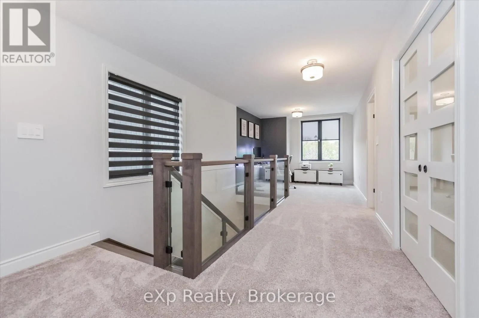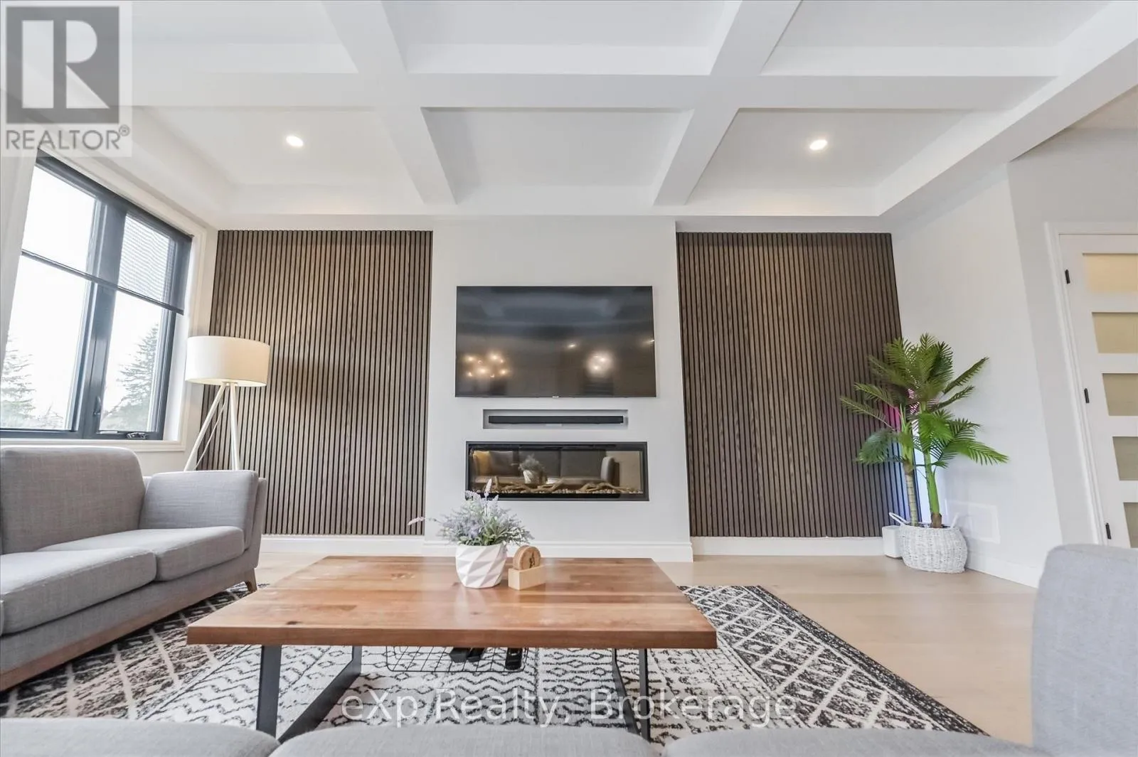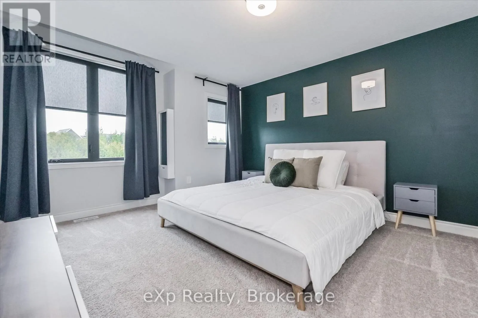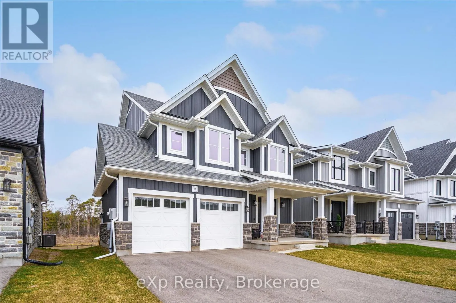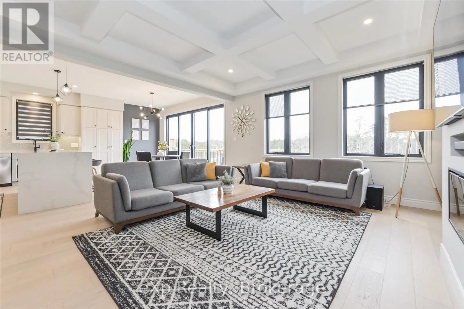 Cross Streets: Water Street. ** Directions: Water St-Haylock. Overlooking a tranquil pond in Elora's highly sought-after South River community, this 2023 Granite Home build offers a seamless blend of modern design and relaxed, nature-inspired living. With 4 bedrooms, 3 full bathrooms and a powder room, this home is thoughtfully laid out for both everyday comfort and stylish entertaining, just a short walk to downtown Elora and nearby trails including the Trestle Bridge Trail.Inside, every detail has been carefully considered. The kitchen stands out with a herringbone backsplash, two-tone cabinetry featuring cream uppers and light grey lowers and island, waterfall quartz countertops, sleek black hardware, a gas stove, and a custom coffee bar. The family room is warm and inviting, highlighted by a gas fireplace, walnut slat feature walls, and coffered ceilings that add depth and character. A striking glass staircase leads to the upper level, where a spa-like bathroom features a waterfall shower with niche and glass surround. White oak flooring and black window frames carry a clean, modern feel throughout.The finished walkout basement is bright and functional, offering additional living space with direct access to the backyard and peaceful water views. Complete with a double car garage and refined finishes throughout, this home presents a beautifully finished opportunity in one of Elora's most desirable neighbourhoods. Quick closing available. (id:27476)