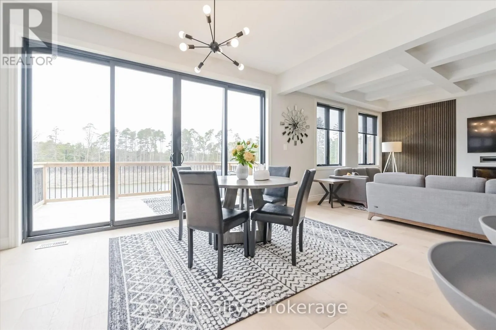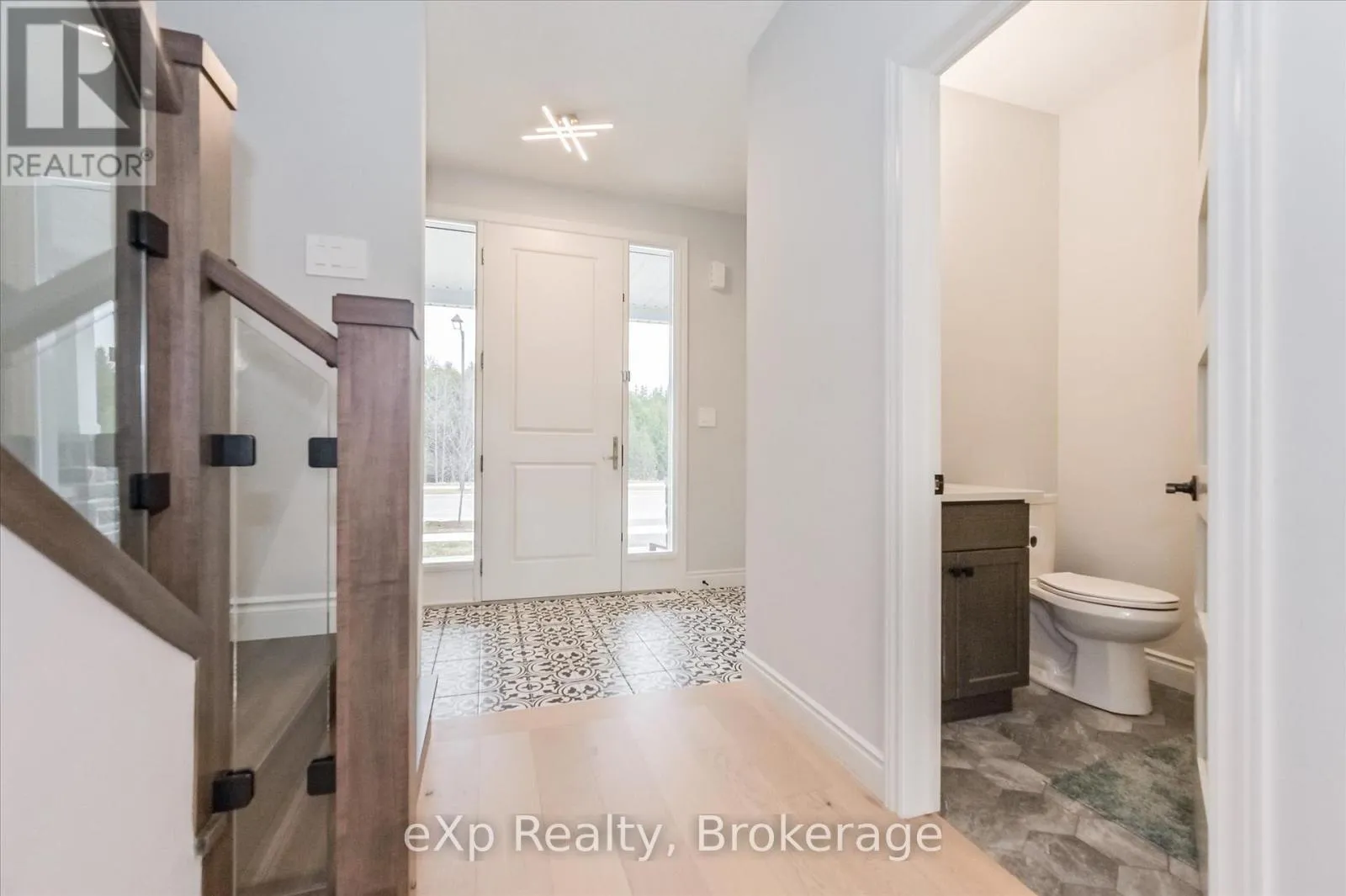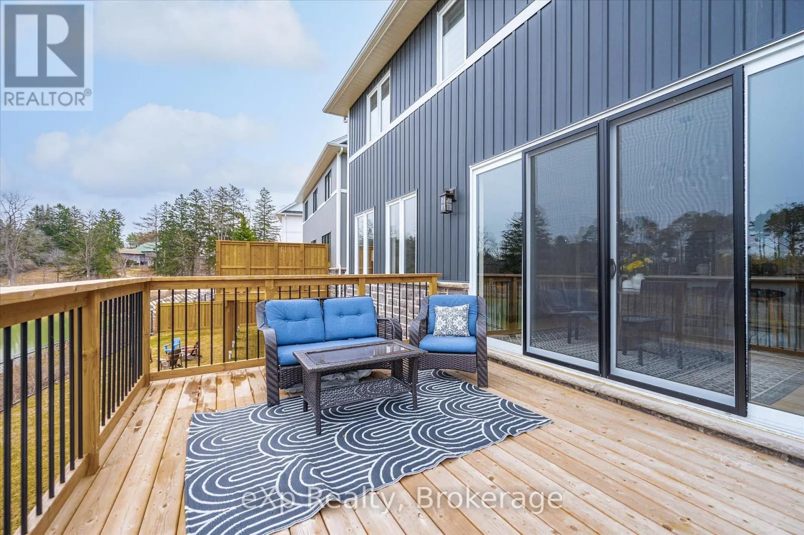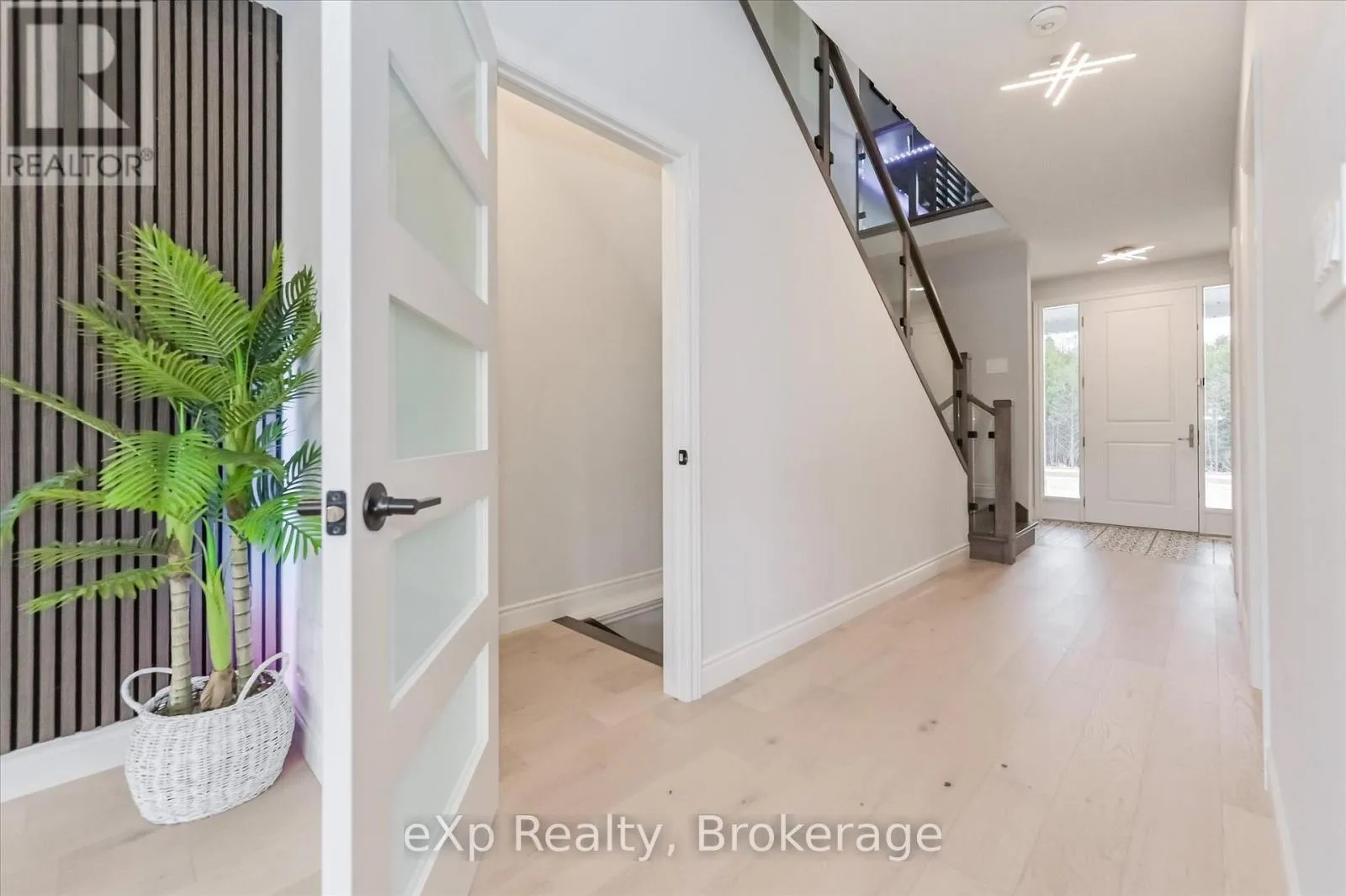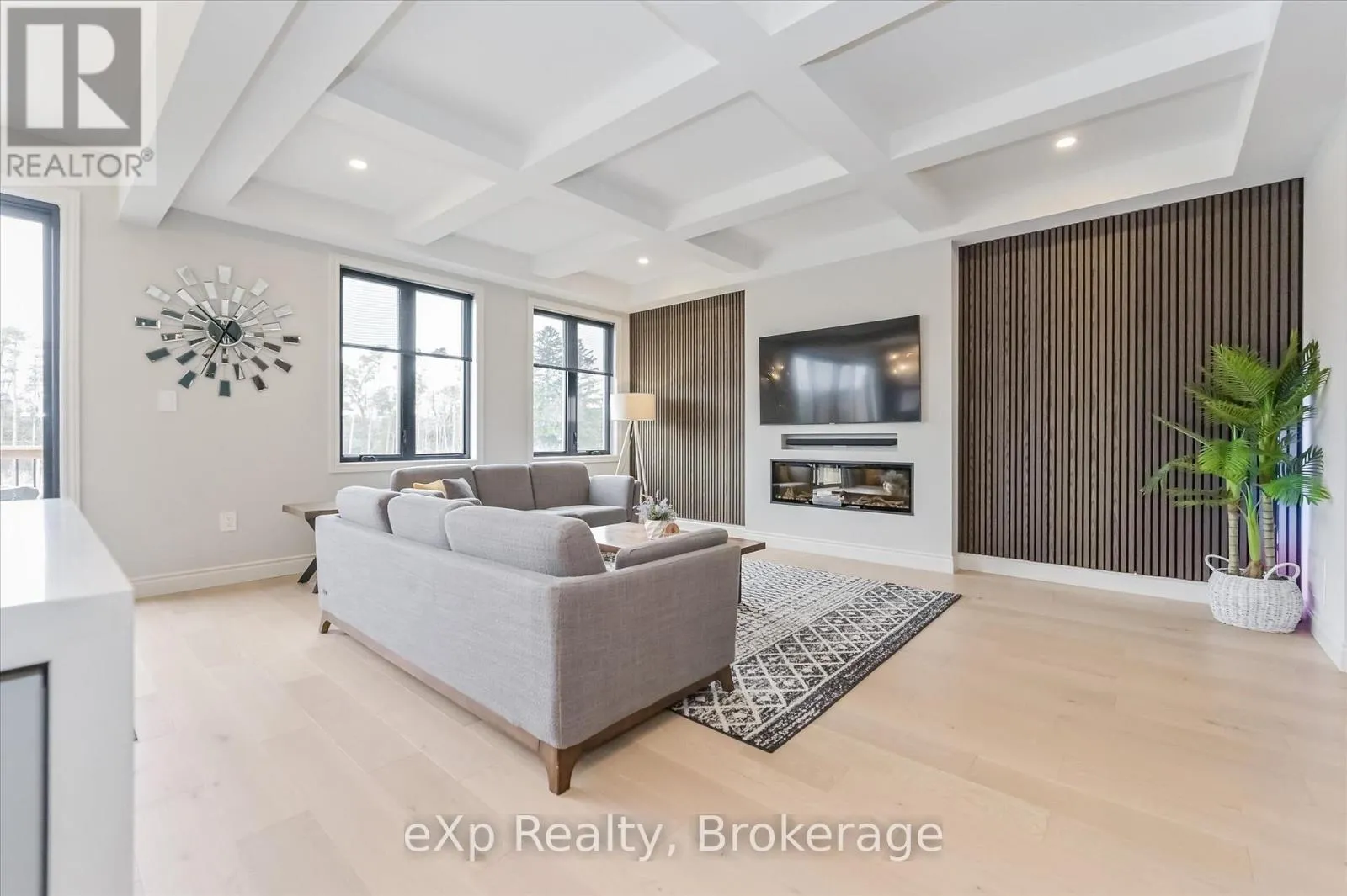 Cross Streets: Water Street. ** Directions: Water St-Haylock. Overlooking a tranquil pond in Elora's highly sought-after South River community, this 2023 Granite Home build offers a seamless blend of modern design and relaxed, nature-inspired living. With 4 bedrooms, 3 full bathrooms and a powder room, this home is thoughtfully laid out for both everyday comfort and stylish entertaining, just a short walk to downtown Elora and nearby trails including the Trestle Bridge Trail.Inside, every detail has been carefully considered. The kitchen stands out with a herringbone backsplash, two-tone cabinetry featuring cream uppers and light grey lowers and island, waterfall quartz countertops, sleek black hardware, a gas stove, and a custom coffee bar. The family room is warm and inviting, highlighted by a gas fireplace, walnut slat feature walls, and coffered ceilings that add depth and character. A striking glass staircase leads to the upper level, where a spa-like bathroom features a waterfall shower with niche and glass surround. White oak flooring and black window frames carry a clean, modern feel throughout.The finished walkout basement is bright and functional, offering additional living space with direct access to the backyard and peaceful water views. Complete with a double car garage and refined finishes throughout, this home presents a beautifully finished opportunity in one of Elora's most desirable neighbourhoods. Quick closing available. (id:27476)