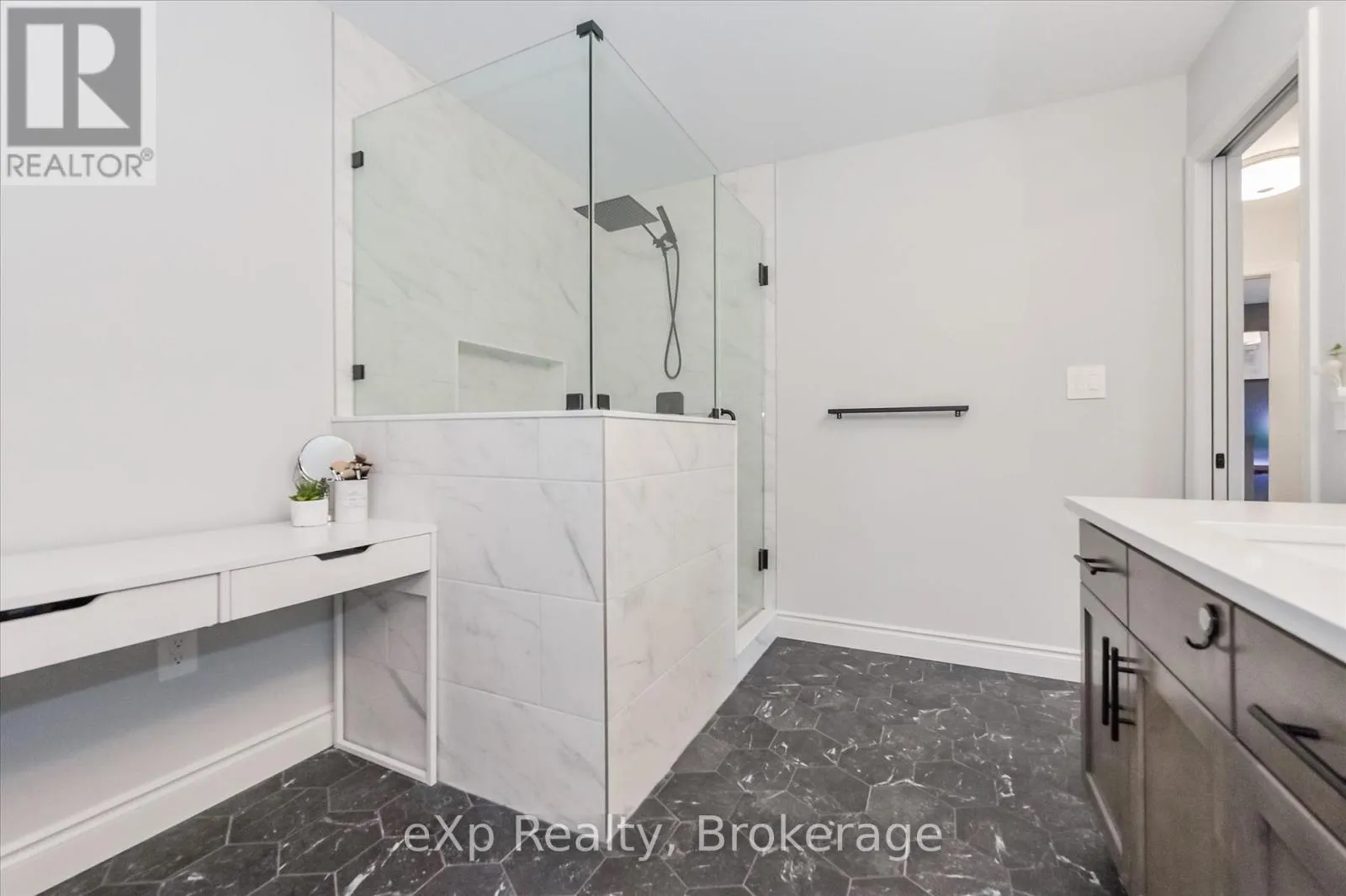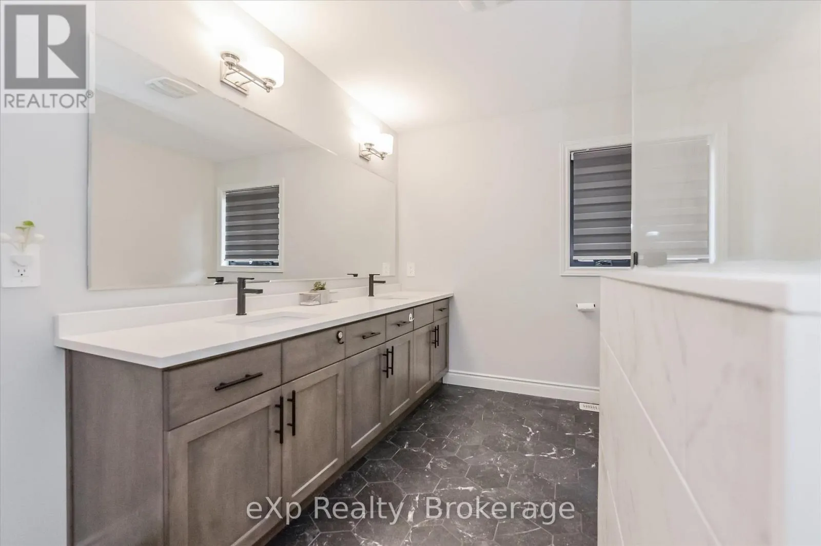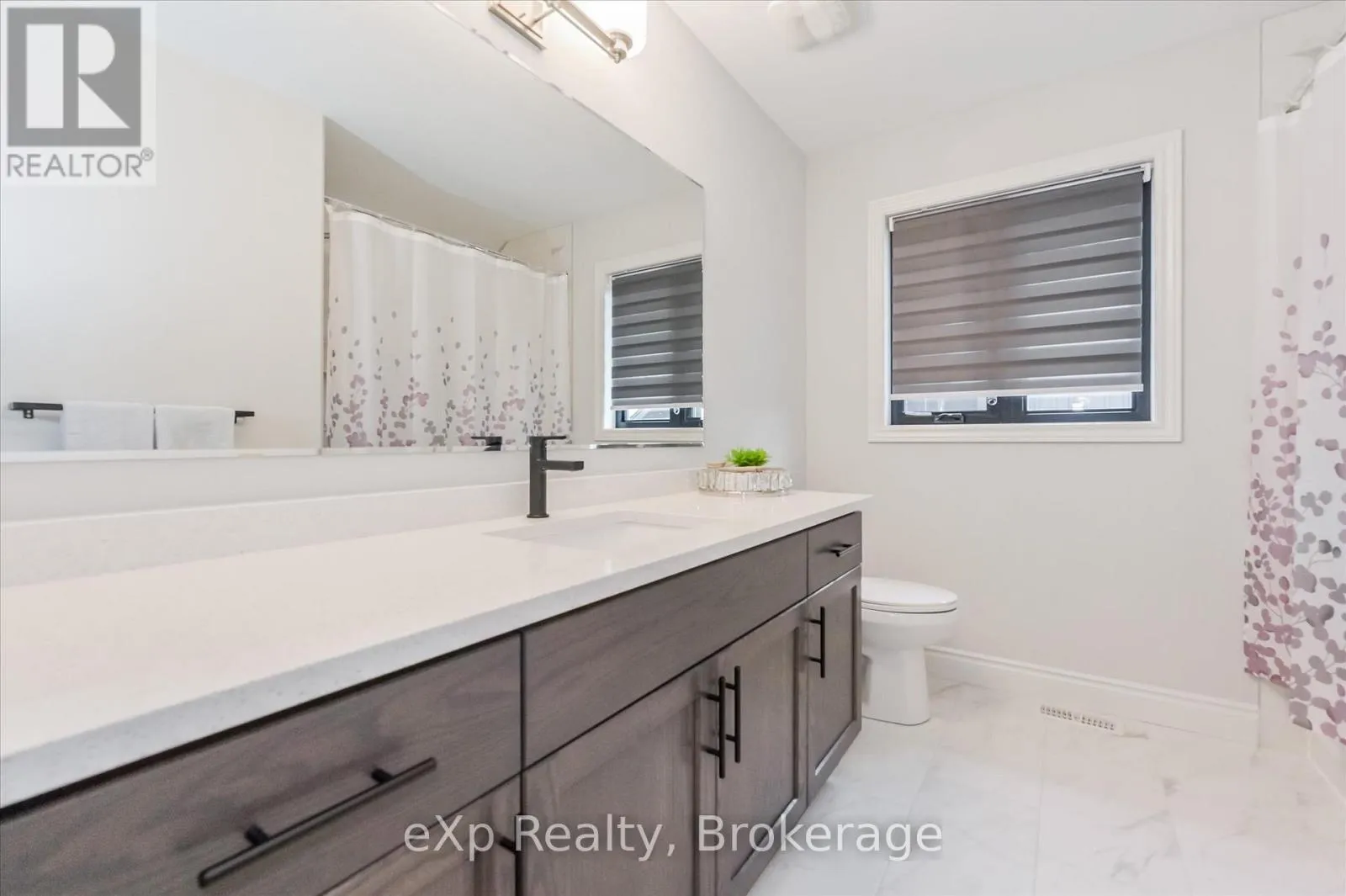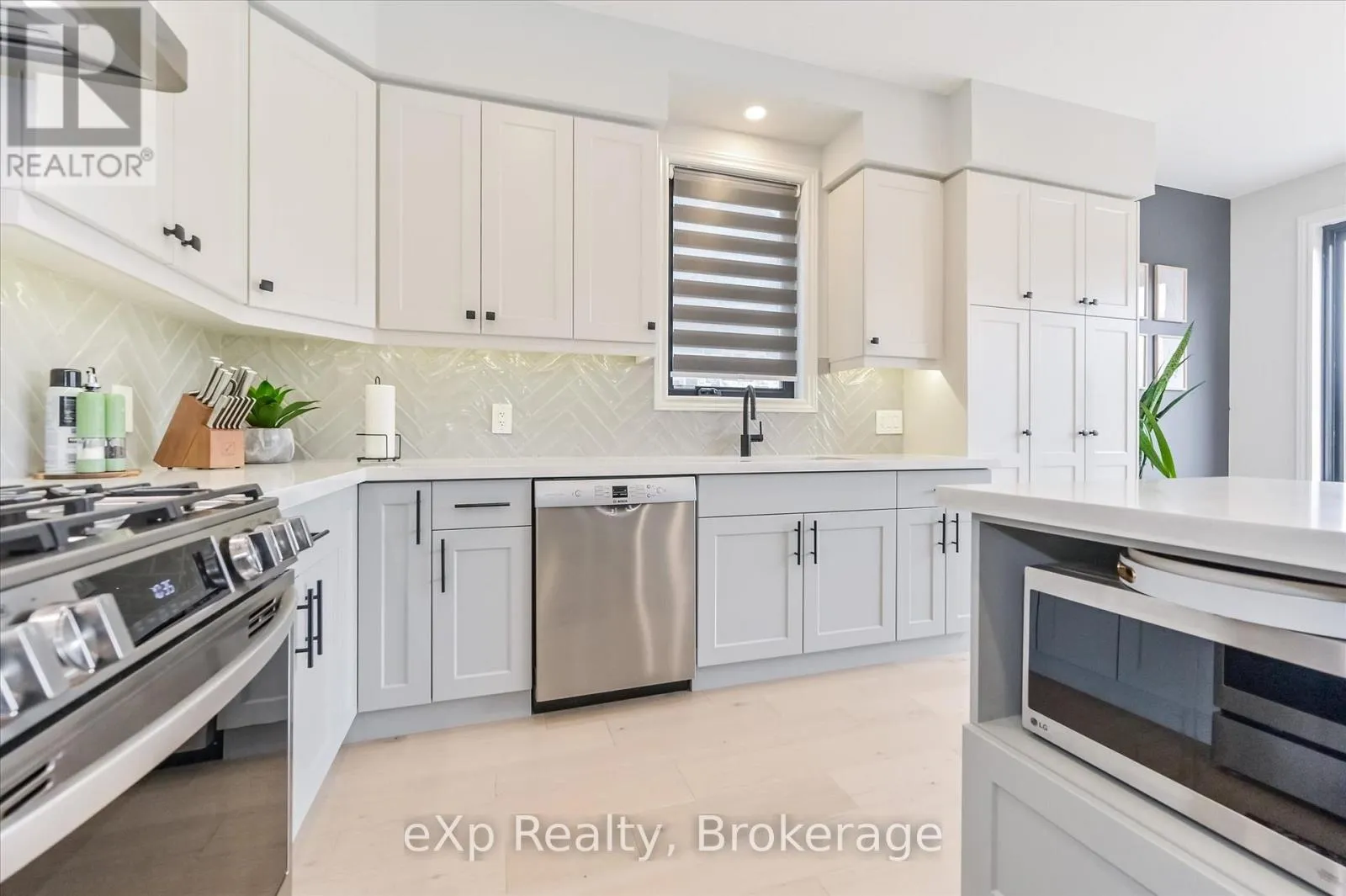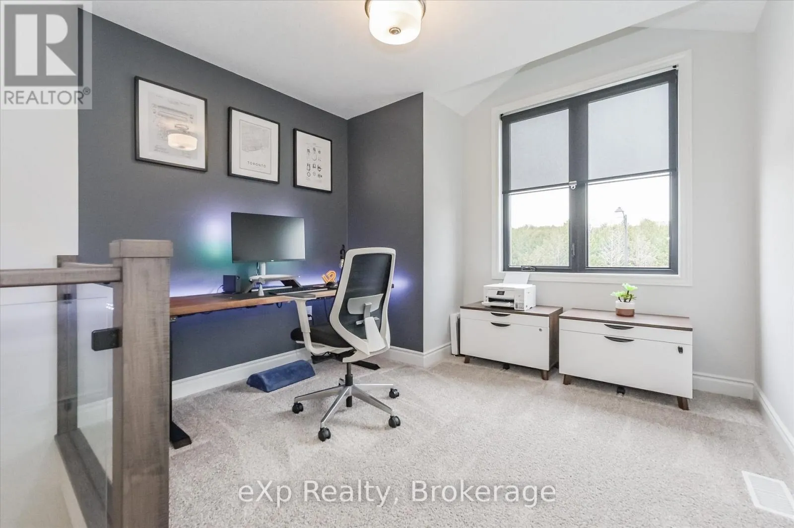 Cross Streets: Water Street. ** Directions: Water St-Haylock. Overlooking a tranquil pond in Elora's highly sought-after South River community, this 2023 Granite Home build offers a seamless blend of modern design and relaxed, nature-inspired living. With 4 bedrooms, 3 full bathrooms and a powder room, this home is thoughtfully laid out for both everyday comfort and stylish entertaining, just a short walk to downtown Elora and nearby trails including the Trestle Bridge Trail.Inside, every detail has been carefully considered. The kitchen stands out with a herringbone backsplash, two-tone cabinetry featuring cream uppers and light grey lowers and island, waterfall quartz countertops, sleek black hardware, a gas stove, and a custom coffee bar. The family room is warm and inviting, highlighted by a gas fireplace, walnut slat feature walls, and coffered ceilings that add depth and character. A striking glass staircase leads to the upper level, where a spa-like bathroom features a waterfall shower with niche and glass surround. White oak flooring and black window frames carry a clean, modern feel throughout.The finished walkout basement is bright and functional, offering additional living space with direct access to the backyard and peaceful water views. Complete with a double car garage and refined finishes throughout, this home presents a beautifully finished opportunity in one of Elora's most desirable neighbourhoods. Quick closing available. (id:27476)