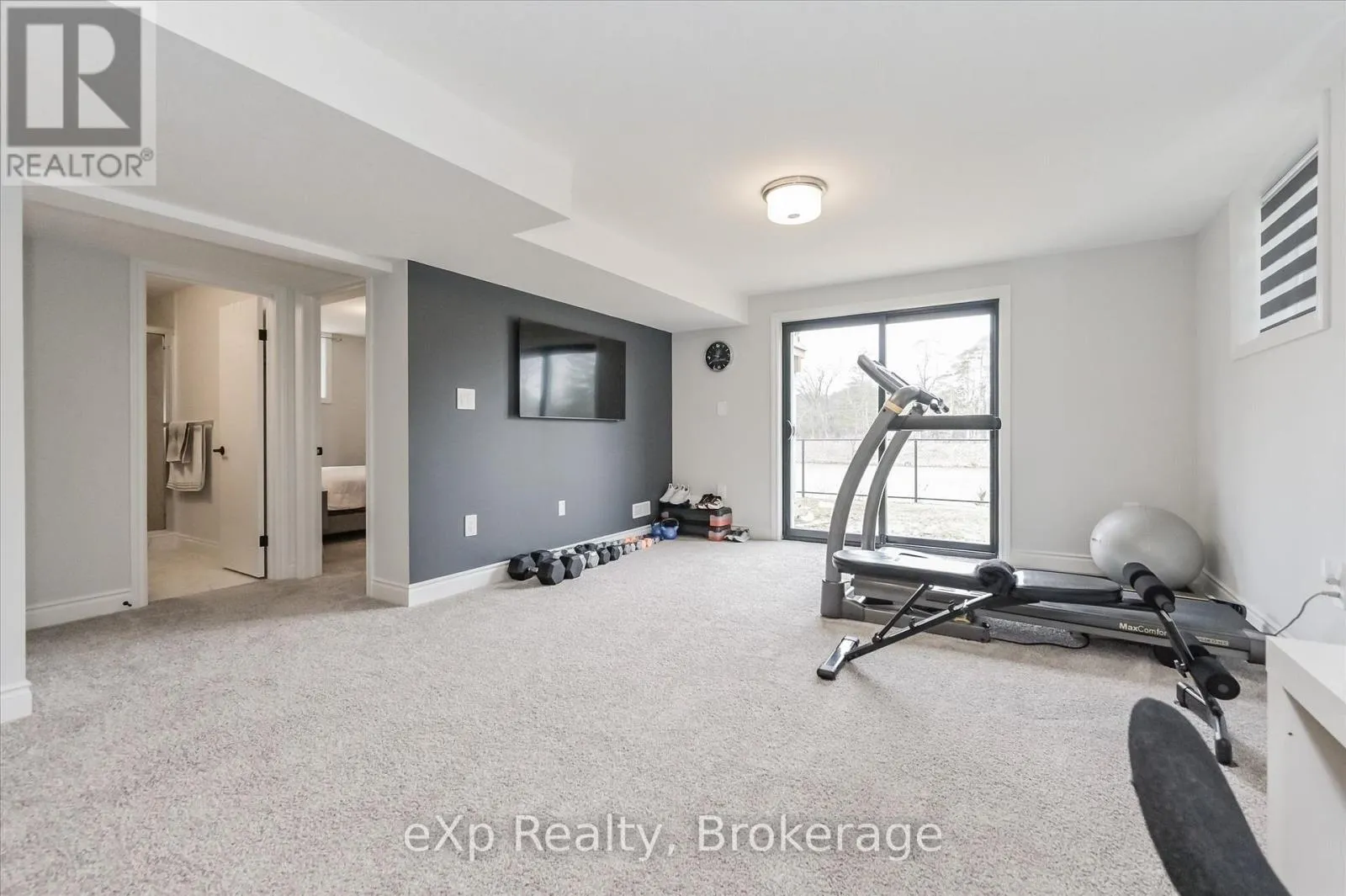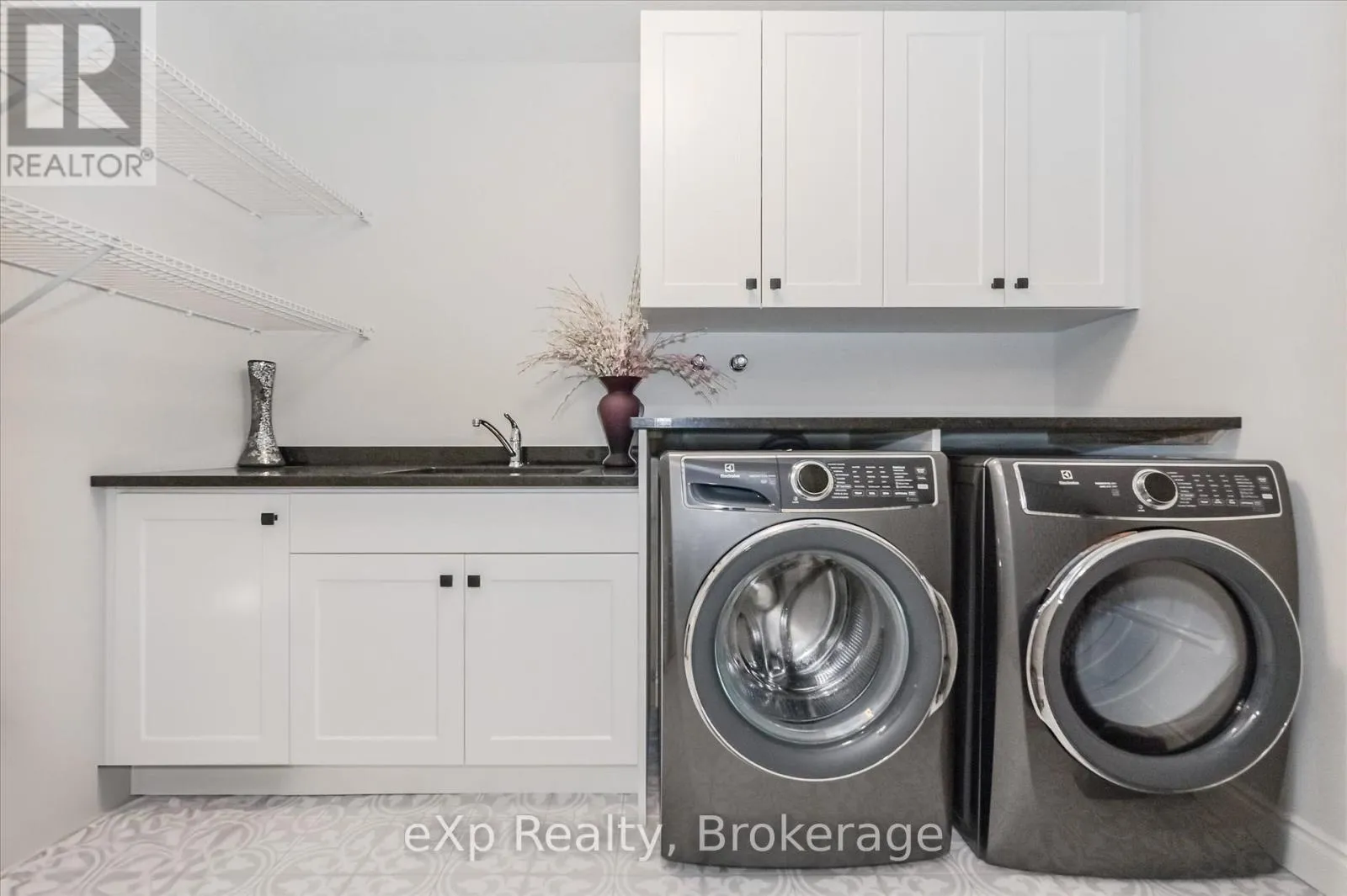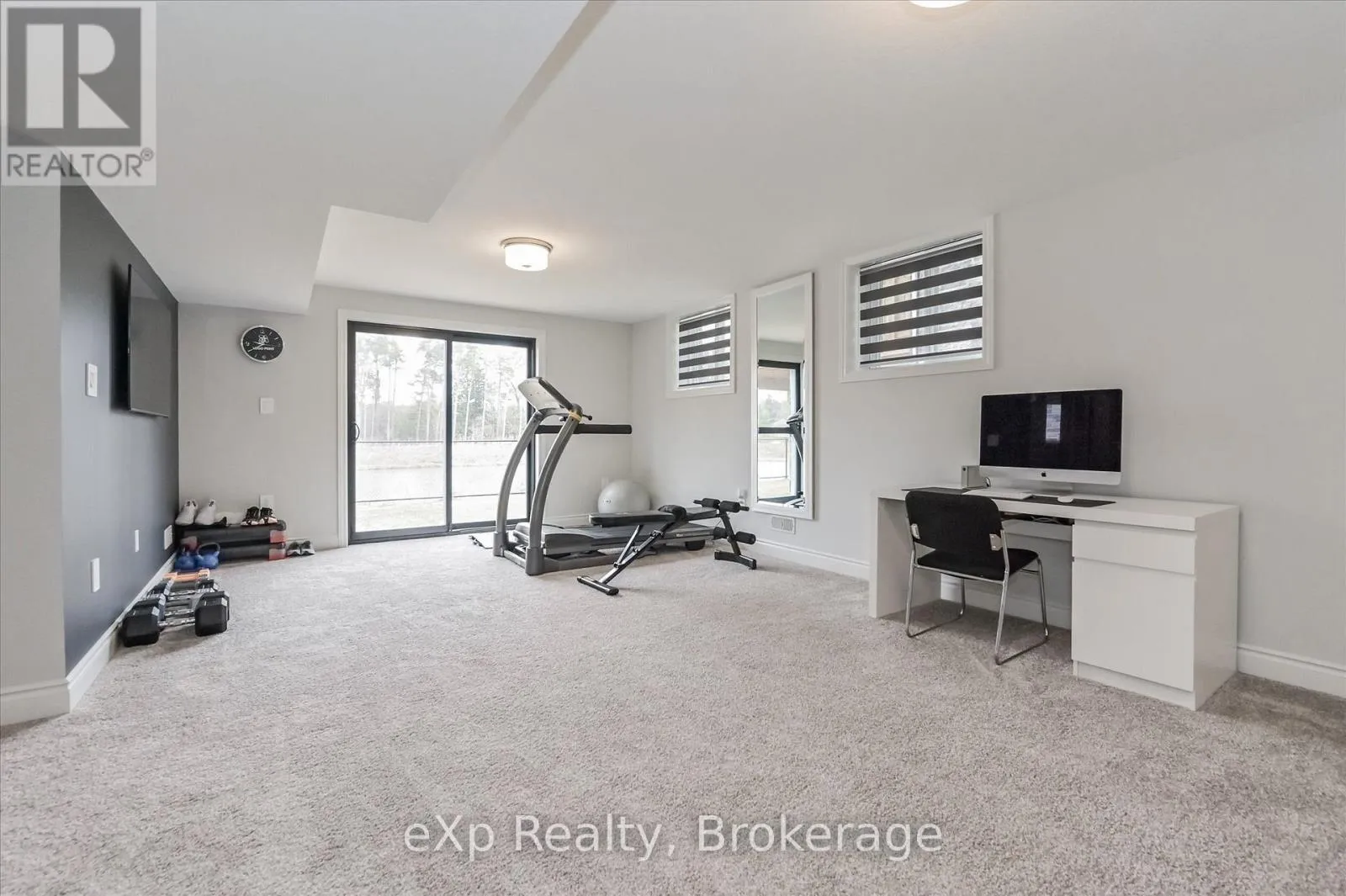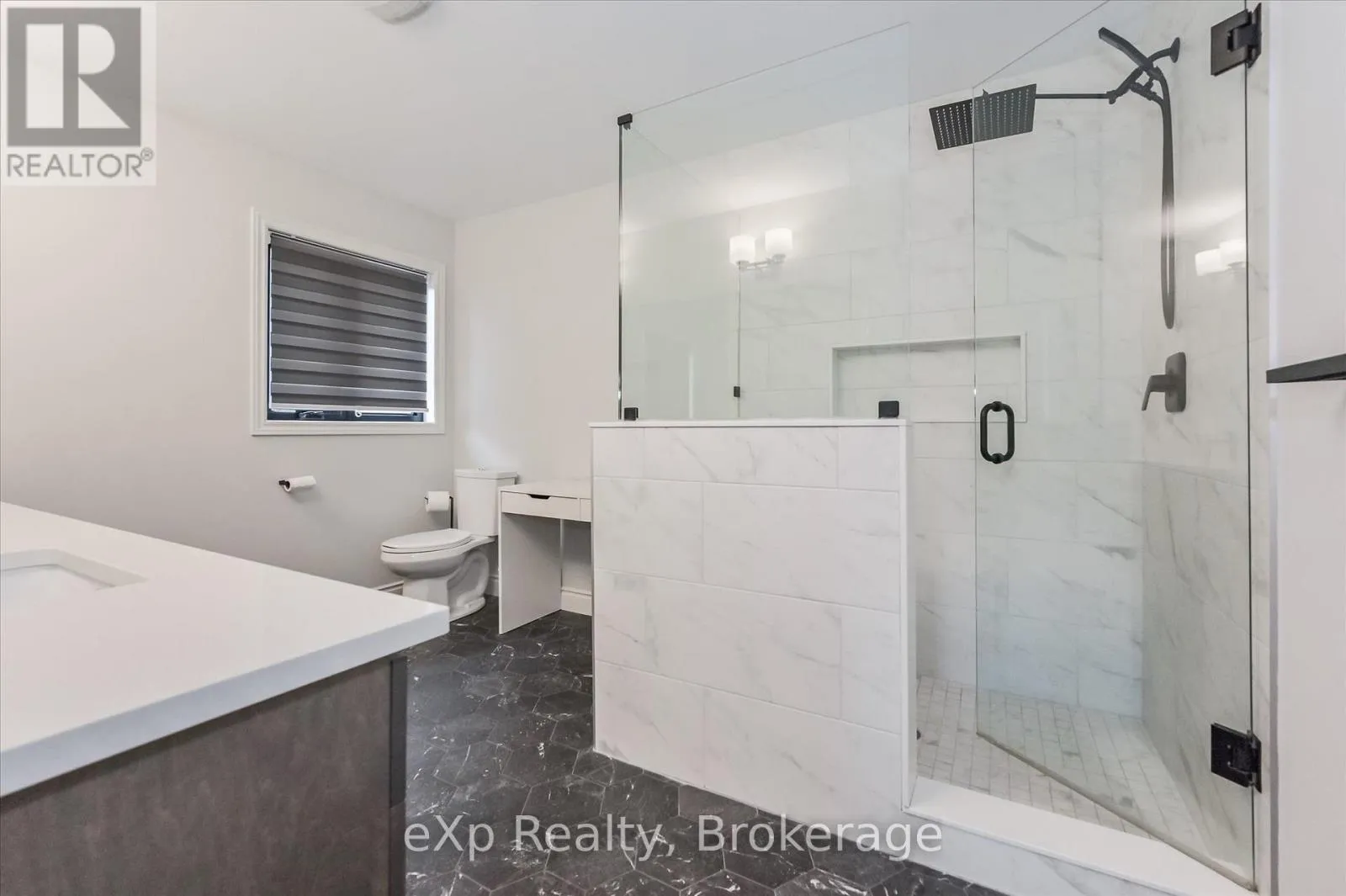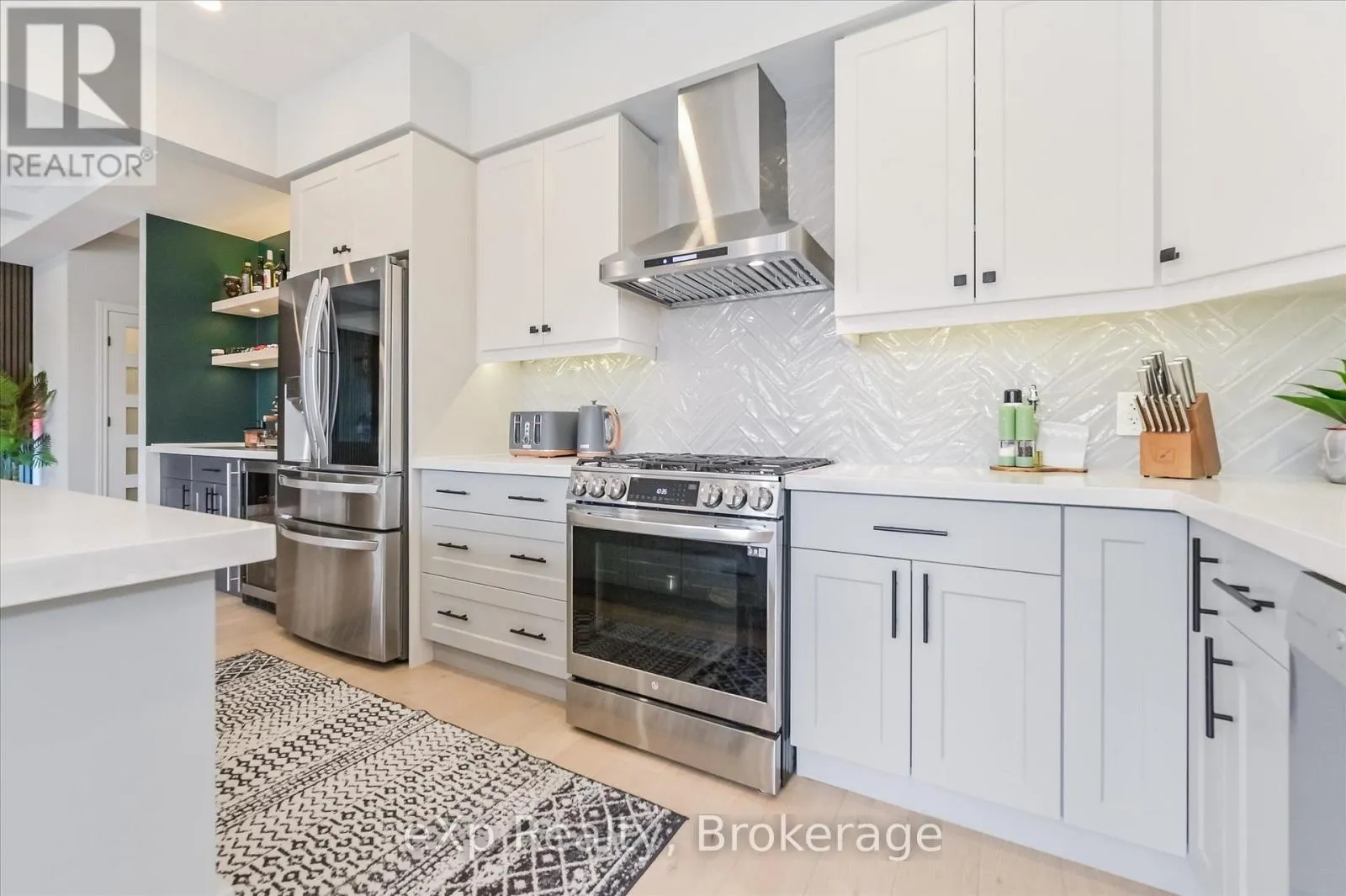 Cross Streets: Water Street. ** Directions: Water St-Haylock. Overlooking a tranquil pond in Elora's highly sought-after South River community, this 2023 Granite Home build offers a seamless blend of modern design and relaxed, nature-inspired living. With 4 bedrooms, 3 full bathrooms and a powder room, this home is thoughtfully laid out for both everyday comfort and stylish entertaining, just a short walk to downtown Elora and nearby trails including the Trestle Bridge Trail.Inside, every detail has been carefully considered. The kitchen stands out with a herringbone backsplash, two-tone cabinetry featuring cream uppers and light grey lowers and island, waterfall quartz countertops, sleek black hardware, a gas stove, and a custom coffee bar. The family room is warm and inviting, highlighted by a gas fireplace, walnut slat feature walls, and coffered ceilings that add depth and character. A striking glass staircase leads to the upper level, where a spa-like bathroom features a waterfall shower with niche and glass surround. White oak flooring and black window frames carry a clean, modern feel throughout.The finished walkout basement is bright and functional, offering additional living space with direct access to the backyard and peaceful water views. Complete with a double car garage and refined finishes throughout, this home presents a beautifully finished opportunity in one of Elora's most desirable neighbourhoods. Quick closing available. (id:27476)
