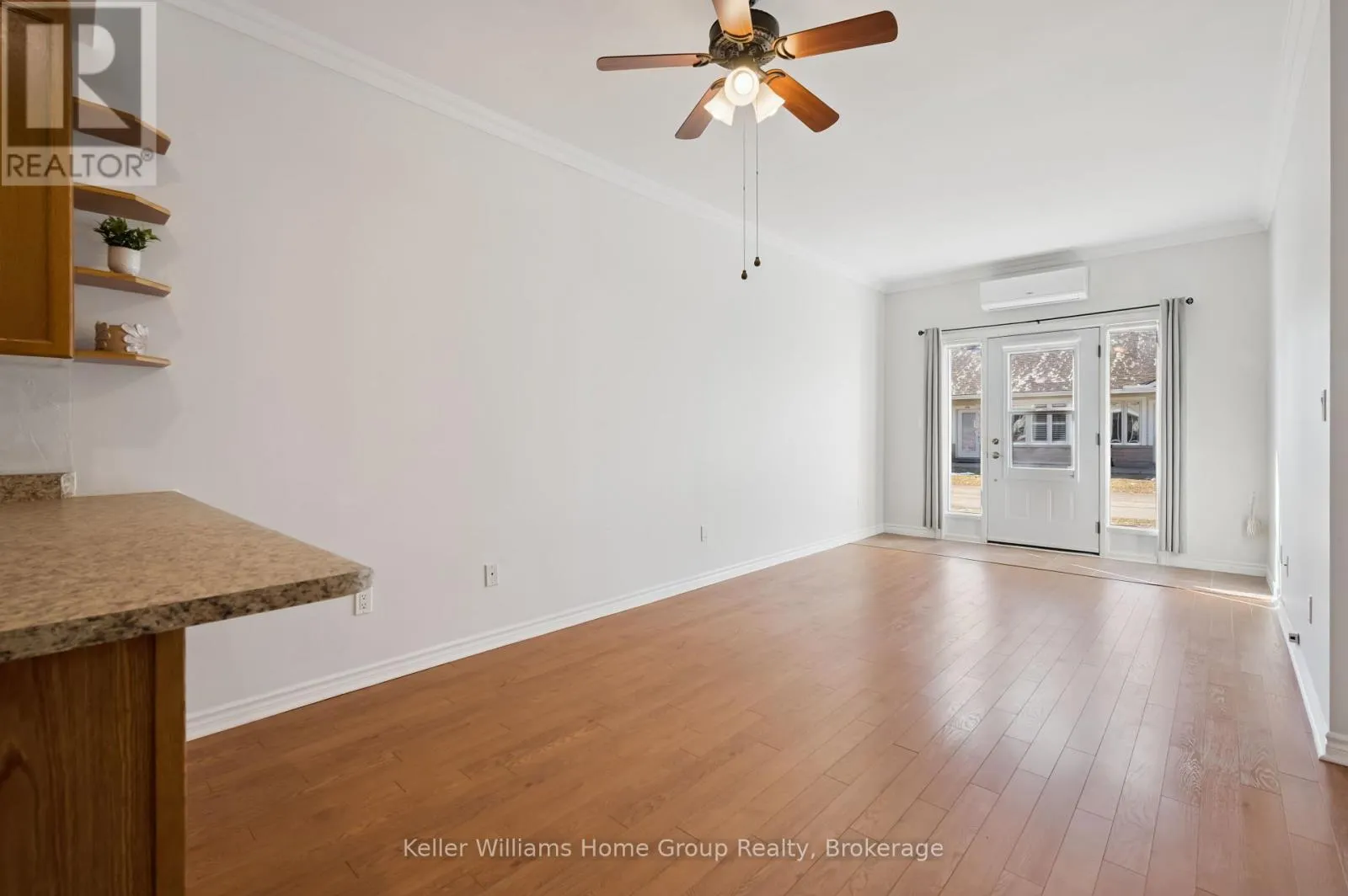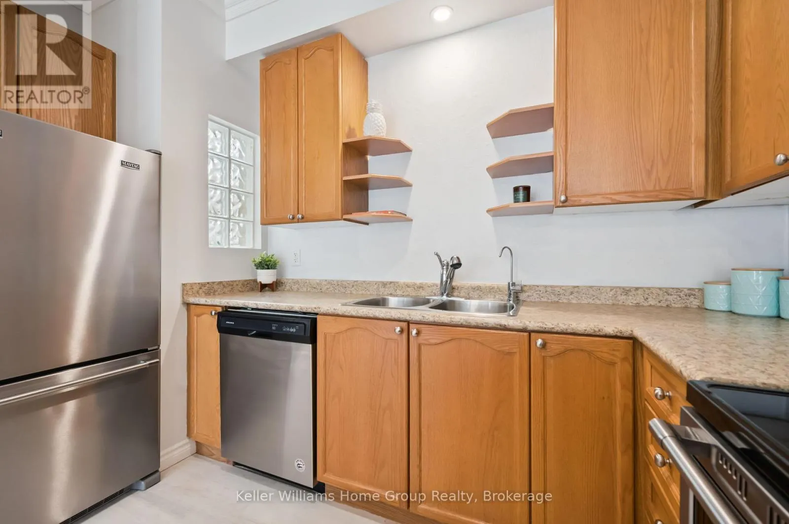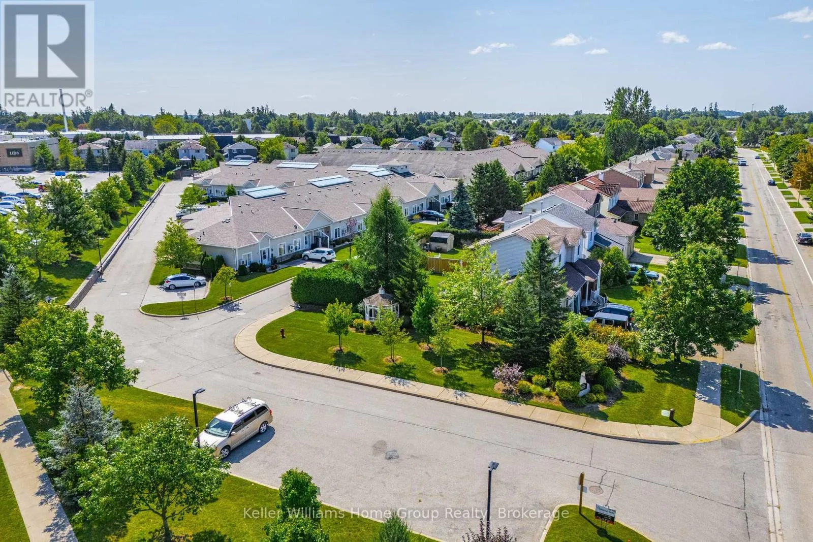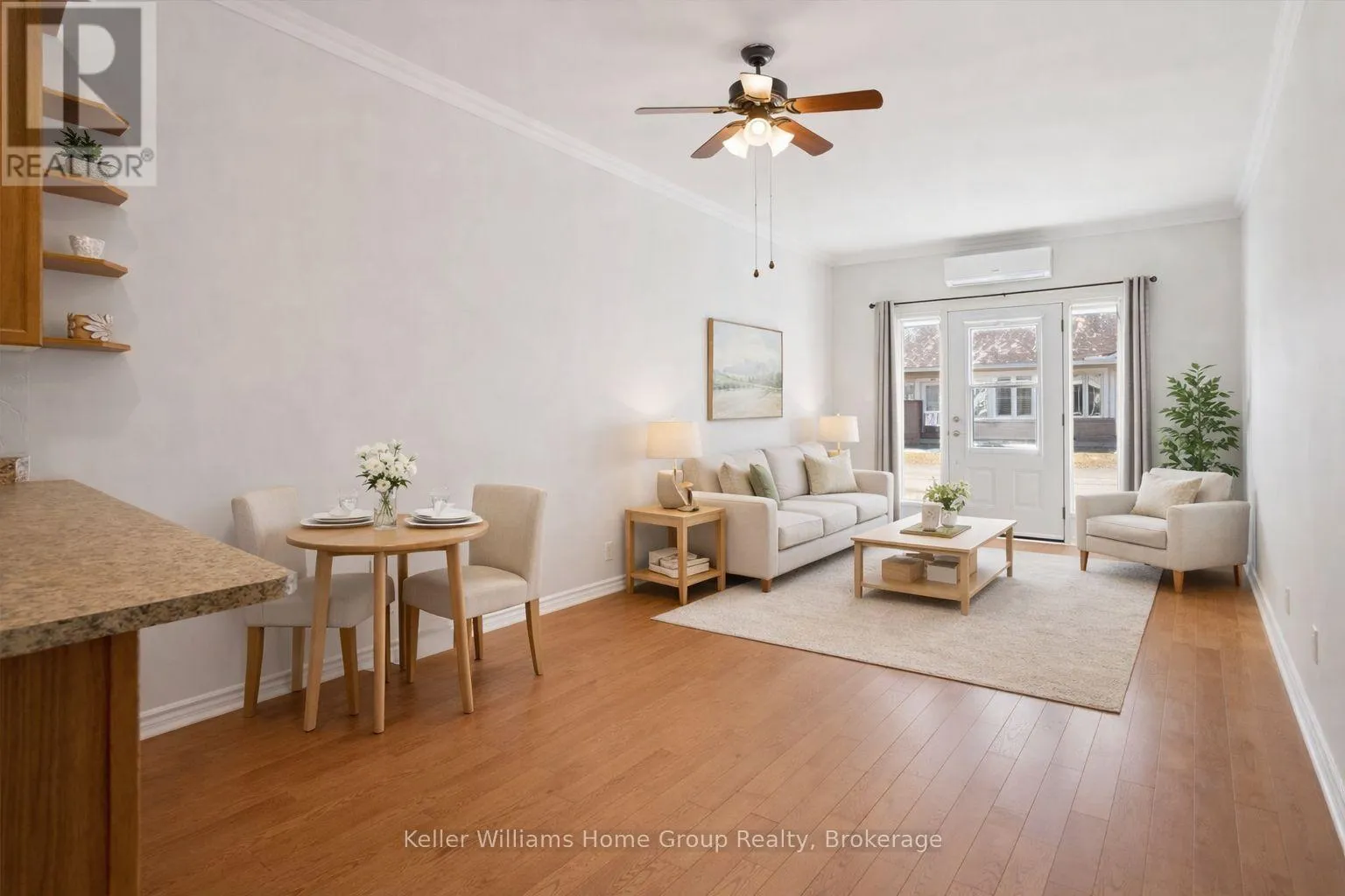 Cross Streets: Near Hwy.6 at corner of Elizabeth Cres. ** Directions: Turn west from Hwy. 6 onto Woodhill Drive. Welcome to this cozy bungalow condo townhouse, located in the friendly community of Woodhill Gardens, in north end Fergus. Everyday amenities are just minutes away. This bright and inviting open-concept home features 1 bedroom and 1 bathroom, 9' ceilings, and an abundance of natural light throughout.Enjoy the comfort of heated floors and the convenience of parking right outside your front door with your own private driveway. The home also offers a small patio for outdoor enjoyment, plus a unique upper-level storage space with pull-down ladder access.A second entry leads to a covered atrium, allowing you to access your mailbox and the party/games room without ever having to step outside-perfect for year-round comfort. This well-maintained community is ideal for walking and easy living.Condo fees include patio, driveway, and lawn/snow maintenance. Updates 2-5 years old include: heat pump, appliances, bathroom renovation, kitchen flooring, front door /windows, phantom screen, and window treatments. Book your private viewing today. (id:27476)