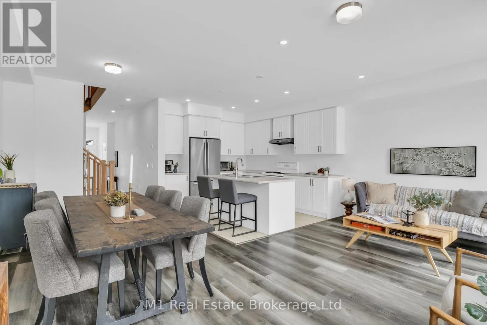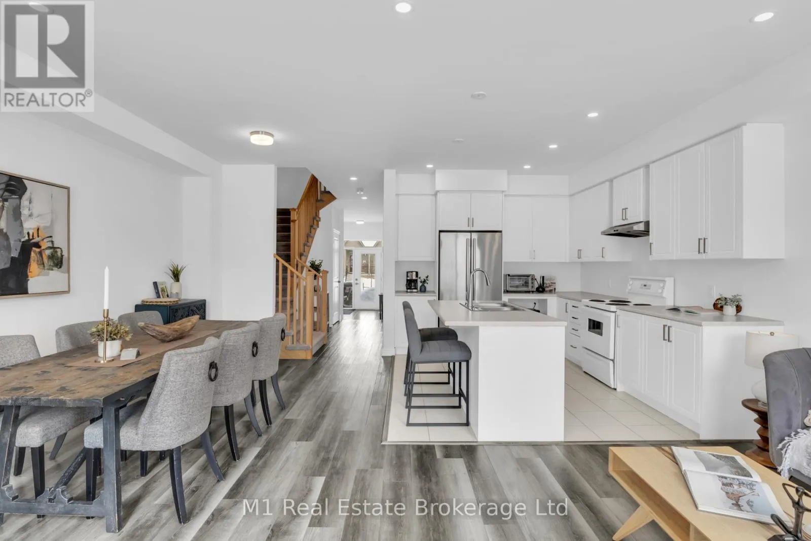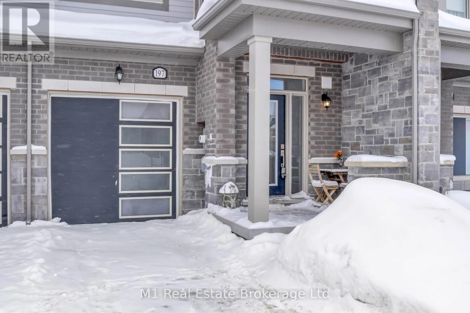 Cross Streets: Elliot Ave. ** Directions: Turn West onto Farley Rd. from Beatty Line. Welcome to 197 Farley Road, a well-designed freehold townhome located in the desirable Storybrook community of Fergus. This modern two-storey home offers approximately 1,742 sq. ft. of finished living space with three bedrooms and three bathrooms, providing a practical layout suited to everyday living. The main floor features a bright, open-concept design anchored by a contemporary kitchen with ample cabinetry, a large centre island, and quality finishes throughout, flowing seamlessly into the main living area. Upstairs, the primary bedroom includes a walk-in closet and a private four-piece ensuite, while two additional bedrooms share a full main bath. Upper-level laundry adds everyday convenience, and the unfinished basement offers excellent potential for future living space with existing rough-ins already in place. Exterior highlights include attractive brick and stone finishes, a covered front porch, and an attached garage with interior access. Ideally located close to schools, parks, trails, recreation facilities, and Groves Memorial Community Hospital, this home offers a low-maintenance lifestyle in one of Fergus's established newer neighbourhoods. (id:27476)