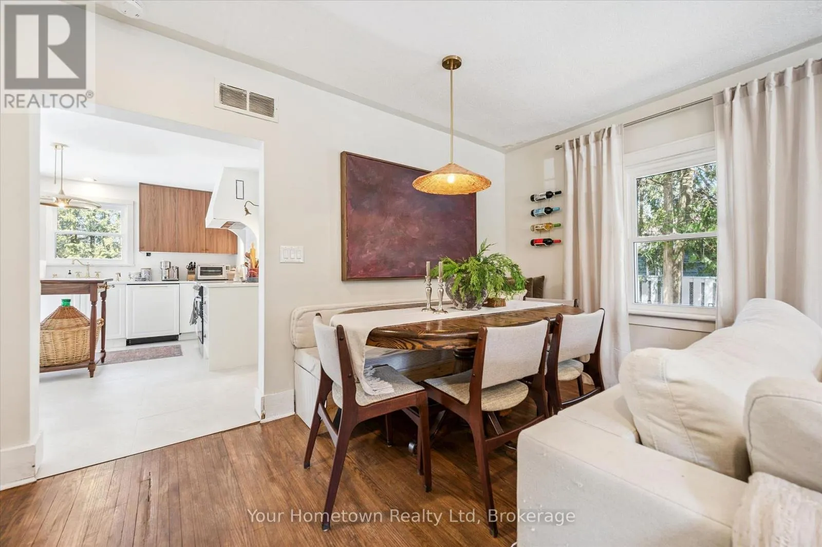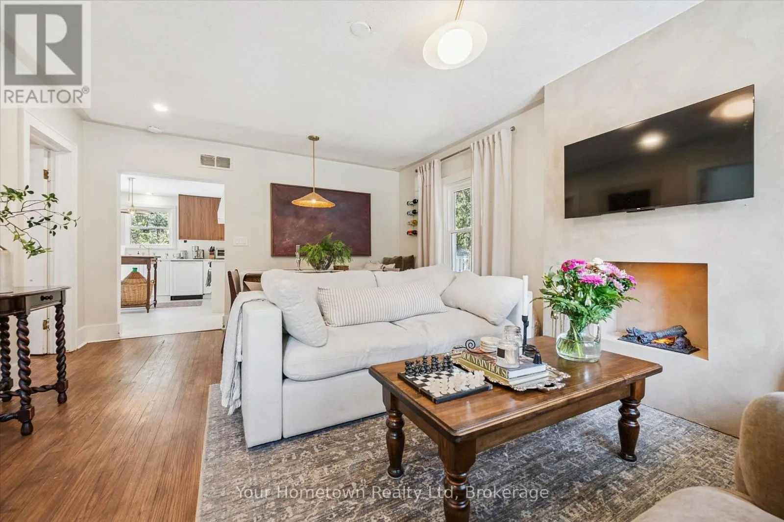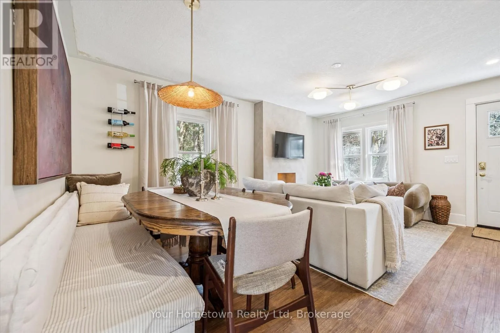 Cross Streets: Scotland. ** Directions: Scotland to Orangeville R. Location, location, location! Tucked away down a tree-lined lane, this charming cottage-inspired home offers the perfect blend of privacy and convenience, just moments from everything you need. Set on a mature 0.6-acre lot, the home welcomes you with an inviting stone walkway and serene surroundings. Inside, a freshly painted living room sets the tone, featuring a striking micro-cement hearth and a unique Optimyst water-vapour fireplace for a cozy, modern ambiance. The thoughtfully designed dining area includes a built-in bench, ideal for hosting and gathering, while the updated kitchen impresses with quartz countertops, integrated appliances, and a new sliding door that opens directly to the backyard, creating effortless indoor-outdoor living. This cozy home features a spacious primary bedroom with a walk-in closet, a bright and inviting second bedroom, and a versatile office or nursery just off the living room, providing flexible space to suit your lifestyle. Indulge in the fully renovated bathroom, complete with a freestanding tub, exposed brass shower fixtures, new vanity, and toilet, offering a spa-like experience at home. A new all-in-one washer/dryer adds everyday convenience. Surrounded by nature yet perfectly situated in town, you're just steps to the river, scenic trails, and close to arterial roads for an easy commute. A property of this size and setting is a rare offering so close to town, an exceptional opportunity to enjoy peaceful living without compromise. (id:27476)
