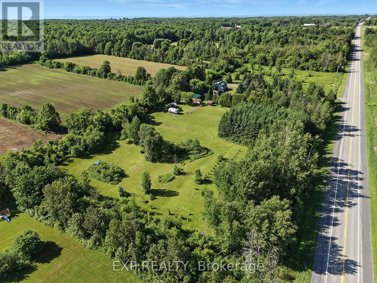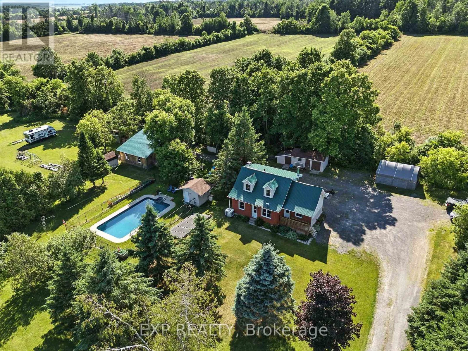 Cross Streets: hwy 34. ** Directions: 7800 Hwy 34. . Welcome to a property where nature, privacy, and lifestyle come together on nearly 5 acres of beautifully maintained land. Surrounded by mature trees and landscaped gardens, this is the kind of setting that invites you to slow down and enjoy every season. A winding path circles the home perfect for peaceful walks or cruising the grounds with a cart. Cool off in the inground pool, heated with solar panels and perfectly positioned for sun-filled summer days. Tinker, create, or store with ease thanks to the detached garage/workshop, three versatile sheds, and a small barn ideal for hobby farming or weekend projects. All around, vibrant gardens and greenery provide colour, life, and a sense of calm.Inside, the two-storey home features a classic brick façade and durable tin roof, offering both comfort and charm. There are three bedrooms, including one on the main level for added convenience, with walk-in closets. The heart of the home is the country-style kitchen, complete with a Sweetheart wood stove that adds a cozy, rustic touch. The unfinished basement gives you a blank canvas to expand the living space however you wish.Whether you're gardening, entertaining, or simply soaking in the quiet of country life, 7800 Highway 34 is a place where outdoor living takes centre stage and the possibilities are endless. (id:27476)