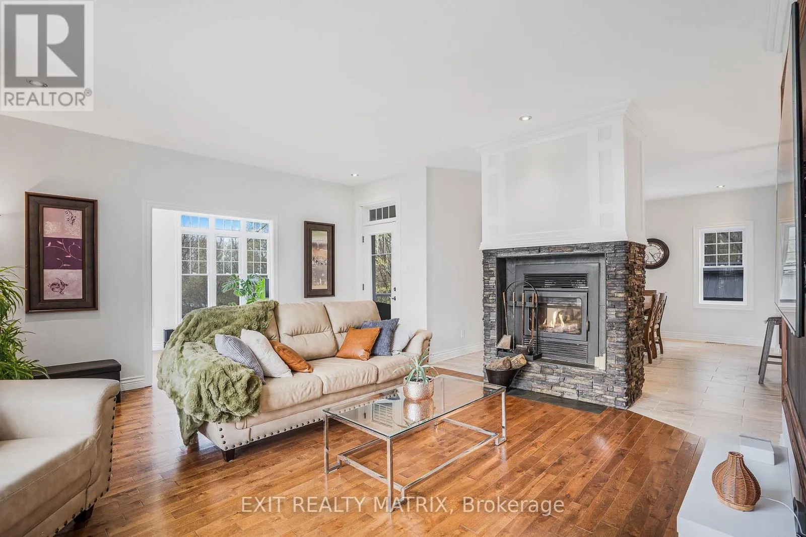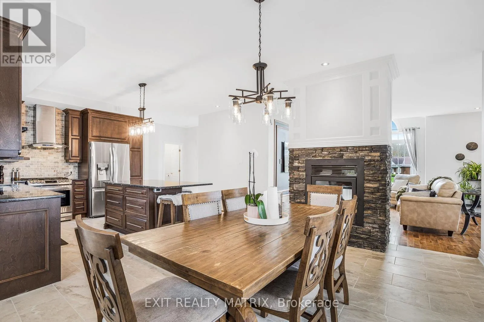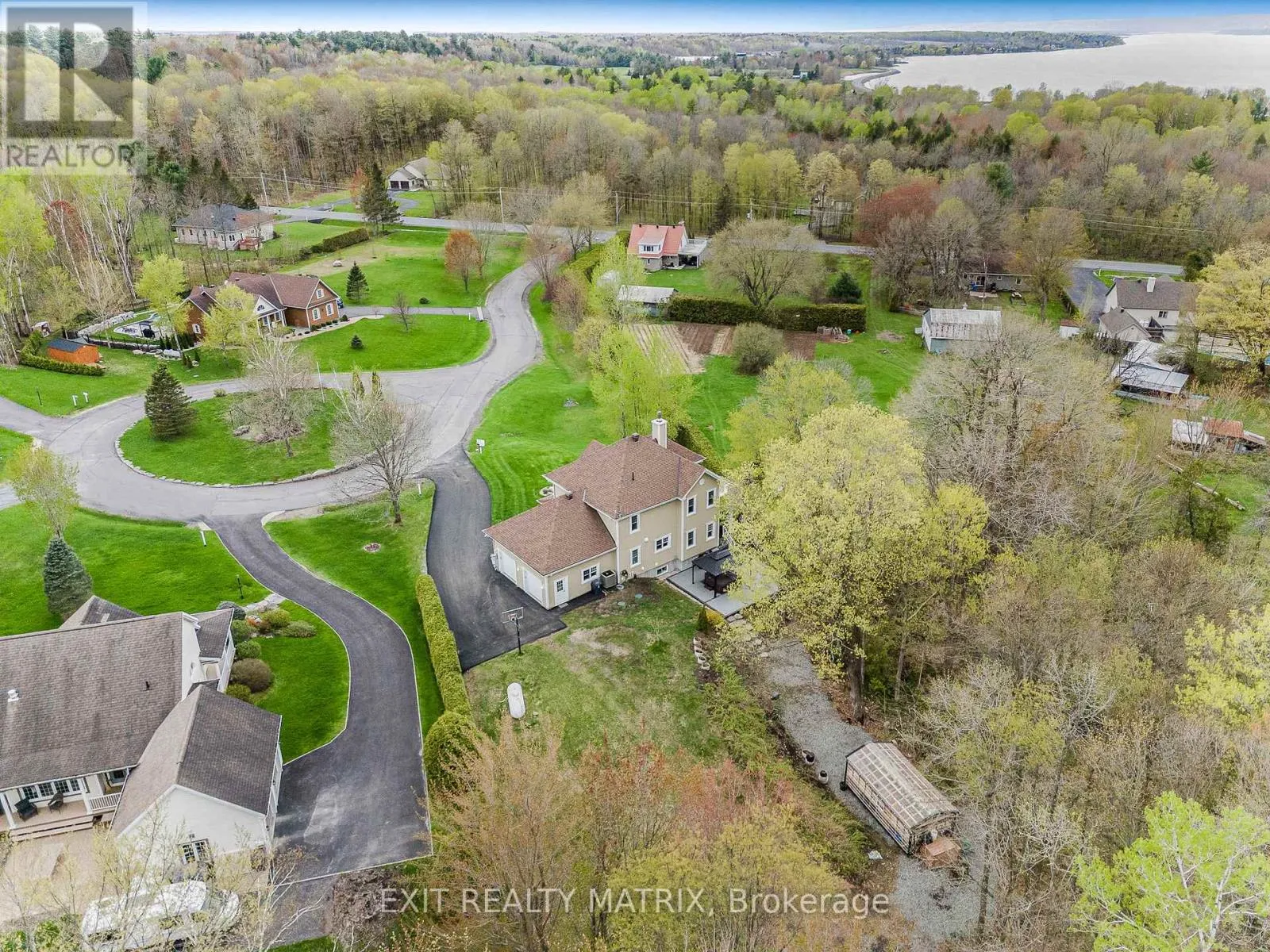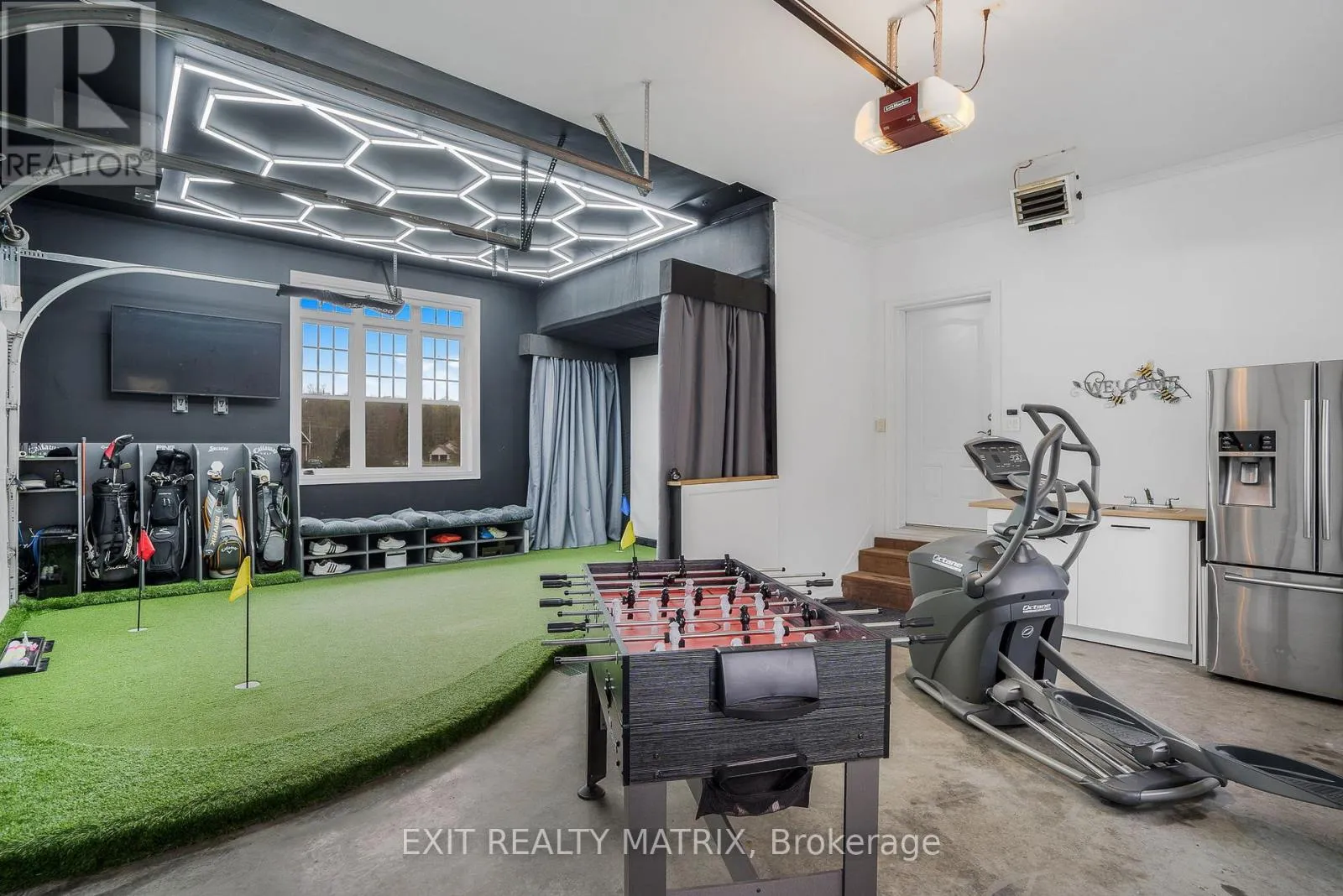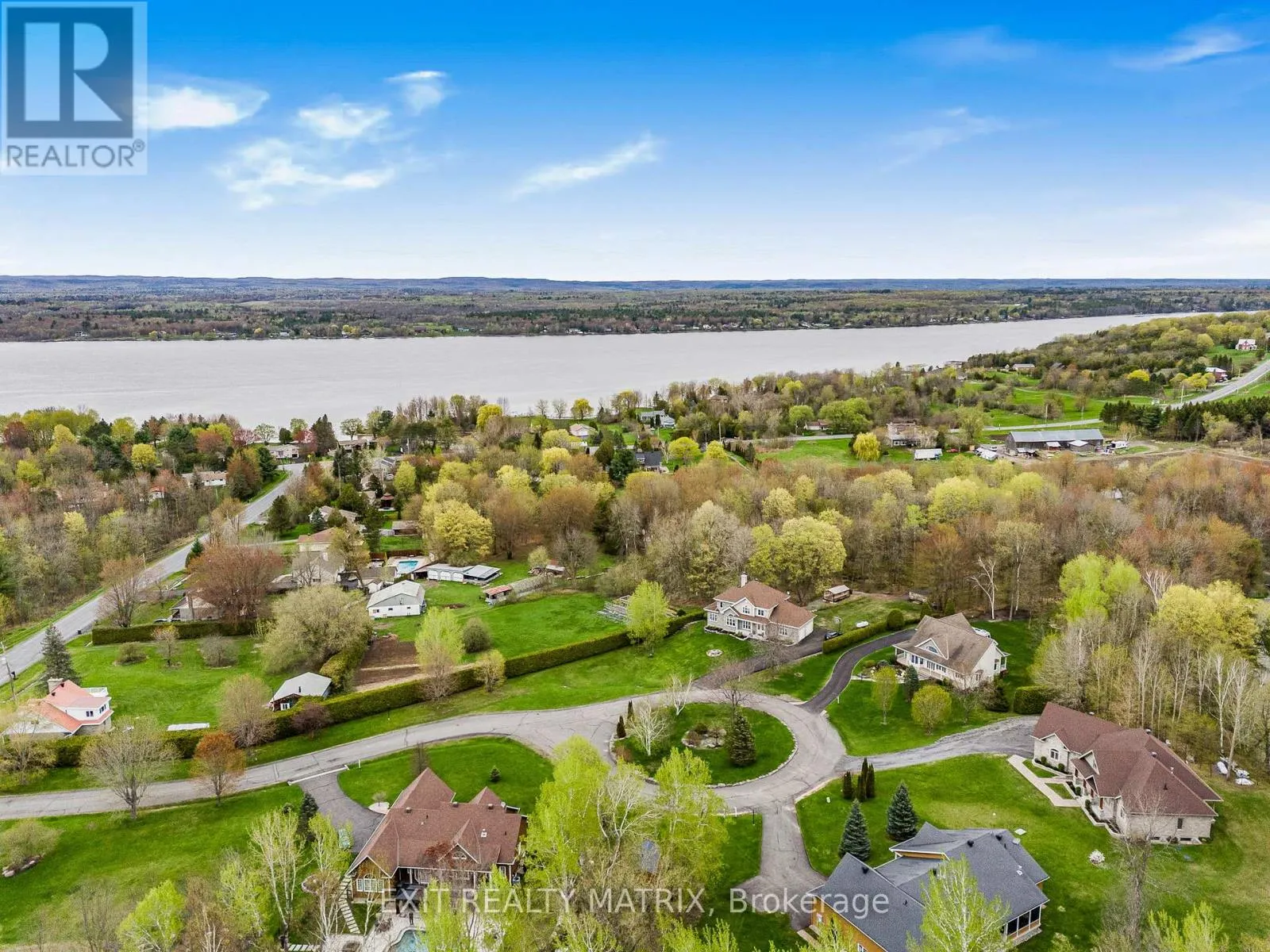 Cross Streets: Golf Club Rd. ** Directions: 64 Radstock Lane, Hawkesbury. Welcome to this exceptional property, situated within a private and exclusive gated community in Hawkesbury, conveniently located across from the renowned Hawkesbury Golf & Curling Club. This executive residence offers refined living and features a breathtaking 30ft waterfall on its grounds, providing a serene and enchanting atmosphere. The spacious open-concept main floor includes a chefs kitchen equipped with granite countertops, cherry wood cabinetry, and a large center island, ideal for both entertaining and culinary endeavors. A striking double-sided wood-burning fireplace enhances the warmth and charm of the living and dining areas, creating an inviting ambiance. A dedicated laundry room and a stylish partial bathroom are also conveniently located on this level. The upper level comprises three well-appointed bedrooms, two of which provide direct access to a private balcony, perfect for enjoying morning coffee or evening sunsets. The luxurious primary suite features a spa-inspired ensuite with a deep, jetted tub, an elegant tiled shower, and an oversized walk-in closet. The fully finished basement expands the living space with two additional bedrooms, including a custom professionally built home studio and office, suitable for content creators or remote professionals. Furthermore, the basement includes a custom entertainment bar area with a 72 bottle capacity. The garage offers a professional golf simulator with a 20' x 24' four-hole putting green for golf enthusiasts. The exterior of the property offers a backyard oasis featuring a covered porch leading to a relaxing hot tub under a metal gazebo, meticulously manicured landscaping, a scenic path to the impressive Rideau Falls located on the property, and a cozy firepit area, providing a private retreat for all seasons. Over 3500 sq ft of finished living space. This exceptional offering combines executive comfort, natural beauty, and a prime location. (id:27476)