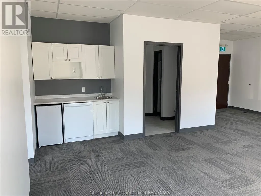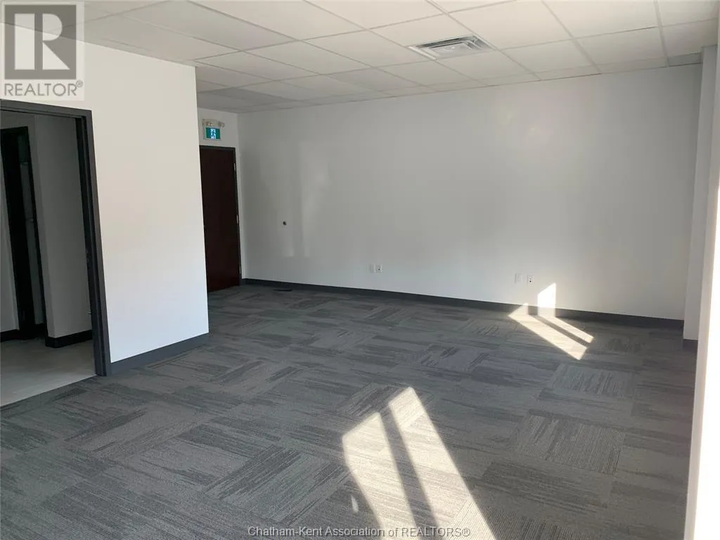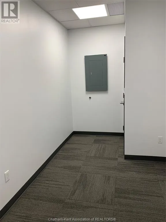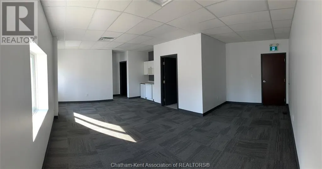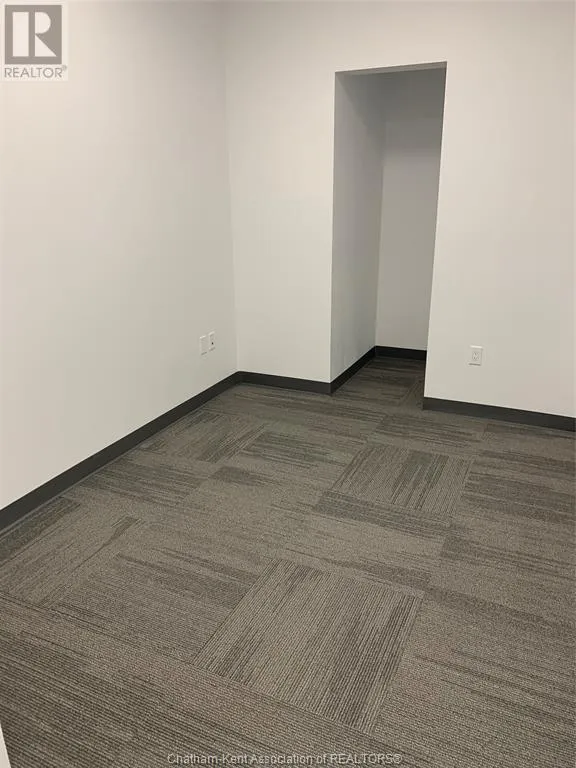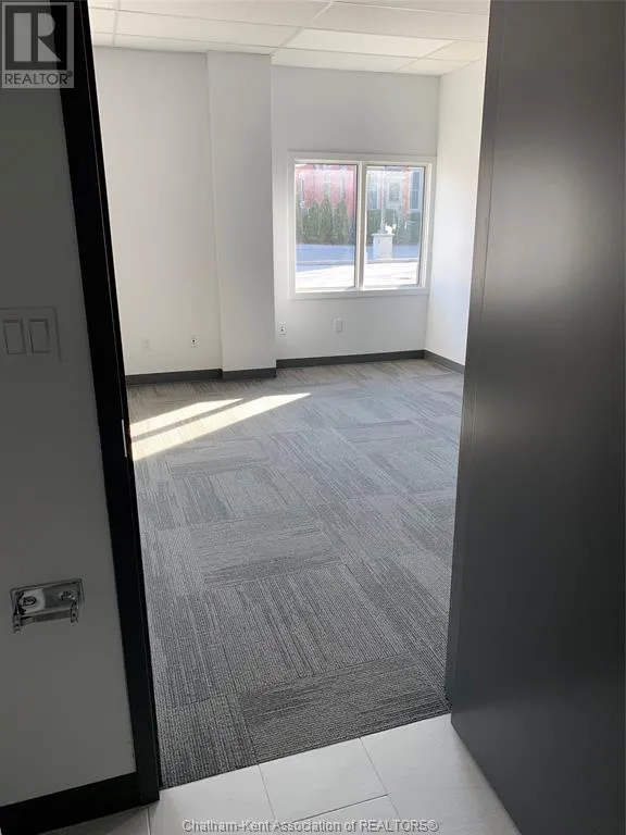 For Lease: 778 sq ft professional office suite in Wellington Centre in Chatham. Ideally located on Wellington St W just east of Lacroix on the fringe of downtown Chatham just 2 blocks from Chatham-Kent Health Alliance Hospital. Suite 102 is located on the main floor in the front of the building. This upscale suite features high-end finishes, modern design, and a prime location ideal for medical professionals or executive offices. Comprised of 2 private offices and an open area with kitchenette. Zoning permits a variety of uses including but not limited to Clinics, Call Centres, Commercial School, Offices, Medical/Dental Clinics, etc. Ample on-site parking available with security card access to parking and building, video surveillance. Asking $1,795.00 per month (includes gas and water) plus separately metered hydro. Tenant responsible for internet, repairs, insurance etc. Available Sept. 1/25.R (id:27476)