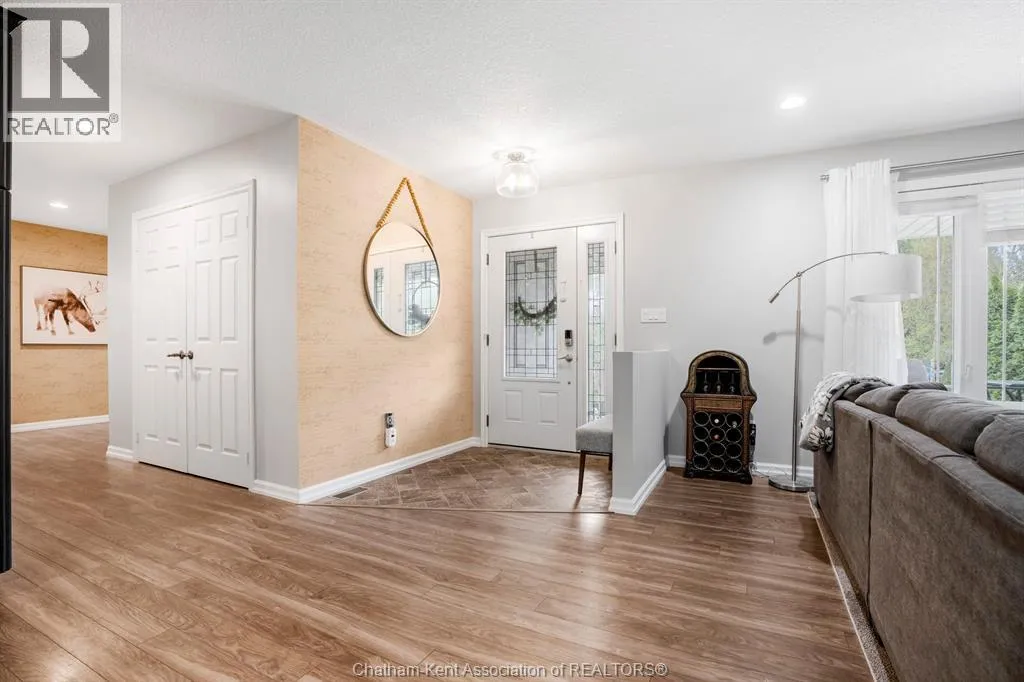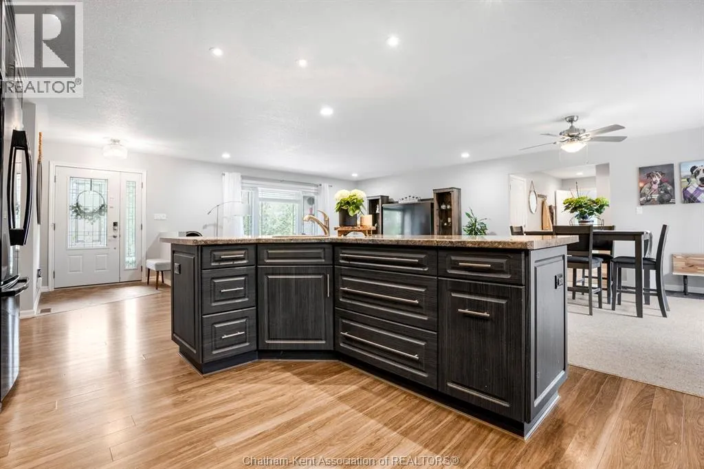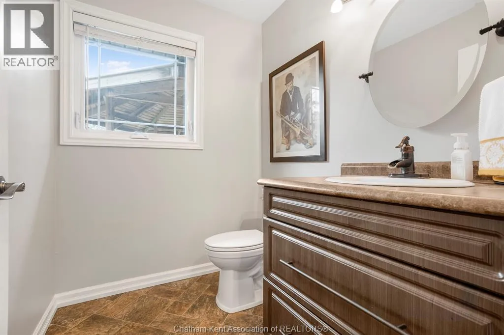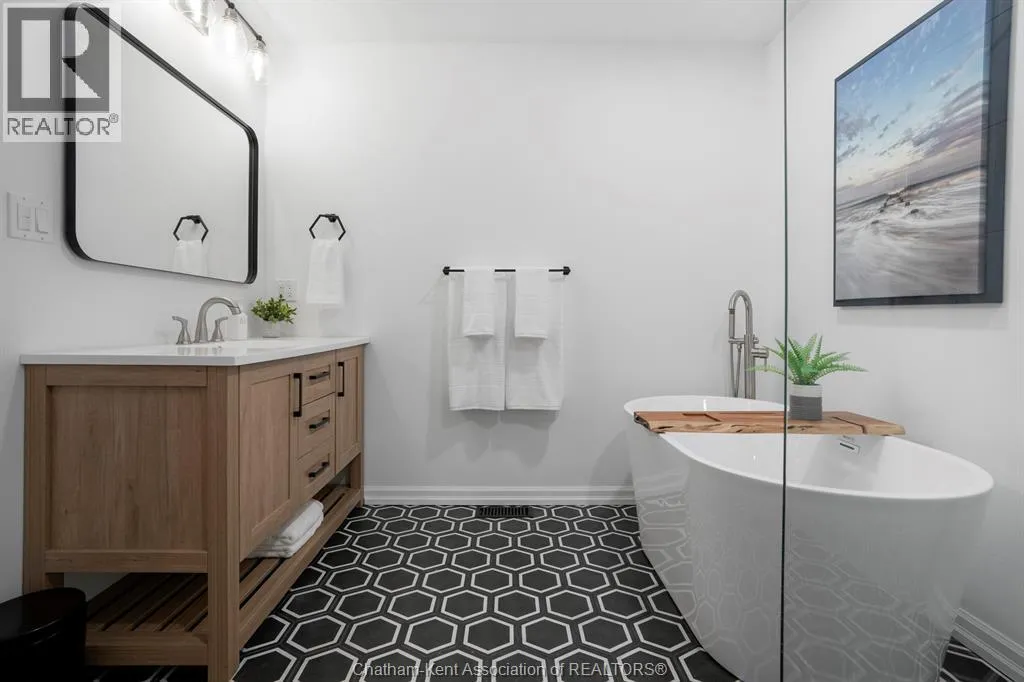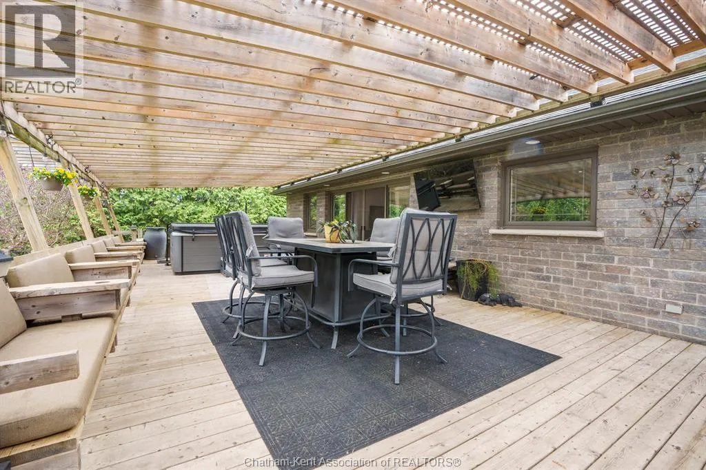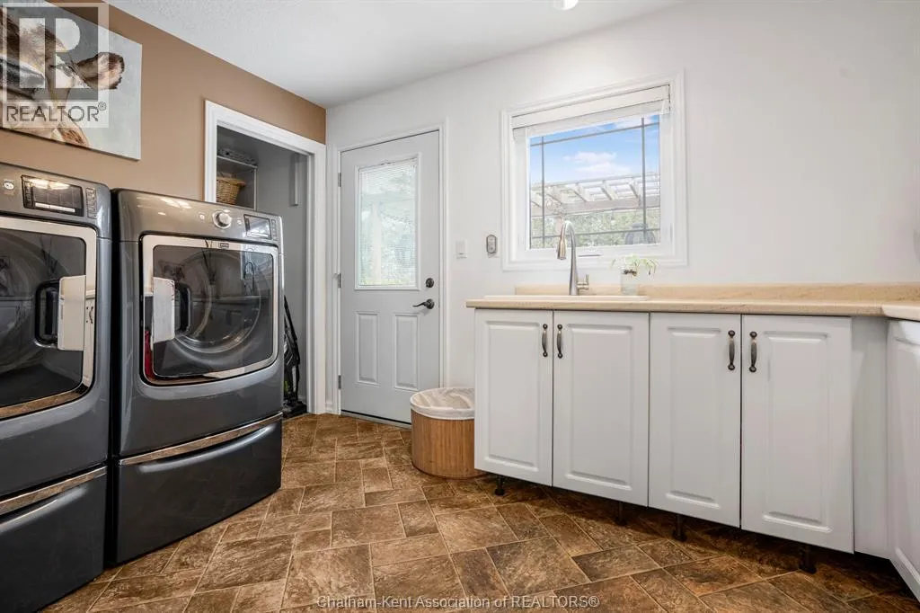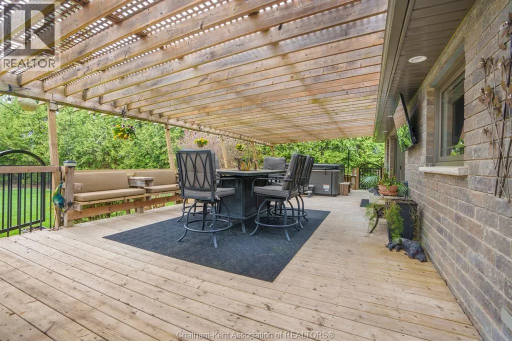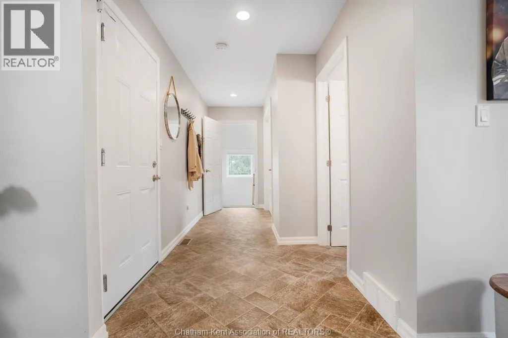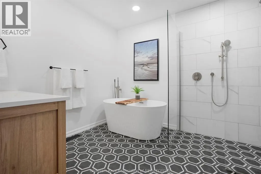 Welcome to your dream country escape! This all-brick rancher sits on just under 1 acre of private, cedar-wrapped land, offering 3 spacious bedrooms and 4 updated bathrooms. One of the main floor bathrooms features a luxurious freestanding soaker tub and heated floors for ultimate comfort. A double-car attached garage adds convenience, while the fully finished massive basement offers endless storage and living space. Relax or entertain on the expansive covered patio, complete with an outdoor kitchen style and gas BBQ setup, perfect for summer evenings. The fully fenced yard and scenic walking path around the home create a peaceful retreat. Surrounded by towering cedars for seclusion, this property combines privacy, modern updates, and country charm all in one beautiful package. Donât miss this rare opportunity to enjoy the best of rural living with all the comforts of home! This home is located on the Southside of Chatham only seconds from HWY 401. (id:27476)