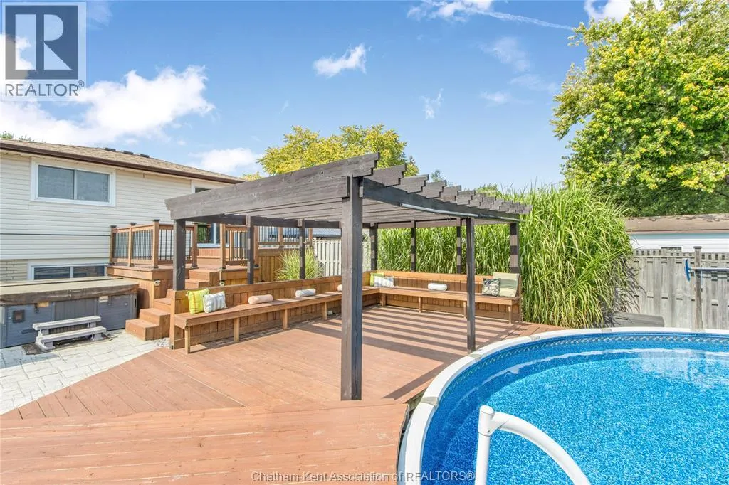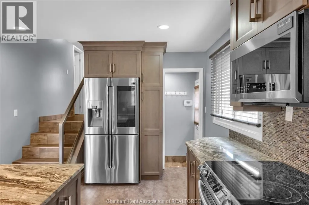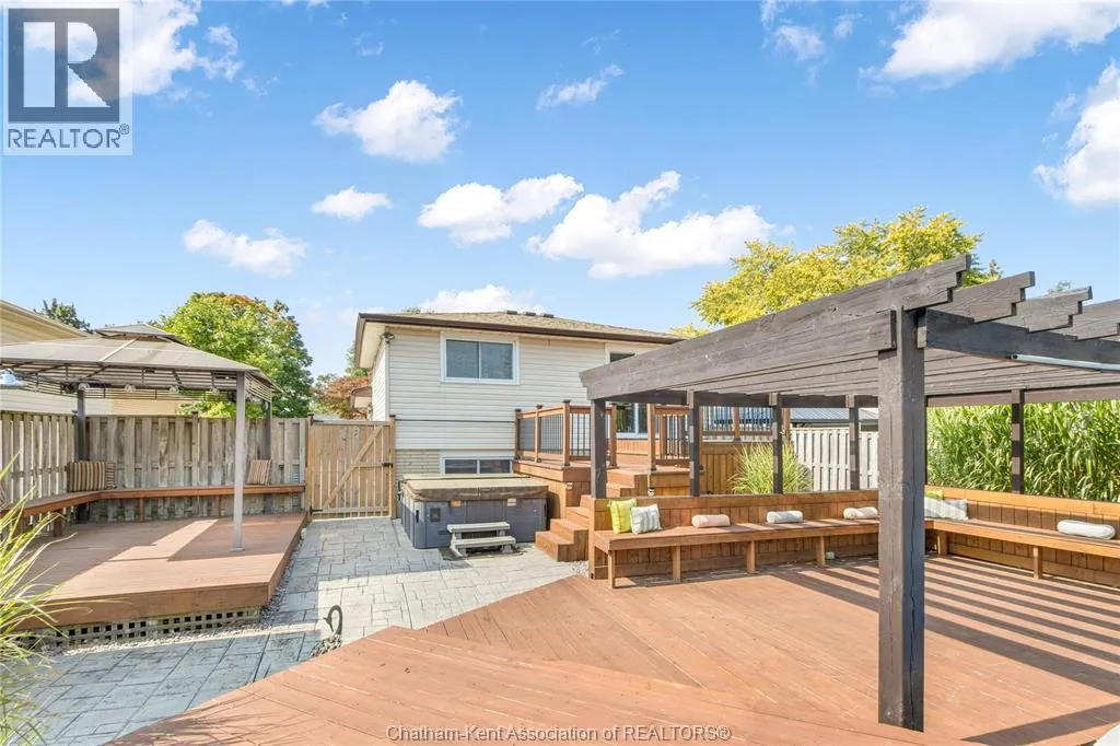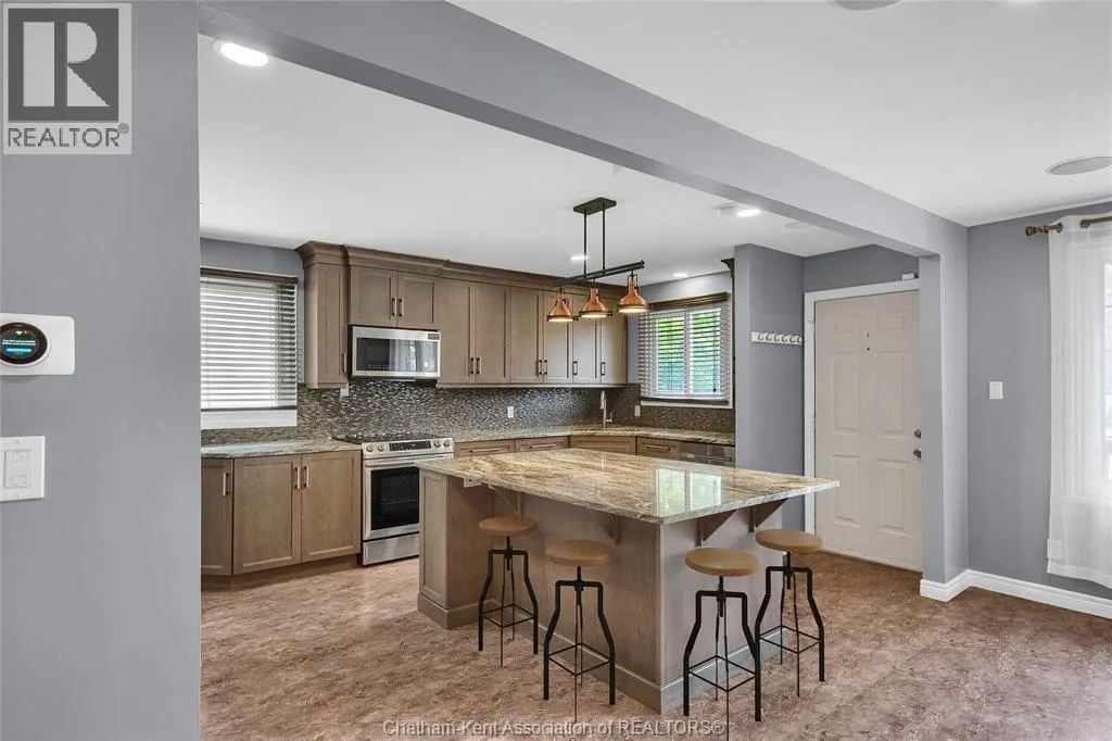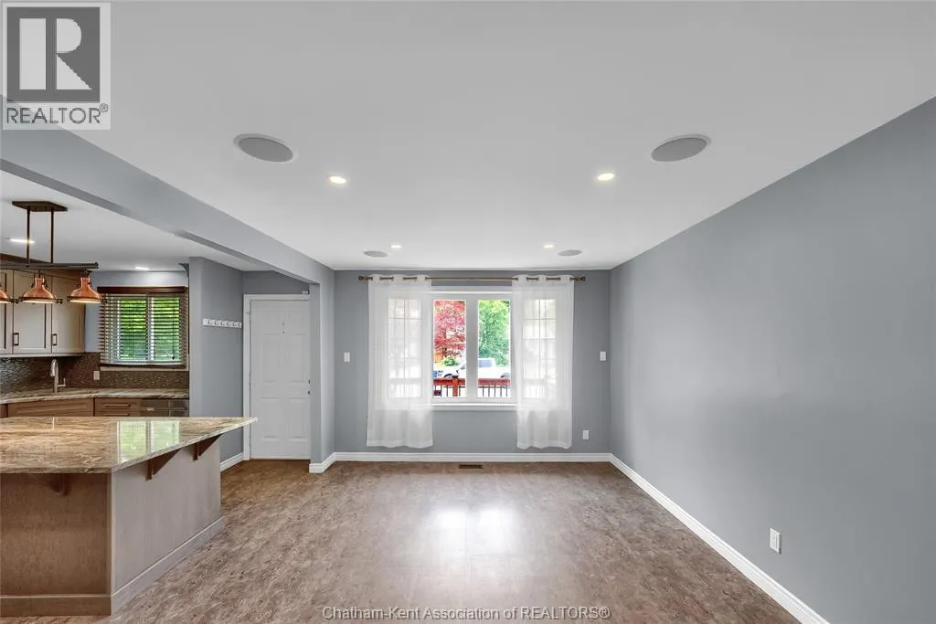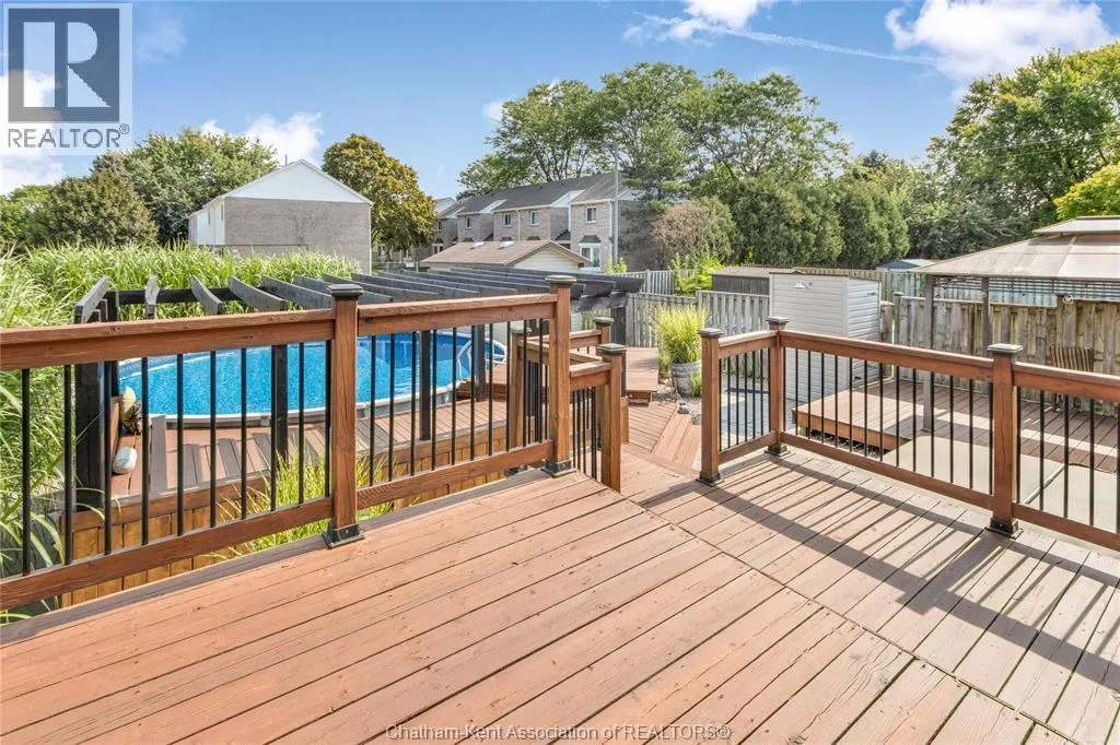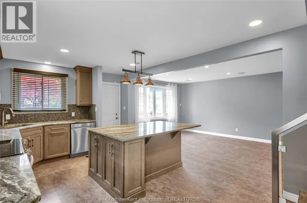 Entertain in style with this beautifully updated four-level back split located on the South Side of Chatham just a short work to Mud Creek! This home showcases thoughtful upgrades throughout, offering a lifestyle of comfort, entertainment, and relaxation. Step inside to an open-concept main floor featuring a stunning custom kitchen with a large island, granite countertops, stylish backsplash, and stainless steel appliancesâall flowing into the bright and inviting living room. Pot lights and built-in ceiling speakers enhance the space, making it perfect for everyday living or entertaining. Upstairs, you'll find 3 spacious bedrooms, a 4pc bath, and convenient patio door access from the primary suite to a sun deck overlooking the backyard. The lower level offers space for entertaining or movie nights with a sleek fireplace, custom bar area, built-in cabinetry, and an additional 3pc bathroom. The basement includes a functional workshop, dedicated storage room, and even more storage space throughoutâideal for growing families or hobbyists. Step outside to your own private retreat! The backyard is beautifully landscaped and features a two-tier deck off the primary bedroom, a side deck for dining, and a massive lounging deck with pergola. Enjoy the ultimate in outdoor living with stamped concrete walkways, a water closet, outdoor shower, and a large storage shed. Donât miss your chance to own this turnkey property loaded with style, functionality, and the perfect setup for summer entertaining! (id:27476)