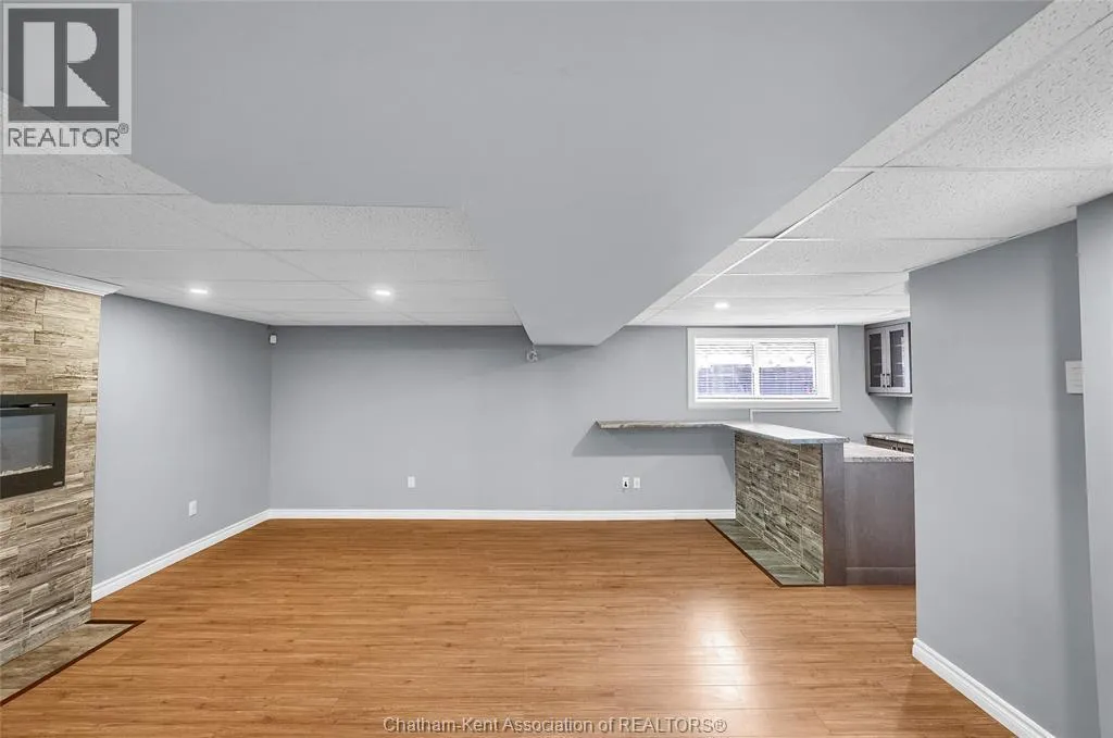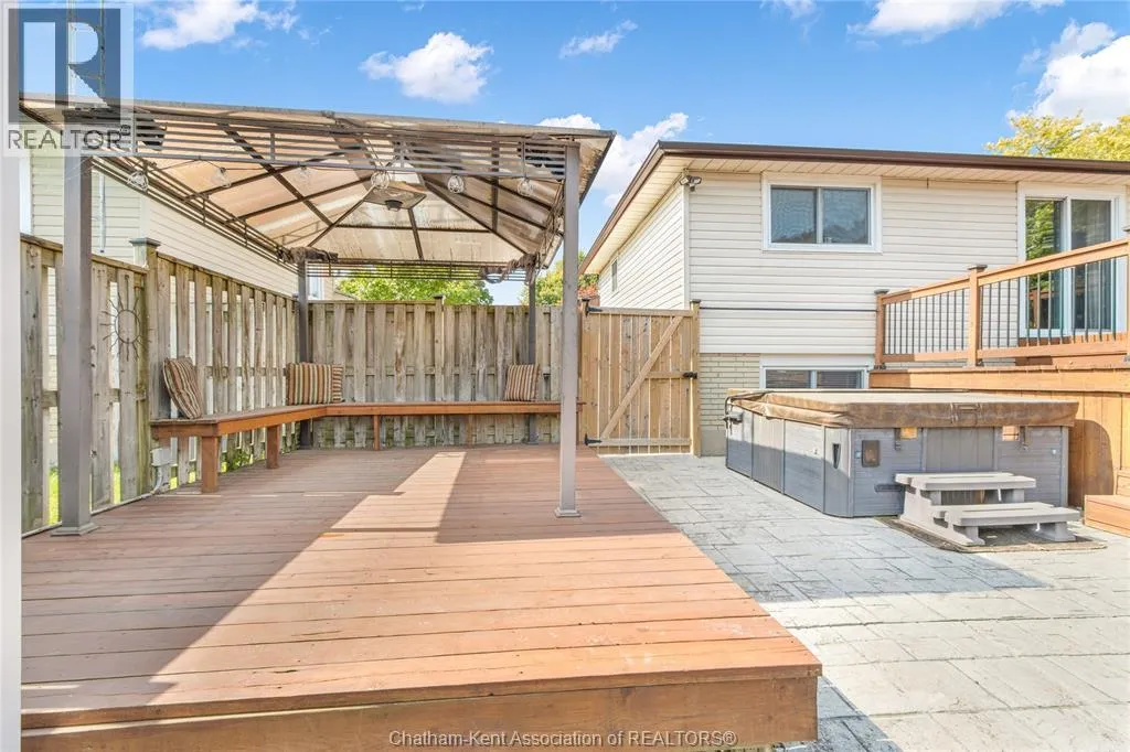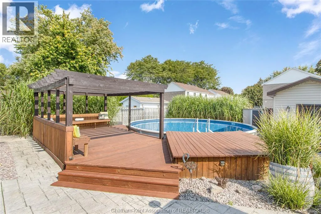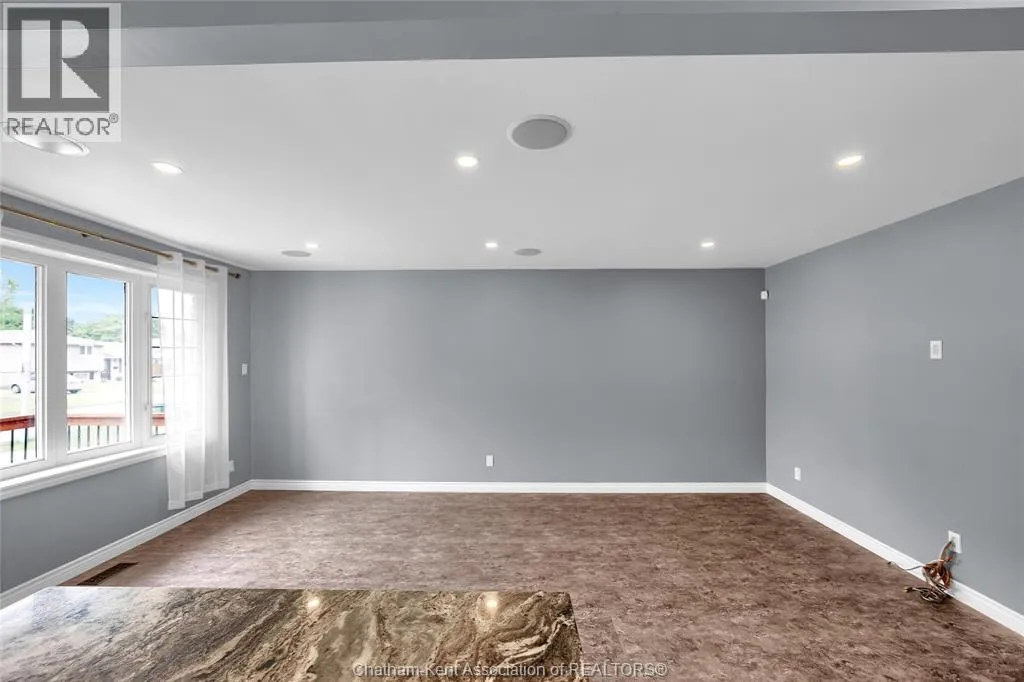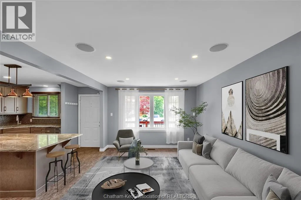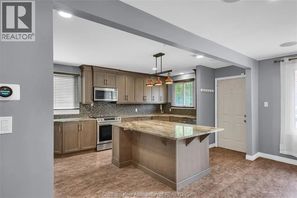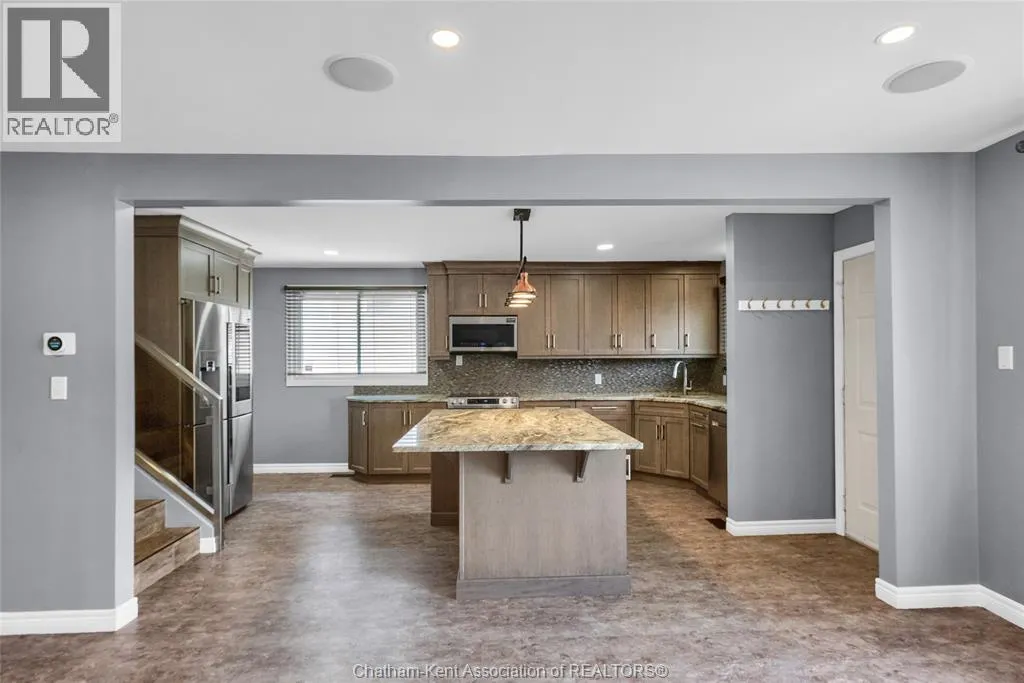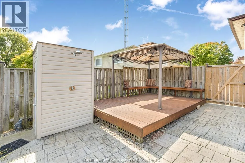 Entertain in style with this beautifully updated four-level back split located on the South Side of Chatham just a short work to Mud Creek! This home showcases thoughtful upgrades throughout, offering a lifestyle of comfort, entertainment, and relaxation. Step inside to an open-concept main floor featuring a stunning custom kitchen with a large island, granite countertops, stylish backsplash, and stainless steel appliancesâall flowing into the bright and inviting living room. Pot lights and built-in ceiling speakers enhance the space, making it perfect for everyday living or entertaining. Upstairs, you'll find 3 spacious bedrooms, a 4pc bath, and convenient patio door access from the primary suite to a sun deck overlooking the backyard. The lower level offers space for entertaining or movie nights with a sleek fireplace, custom bar area, built-in cabinetry, and an additional 3pc bathroom. The basement includes a functional workshop, dedicated storage room, and even more storage space throughoutâideal for growing families or hobbyists. Step outside to your own private retreat! The backyard is beautifully landscaped and features a two-tier deck off the primary bedroom, a side deck for dining, and a massive lounging deck with pergola. Enjoy the ultimate in outdoor living with stamped concrete walkways, a water closet, outdoor shower, and a large storage shed. Donât miss your chance to own this turnkey property loaded with style, functionality, and the perfect setup for summer entertaining! (id:27476)