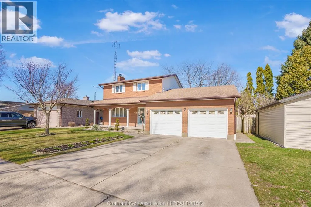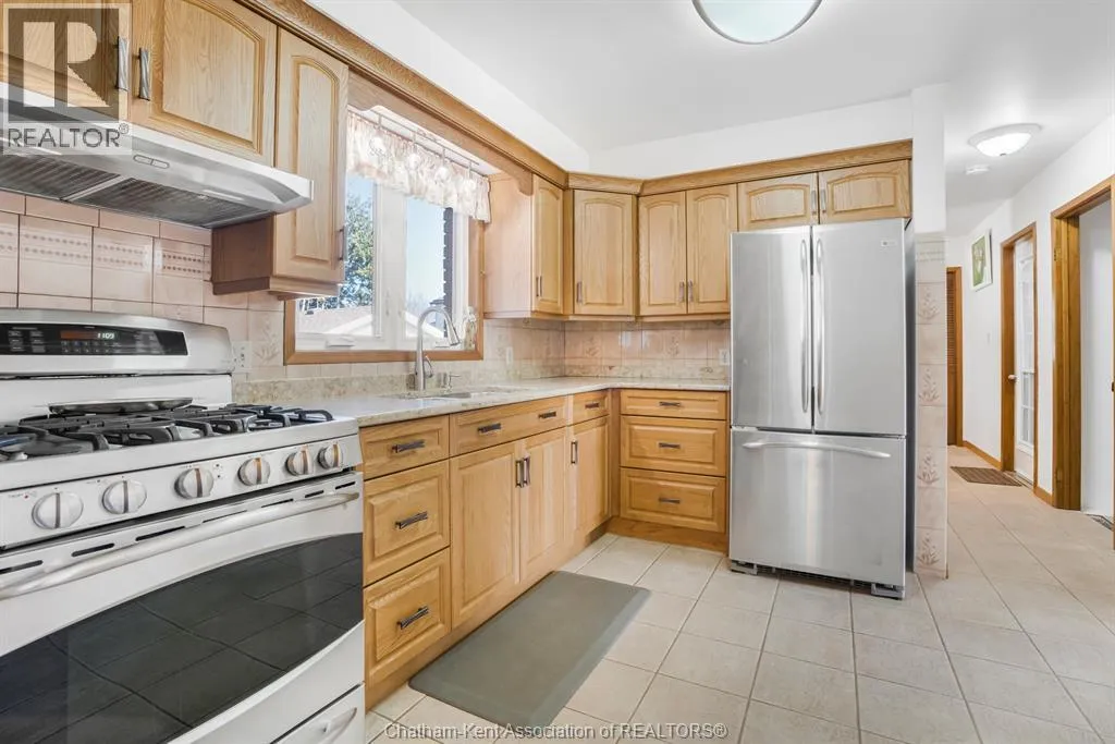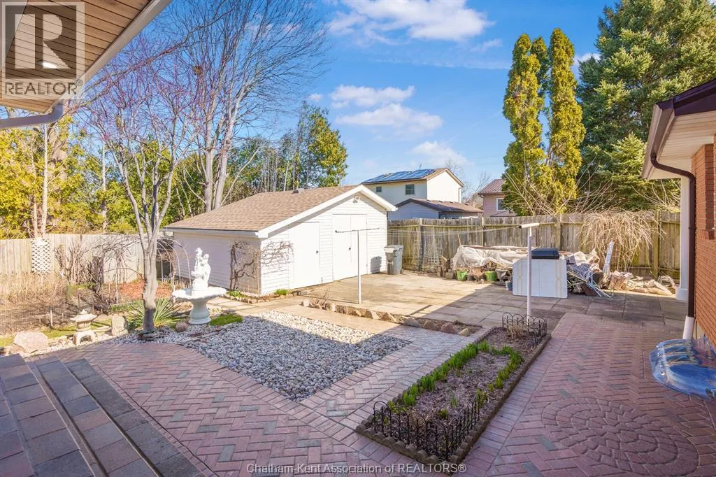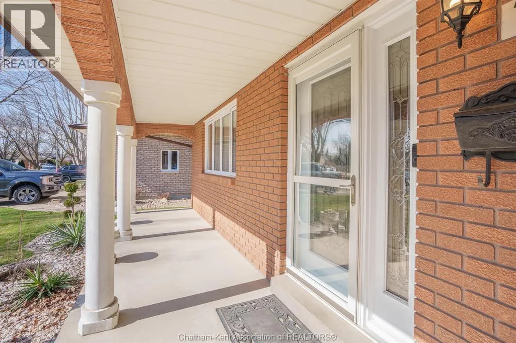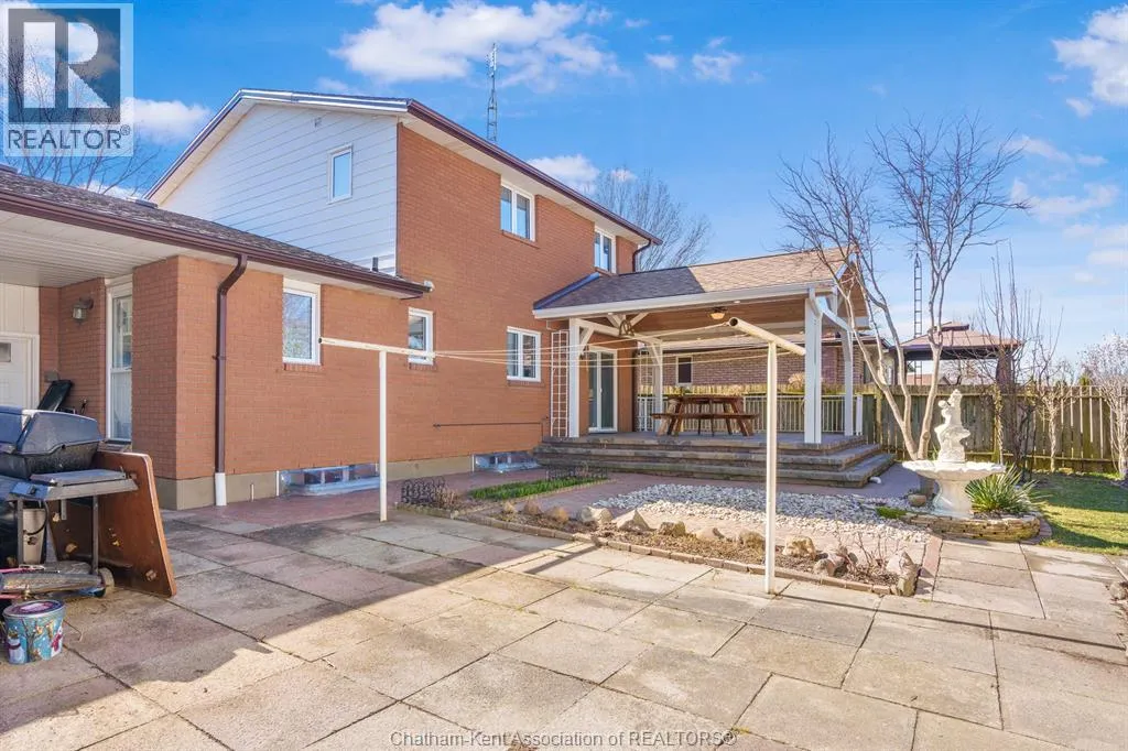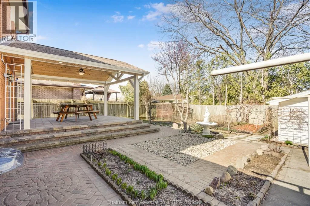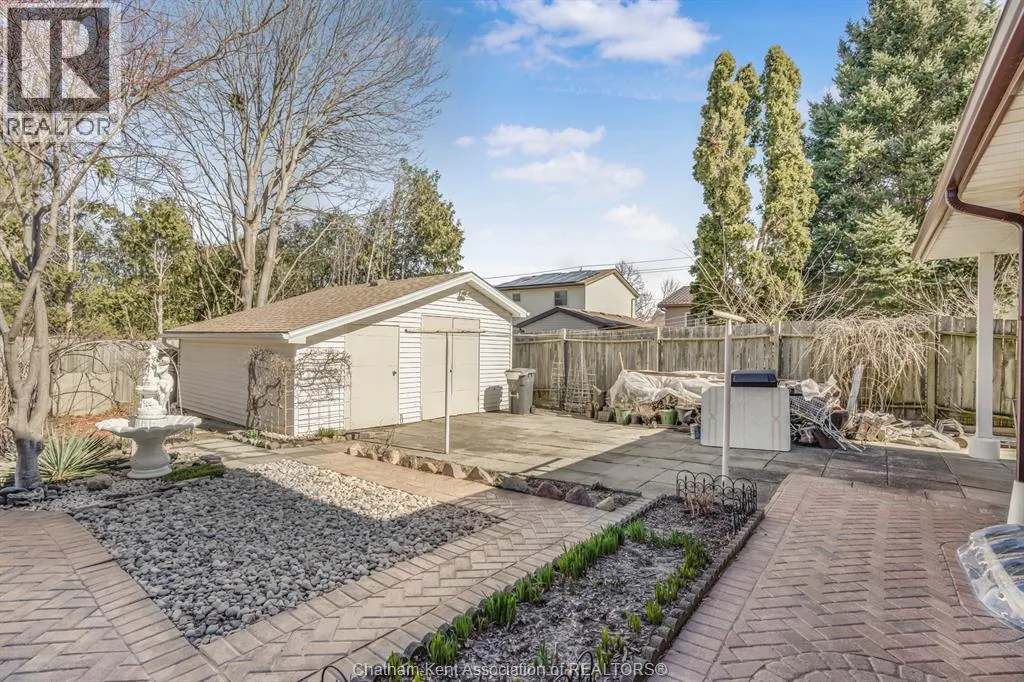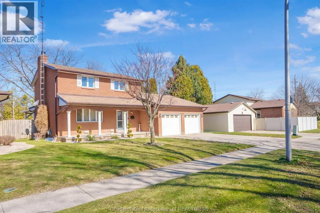 Beautifully maintained custom-built 2-storey home in sought-after North Chatham. This 4-bedroom, 2-bathroom family home offers quality construction, pride of ownership, and move-in ready living in a desirable neighbourhood. Bright and spacious main floor featuring open-concept living, formal dining area, and a well-appointed kitchen with stainless steel appliances, solid wood cabinetry, and excellent layout for entertaining. Patio doors lead to a private, fully landscaped backyard oasis with VERY LARGE covered porch (2021), complete with ceiling fan and pot lighting â perfect for outdoor living, summer nights, and family gatherings. Additional storage outbuildings included. Upper level offers 4 generous bedrooms and an updated full bathroom â ideal for growing families. Fully finished lower level includes a cozy family room with brick fireplace, creating the perfect rec room, media space, or entertaining area. Recent updates include windows and doors (approx. 5 years), furnace, owned hot water tank, fascia, soffits, and leaf guard eaves (2023) â providing peace of mind and low maintenance living. From the flooring, to the walls, this home has been cared for and is ready for new memories. Additional features: hardwood flooring, attached double car garage, double concrete driveway, excellent curb appeal, and ample storage throughout. Located in a family-friendly neighbourhood close to top-rated schools, parks, walking trails, shopping, and amenities. Quick possession available. (id:27476)