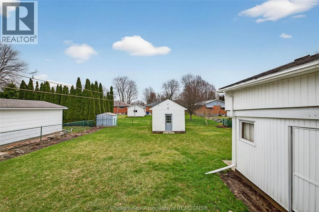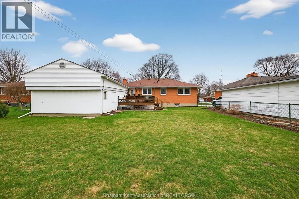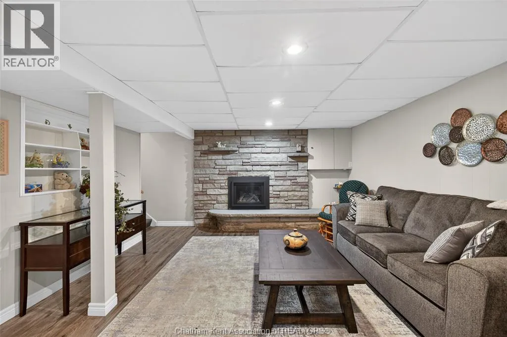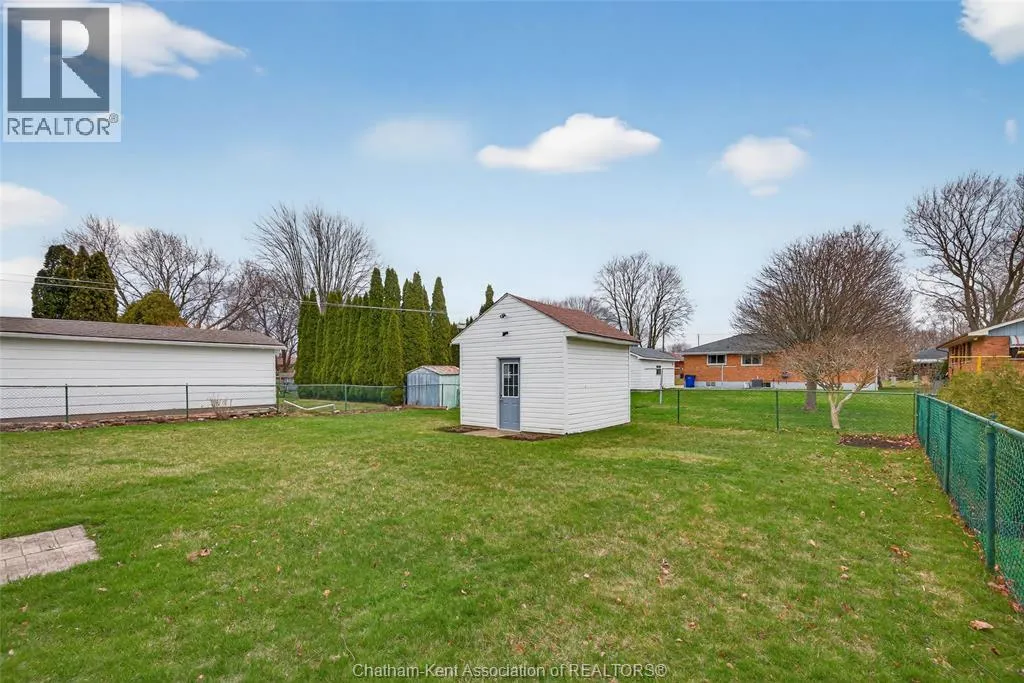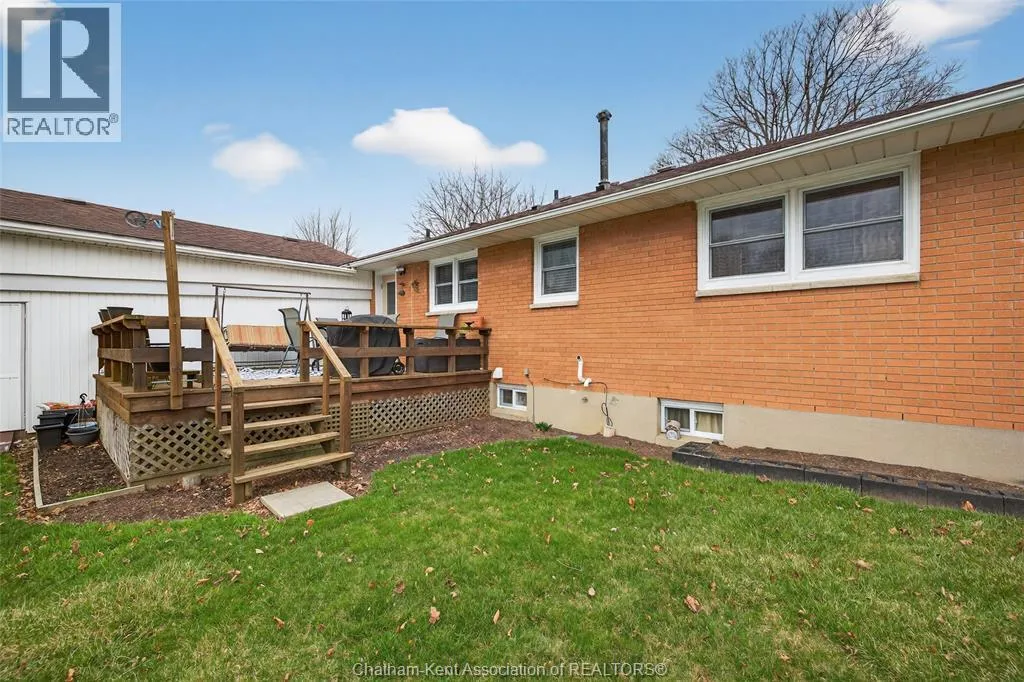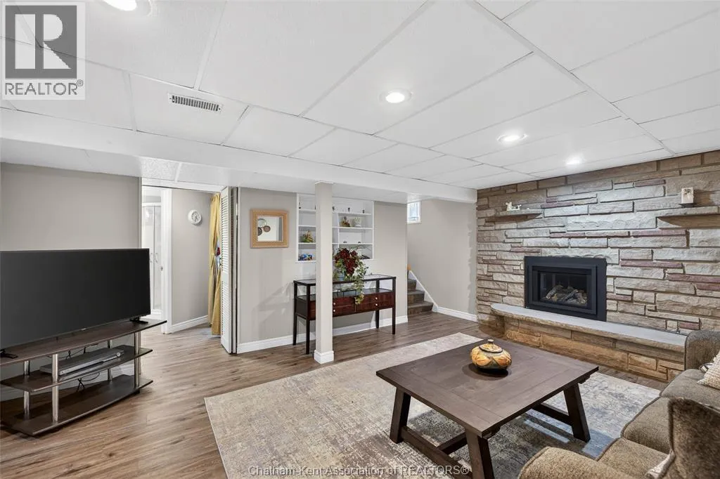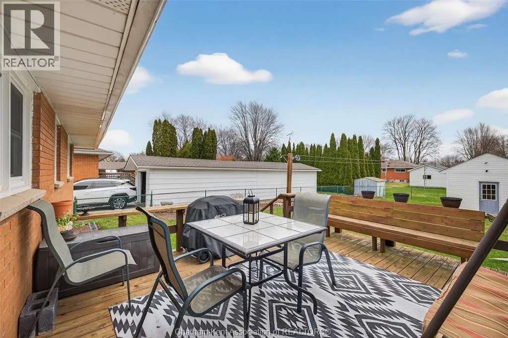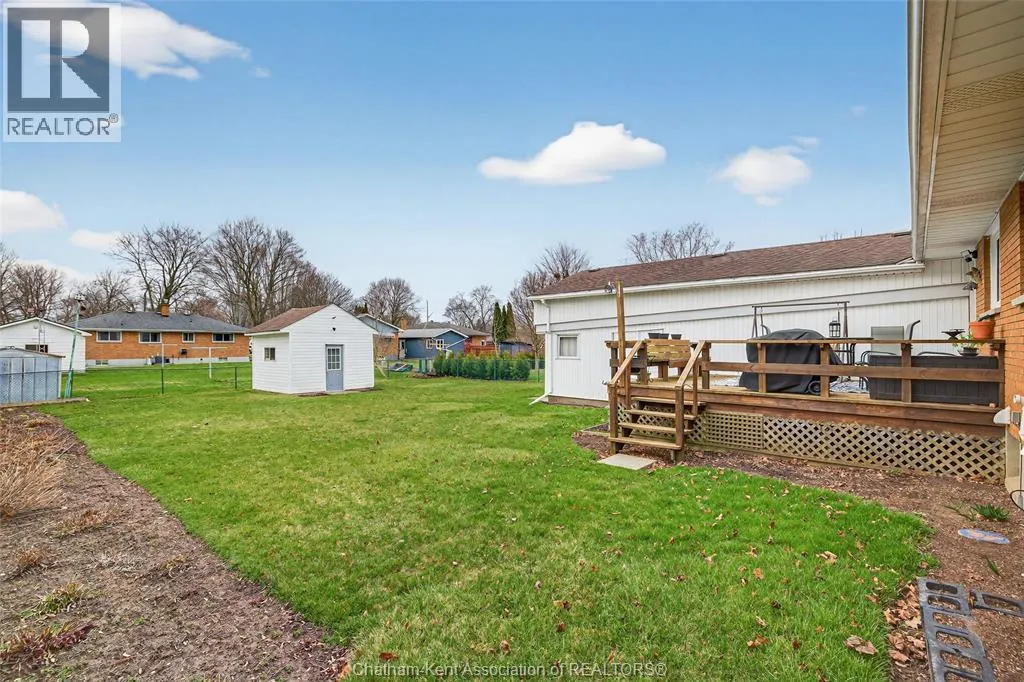 John St to 12 Jupiter Ave Pride of ownership shows throughout this solid brick bungalow in one of Chatham's most established neighbourhoods â 2 main floor bedrooms, hardwood floors, bright living and dining area, and an updated kitchen with painted cabinetry, centre island, pendant lighting, and mudroom entry with patio doors leading to a rear deck overlooking a beautifully maintained backyard. The main floor 4-piece bath is complemented by a fully finished lower level that genuinely impresses â large rec room with stacked-stone gas fireplace, second living area, 2 additional bedrooms, and a 3-piece bath with glass shower. Four bedrooms total with a layout that suits growing families, multi-generational living, or anyone needing extra space. The oversized attached garage offers serious storage and workspace potential, a separate storage shed adds even more utility, and the wide concrete driveway ties together an outdoor package that's as functional as it is attractive. (id:27476)