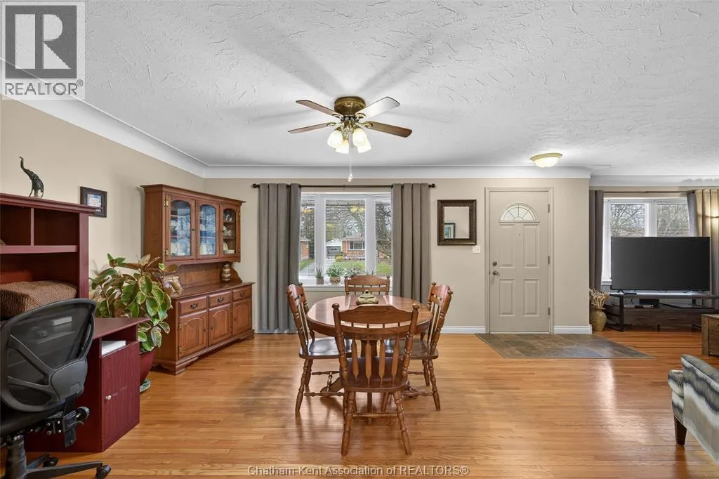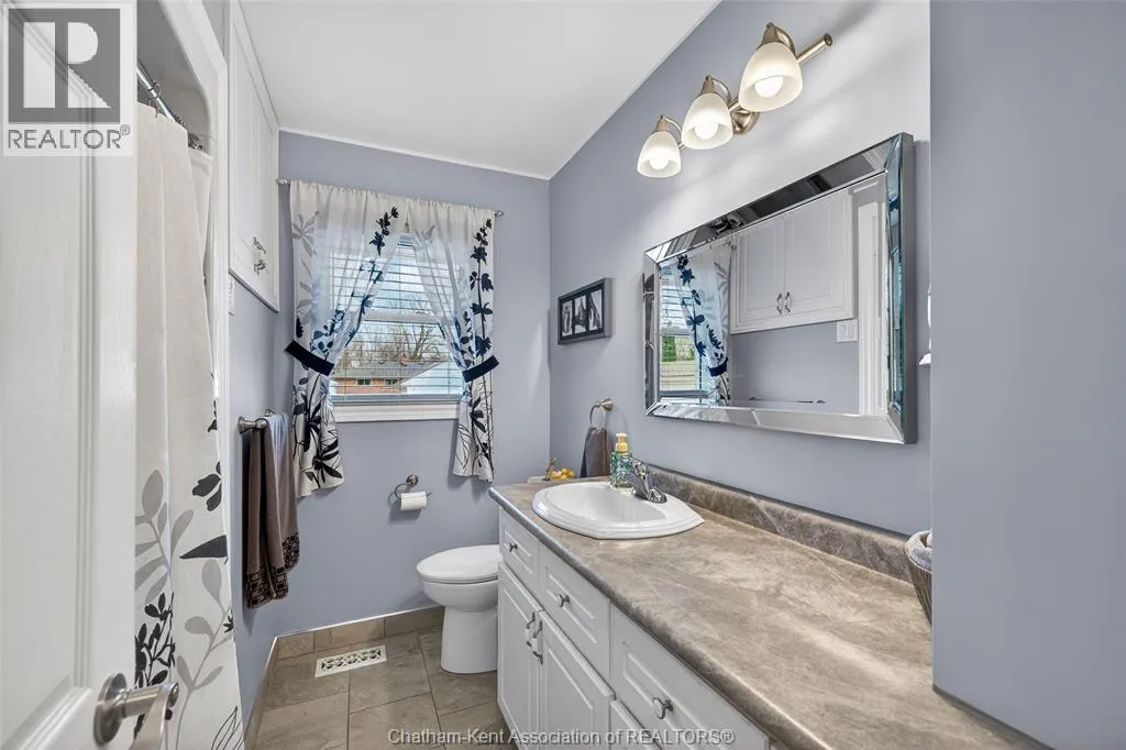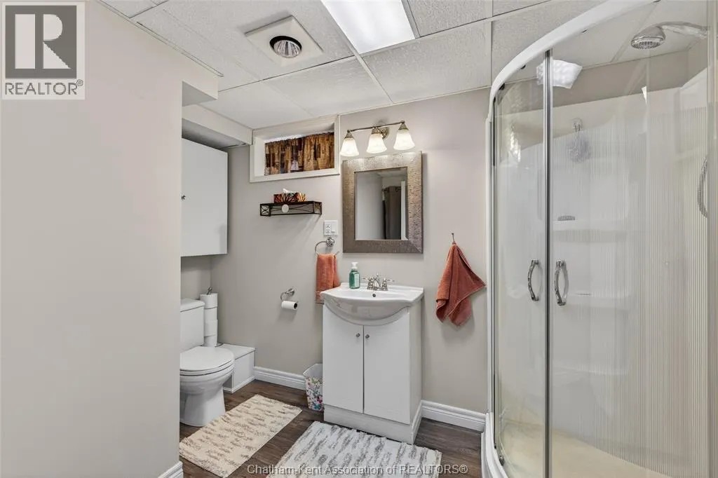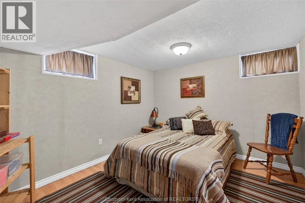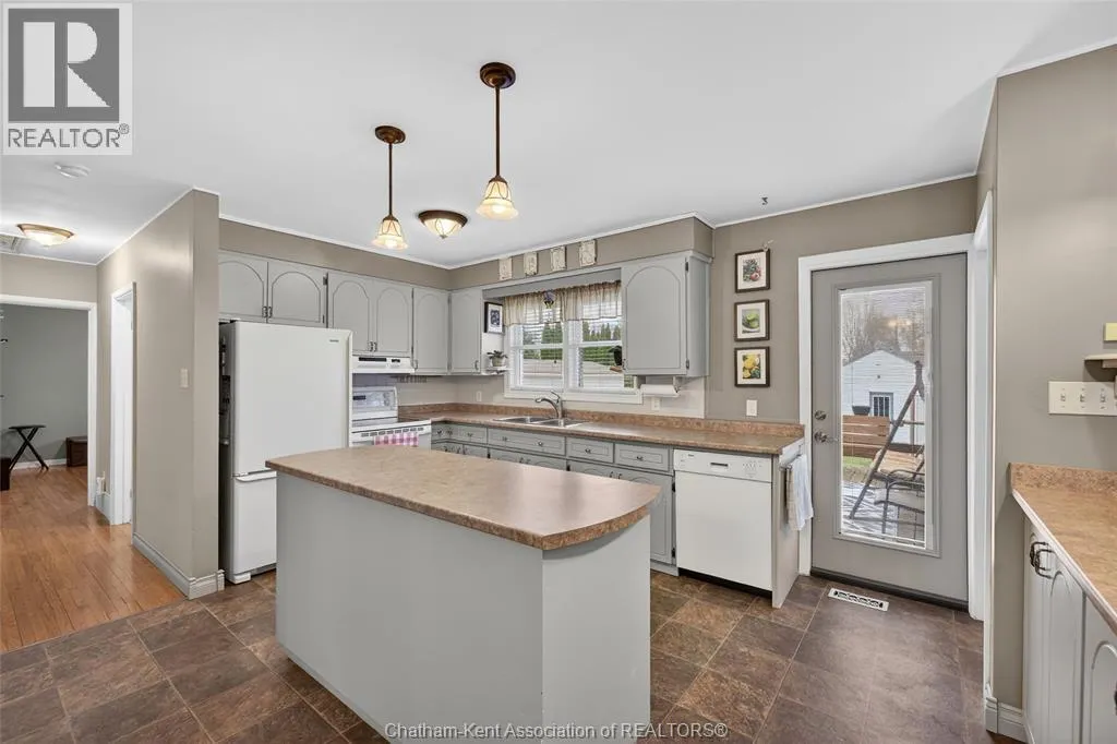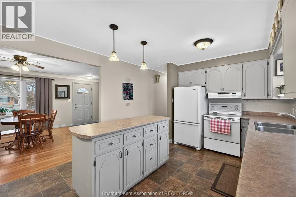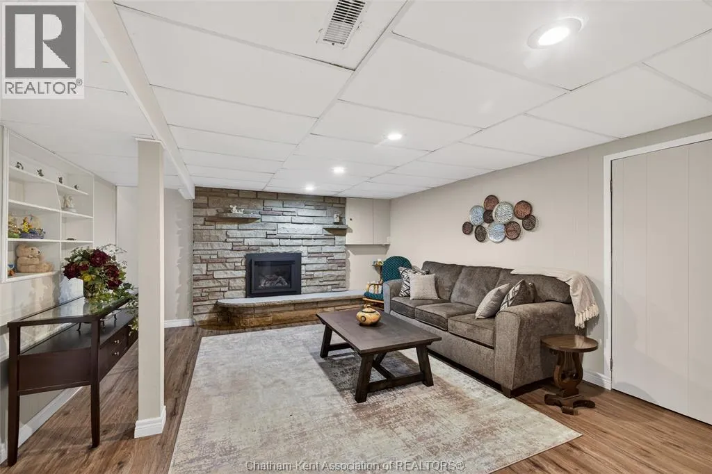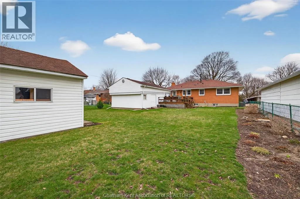 John St to 12 Jupiter Ave Pride of ownership shows throughout this solid brick bungalow in one of Chatham's most established neighbourhoods â 2 main floor bedrooms, hardwood floors, bright living and dining area, and an updated kitchen with painted cabinetry, centre island, pendant lighting, and mudroom entry with patio doors leading to a rear deck overlooking a beautifully maintained backyard. The main floor 4-piece bath is complemented by a fully finished lower level that genuinely impresses â large rec room with stacked-stone gas fireplace, second living area, 2 additional bedrooms, and a 3-piece bath with glass shower. Four bedrooms total with a layout that suits growing families, multi-generational living, or anyone needing extra space. The oversized attached garage offers serious storage and workspace potential, a separate storage shed adds even more utility, and the wide concrete driveway ties together an outdoor package that's as functional as it is attractive. (id:27476)