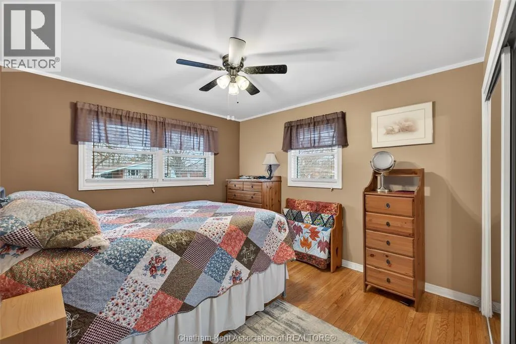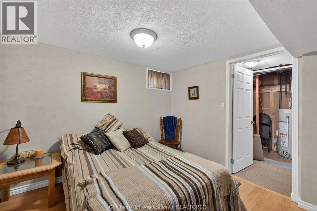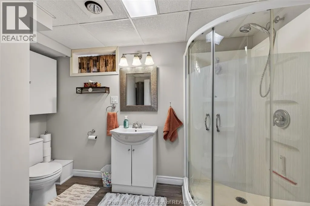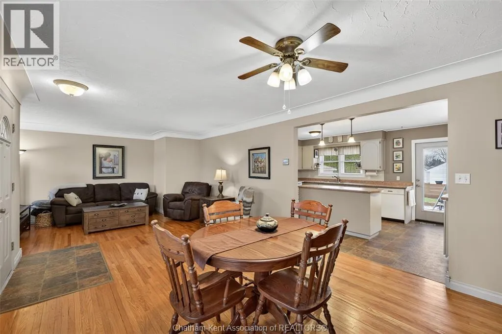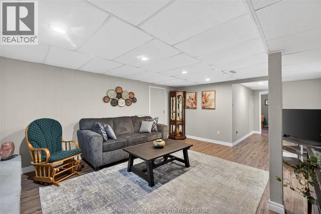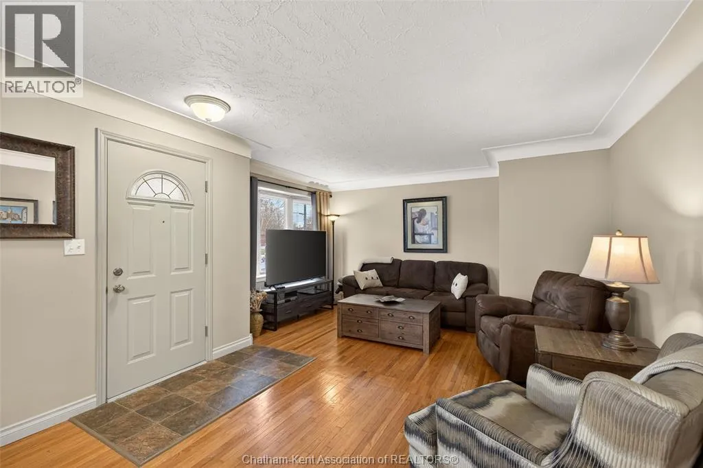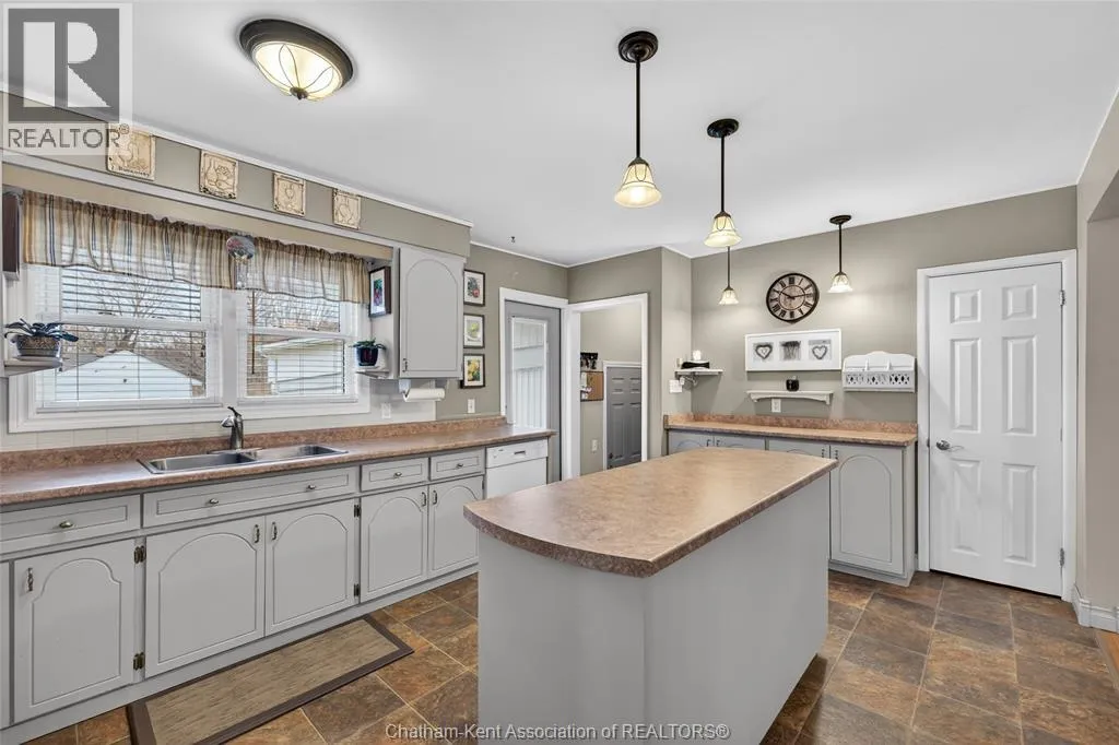 John St to 12 Jupiter Ave Pride of ownership shows throughout this solid brick bungalow in one of Chatham's most established neighbourhoods â 2 main floor bedrooms, hardwood floors, bright living and dining area, and an updated kitchen with painted cabinetry, centre island, pendant lighting, and mudroom entry with patio doors leading to a rear deck overlooking a beautifully maintained backyard. The main floor 4-piece bath is complemented by a fully finished lower level that genuinely impresses â large rec room with stacked-stone gas fireplace, second living area, 2 additional bedrooms, and a 3-piece bath with glass shower. Four bedrooms total with a layout that suits growing families, multi-generational living, or anyone needing extra space. The oversized attached garage offers serious storage and workspace potential, a separate storage shed adds even more utility, and the wide concrete driveway ties together an outdoor package that's as functional as it is attractive. (id:27476)
