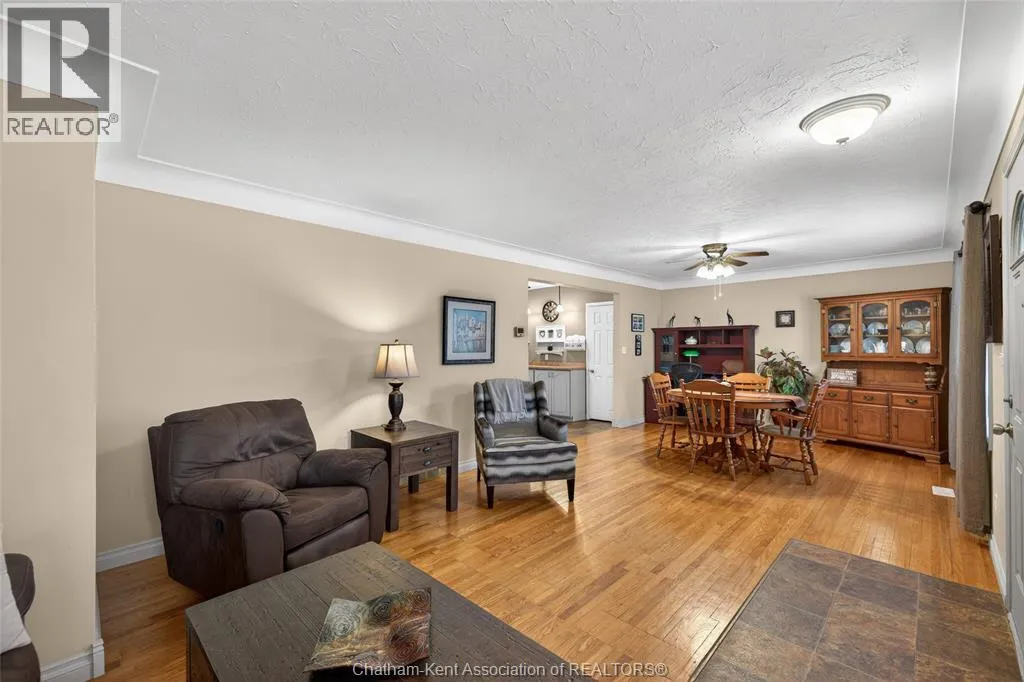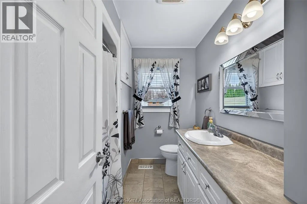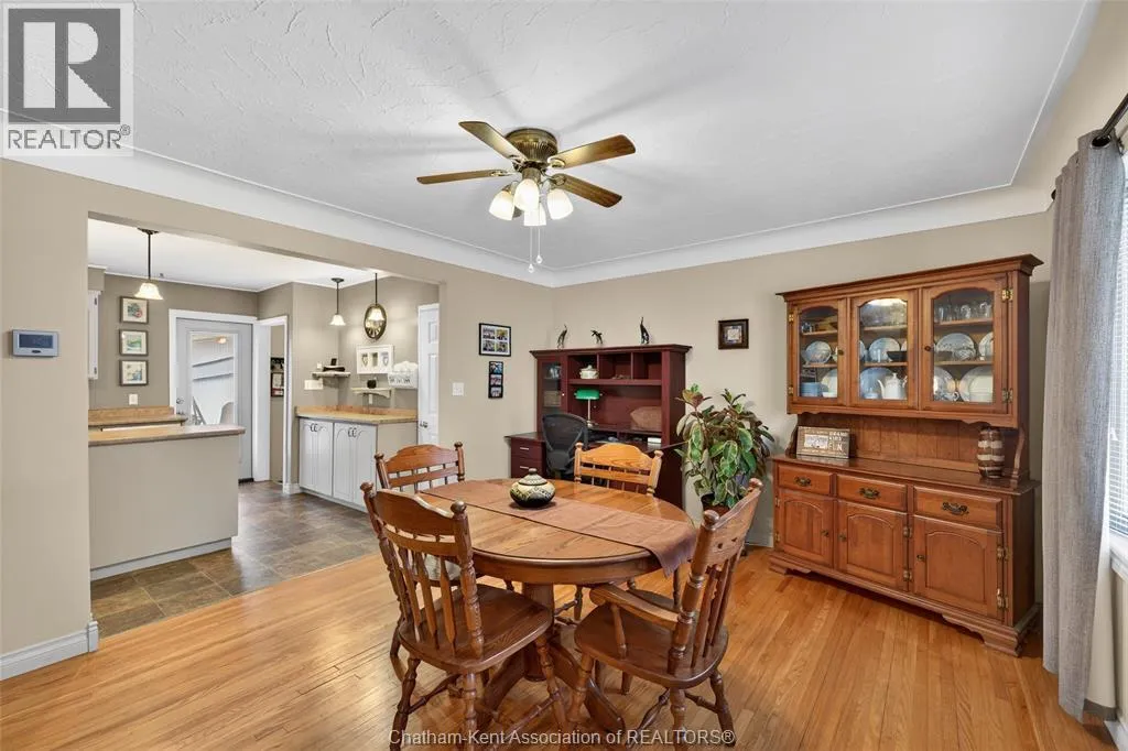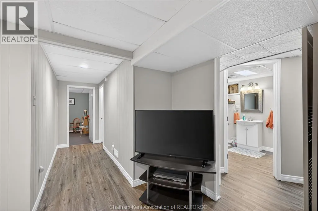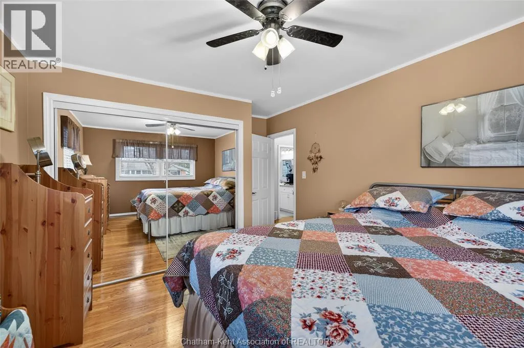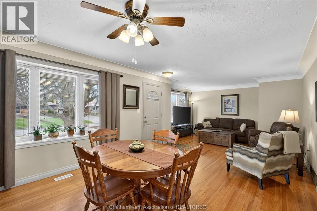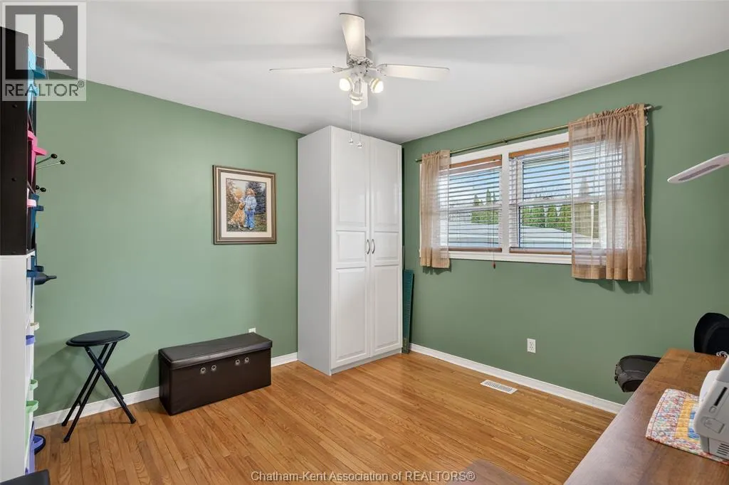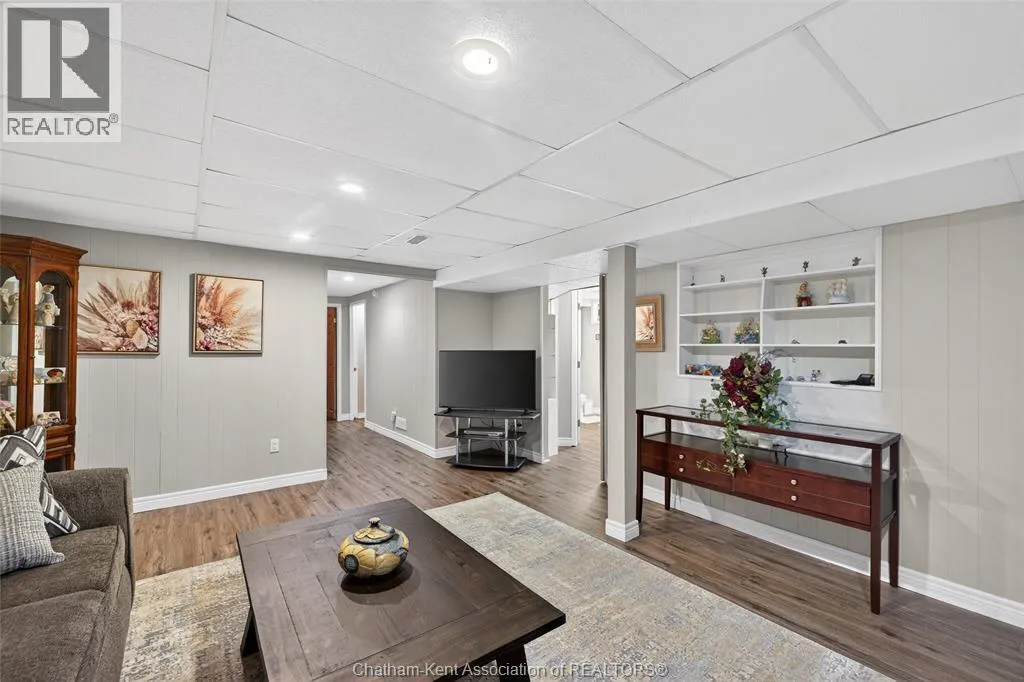 John St to 12 Jupiter Ave Pride of ownership shows throughout this solid brick bungalow in one of Chatham's most established neighbourhoods â 2 main floor bedrooms, hardwood floors, bright living and dining area, and an updated kitchen with painted cabinetry, centre island, pendant lighting, and mudroom entry with patio doors leading to a rear deck overlooking a beautifully maintained backyard. The main floor 4-piece bath is complemented by a fully finished lower level that genuinely impresses â large rec room with stacked-stone gas fireplace, second living area, 2 additional bedrooms, and a 3-piece bath with glass shower. Four bedrooms total with a layout that suits growing families, multi-generational living, or anyone needing extra space. The oversized attached garage offers serious storage and workspace potential, a separate storage shed adds even more utility, and the wide concrete driveway ties together an outdoor package that's as functional as it is attractive. (id:27476)