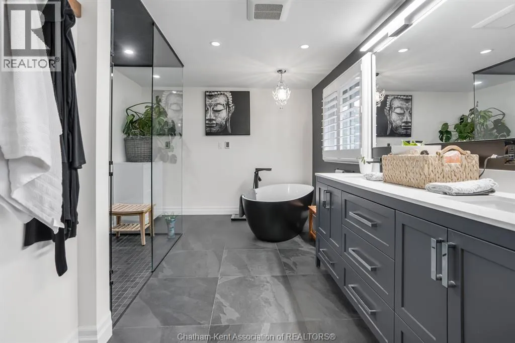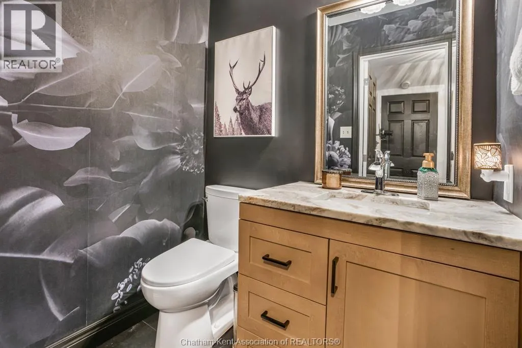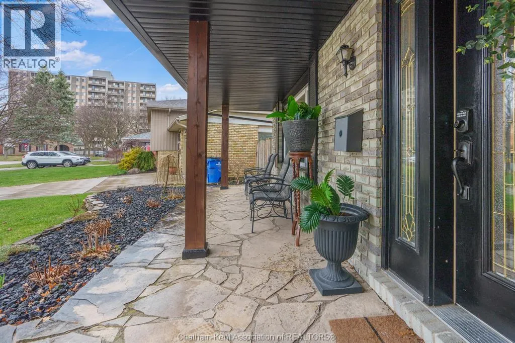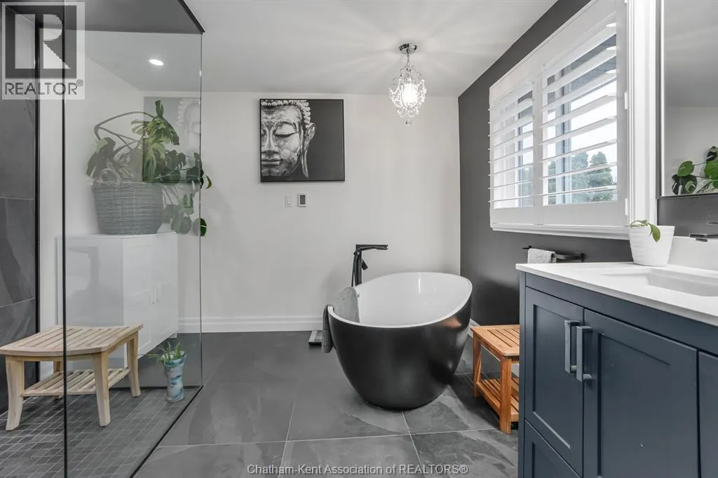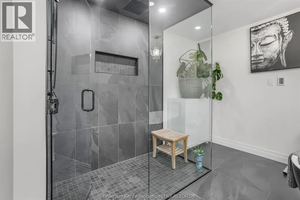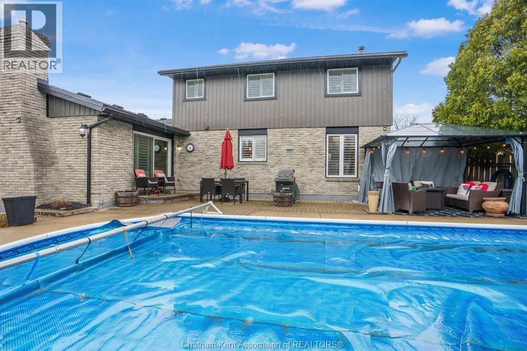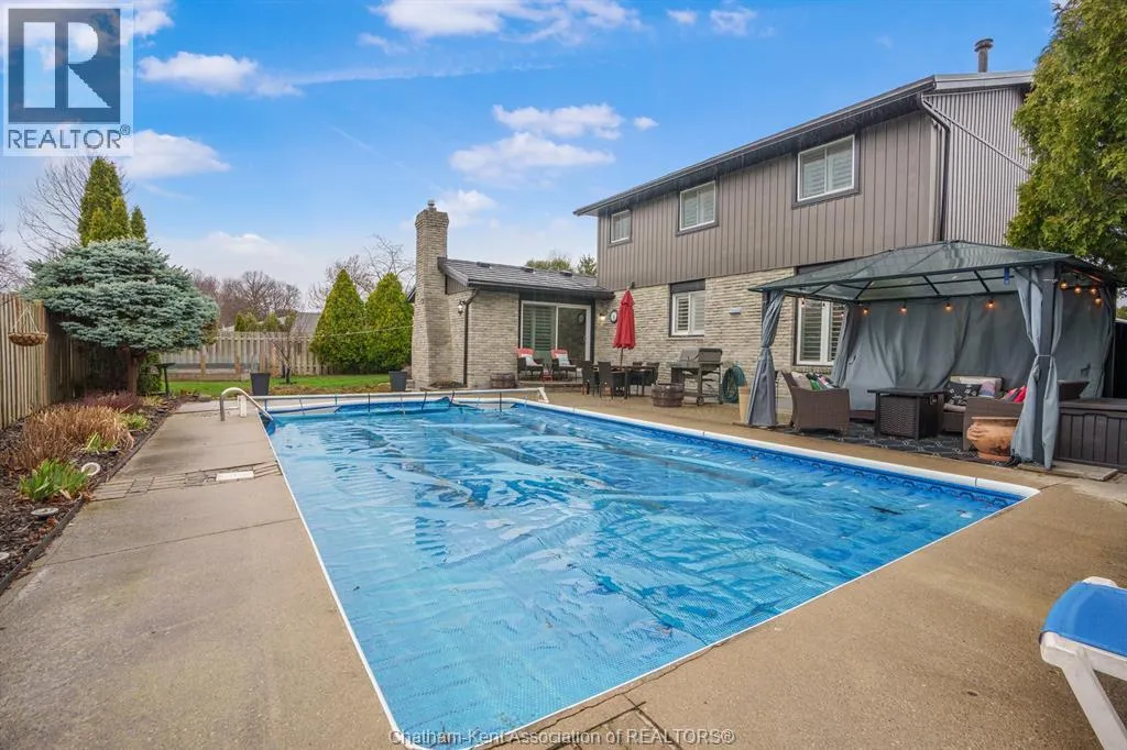 Welcome to this beautifully updated and truly turn-key two-storey home on Chathamâs desirable north sideâwhere thoughtful upgrades meet everyday comfort and backyard luxury. This inviting family home features 3 spacious bedrooms on the upper level and 2 well-appointed bathrooms, including a stunning, fully renovated main bath showcasing heated Italian tile flooring, a heated custom glass shower with dual heads (including rainfall), a soaker tub, and a solid wood vanity topped with quartz and double sinksâyour own private retreat. The main floor offers a warm and functional layout, highlighted by a cozy gas fireplace, updated powder room with a custom wood vanity and granite countertop, and modern finishes throughout. Recent upgrades within the past five years include a steel roof, siding, insulation, fascia, soffits, downspouts, front bay window, and garage improvementsâproviding peace of mind and long-term value. Downstairs, the fully finished basement expands your living space with a rec room WITH PROPER EGRESS WINDOW, den (currently used as a home gym), additional shower, new carpetâperfect for guests or growing families. Step outside to your private backyard oasis featuring an in-ground pool with heater, updated pool systems, a charming gazebo, and a custom cedar privacy wallâideal for entertaining or relaxing all summer long. Eavestrough covers add to the homeâs low-maintenance appeal. With updated flooring throughout, solid wood interior doors, and meticulous care evident at every turn, this home blends style, comfort, and functionality in one exceptional package. A rare opportunity to own a move-in-ready home in a sought-after neighbourhoodâdonât miss it. (id:27476)