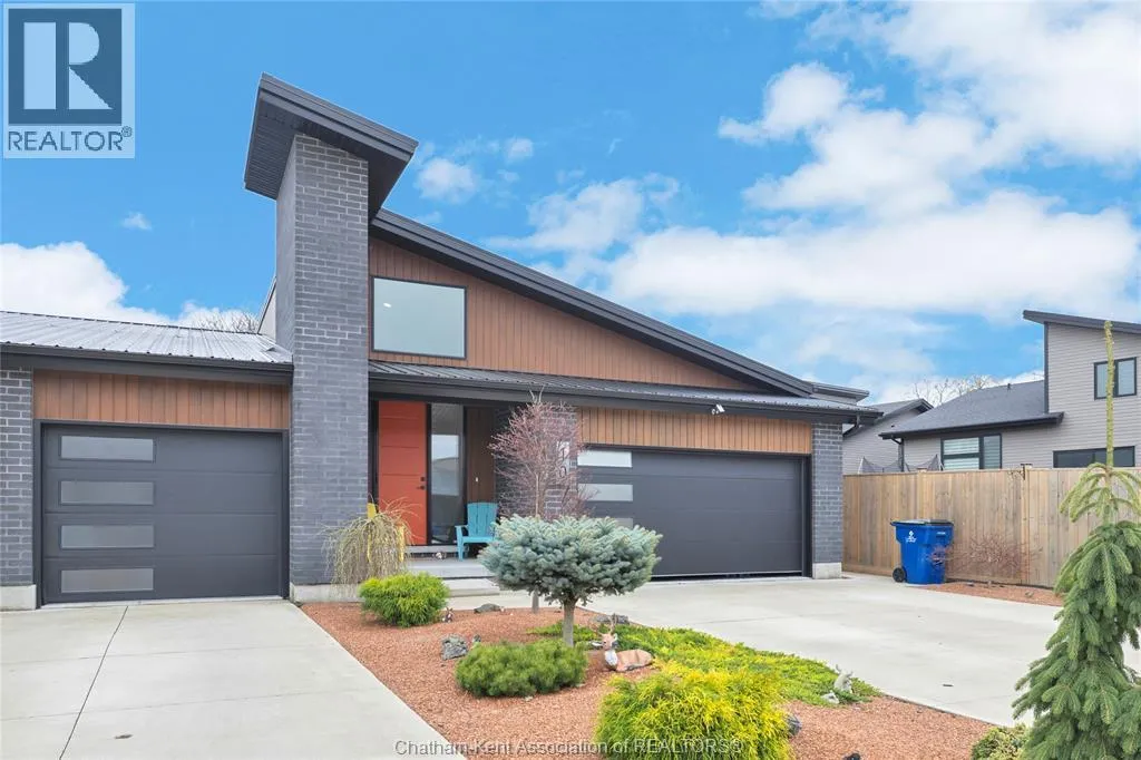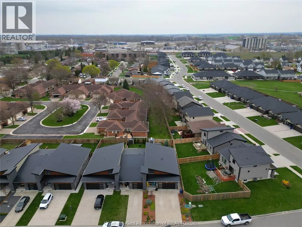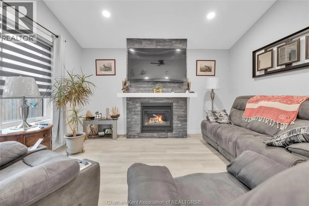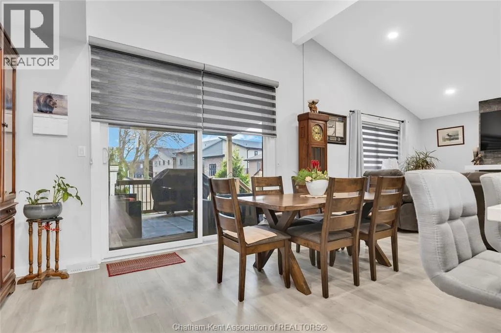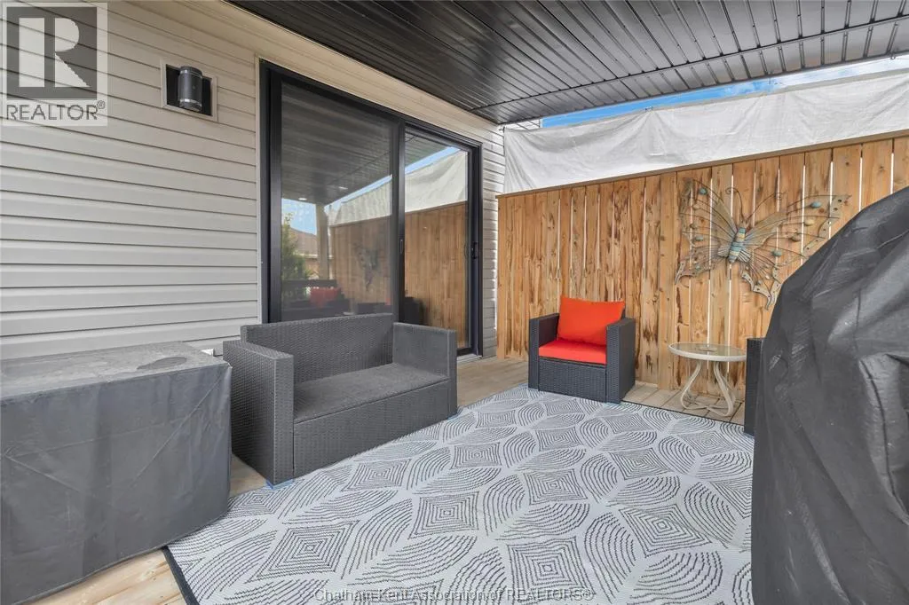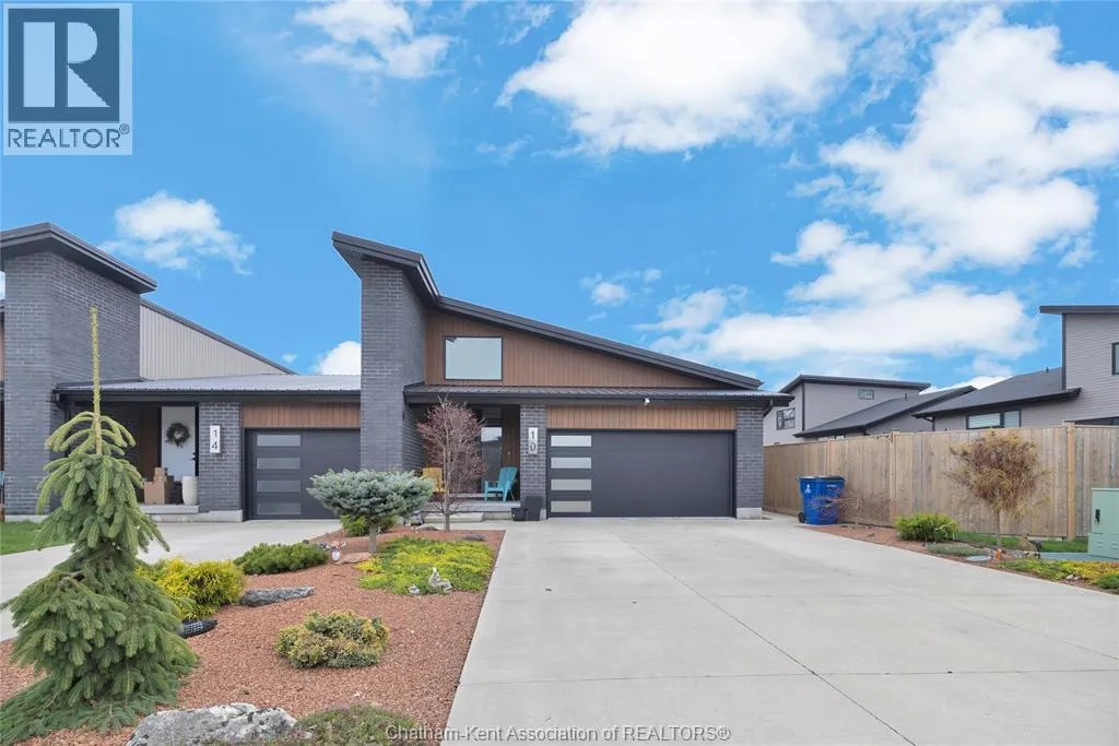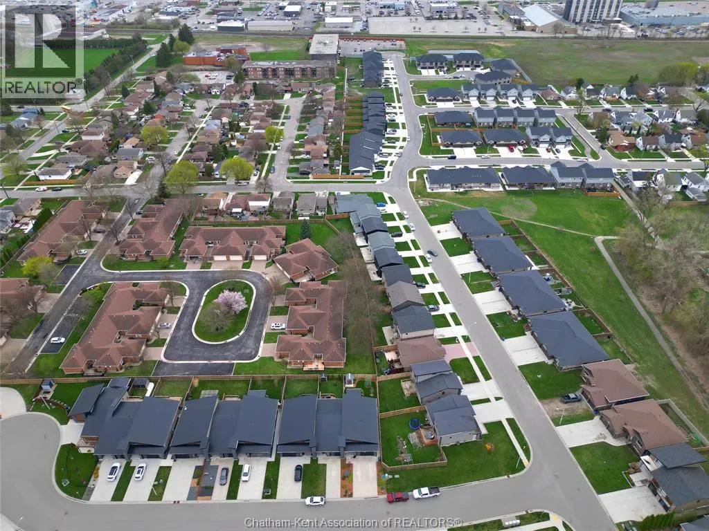 Impressive from the moment you arrive, this beautifully upgraded end-unit townhouse offers style, function, and standout value on a quiet cul-de-sac. Built in 2020, the home features over 1,800 sq ft of finished living space, striking architecture, double concrete drive, attached double garage and soaring 16-foot vaulted ceilings that create a bright, open feel throughout. Ideal for buyers looking for main floor living, the layout includes a spacious primary bedroom with a 3-piece ensuite, a 2-piece guest bath, and minimal steps to enter, while the finished lower level adds two more bedrooms, a full 4-piece bathroom, a large family room, and utility space. Loaded with thoughtful extras, this home offers 200 amp service, gas stove and dryer hookups, a custom pantry door, custom electric blinds throughout the main floor, tinted south-facing windows to help block intense sunlight, and a newly installed quartz island countertop. The heated garage adds even more convenience with a new garage door opener, air exhaust system, and side door access to the backyard. Outside, enjoy excellent curb appeal, professional landscaping front and back, a fully fenced yard, a wood deck off the dining room, a shed with new poured concrete, and a concrete walkway from the front of the home to the backyard. Even better, the front yard is fully owned and not shared like many other units. Walking distance to a public school and offering the added privacy of end-unit living, this is a standout opportunity in Chatham. (id:27476)