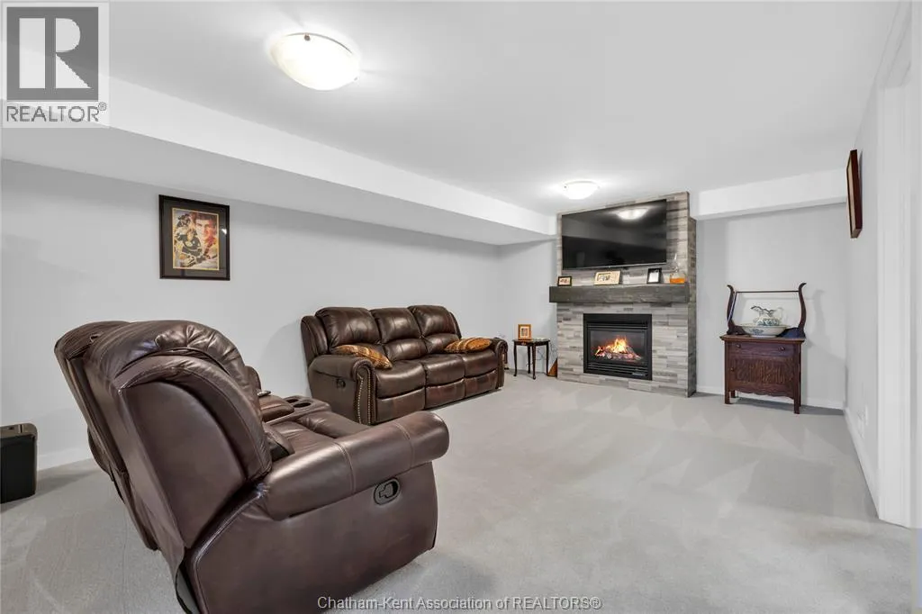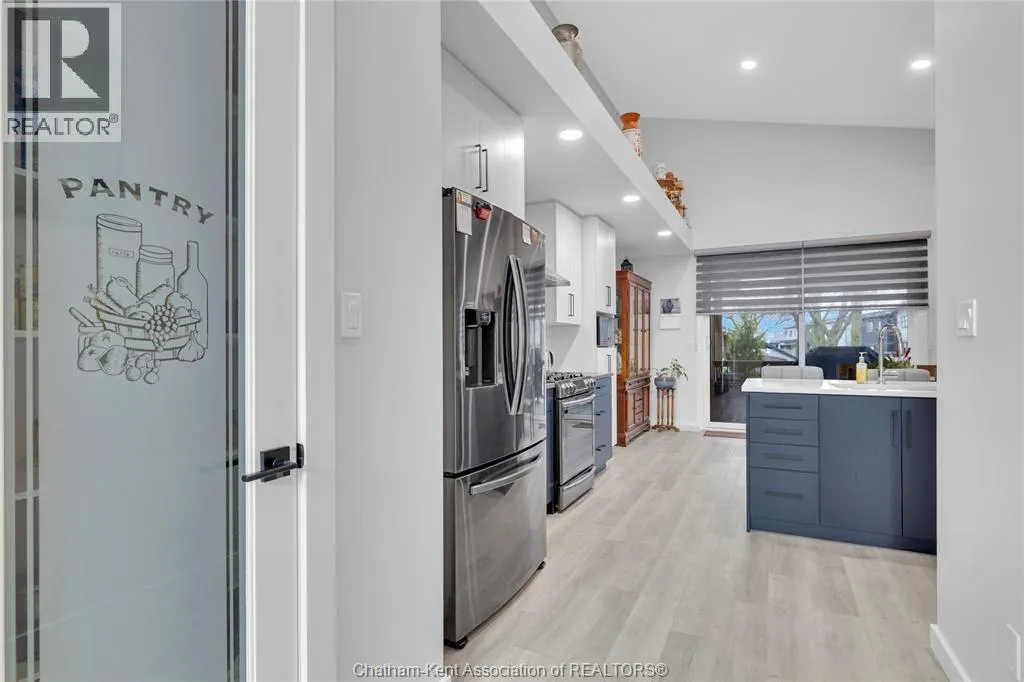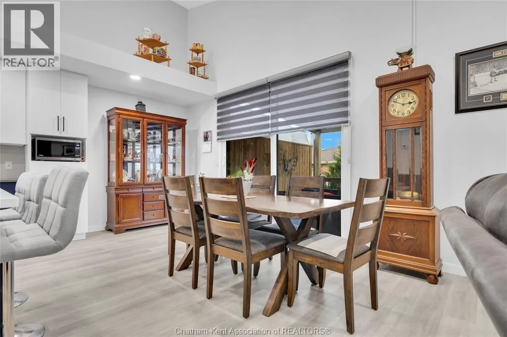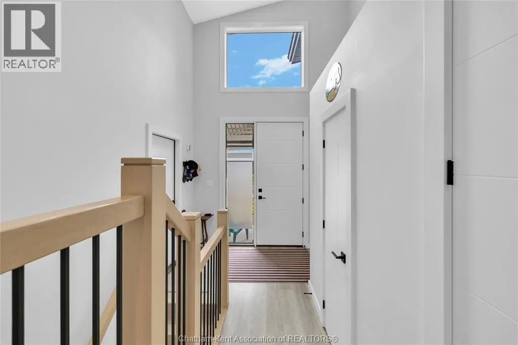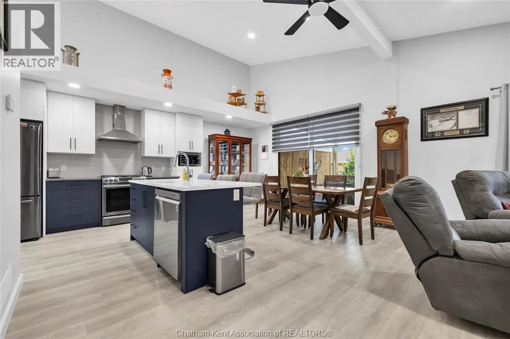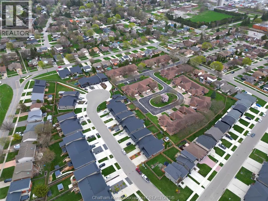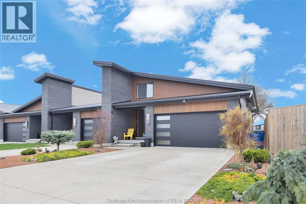 Impressive from the moment you arrive, this beautifully upgraded end-unit townhouse offers style, function, and standout value on a quiet cul-de-sac. Built in 2020, the home features over 1,800 sq ft of finished living space, striking architecture, double concrete drive, attached double garage and soaring 16-foot vaulted ceilings that create a bright, open feel throughout. Ideal for buyers looking for main floor living, the layout includes a spacious primary bedroom with a 3-piece ensuite, a 2-piece guest bath, and minimal steps to enter, while the finished lower level adds two more bedrooms, a full 4-piece bathroom, a large family room, and utility space. Loaded with thoughtful extras, this home offers 200 amp service, gas stove and dryer hookups, a custom pantry door, custom electric blinds throughout the main floor, tinted south-facing windows to help block intense sunlight, and a newly installed quartz island countertop. The heated garage adds even more convenience with a new garage door opener, air exhaust system, and side door access to the backyard. Outside, enjoy excellent curb appeal, professional landscaping front and back, a fully fenced yard, a wood deck off the dining room, a shed with new poured concrete, and a concrete walkway from the front of the home to the backyard. Even better, the front yard is fully owned and not shared like many other units. Walking distance to a public school and offering the added privacy of end-unit living, this is a standout opportunity in Chatham. (id:27476)