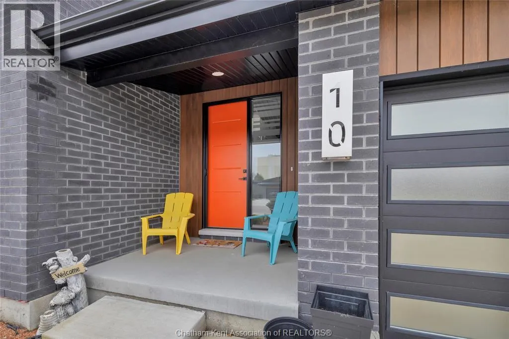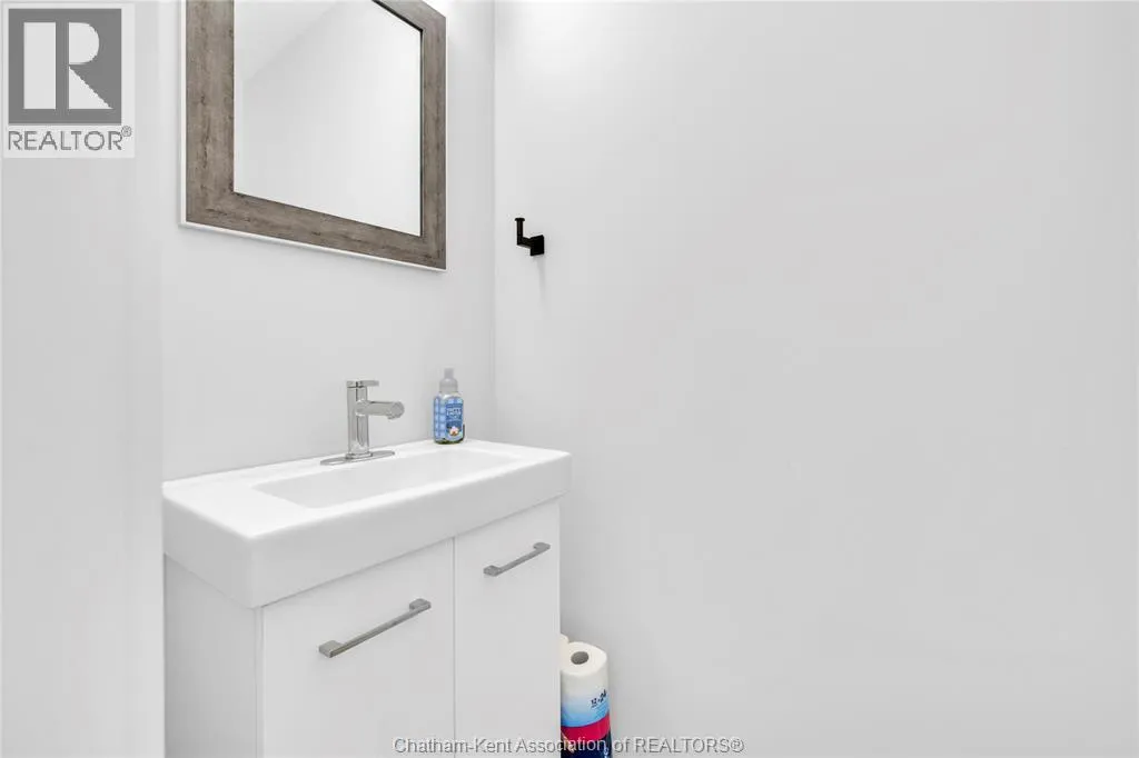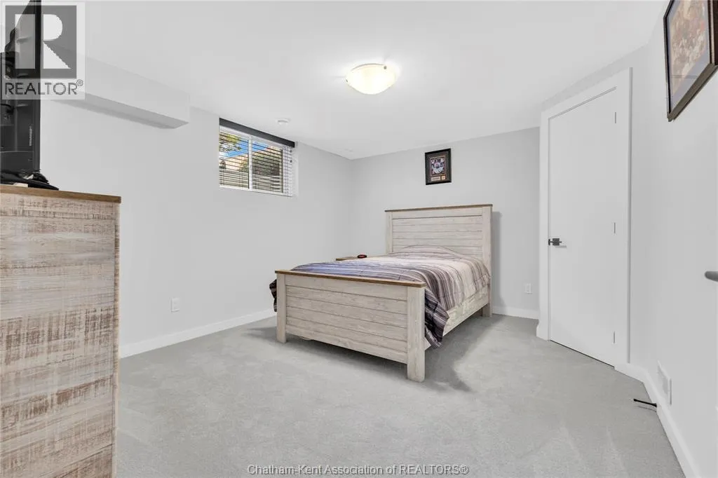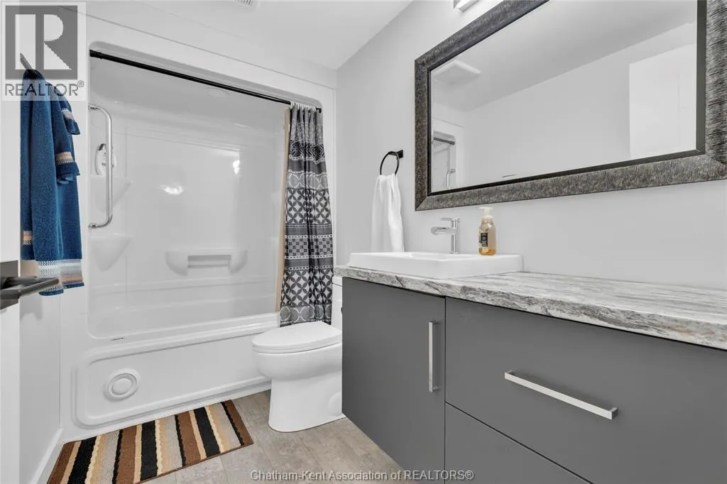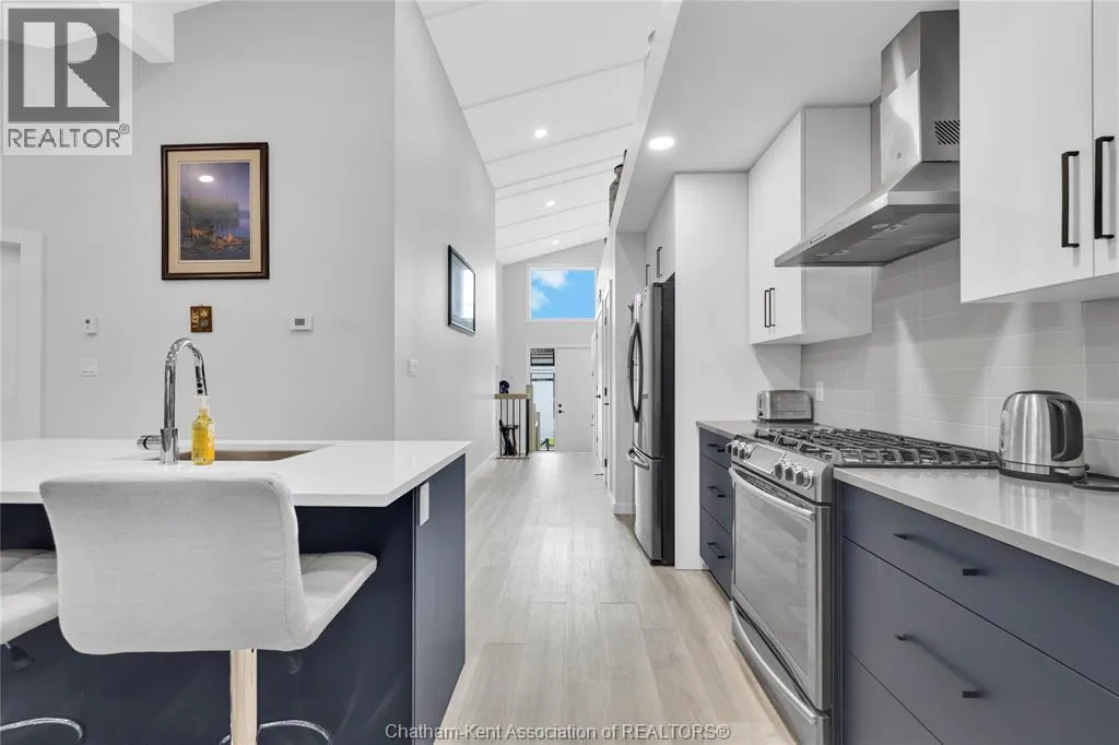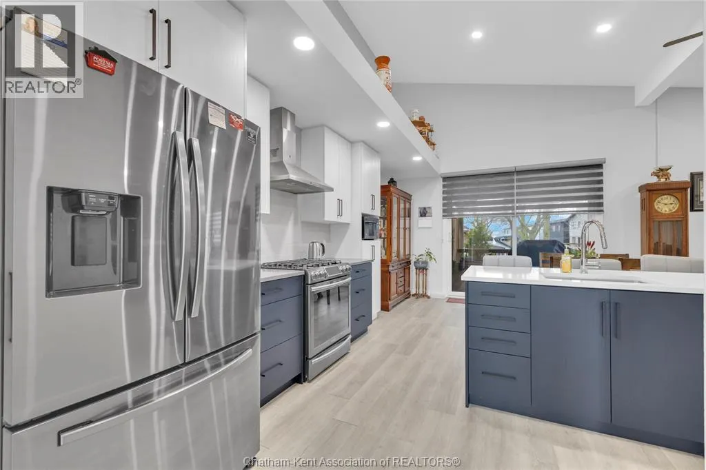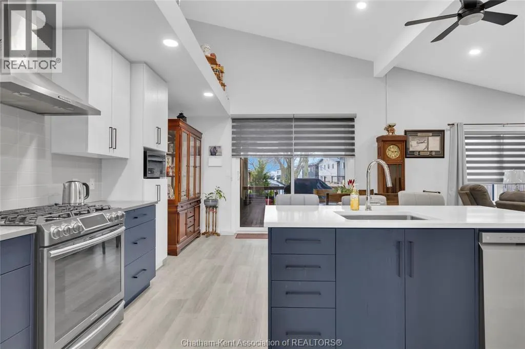 Impressive from the moment you arrive, this beautifully upgraded end-unit townhouse offers style, function, and standout value on a quiet cul-de-sac. Built in 2020, the home features over 1,800 sq ft of finished living space, striking architecture, double concrete drive, attached double garage and soaring 16-foot vaulted ceilings that create a bright, open feel throughout. Ideal for buyers looking for main floor living, the layout includes a spacious primary bedroom with a 3-piece ensuite, a 2-piece guest bath, and minimal steps to enter, while the finished lower level adds two more bedrooms, a full 4-piece bathroom, a large family room, and utility space. Loaded with thoughtful extras, this home offers 200 amp service, gas stove and dryer hookups, a custom pantry door, custom electric blinds throughout the main floor, tinted south-facing windows to help block intense sunlight, and a newly installed quartz island countertop. The heated garage adds even more convenience with a new garage door opener, air exhaust system, and side door access to the backyard. Outside, enjoy excellent curb appeal, professional landscaping front and back, a fully fenced yard, a wood deck off the dining room, a shed with new poured concrete, and a concrete walkway from the front of the home to the backyard. Even better, the front yard is fully owned and not shared like many other units. Walking distance to a public school and offering the added privacy of end-unit living, this is a standout opportunity in Chatham. (id:27476)