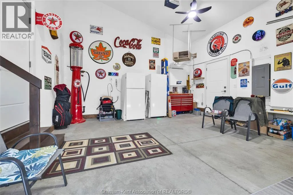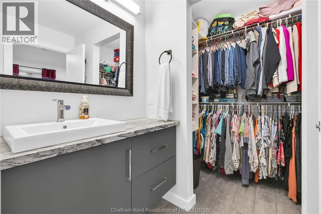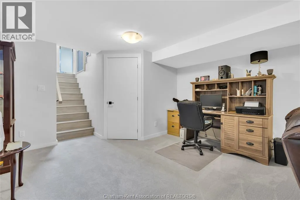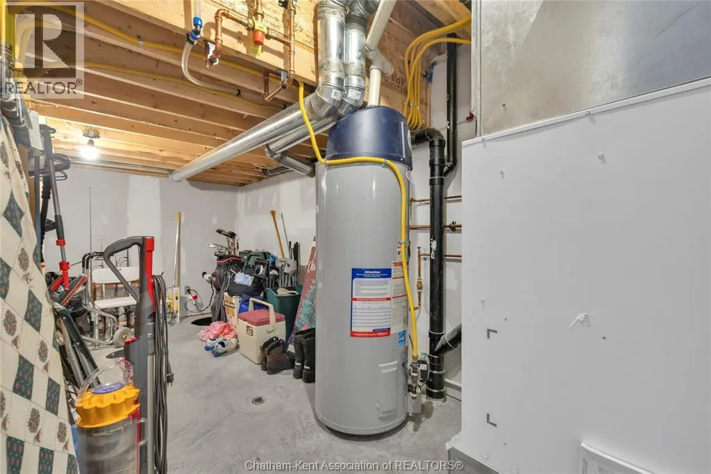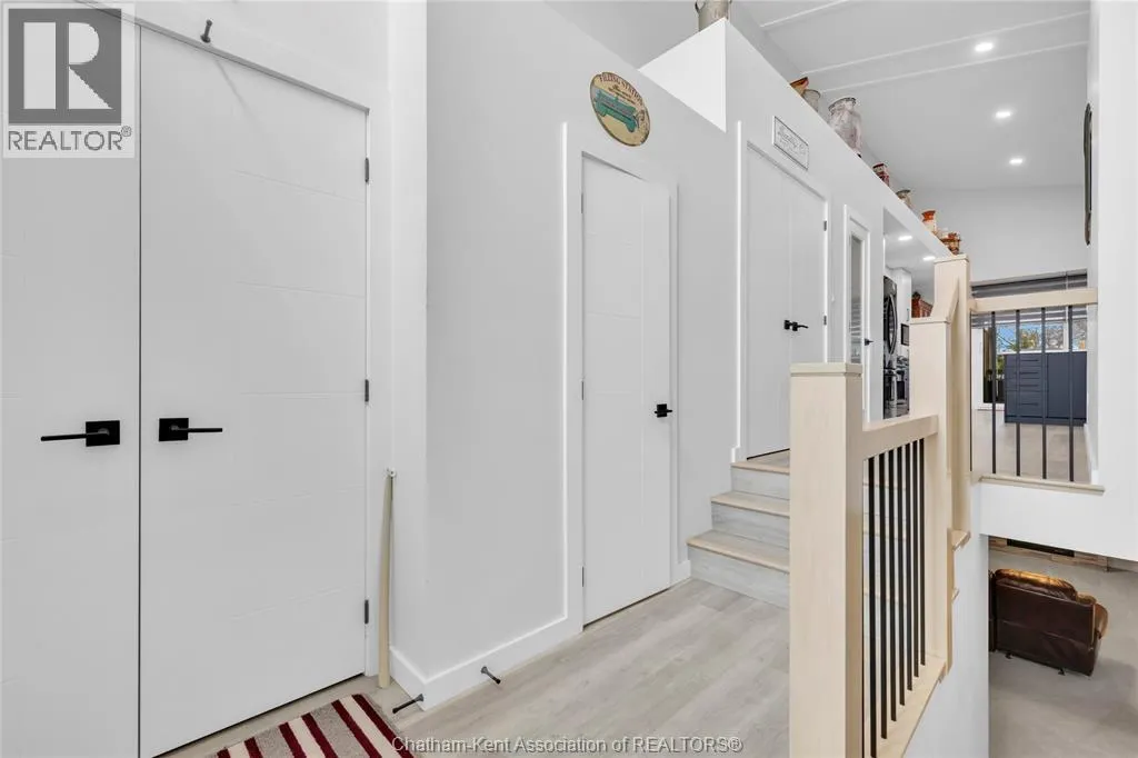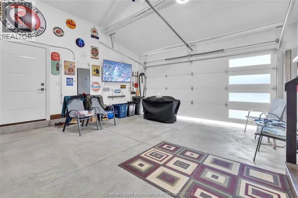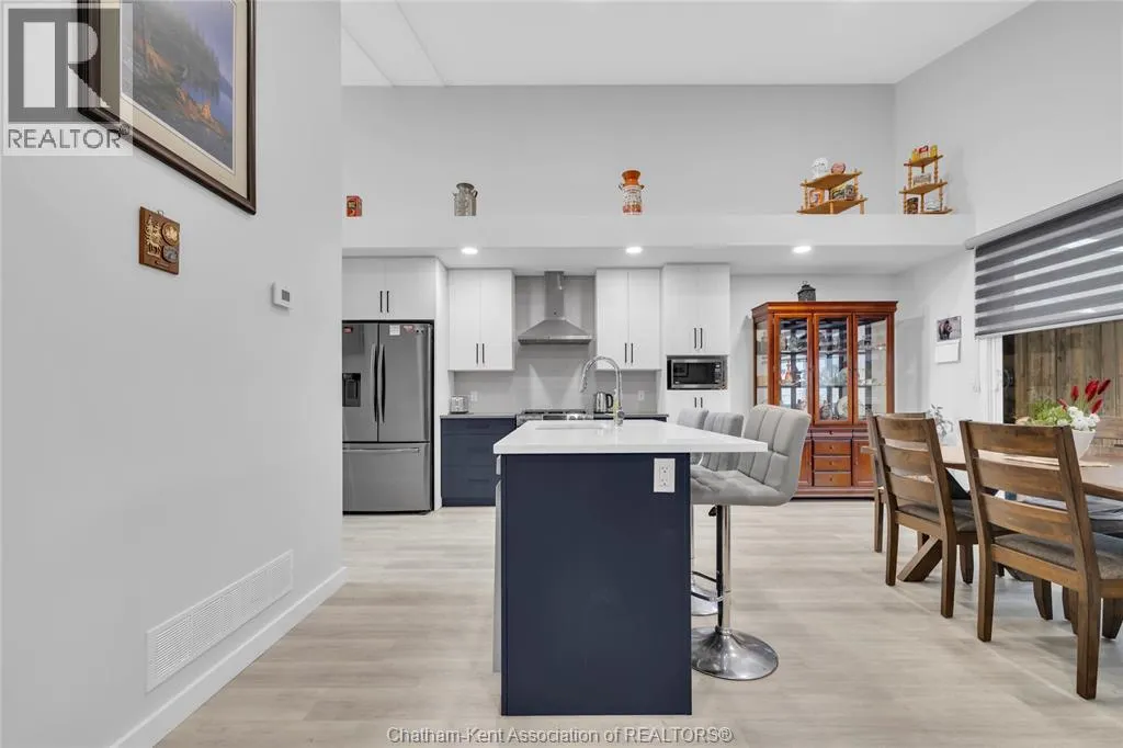 Impressive from the moment you arrive, this beautifully upgraded end-unit townhouse offers style, function, and standout value on a quiet cul-de-sac. Built in 2020, the home features over 1,800 sq ft of finished living space, striking architecture, double concrete drive, attached double garage and soaring 16-foot vaulted ceilings that create a bright, open feel throughout. Ideal for buyers looking for main floor living, the layout includes a spacious primary bedroom with a 3-piece ensuite, a 2-piece guest bath, and minimal steps to enter, while the finished lower level adds two more bedrooms, a full 4-piece bathroom, a large family room, and utility space. Loaded with thoughtful extras, this home offers 200 amp service, gas stove and dryer hookups, a custom pantry door, custom electric blinds throughout the main floor, tinted south-facing windows to help block intense sunlight, and a newly installed quartz island countertop. The heated garage adds even more convenience with a new garage door opener, air exhaust system, and side door access to the backyard. Outside, enjoy excellent curb appeal, professional landscaping front and back, a fully fenced yard, a wood deck off the dining room, a shed with new poured concrete, and a concrete walkway from the front of the home to the backyard. Even better, the front yard is fully owned and not shared like many other units. Walking distance to a public school and offering the added privacy of end-unit living, this is a standout opportunity in Chatham. (id:27476)