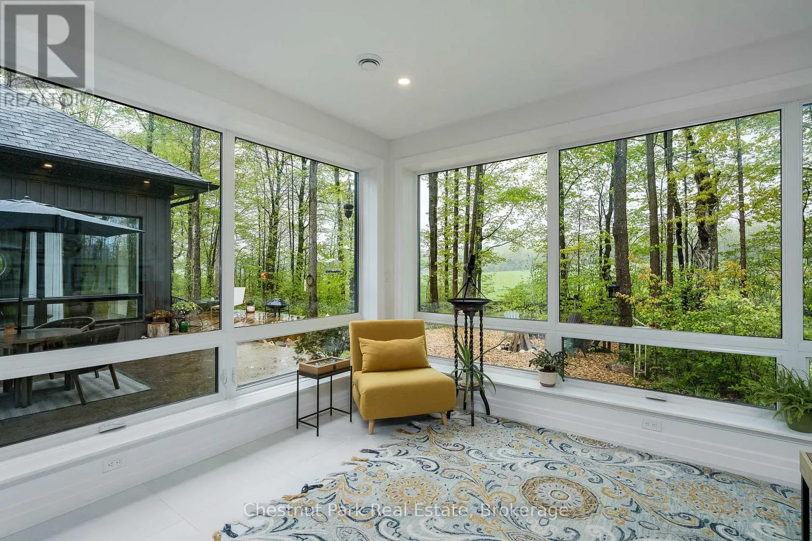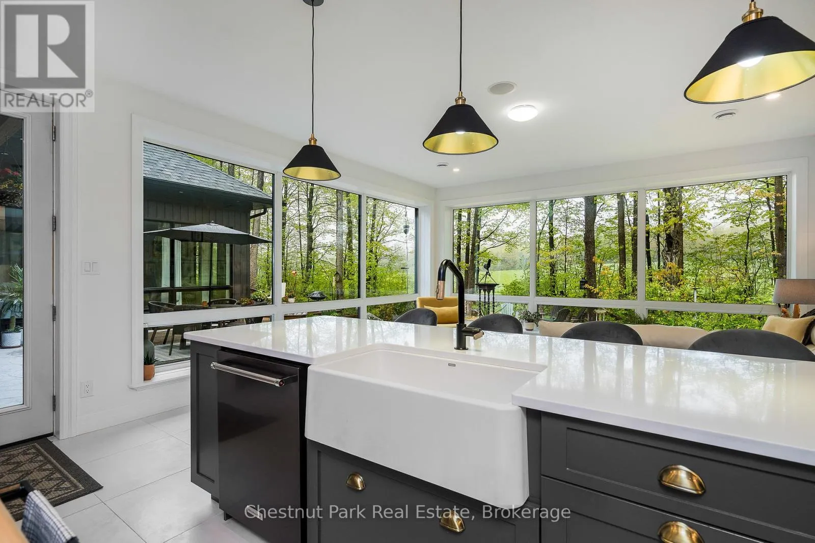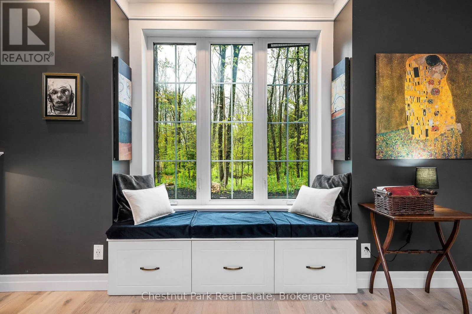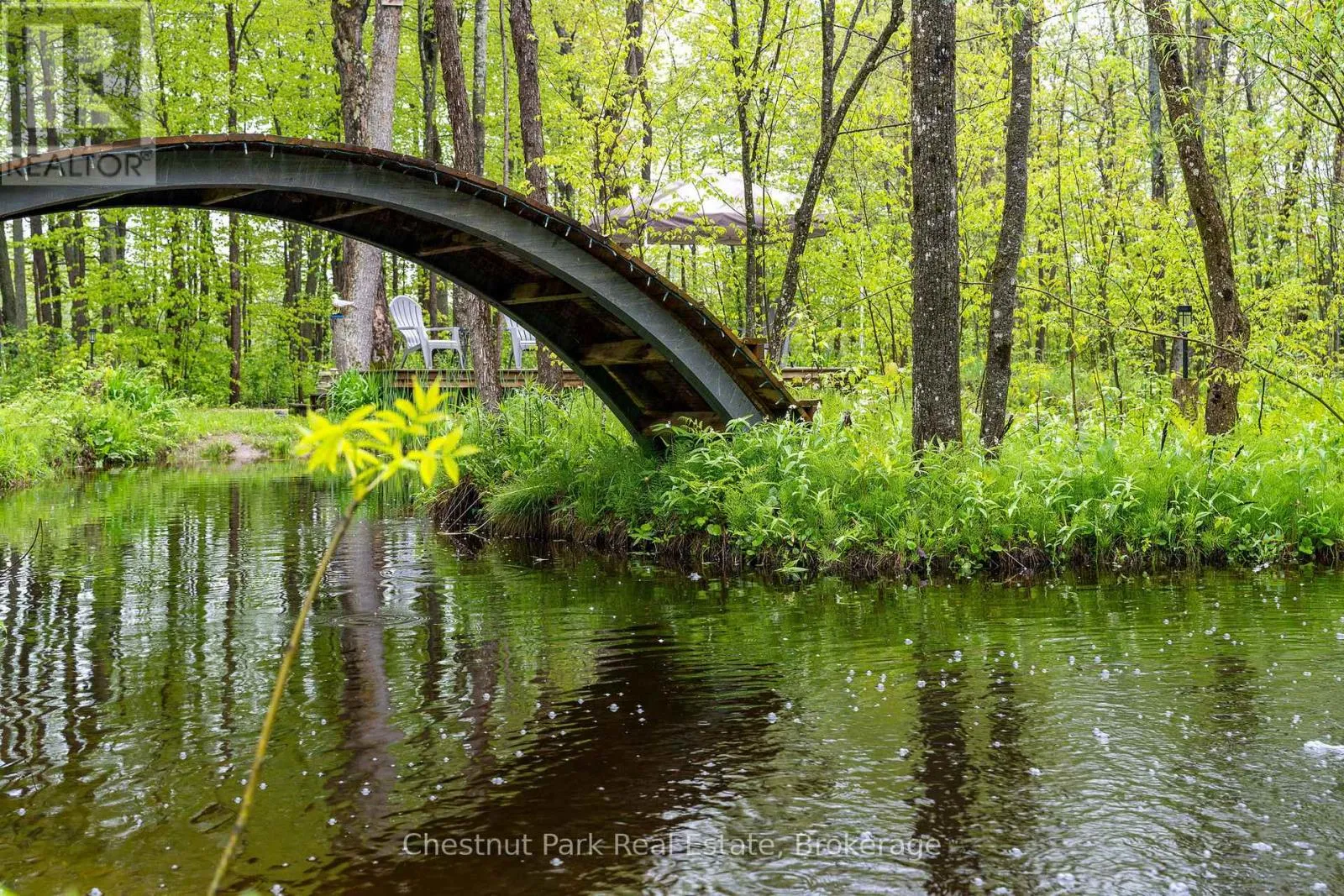 Cross Streets: Side Road 60 and Veteran's Road S. ** Directions: From N: Take ON-6 south to ON-10 south all the way to Berkeley. Turn right onto Side Road 60, to just West of Veterans. Escape to nature without sacrificing comfort. Set on 10 private acres in desirable Holland Centre, this impeccably built 2-bedroom, 2-bathroom bungalow offers over 2,100 square feet of luxurious, single-level living. Constructed in 2020 by a custom home builder for personal use, the quality is evident in every detail-engineered oak flooring, Italian porcelain tile, designer fixtures (Brizo, Kohler, Hansgrohe), high-end lighting, and built-in Klipsch ceiling speakers throughout. The chef-inspired kitchen features premium appliances, a central island, and a 10' peninsula-perfect for entertaining while enjoying views of the forest. Dust-free, in-floor radiant heating backed up by ductless heating/cooling, triple-pane windows, R34 walls, R70 attic insulation, and a 50-year roof ensure year-round comfort and efficiency. Starlink high-speed internet keeps you connected. Outdoors, relax in the hot tub, entertain in the courtyard, or unwind beside the lovely ground-fed, aerated pond-a peaceful focal point that offers tranquil water views in summer and skating in the winter. The landscaped gardens, cobblestone drive, wooded trails, and firepit make this a true four-season retreat. Wildlife is abundant, and the property includes space for guests with trailer or tent parking near the pond. Enjoy the peace and privacy of rural living with the convenience of nearby amenities: 12 minutes to Markdale (with new hospital and school), 35 minutes to Owen Sound and Blue Mountain, and just over an hour from Highway 9. Whether you're looking for a full-time residence or a weekend escape, this home delivers exceptional quality, comfort, and a rare connection to nature. (id:27476)