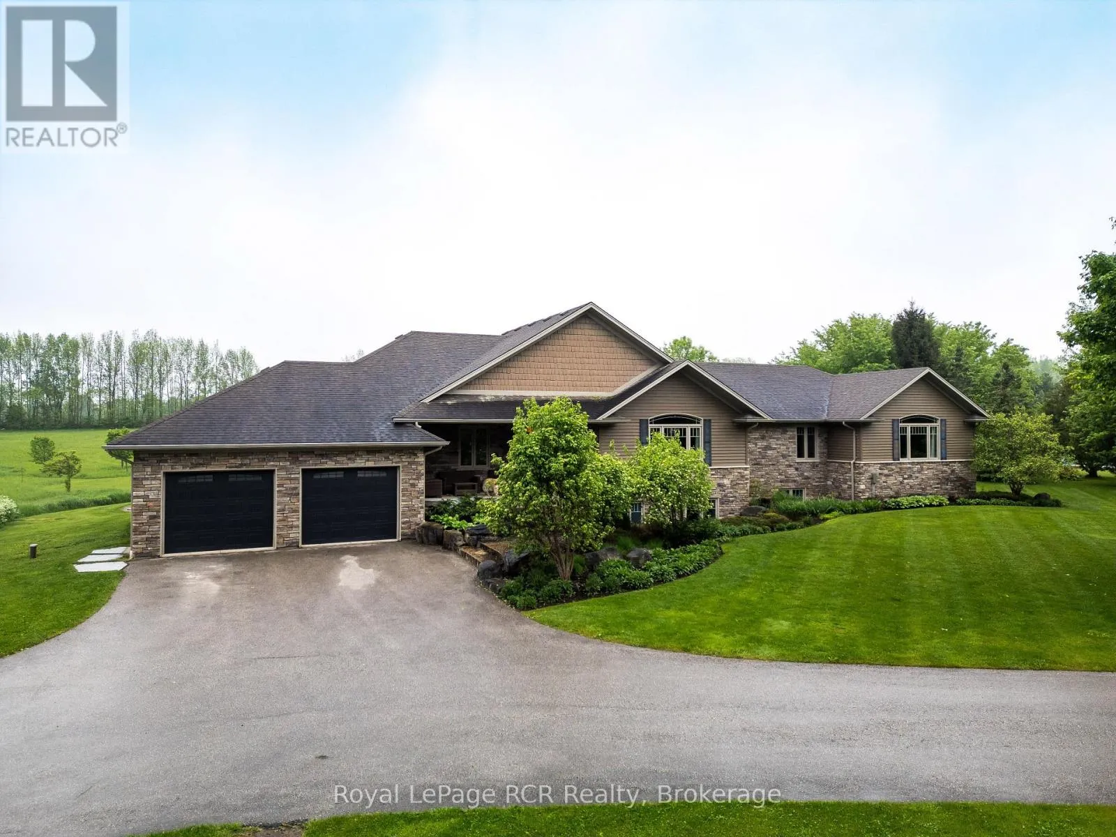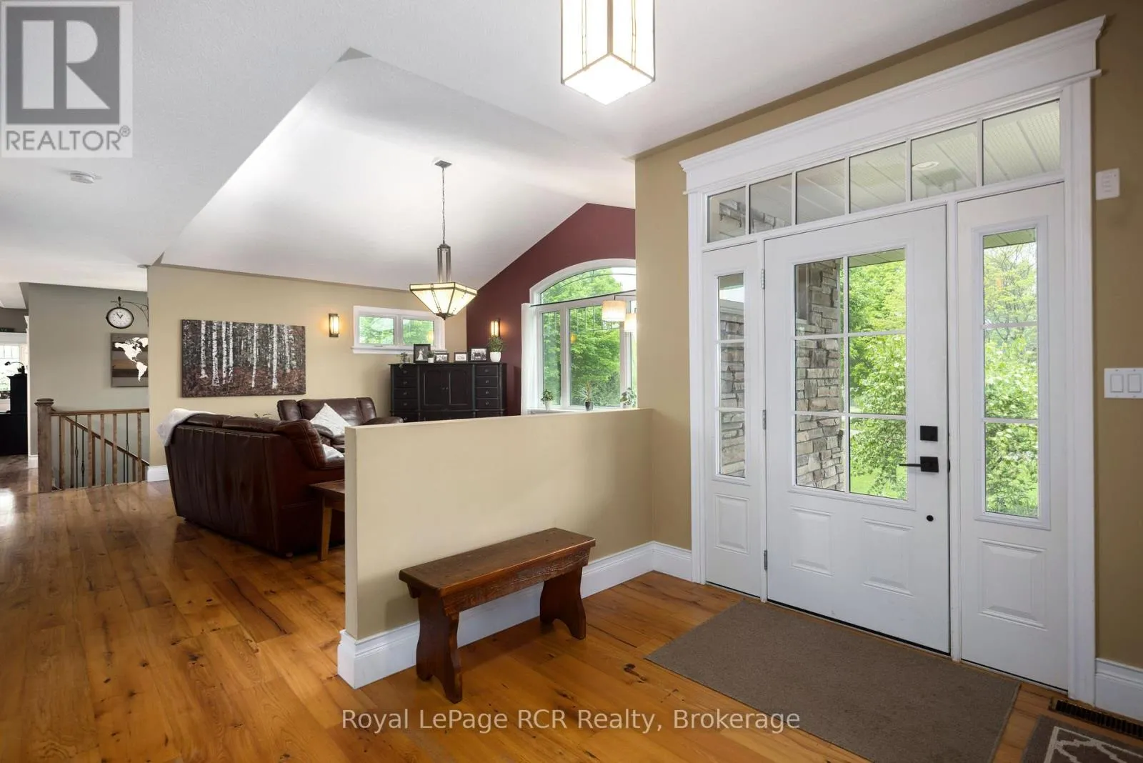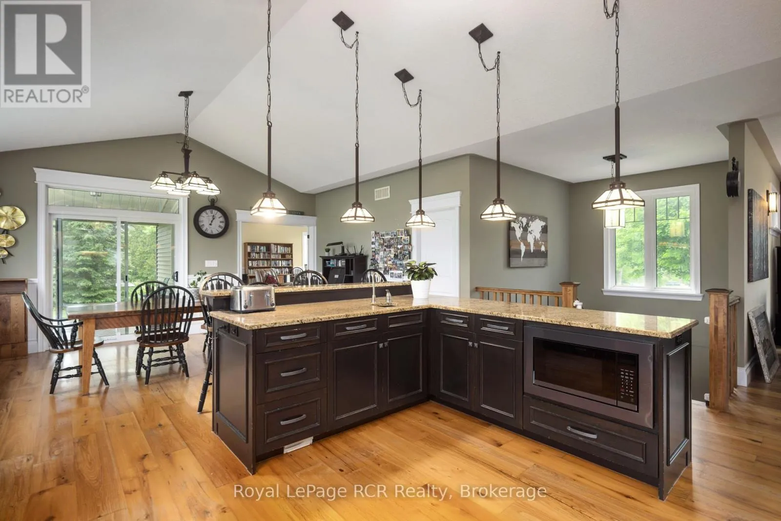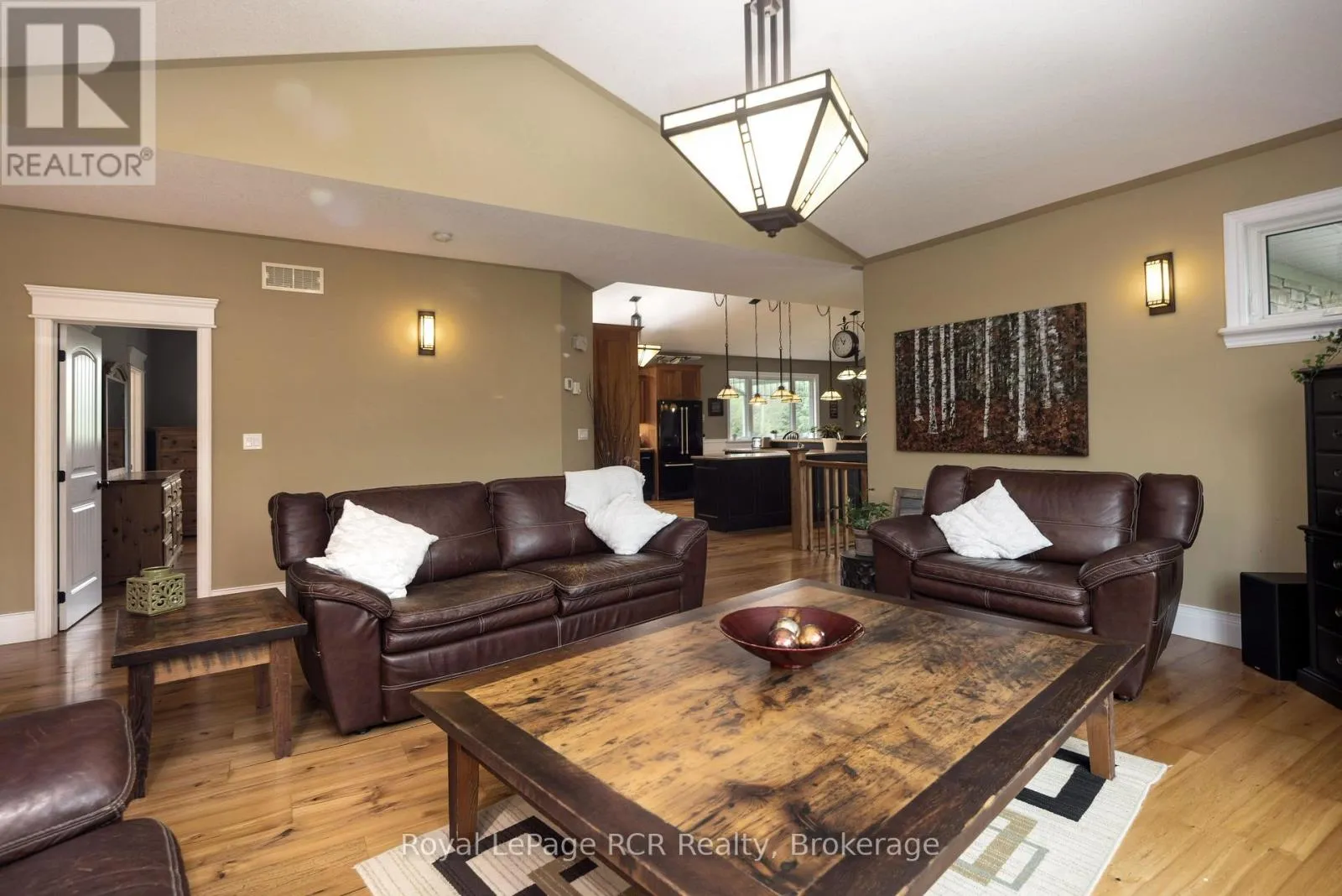 Cross Streets: Hwy 6. ** Directions: 023038 Holland Sydenham Townline, Chatsworth, ON. This magnificent 4,420 finished sq. ft. home with a attached double car garage offers abundant storage space and exceptional features throughout. The main floor is designed for convenience and comfort, featuring a mudroom with great storage, beautiful trim, and square cut flag slate floors. The foyer includes a closet, and there's a 3pc bathroom next to a main floor laundry room for added functionality. The large primary bedroom offers a walk-in closet, and a 4pc ensuite. The living room is filled with natural light from large windows, complemented by engineered hardwood floors and a cathedral ceiling. The heart of the home is the bright and spacious custom kitchen, adorned with cherry cabinetry, a pantry, granite countertops, a prep sink, and a raised bar. Modern appliances include a new microwave and dishwasher. The kitchen seamlessly flows into the dining room with vaulted ceilings and patio doors leading to a covered wood porch area. There is also a generously sized bedroom/office and a family room with vaulted ceilings. The 2nd covered wood deck, equipped with a hot tub and BBQ area, is perfect for outdoor entertaining. The basement boasts high 9'ceilings and includes four bedrooms with large windows, with one bedroom offering ensuite privilege with a3pc bathroom. The basement also features custom trim, a recreation room, ample closet space, 5pc bathroom, utility room, natural gas boiler, forced air heating, in-floor heating, and central air conditioning. The basement is spray-foamed from floor to ceiling for max efficiency. The exterior is equally impressive with a paved driveway, landscape lighting, irrigation, lush landscaping, playhouse, garden shed, and a large above ground pool. A front covered porch, providing multiple areas for relaxation and entertainment. This home combines luxury, comfort, and practicality, making it the perfect place for your family to call home. (id:27476)