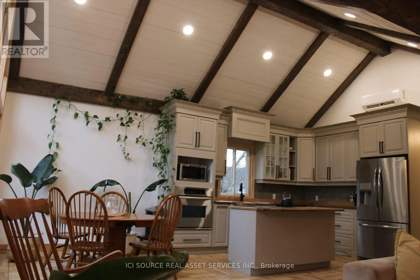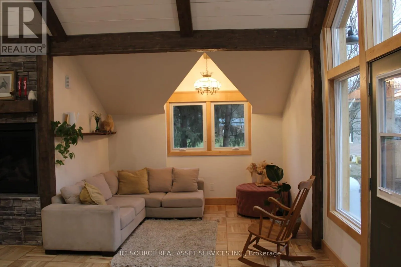 Cross Streets: Highway 6. ** Directions: Turn east on the southernmost entrance to Orr street off of Highway 6 in Williamsford. Beautifully renovated 1,280 sq ft farmhouse on a 76x132 ft lot quiet Williamford. Build in 1880, fully updated in 2025, blending classic rural charm with modern finishes.. Open-concept kitchen, dining, and living space with 13' vaulted ceilings, timber accents, spalted maple floors, and a dramatic window wall. Kitchen with hardwood counters, island cooktop, stainless steel appliances, and custom cabinetry. Main-floor primary bedroom with wall-in closet/laundry. Bathroom with glass walk-in shower, freestanding tub, double vanity, and floor-in heat. Upstairs features two bright rooms separately by a decoration privacy wall. Year-round comfort with ductless heat pump, propane fireplace, new plumbing/electrical, and full insulation. Exterior upgrades: stamped concrete patios, timber-frame pavilion, cedar fence, stone siding with cedar shakes. Landscaped grounds, steel roof, concrete driveway, 9x9 shed, fibre-optic internet. Quiet street easy hwy 6 access, 20 minutes to Owen Sound. *For Additional Property Details Click The Brochure Icon Below* (id:27476)