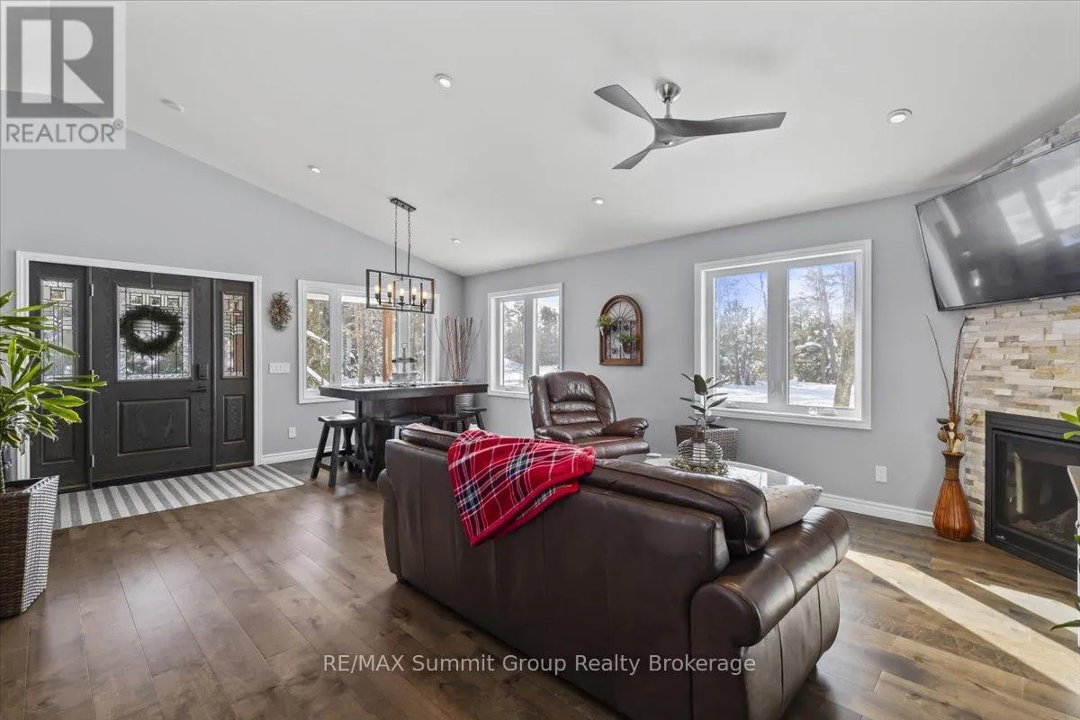 Cross Streets: Hwy 10 and Sideroad 30. ** Directions: From Hwy 10 in Holland Centre turn east onto Sideroad 30 then right onto Old Log Lane, then right onto Confederation Drive to property on the right. This custom-built raised bungalow is designed for anyone looking to simplify without sacrificing comfort or quality. Built in 2021, it offers a layout that feels easy, intentional, and well-suited to everyday living. Located on a quiet cul-de-sac in a newer subdivision in the village of Holland Centre, the home is surrounded by newer, well-kept properties, with a community park just a short walk up the street and the rail trail nearby. Inside, the main floor is bright and welcoming, with cathedral ceilings connecting the kitchen, dining, and living areas. Large windows bring in plenty of natural light, and engineered hardwood floors add warmth throughout the main living space. A propane fireplace in the living room adds comfort and creates a natural gathering space. The kitchen is well organized and thoughtfully designed, featuring a central movable island, ample cabinetry, and a generously sized walk-in pantry. A door off the kitchen leads directly to the covered side deck, making it easy to step outside and BBQ all year round. The main floor primary bedroom is comfortably oversized and includes a sitting area, walkout access to the covered side deck, a walk-in closet, and an ensuite bathroom with room to add a soaker tub. A separate laundry and mudroom provide direct access to the attached insulated steel-clad garage, offering everyday convenience and storage. The fully finished lower level features a large family room with a propane fireplace, two additional bedrooms, a full bathroom, and storage, offering flexible space for older children, guests, or everyday living. Outside, the yard is well-maintained and easy to manage, with plenty of room for gardening, along with a 10x20 shed, an asphalt driveway completed in 2024, ample parking, and a hydro hookup for a camper or RV. This thoughtfully planned home is a great fit for those looking to downsize without giving up comfort, or for families looking for a well-planned, move-in-ready home that's easy to live in. (id:27476)