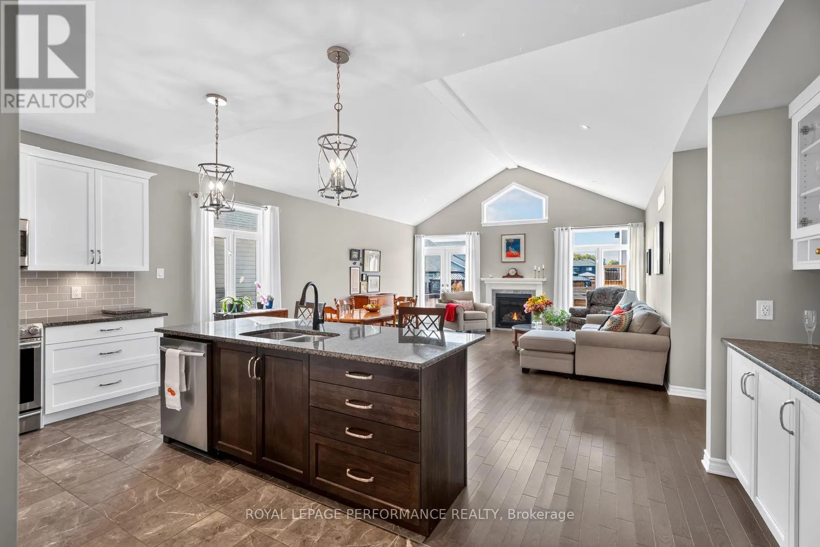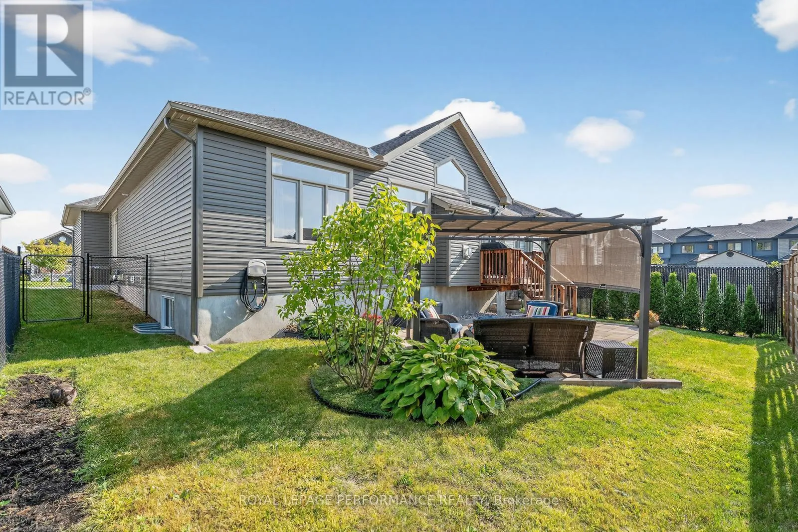 Cross Streets: du Rivage and des Rails. ** Directions: From Hwy 17, turn left onto La Berge, then right onto du Rivage, then right onto des Rails. Welcome to 88 des Rails Street, a stunning 2-bedroom + den EQ-built craftsman-style bungalow with a 3rd bedroom in the fully finished basement, located in the sought-after Clarence Crossing community in Rockland. Nestled near the banks of the Ottawa River, this neighbourhood offers scenic forested walking paths while keeping you close to everyday conveniences, golf, hockey, soccer fields, and even a local brewery. Step inside and discover 1,640 sq. ft. of stylish main floor living with vaulted ceilings, rich hardwood floors, and a cozy gas fireplace anchoring the open-concept design. The chef's kitchen features two-tone cabinetry, granite countertops with a breakfast bar, undercabinet lighting, stainless steel appliances, a walk-in pantry, and a handy alcove with additional cabinetry, perfect for storage or a coffee bar. The main floor offers a thoughtful layout with a primary suite featuring a walk-in closet and a 3-piece ensuite with a stand-up shower. A second bedroom also includes a walk-in closet, while a den at the front of the home makes an ideal office, TV room or reading nook. Another full bathroom, main-floor laundry, and a welcoming covered front porch add to the functionality. Downstairs, enjoy an additional 1,180 sq. ft. of finished space with a large rec room, a third bedroom, a 4-piece bathroom, and two storage rooms. Set on a premium wide lot, the fully fenced backyard is perfect for relaxing, complete with interlock patio, pergola, and privacy. The extra-wide oversized two-car garage with inside entry provides ample space for vehicles and gear. Peace of mind comes with practical upgrades, including a Generlink 30-amp transfer switch for generator hook-up and an Eaton whole-home surge protector. Built in 2017, this move-in ready home blends modern comfort with timeless style in one of Rockland's most desirable riverfront communities. (id:27476)