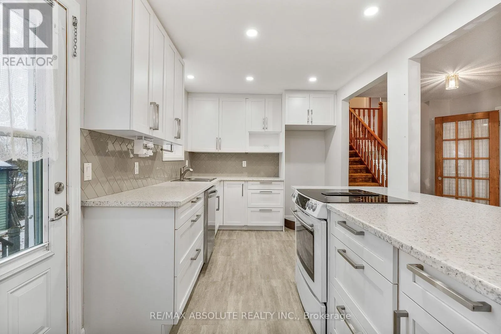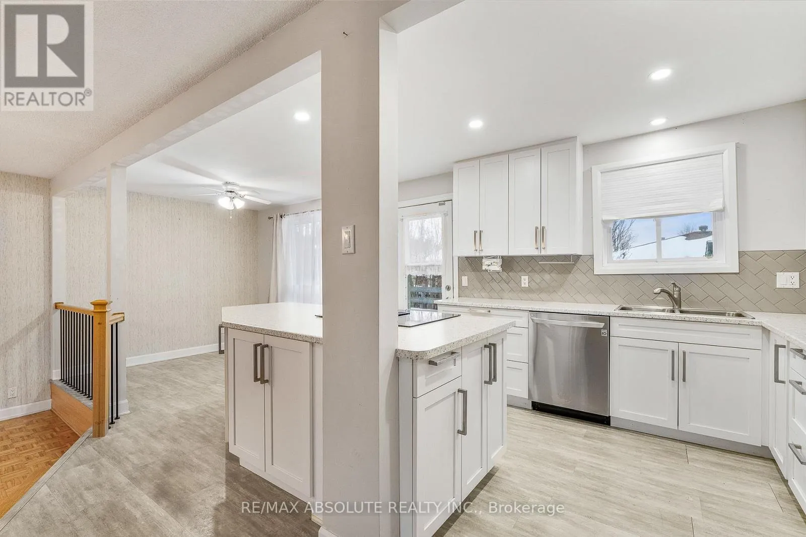 Cross Streets: Patricia. ** Directions: Raymond to Charron. This beautifully maintained 4 bedroom, 1.5 bath split-level home sits on an impressive 75-ft wide lot in Rockland's. Step into the inviting enclosed foyer, complete with a french door and an oversized closet. The sunken living room features an oak railing and a bright picture window that fills the space with natural light. The redesigned open-concept kitchen offers exceptional functionality, highlighted by three banks of soft-close drawers, a stylish tile backsplash and a generous center island-perfect for cooking and gathering. The second level includes two comfortable bedrooms, both with extensive closet space, along with a fully updated 4-piece bathroom. A few steps down from your main living space, you'll find a third & fourth bedroom ideal space for teens, guests or a home office. The finished lowest level features a spacious L-shaped family room and a dedicated laundry area. A large low-ceiling storage section offers convenient room for seasonal items and extras. Additional updates include PVC windows and a protective membrane around the foundation (2014). (id:27476)