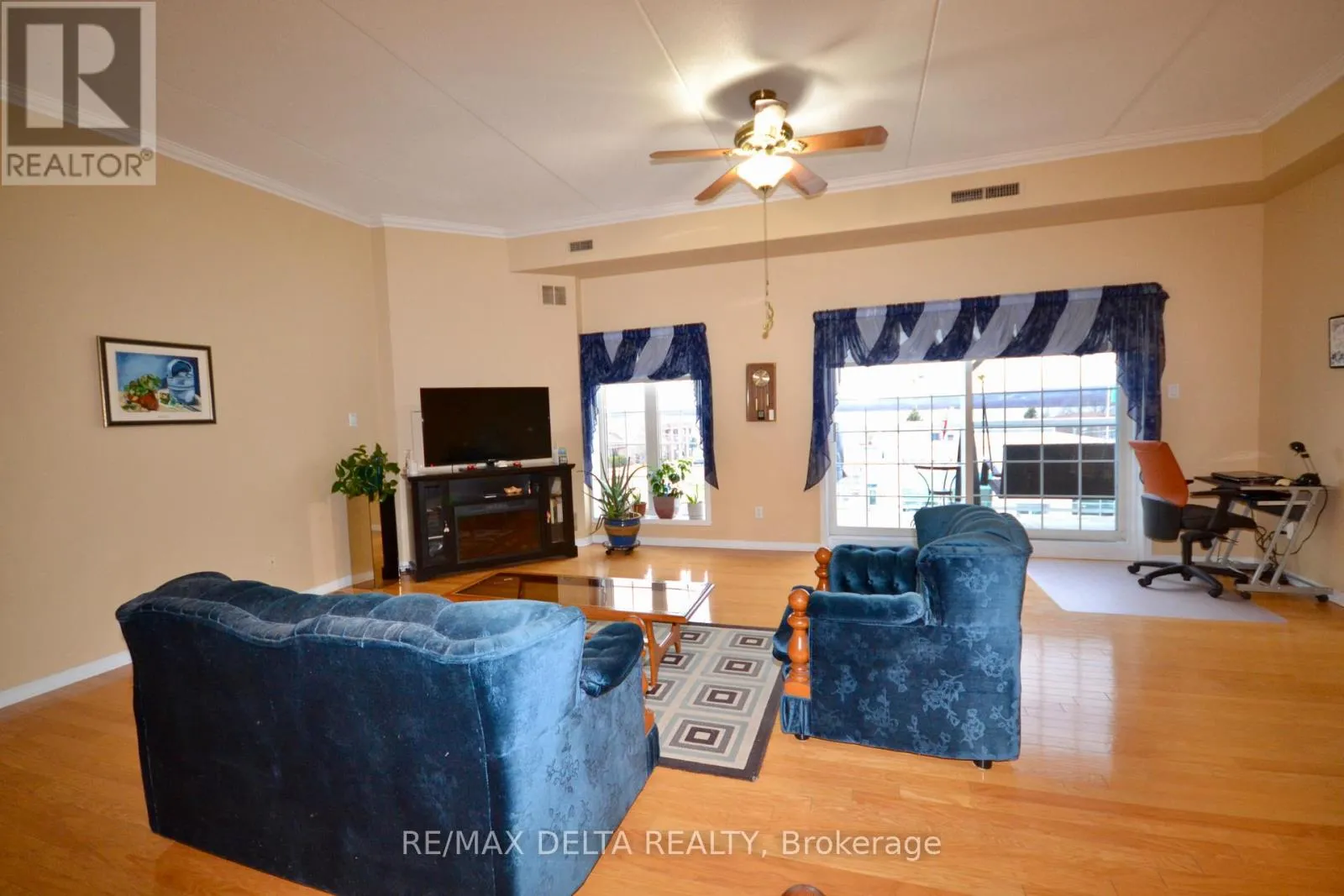 Cross Streets: Laporte St. ** Directions: Hwy 17 east to Rockland exit Laporte St, right at lights building on left side sign on. Welcome to this lovely 2 Bedroom condominium located on the 4th floor of this secured well maintained building in the heart of Rockland with breathtaking views of the Ottawa River. This unit boast a bright spacious kitchen with plenty of white cabinetry and space for island, ceramic flooring, open concept to dining and living room, balcony enjoy amazing views of the stunning sunsets, 9 foot ceiling, hardwood floors throughout, primary bedroom with double closets, separate balcony, second good size bedroom, 4 pcs bath with corner shower, and tub, in unit laundry, storage room, 2pcs bath conveniently located at entrance. This unit also offer a secure underground parking space and an additional exterior parking space, elevator, the use of a party room, wheelchair accessibility, close to all amenities with walking distance to most. Book your private viewing today and make this your new place to call home. (id:27476)